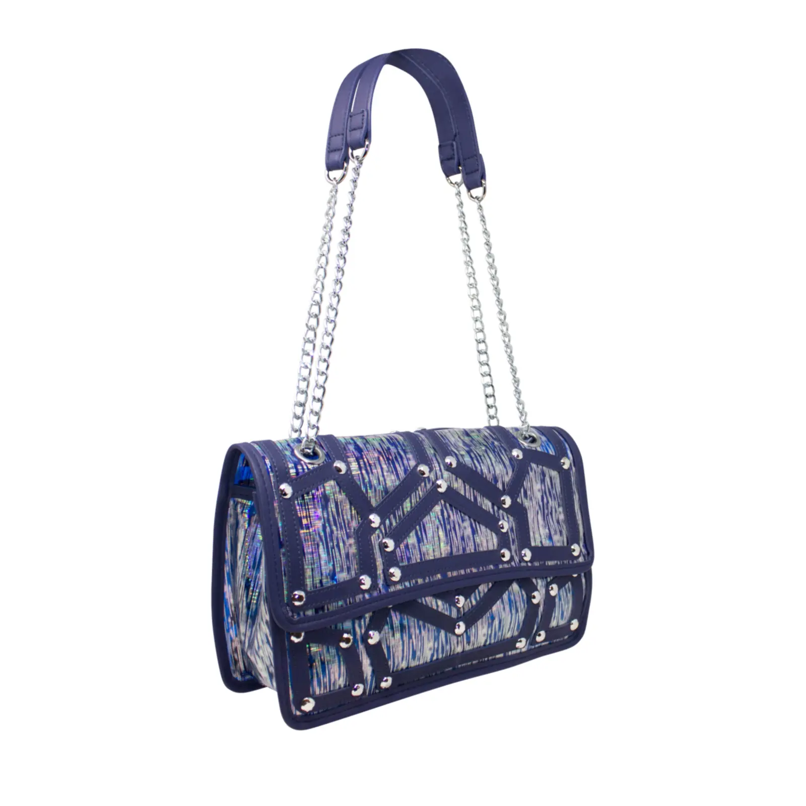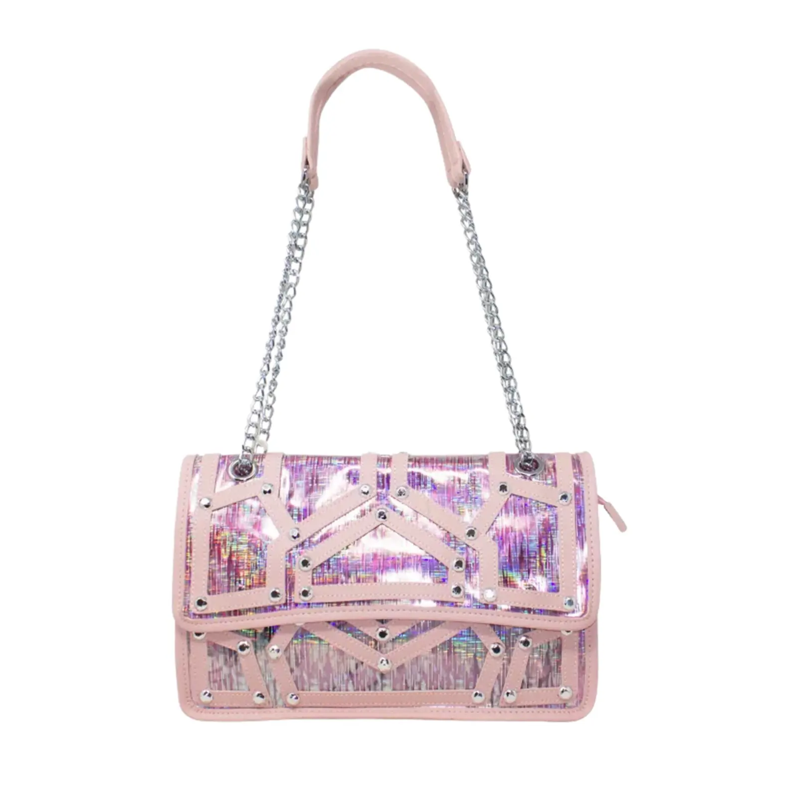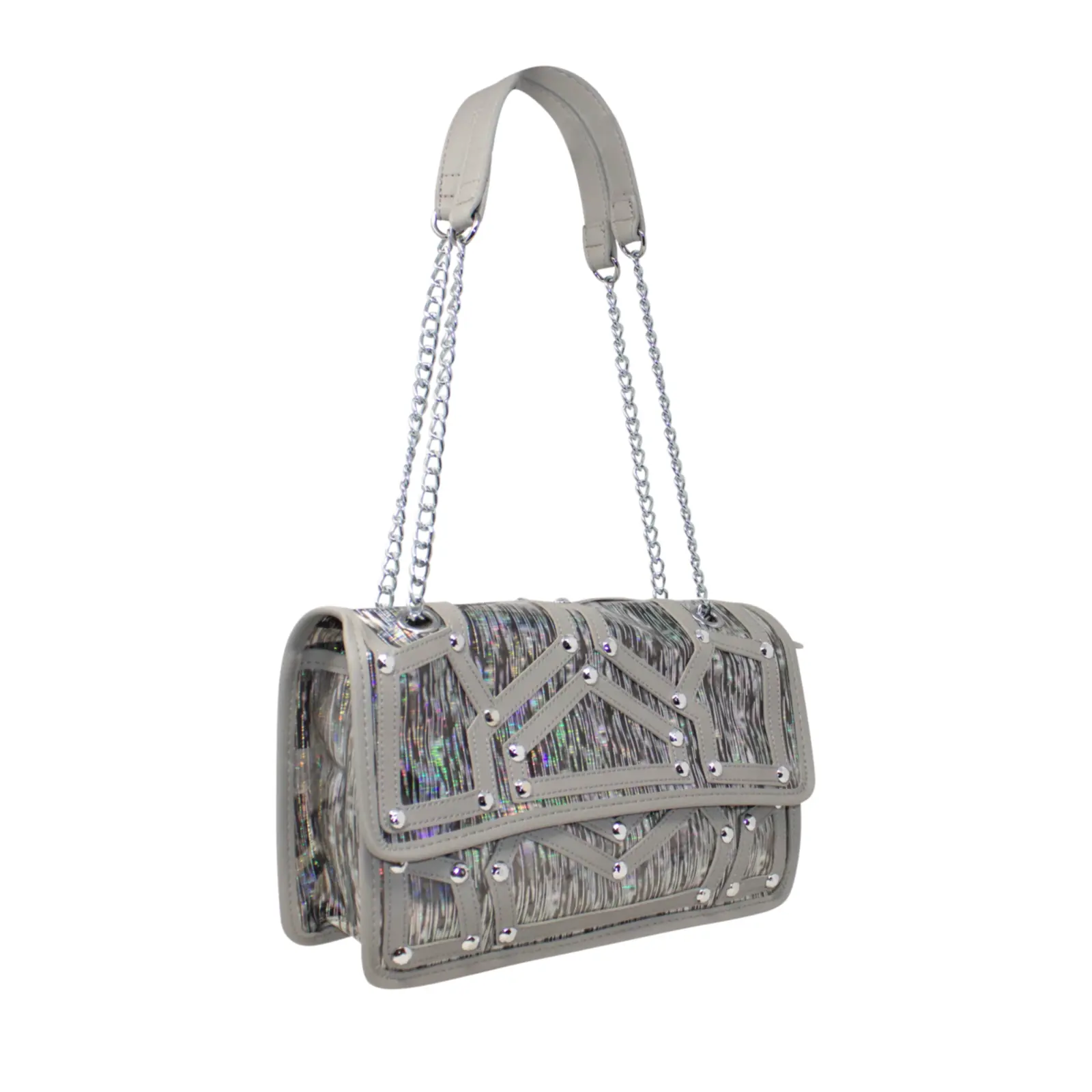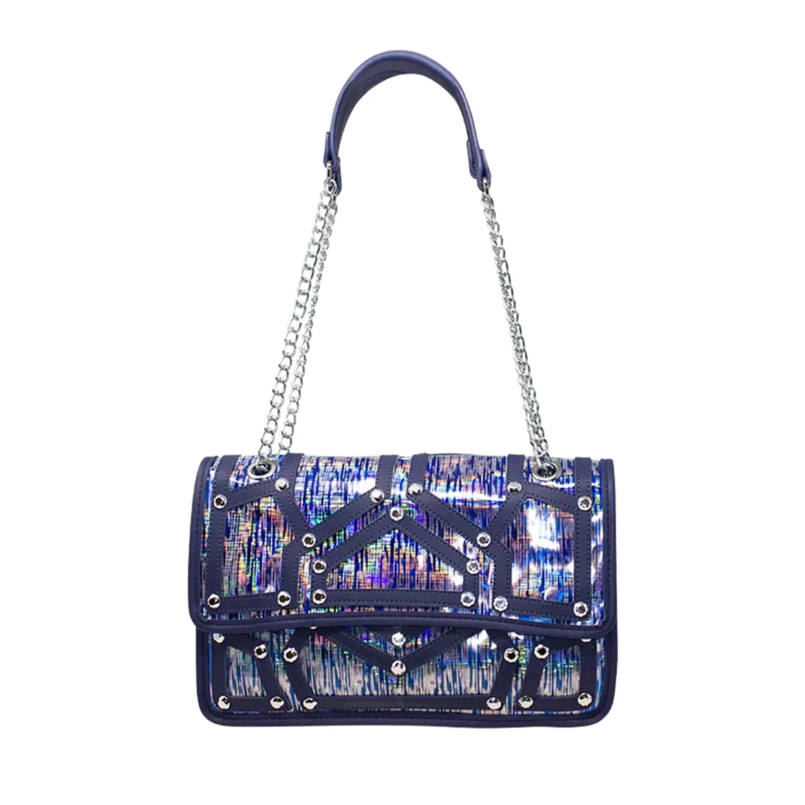 A fashionable shoulder bag with chain strap. Flap over design with diamante details in the front. Button clasp and zipped closure L x W x H – 30.5cm x 11cm x 18cm.
