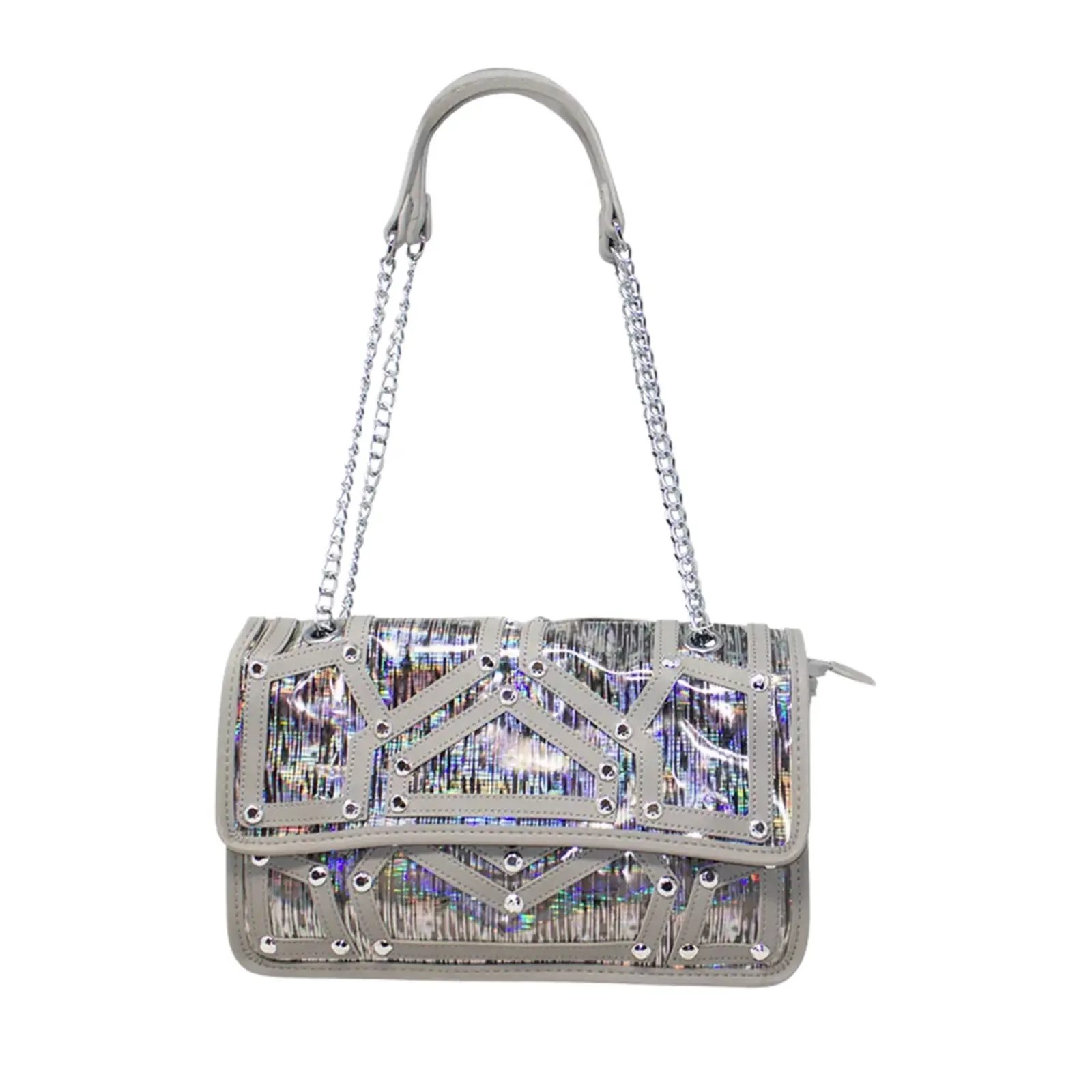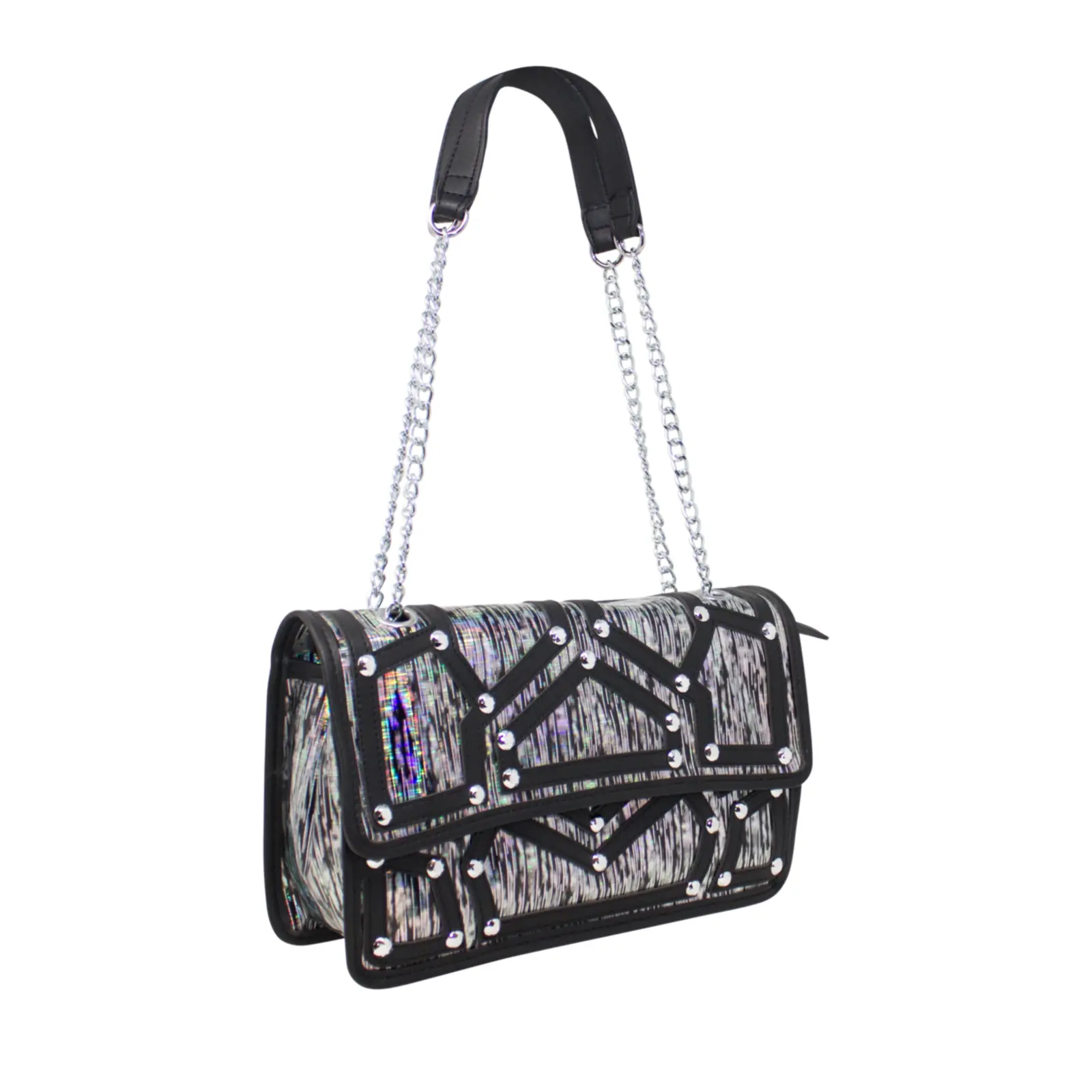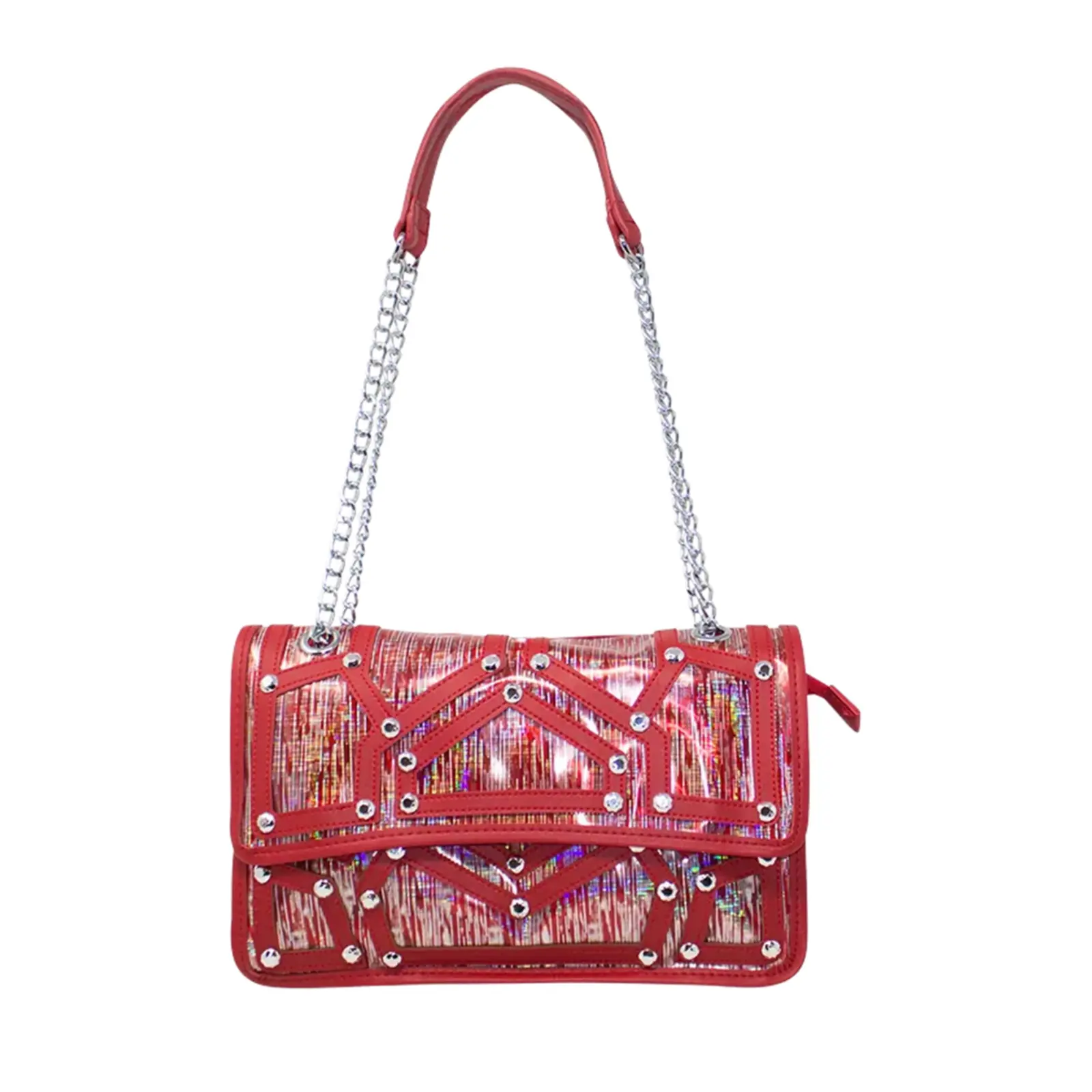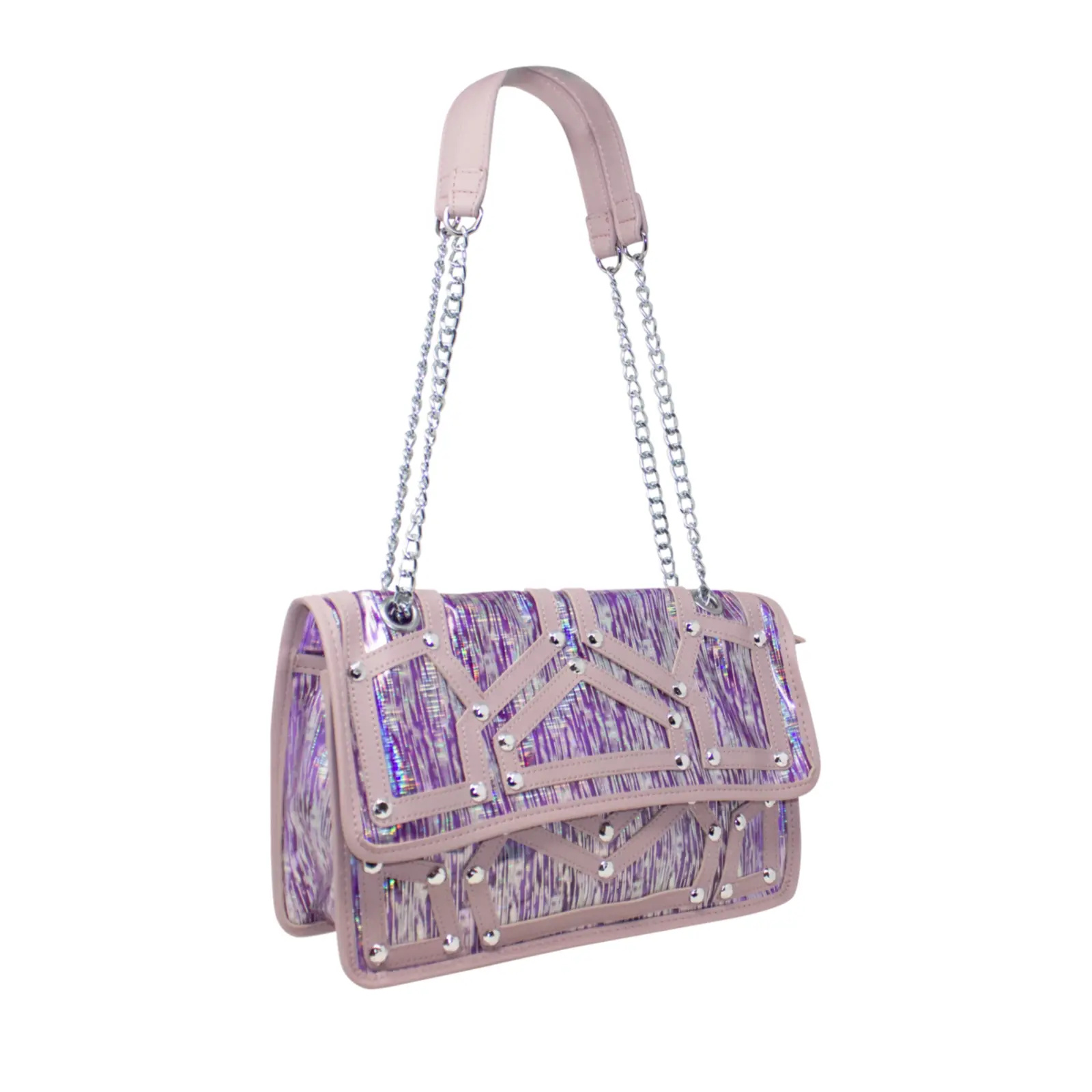 A fashionable shoulder bag with chain strap. Flap over design with diamante details in the front. Button clasp and zipped closure L x W x H – 30.5cm x 11cm x 18cm.