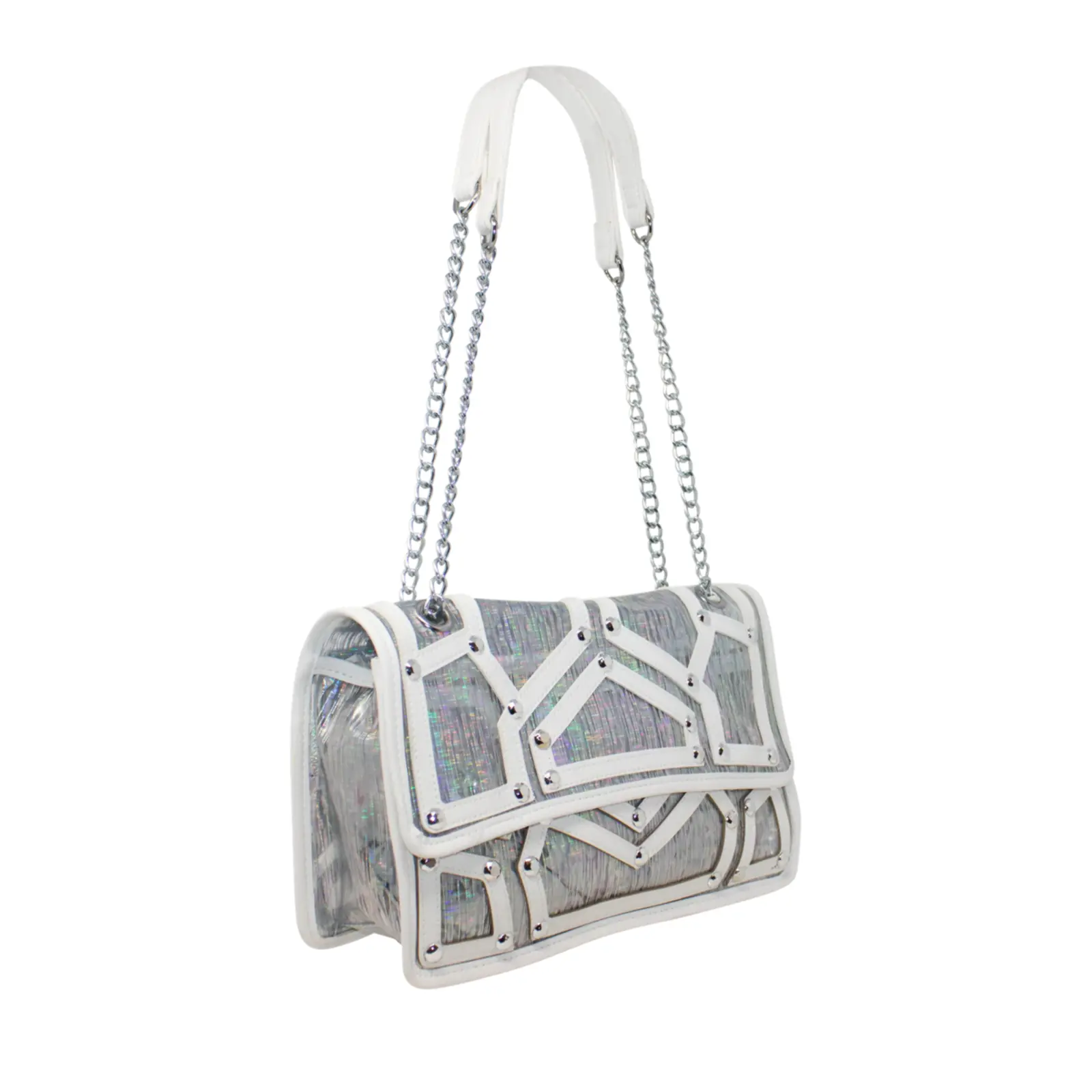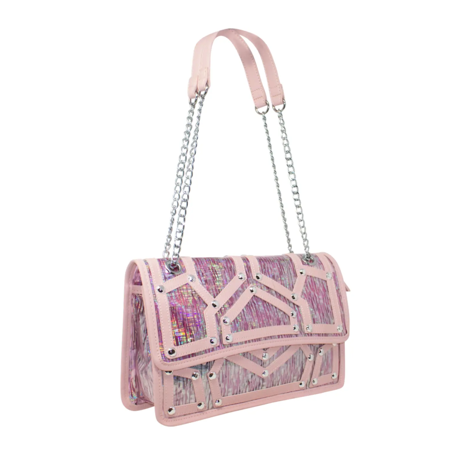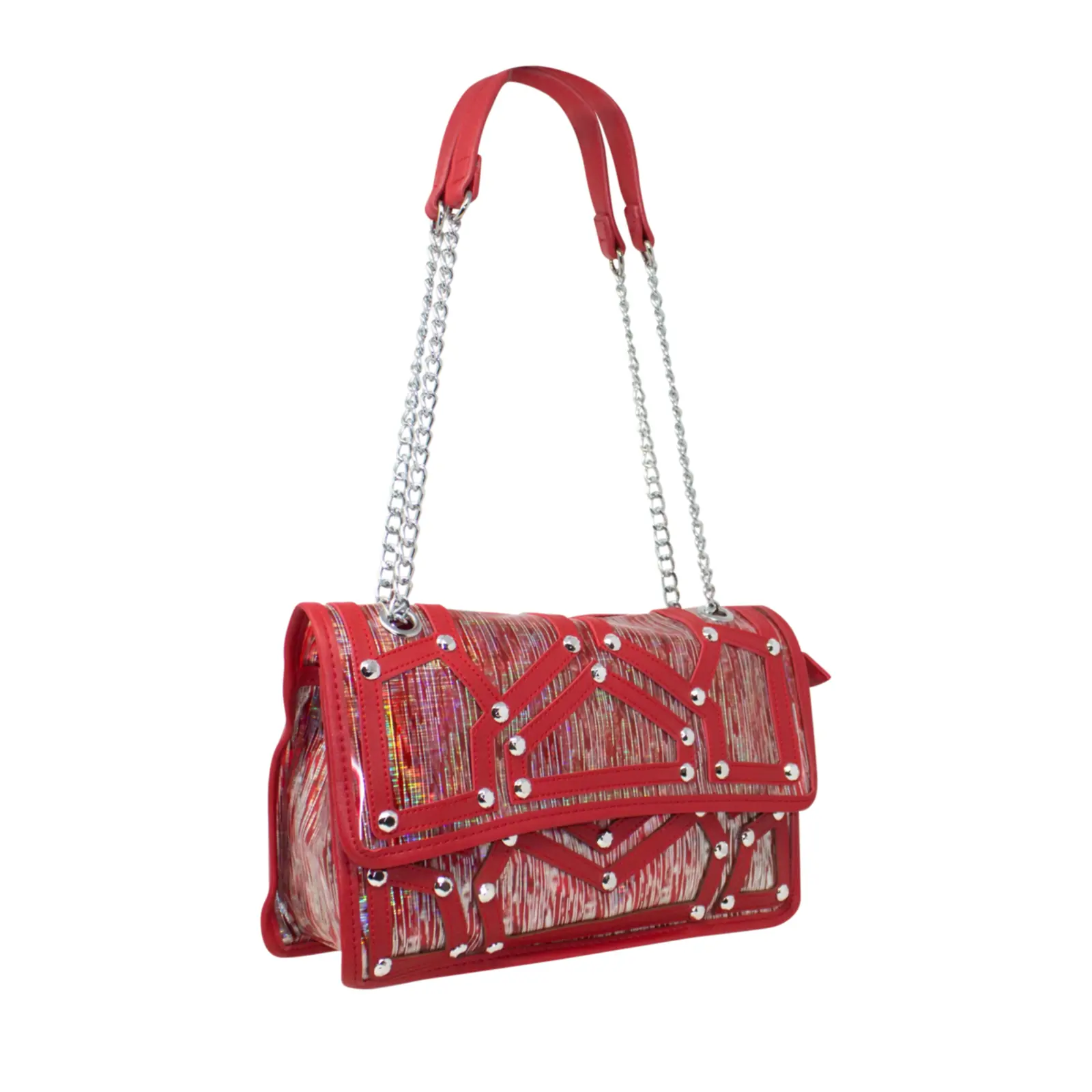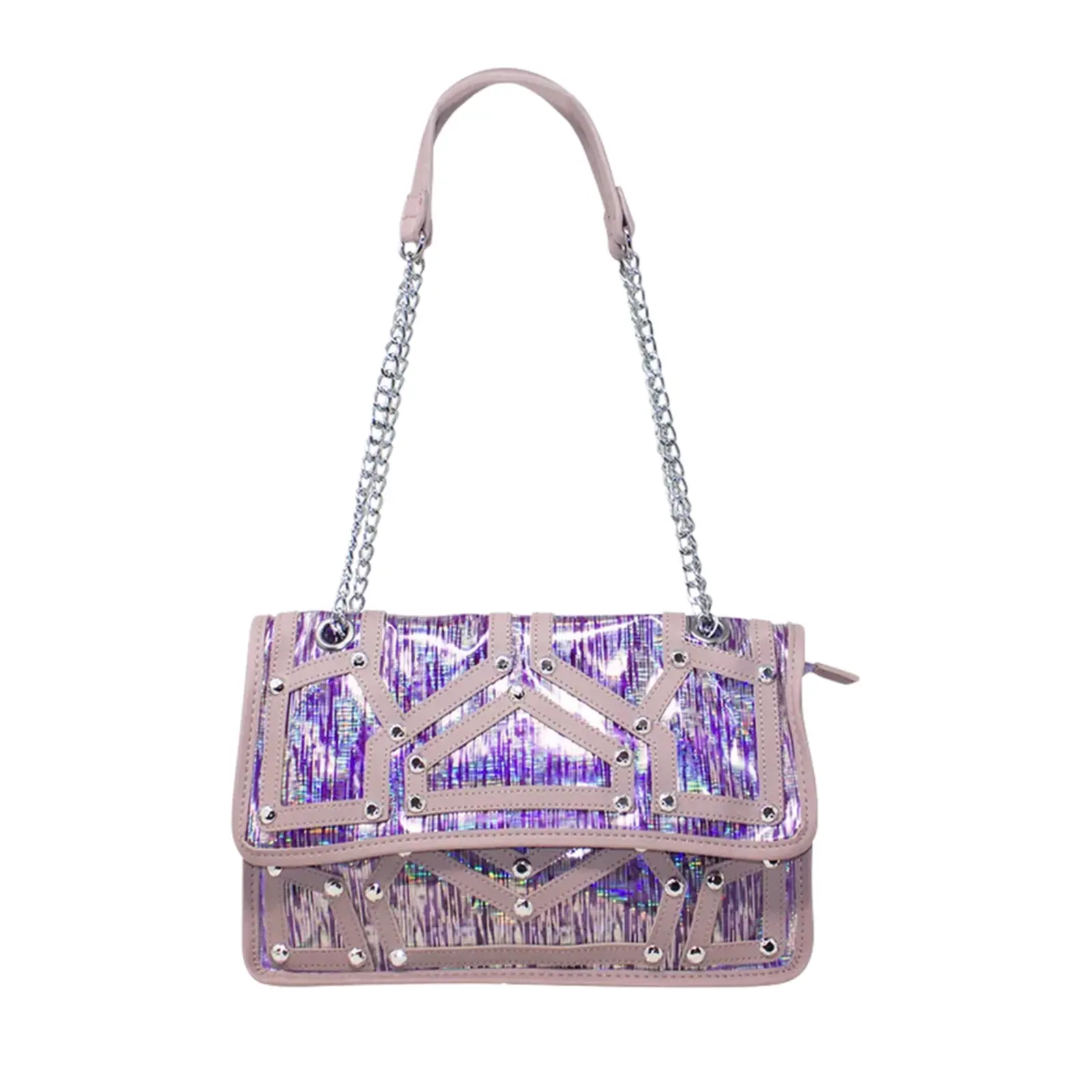A fashionable shoulder bag with chain strap. Flap over design with diamante details in the front. Button clasp and zipped closure L x W x H – 30.5cm x 11cm x 18cm.