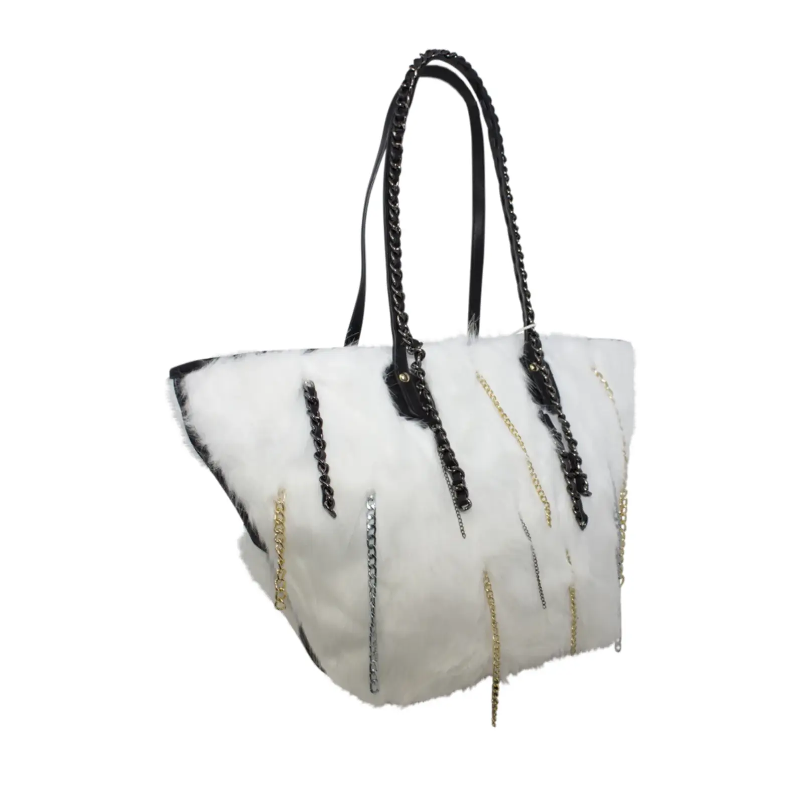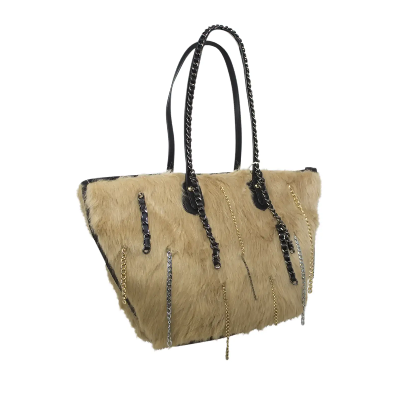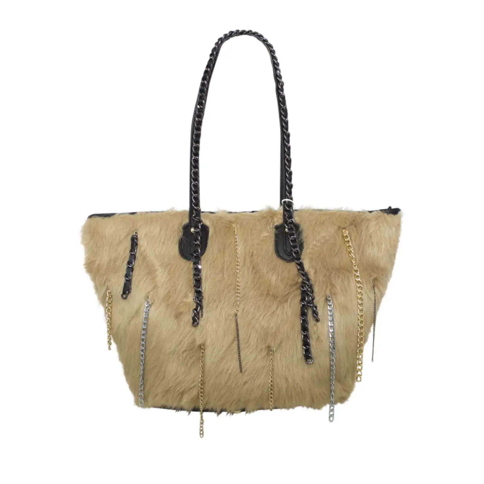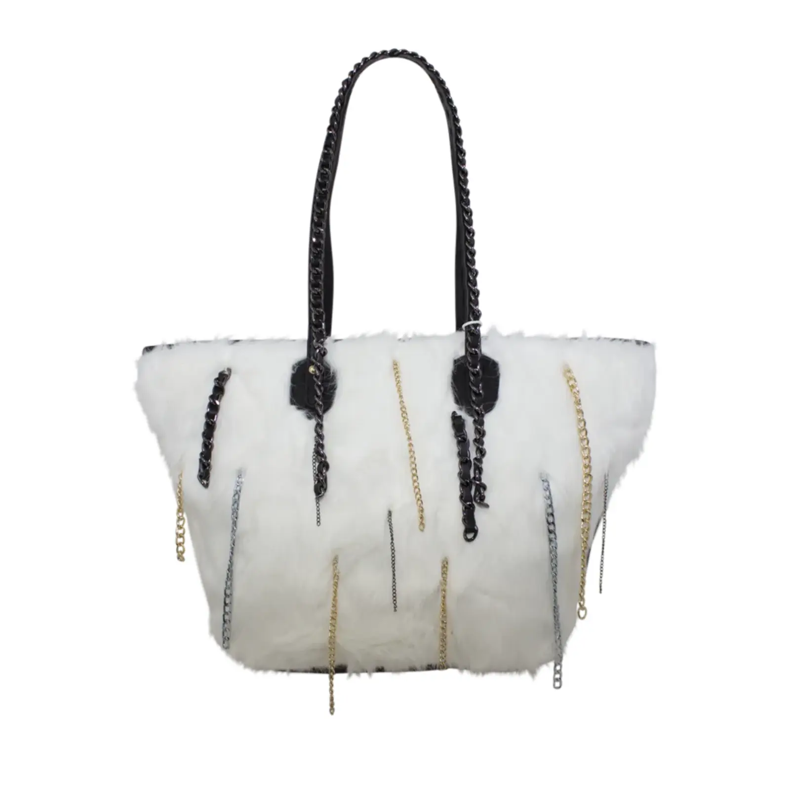 Stylish tote bag with zipper closure Faux fur design with chain details Perfect for winter outfit L x W x H – 48cm x 20cm x 27cm.