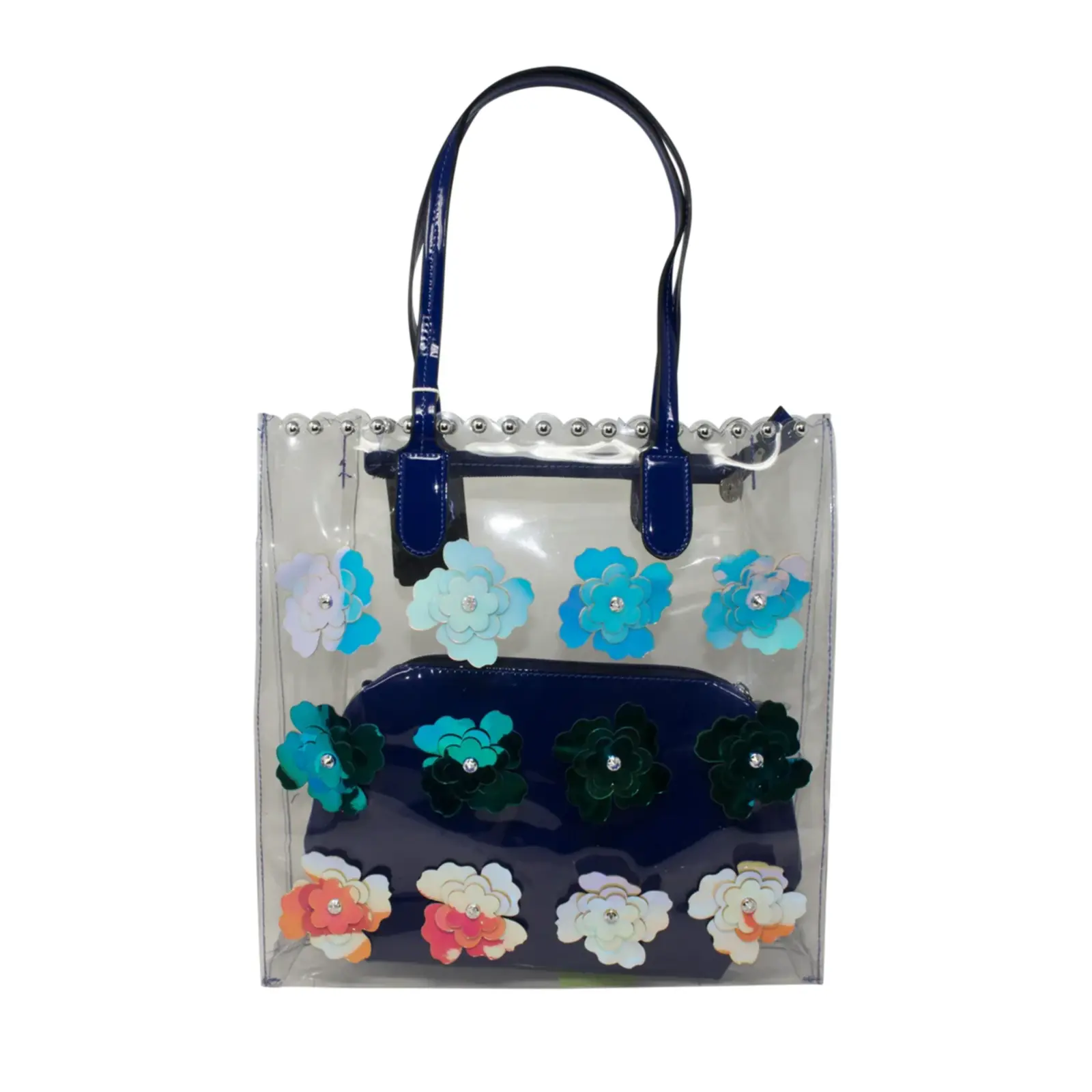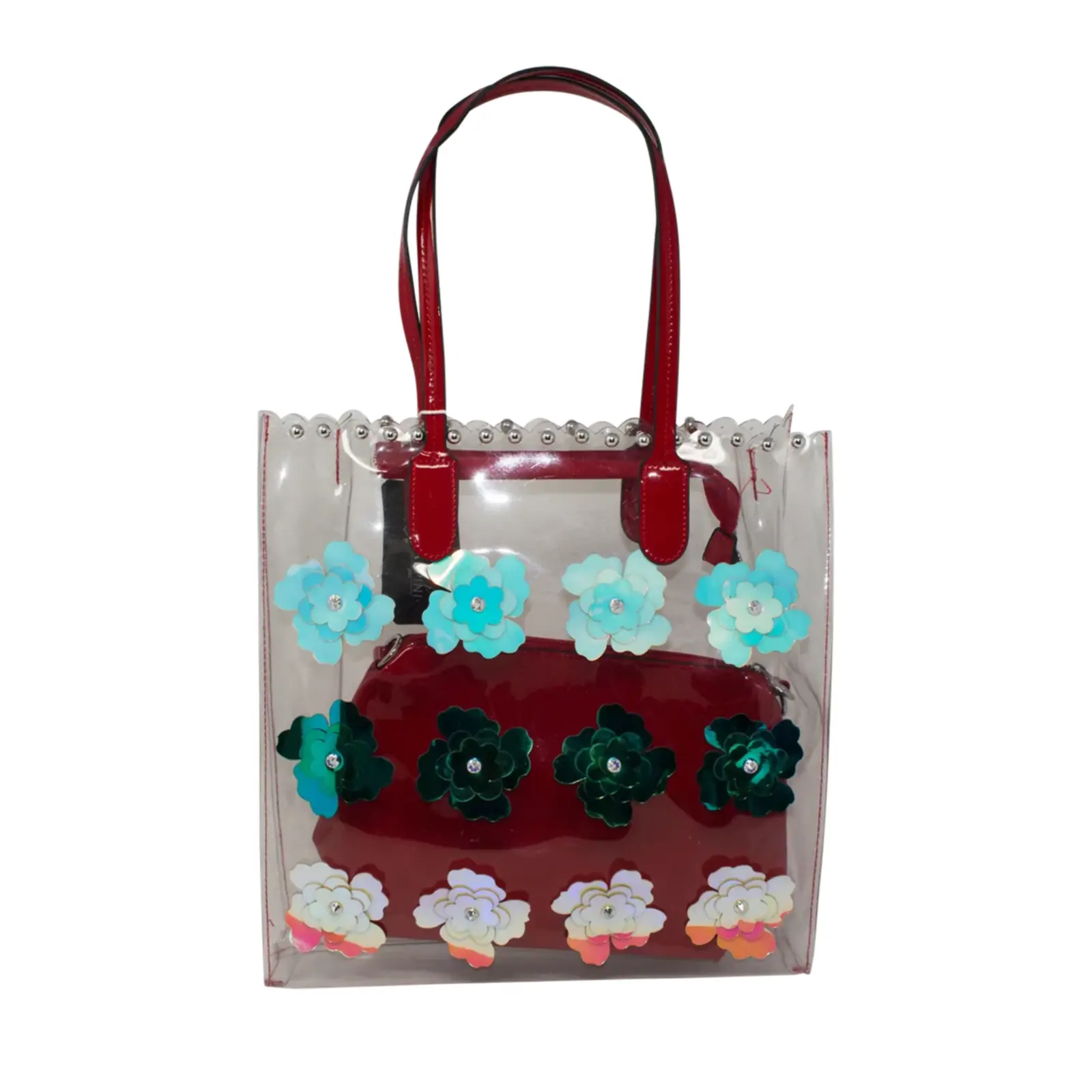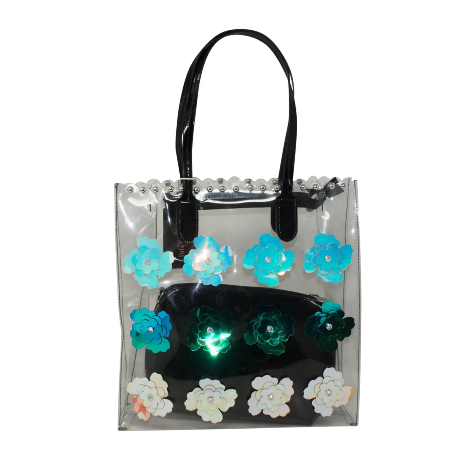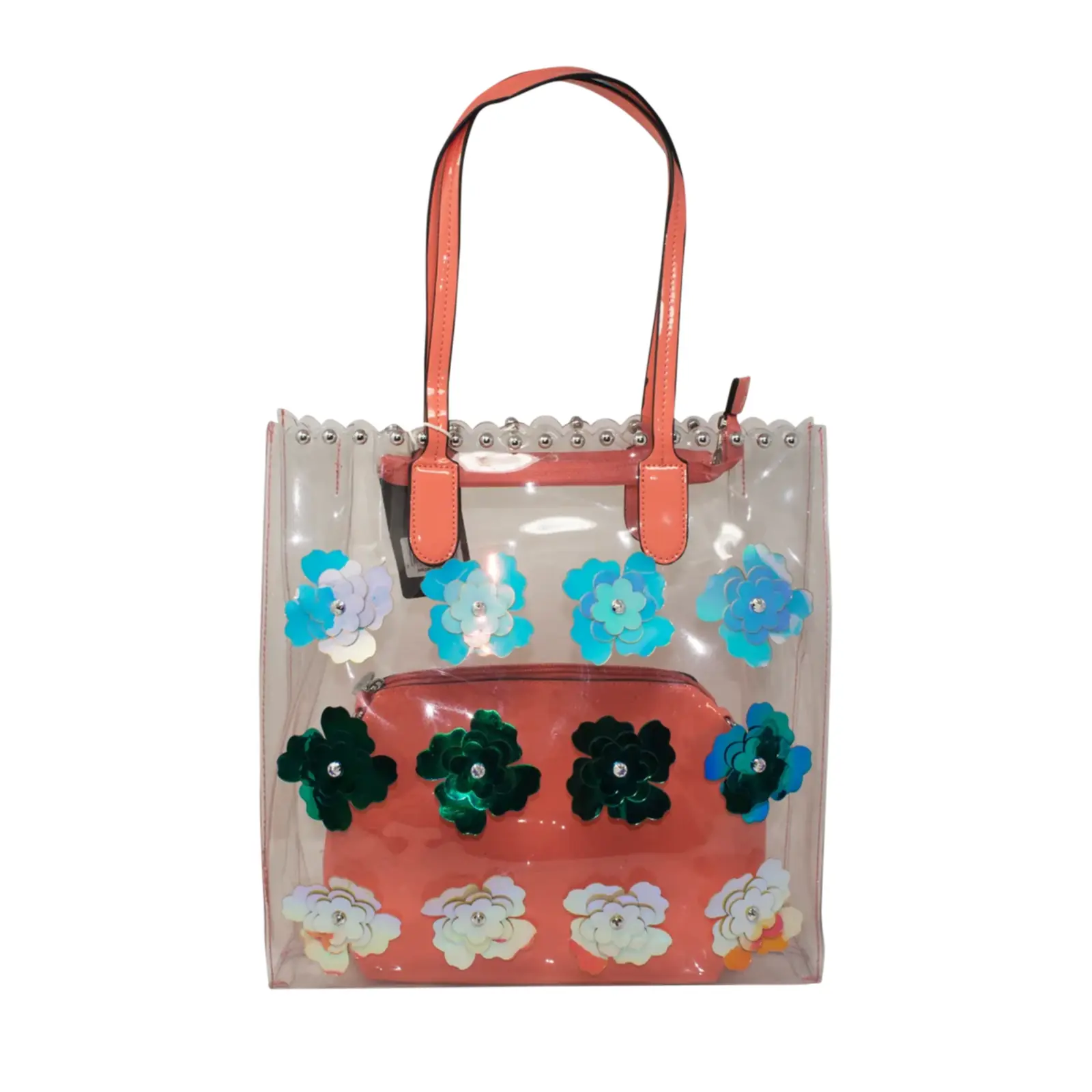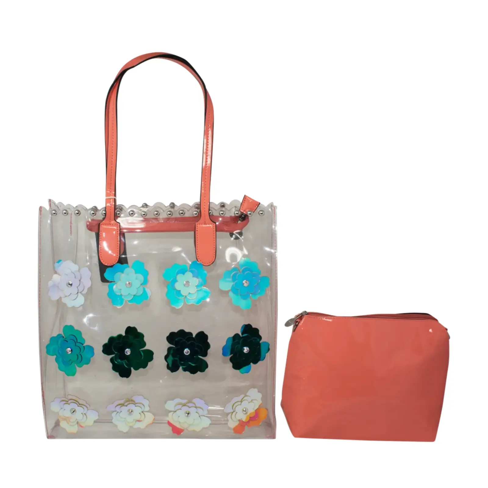 Stylish floral detail clear tote bag with a colour matched small bag Non-adjustable carry handle Zipped closure Comes with a strap L x W x H – 38cm x 10cm x 37cm.