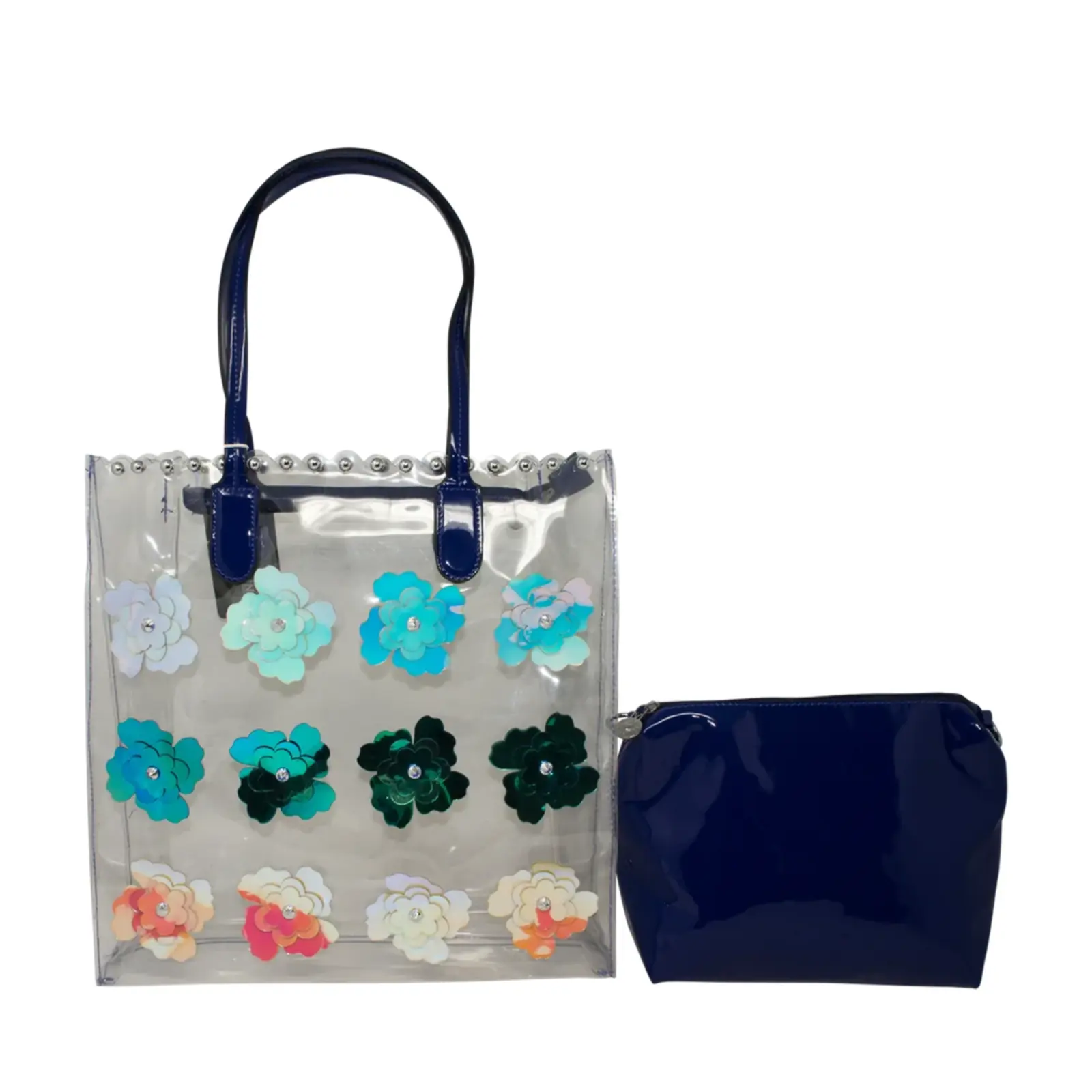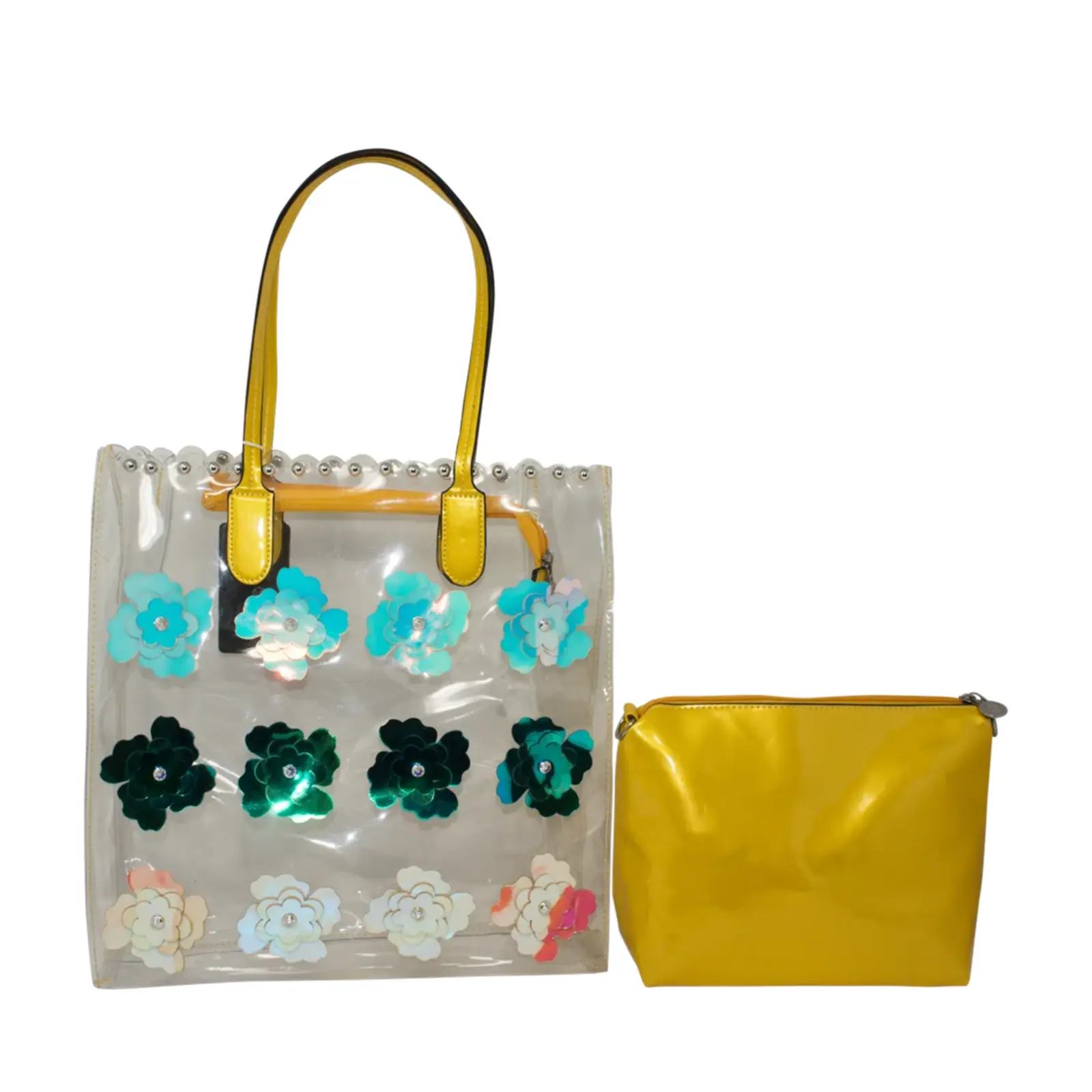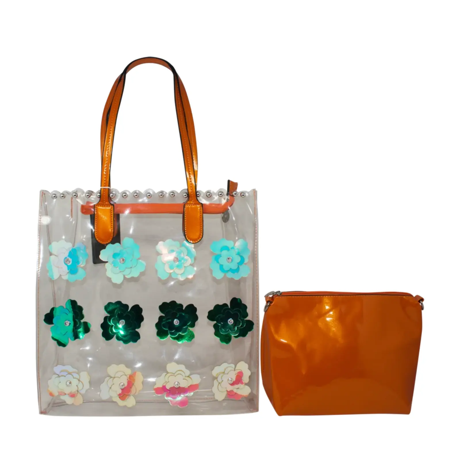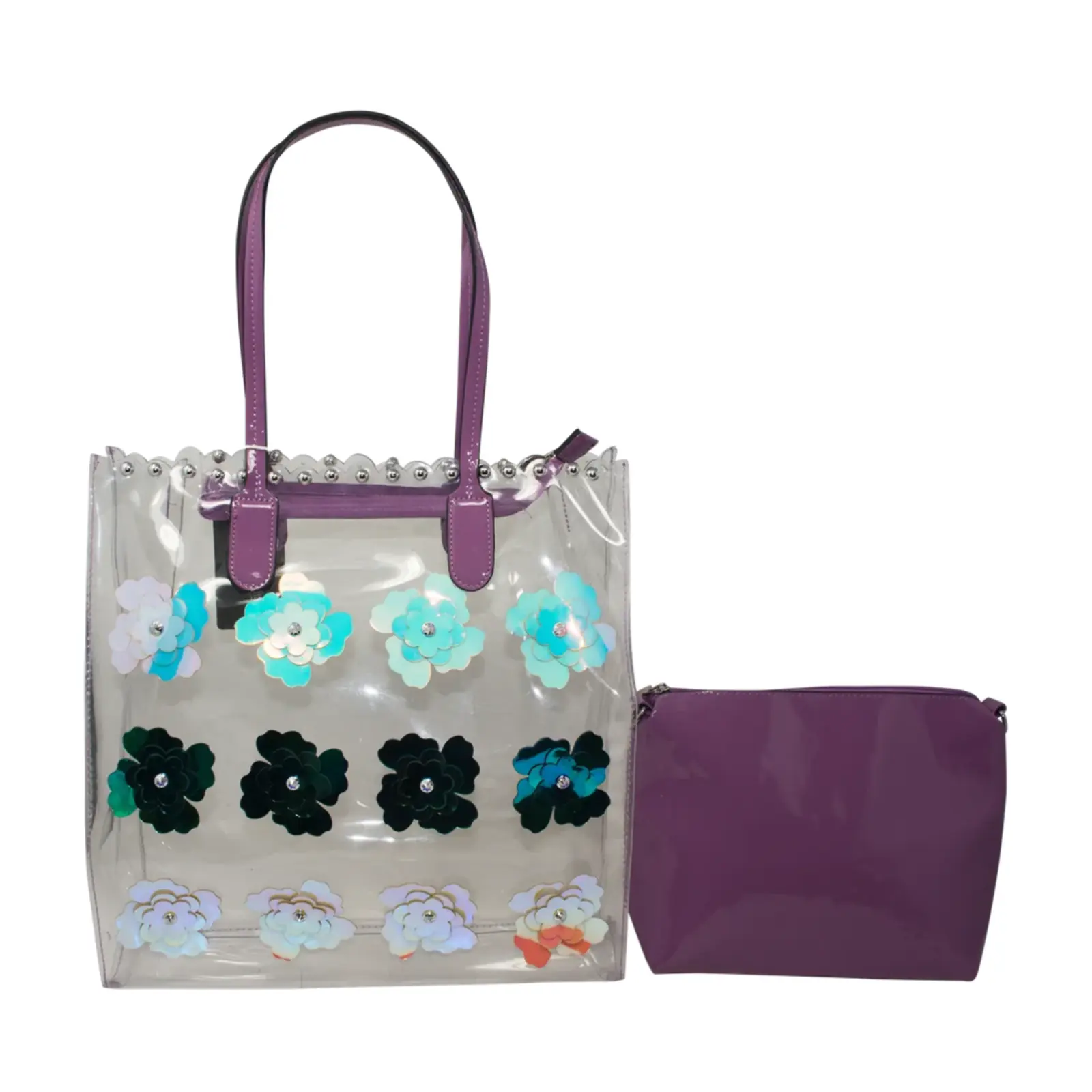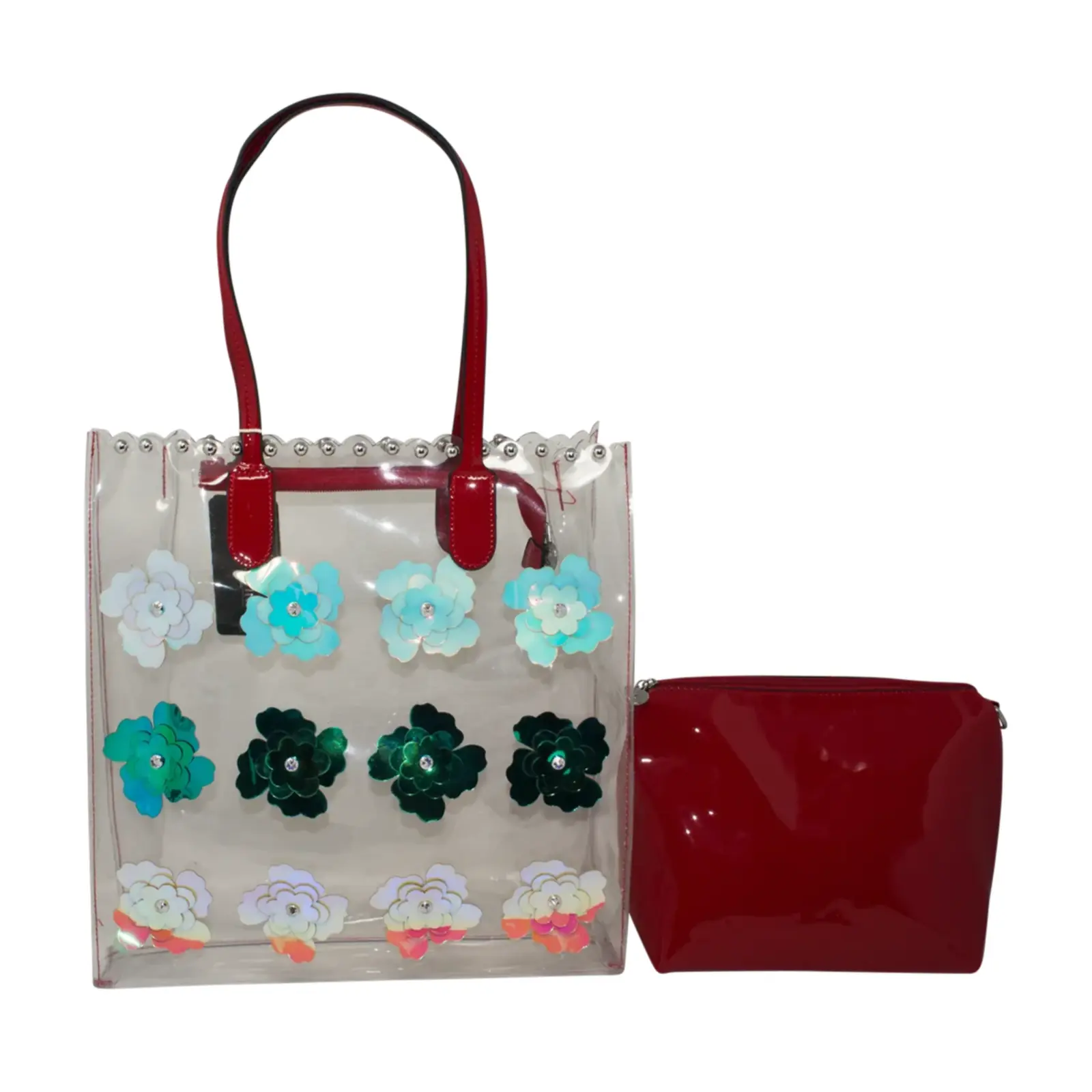 Stylish floral detail clear tote bag with a colour matched small bag Non-adjustable carry handle Zipped closure Comes with a strap L x W x H – 38cm x 10cm x 37cm.