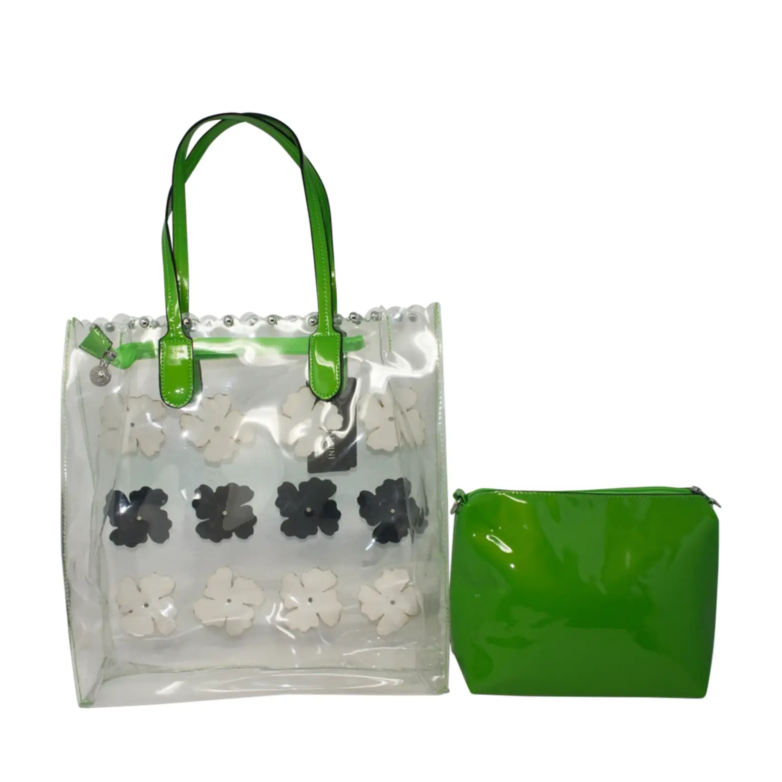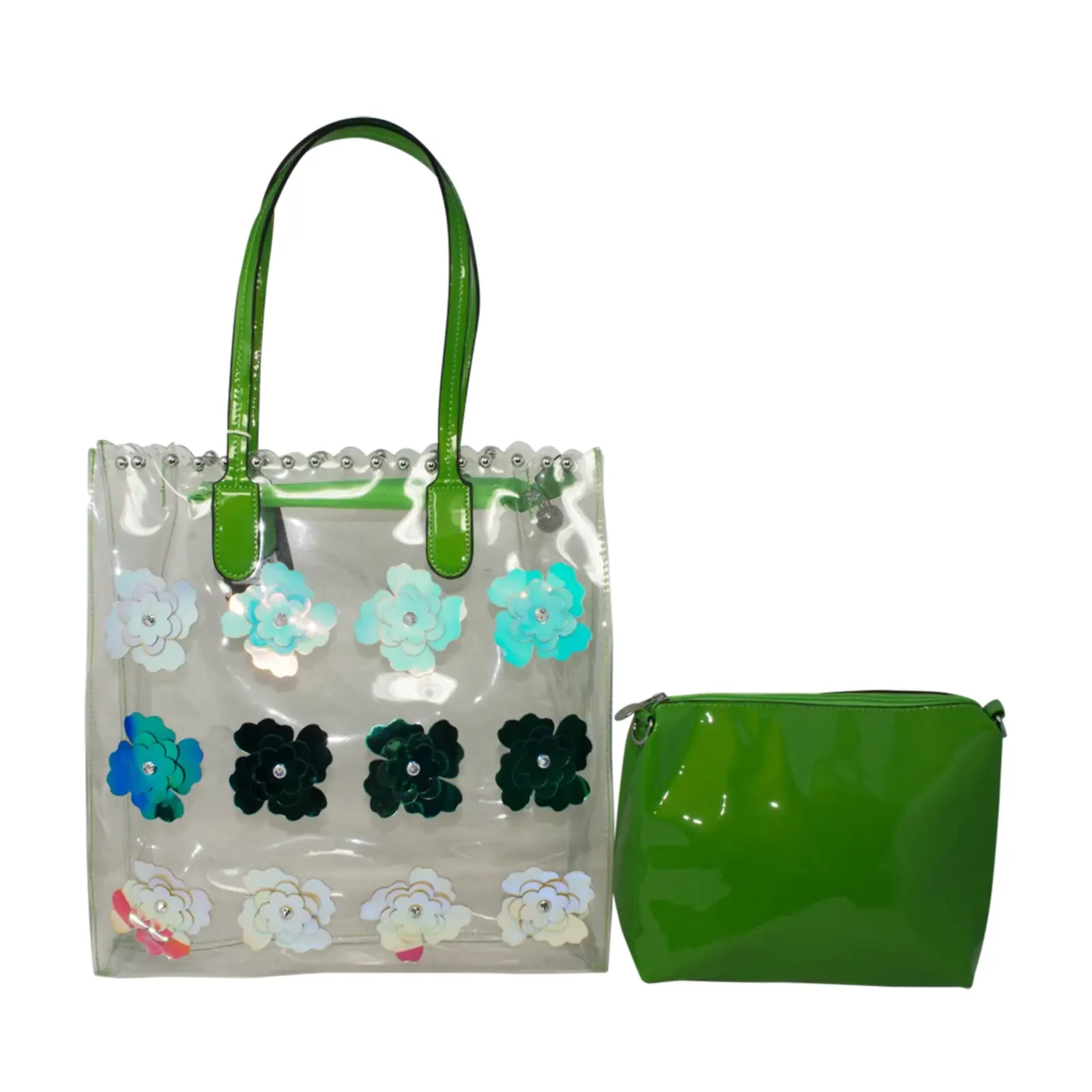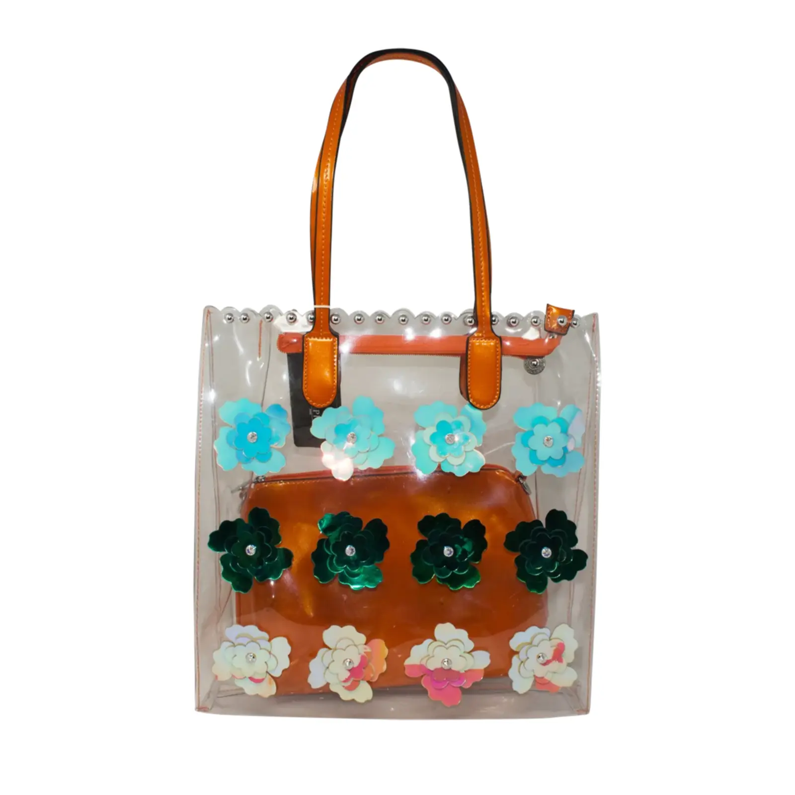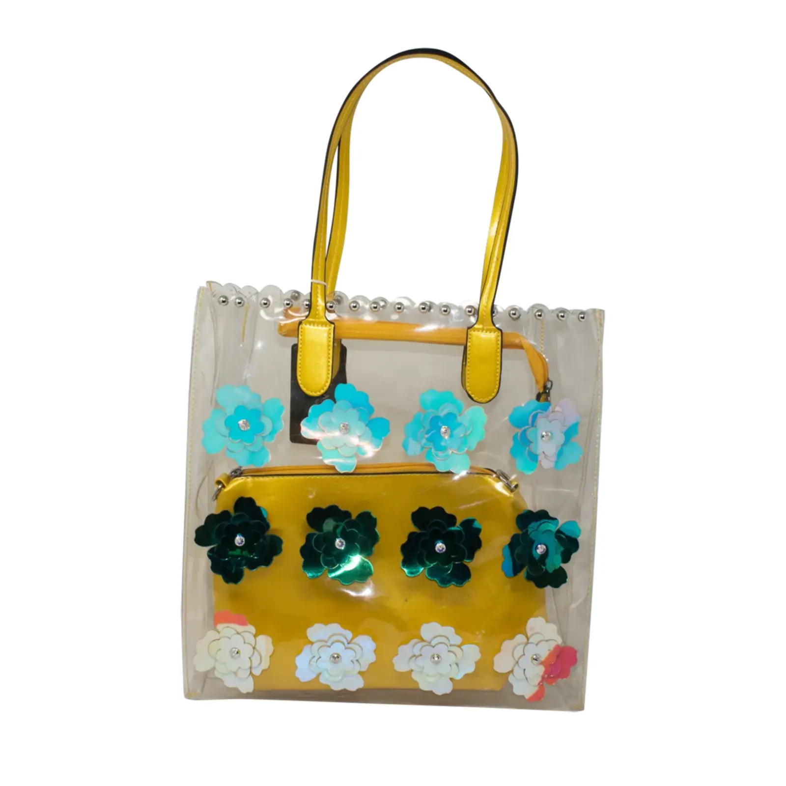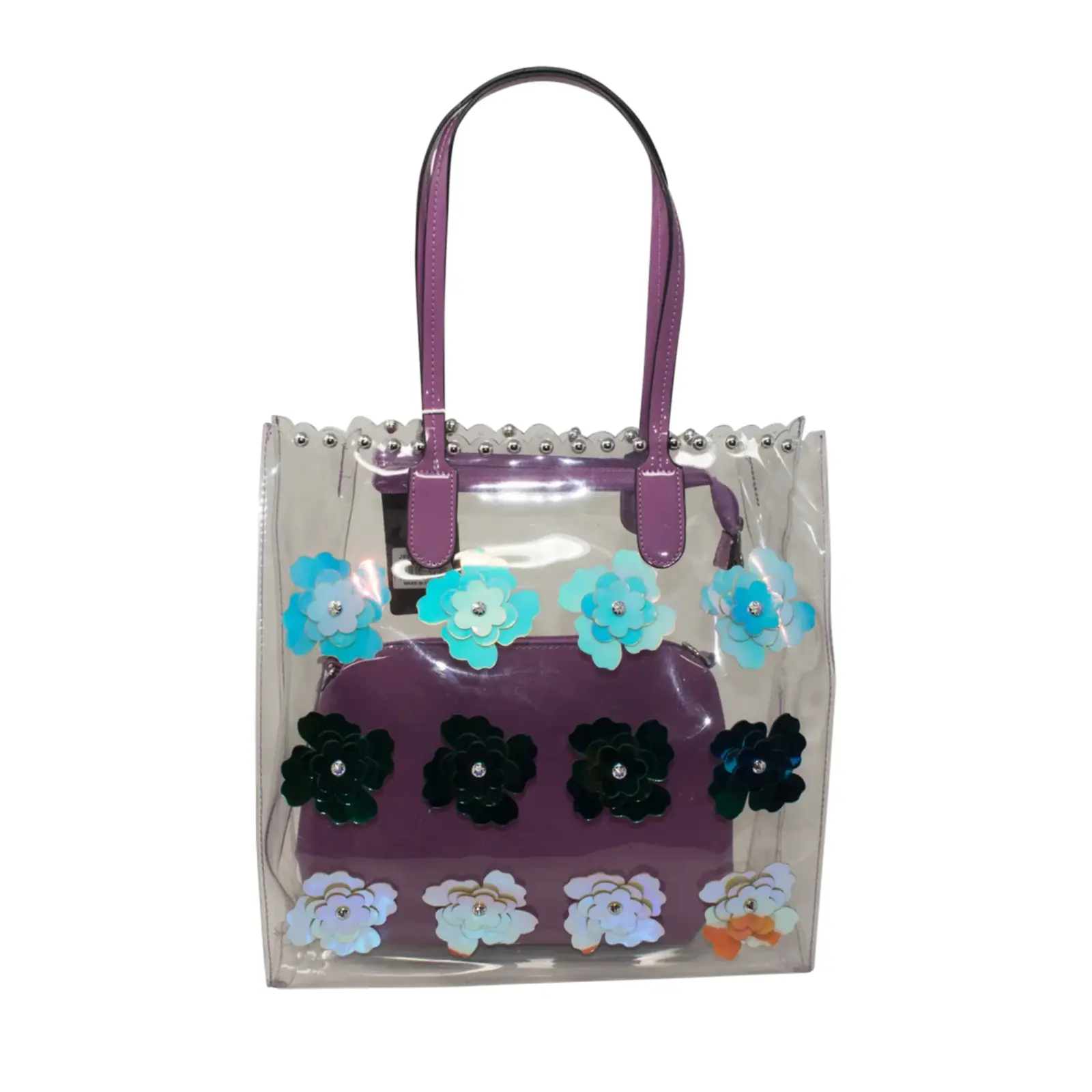 Stylish floral detail clear tote bag with a colour matched small bag Non-adjustable carry handle Zipped closure Comes with a strap L x W x H – 38cm x 10cm x 37cm.