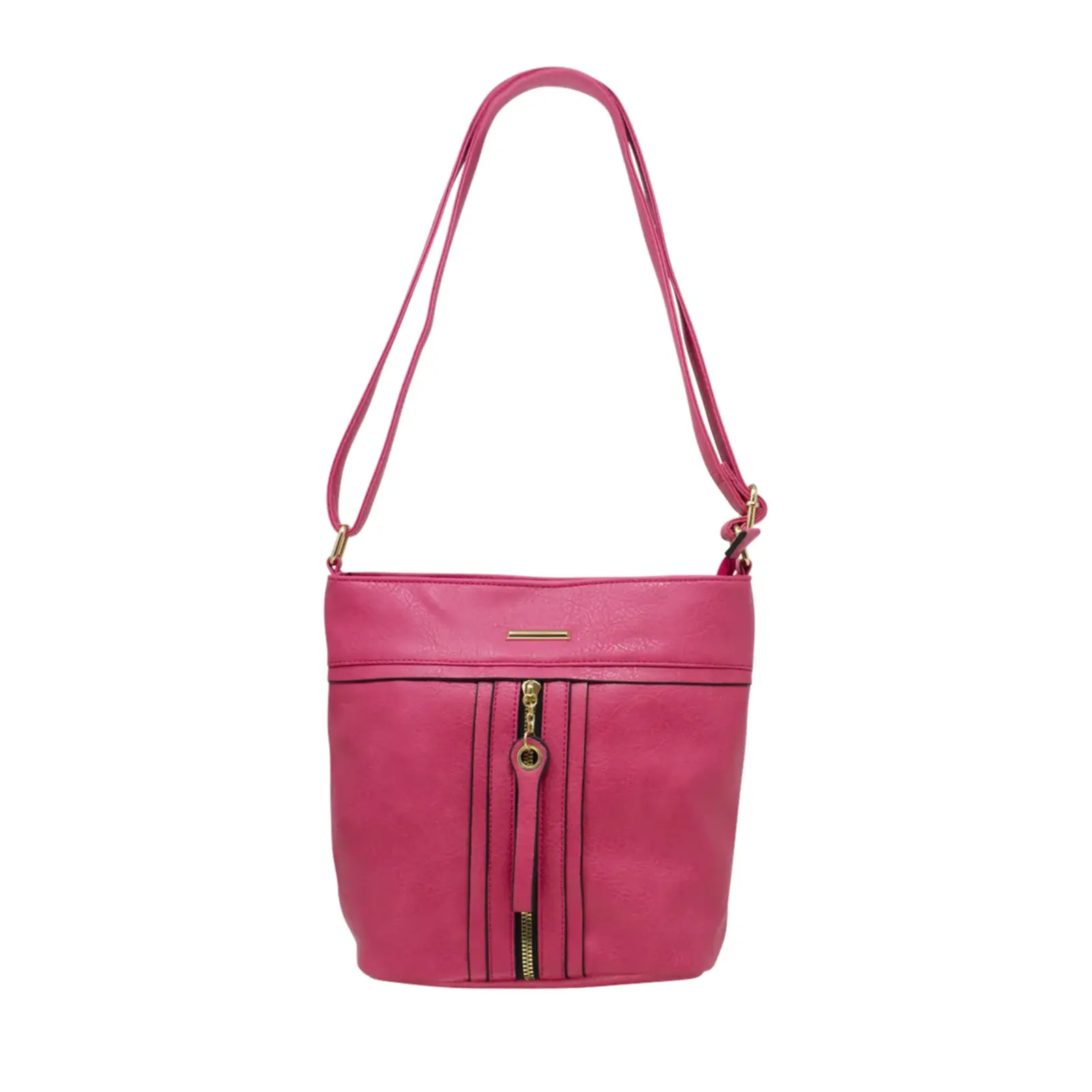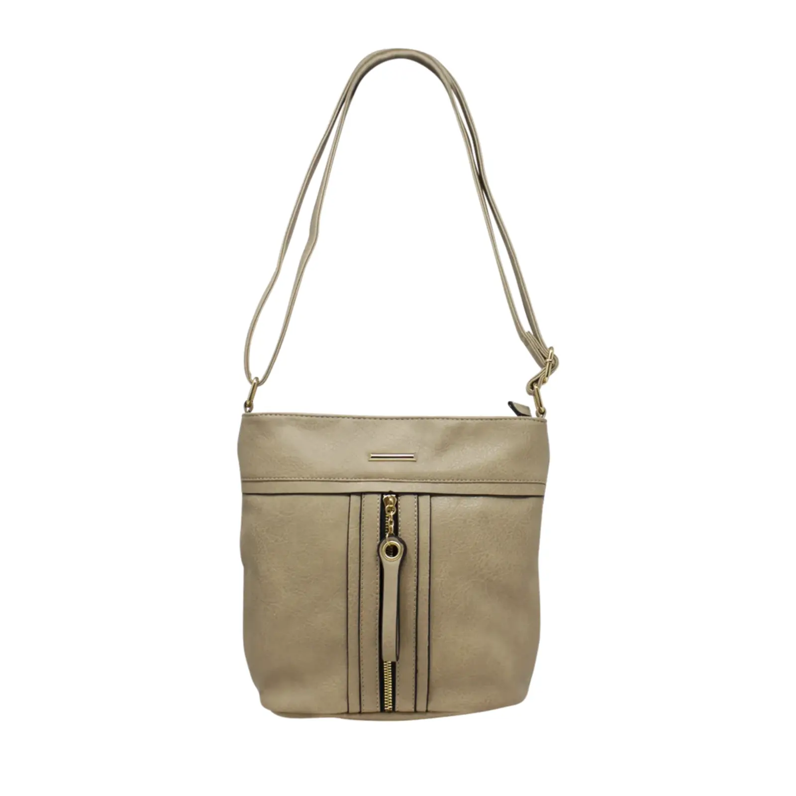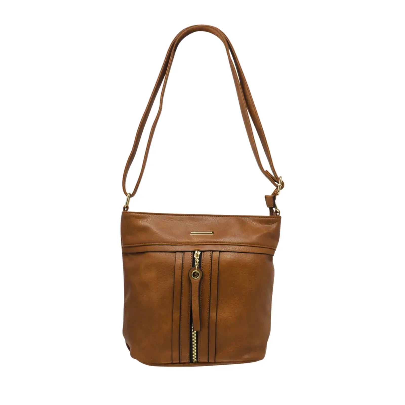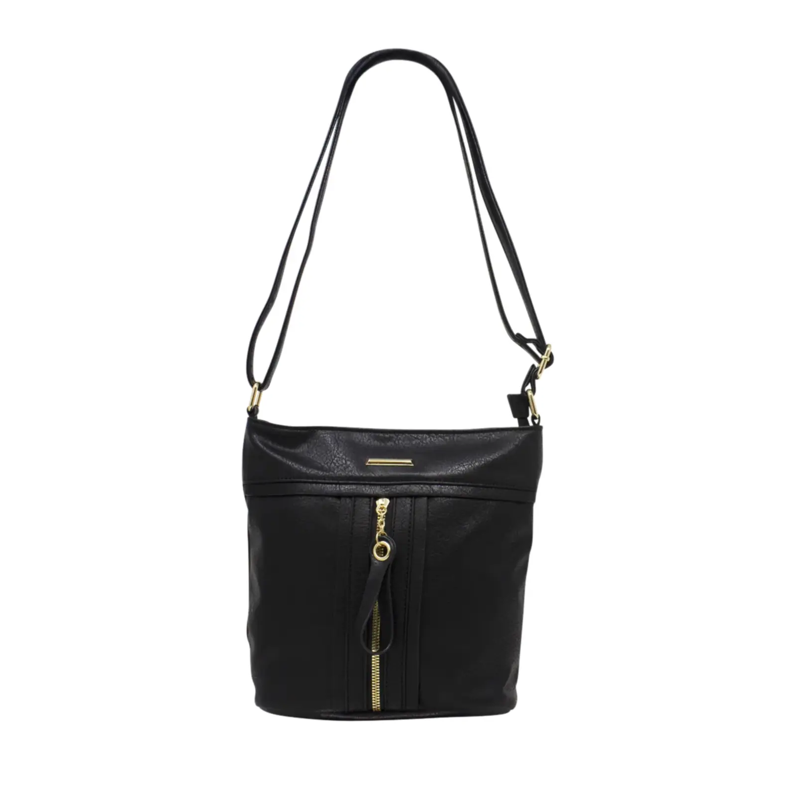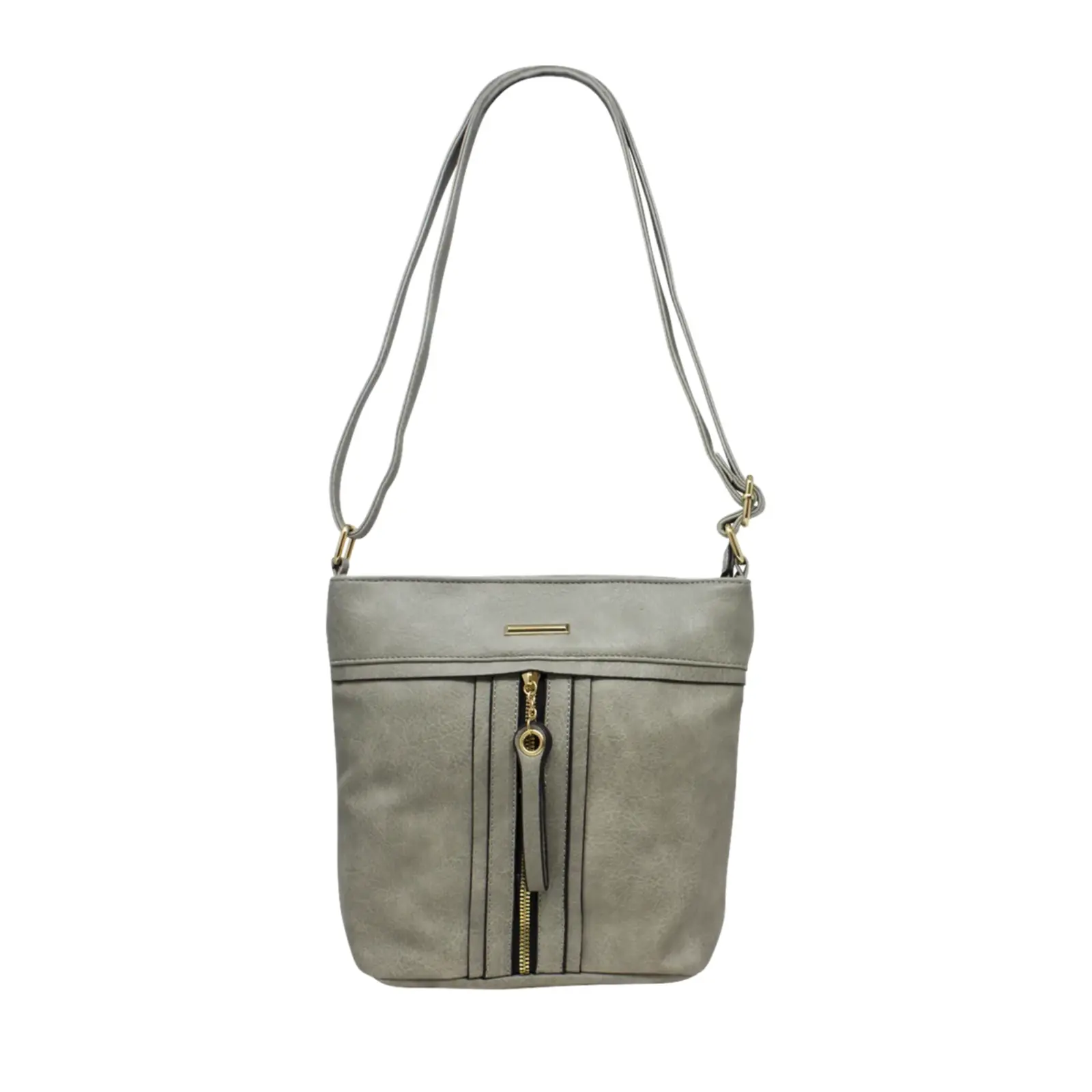 Perfect for on the go, this crossbody features a single front zip on the front, with a strap detail, and adjustable shoulder strap.