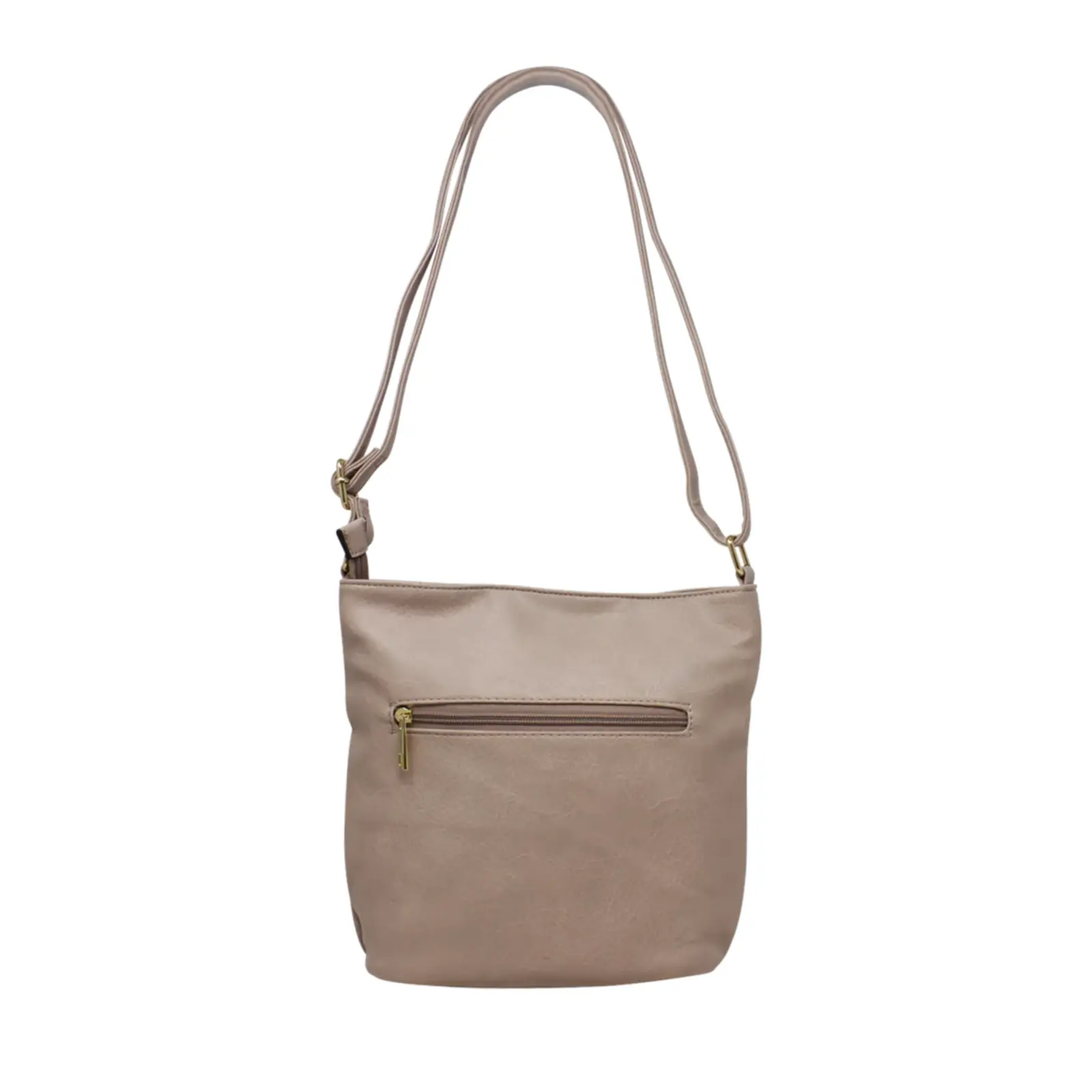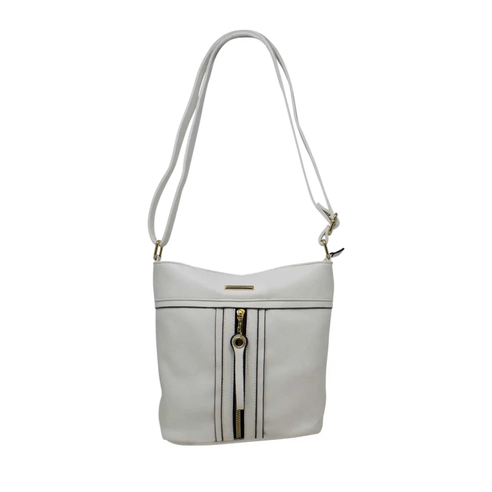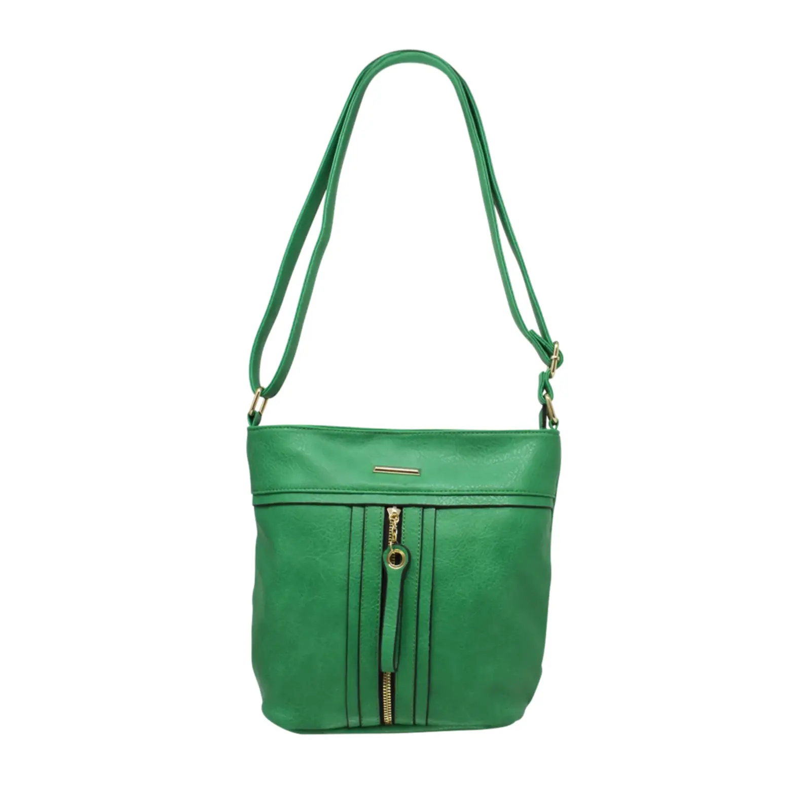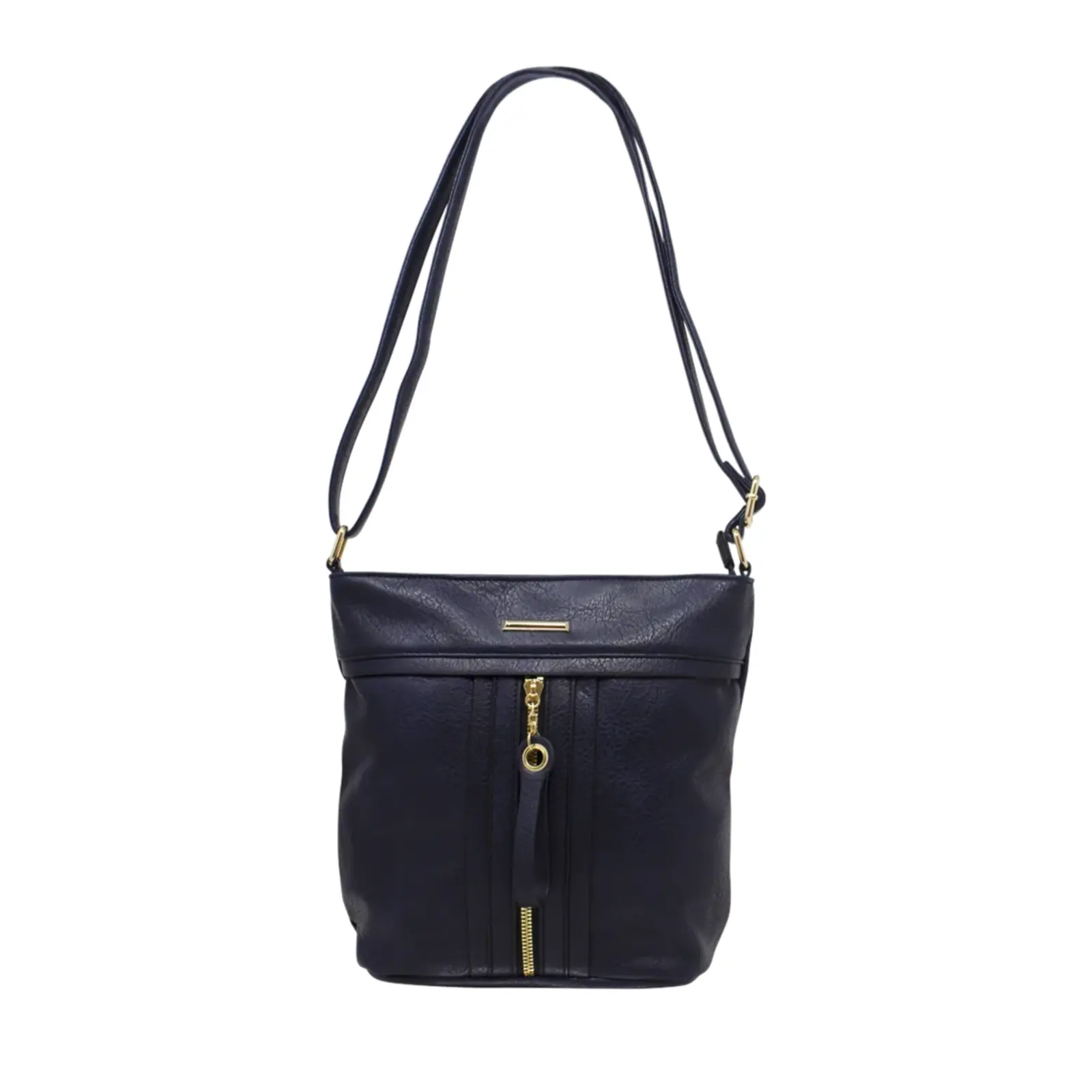 Perfect for on the go, this crossbody features a single front zip on the front, with a strap detail, and adjustable shoulder strap.