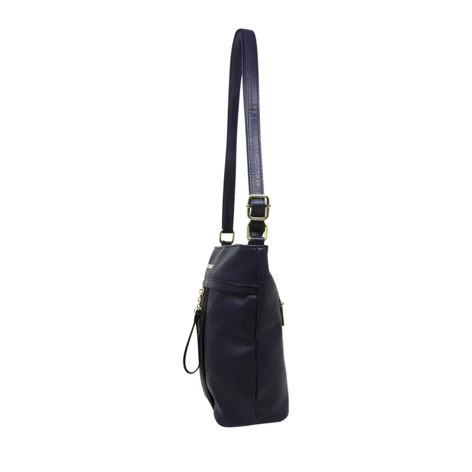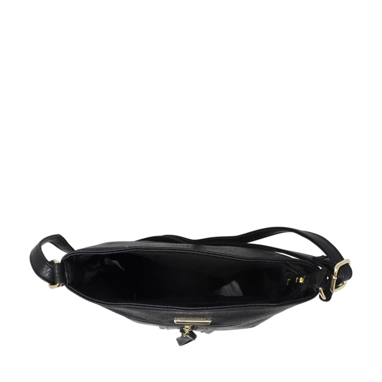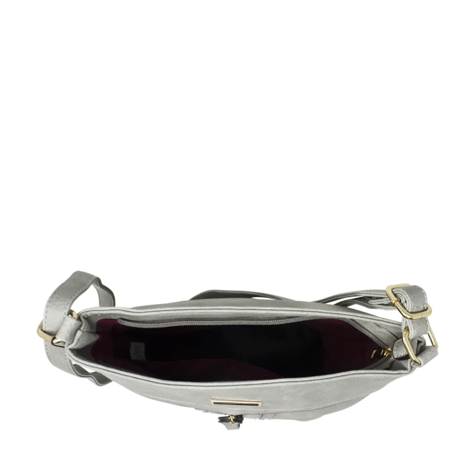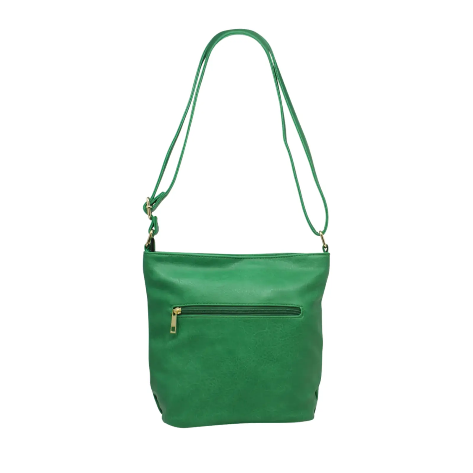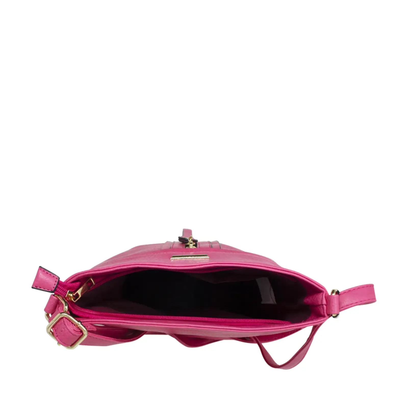 Perfect for on the go, this crossbody features a single front zip on the front, with a strap detail, and adjustable shoulder strap.