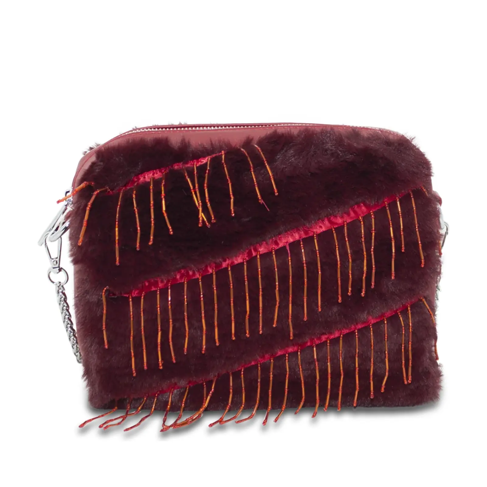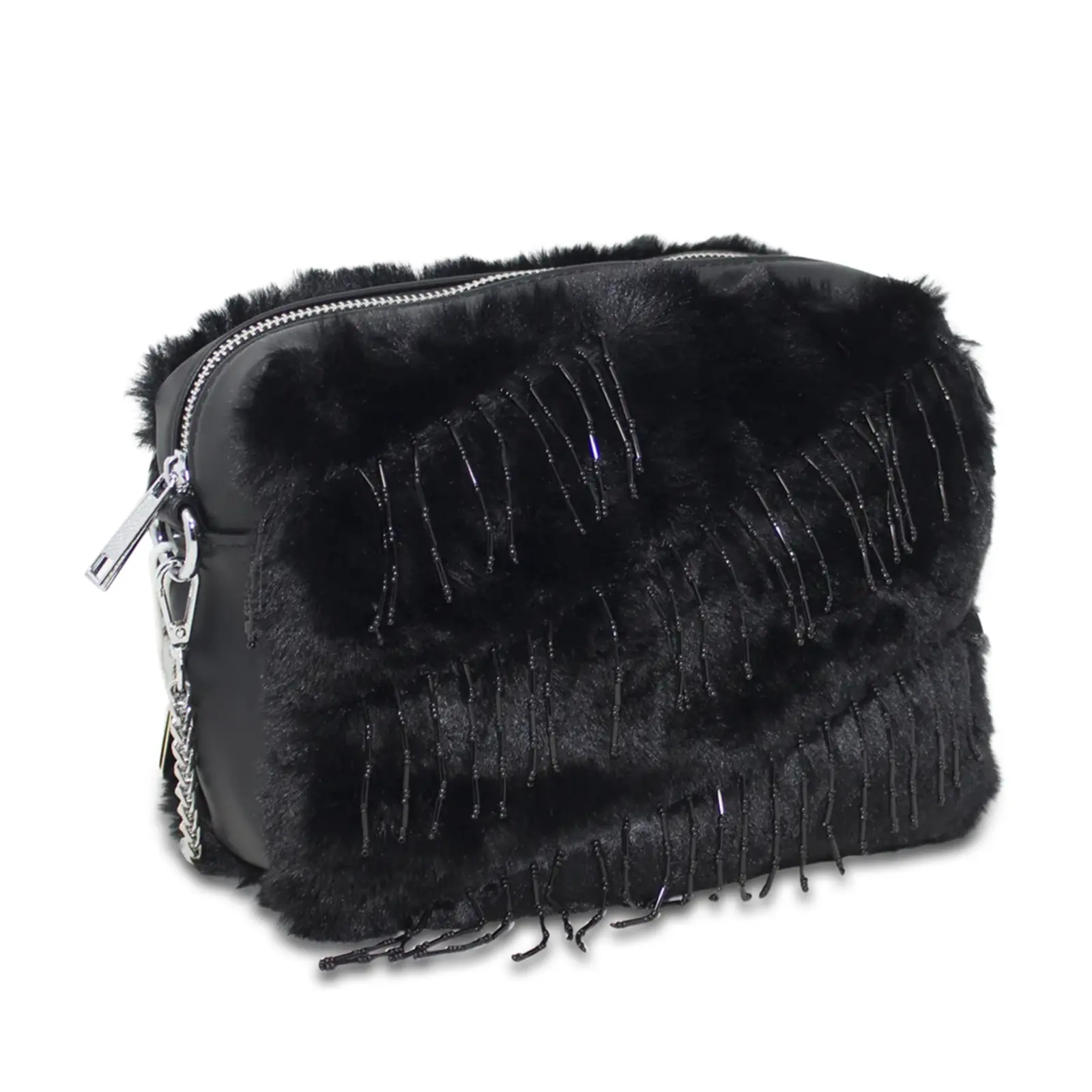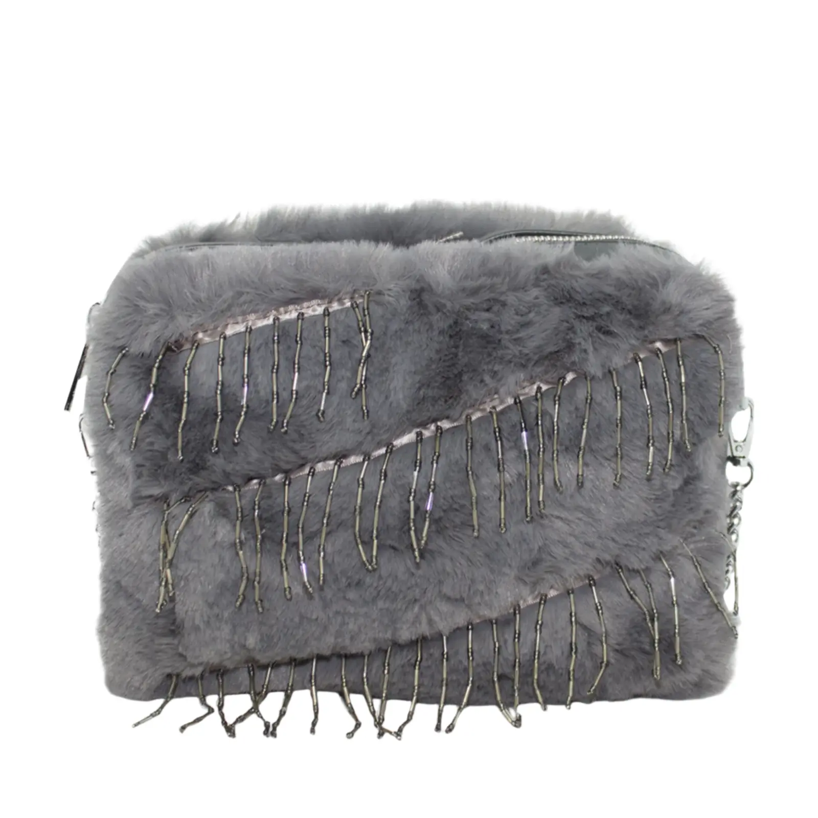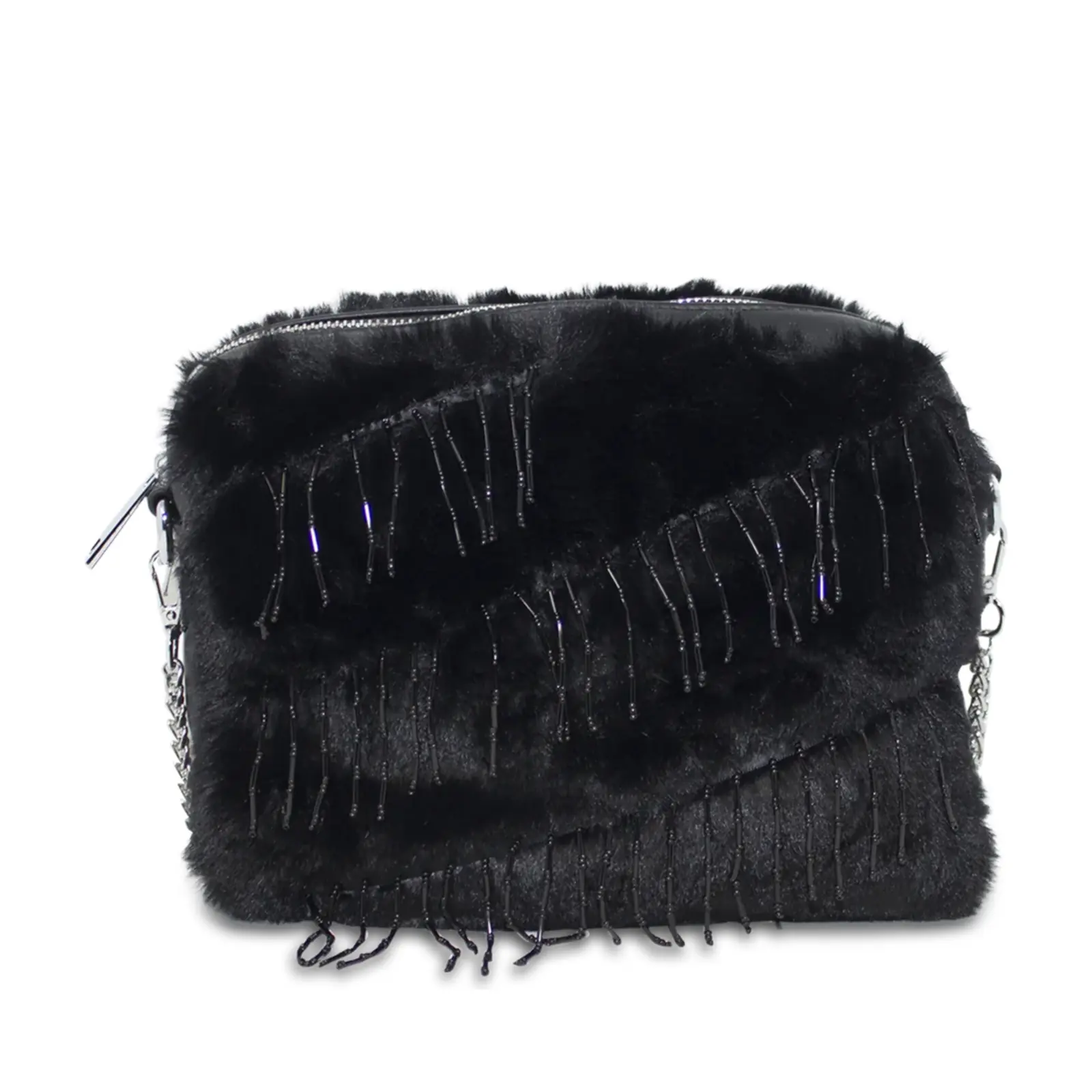 Fluffy Small Shoulder Bag with Triple Tassels Detachable metal chain. Zip clousure L x W x H – 24cm x 12cm x 19cm.