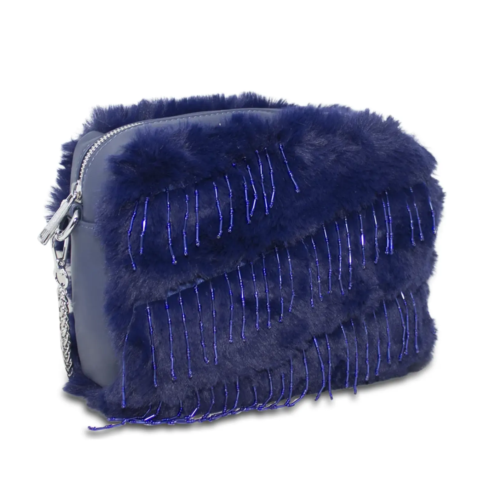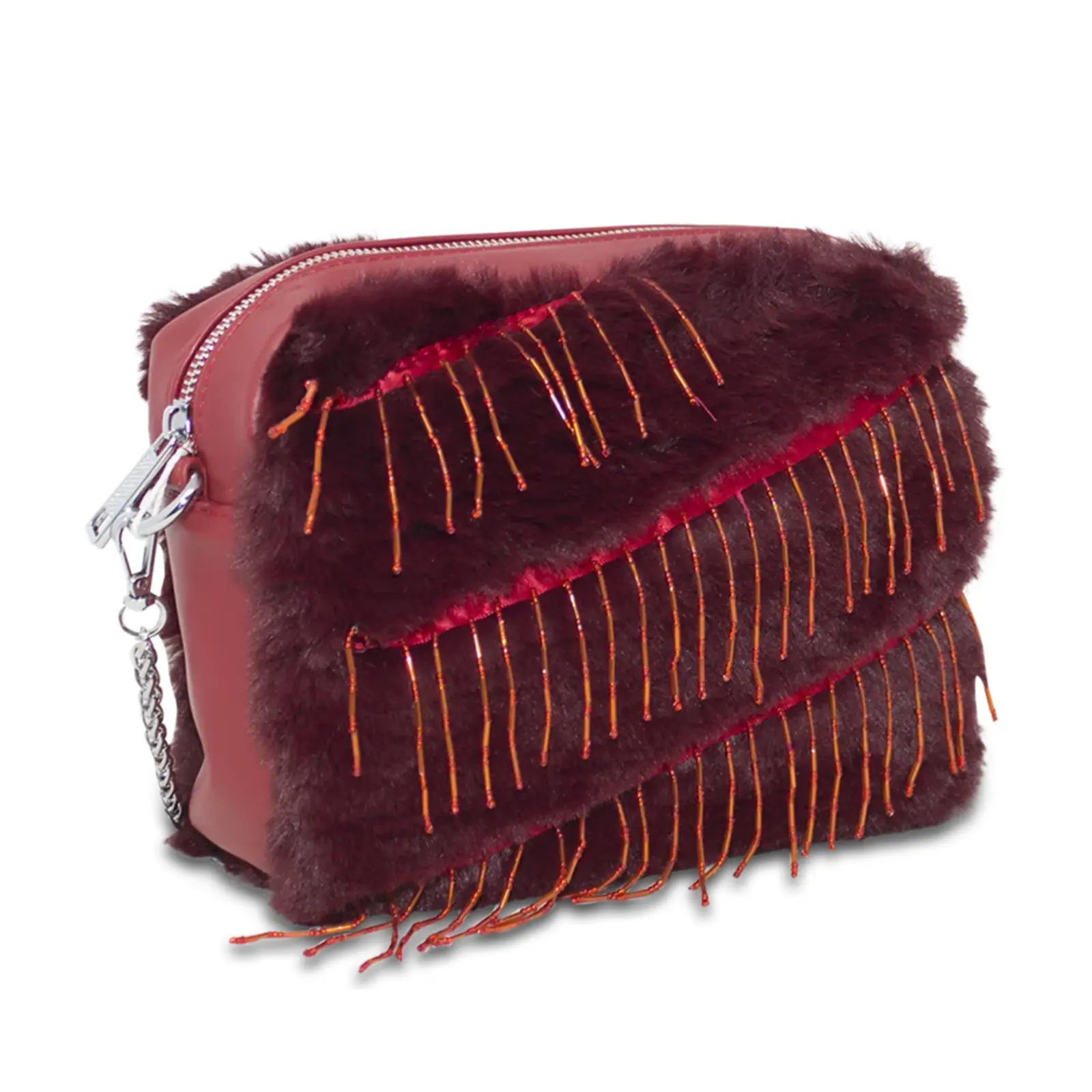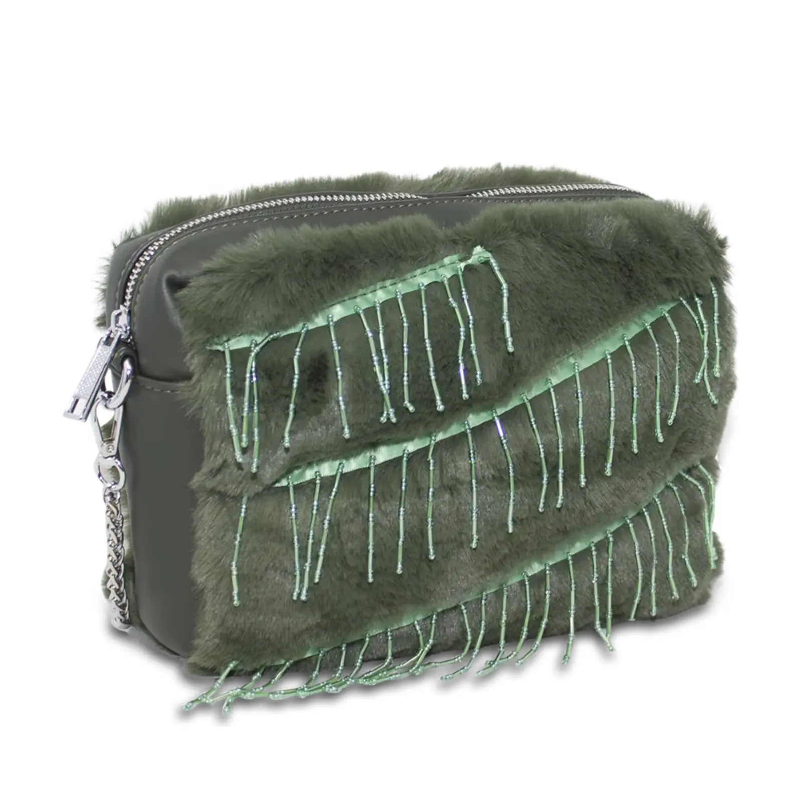 Fluffy Small Shoulder Bag with Triple Tassels Detachable metal chain. Zip clousure L x W x H – 24cm x 12cm x 19cm.