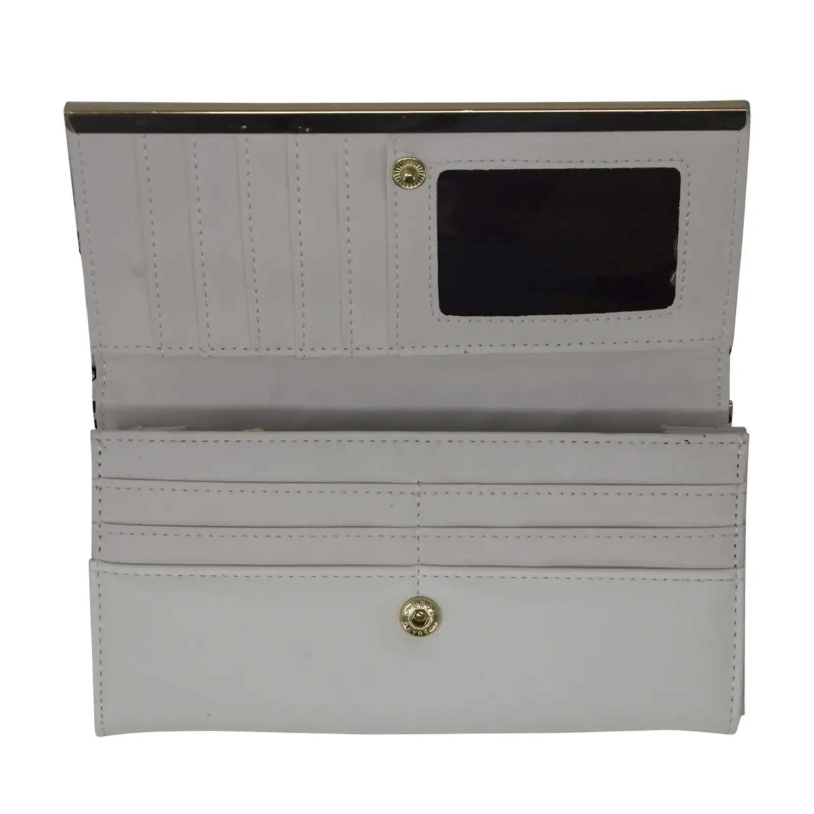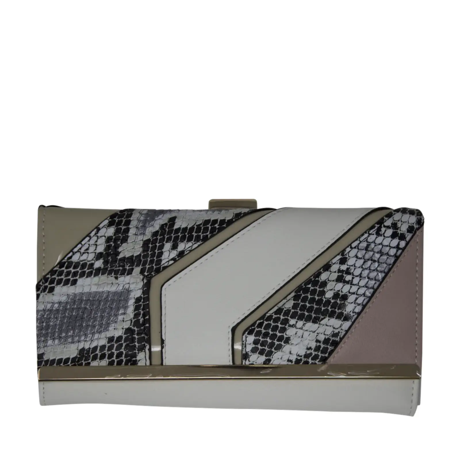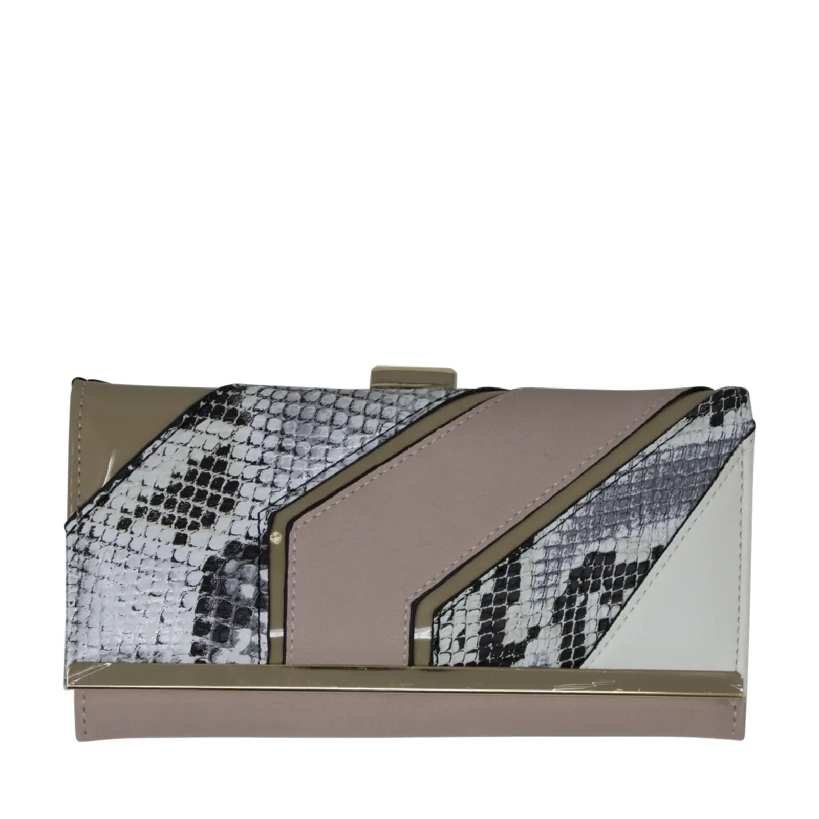 Beautiful faux leather clutch with clip top compartment Mixed pattern design with croc print panel inserts Gold tone hardware Foldout design Internal card slots Zip coin compartment L x W x H – 19.5cm x 3.5cm x 10cm.