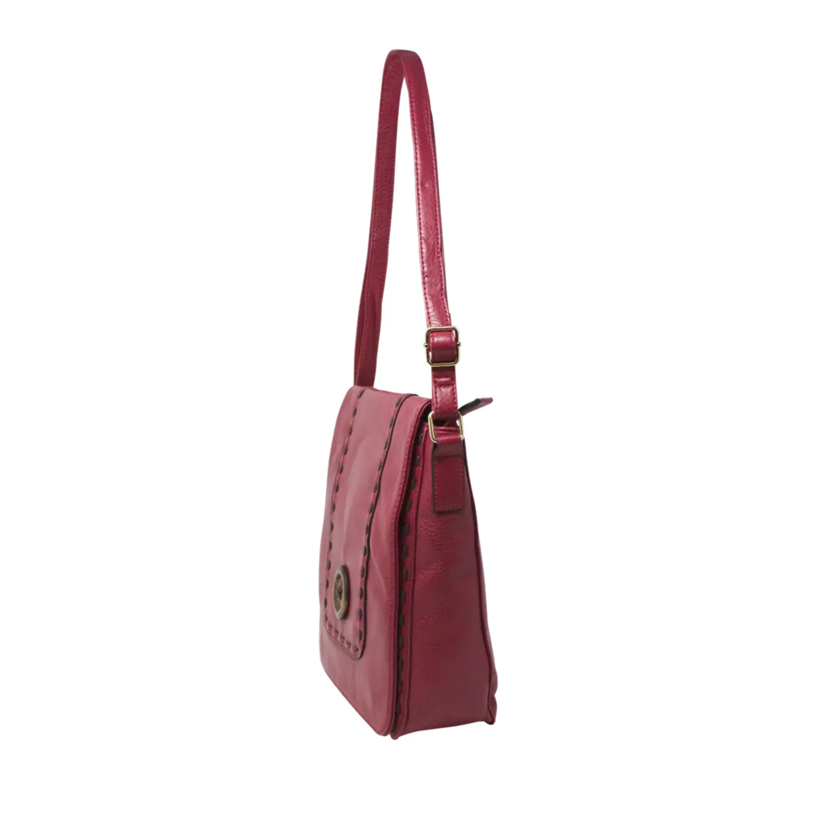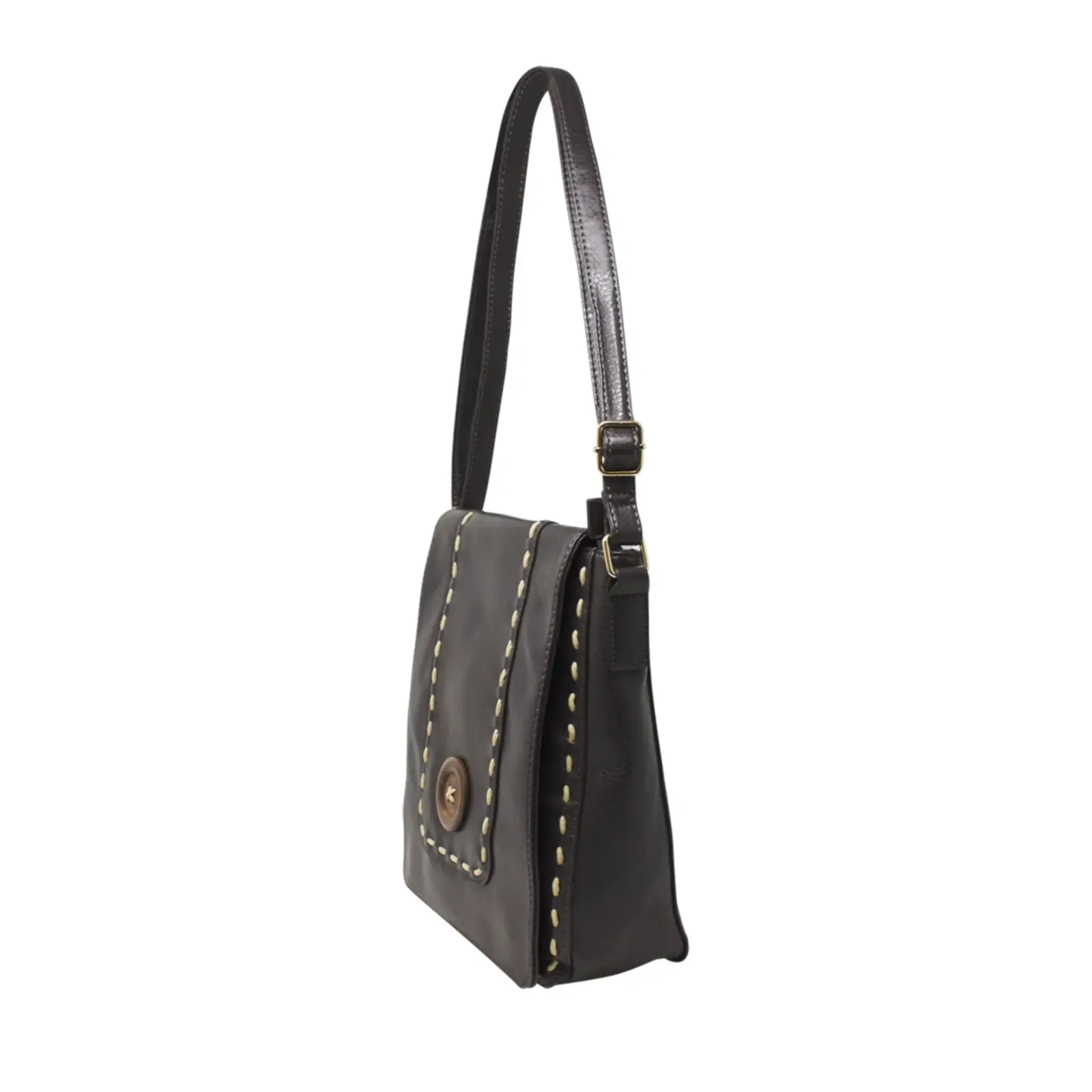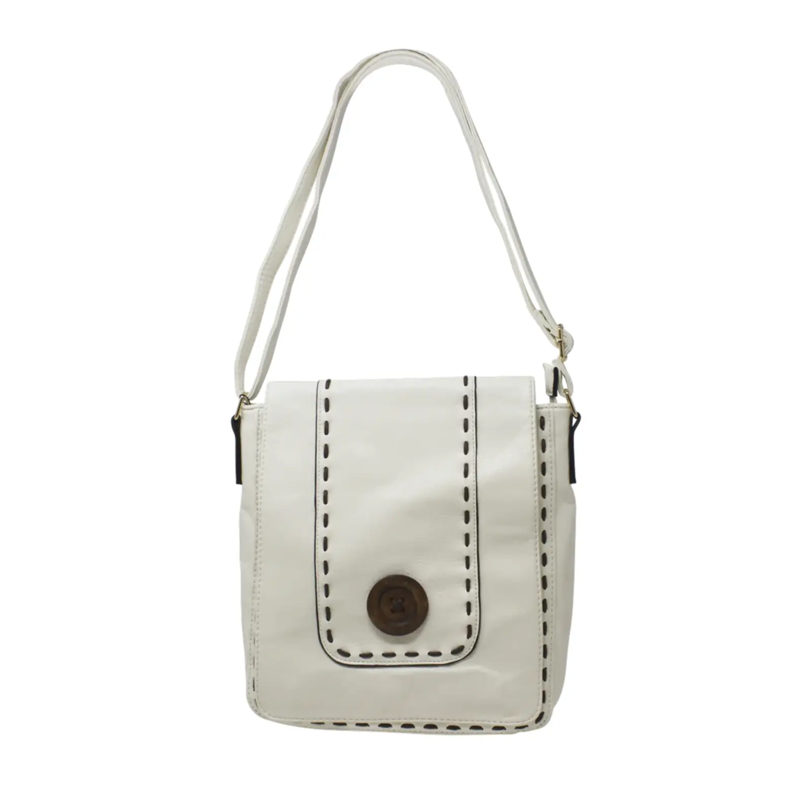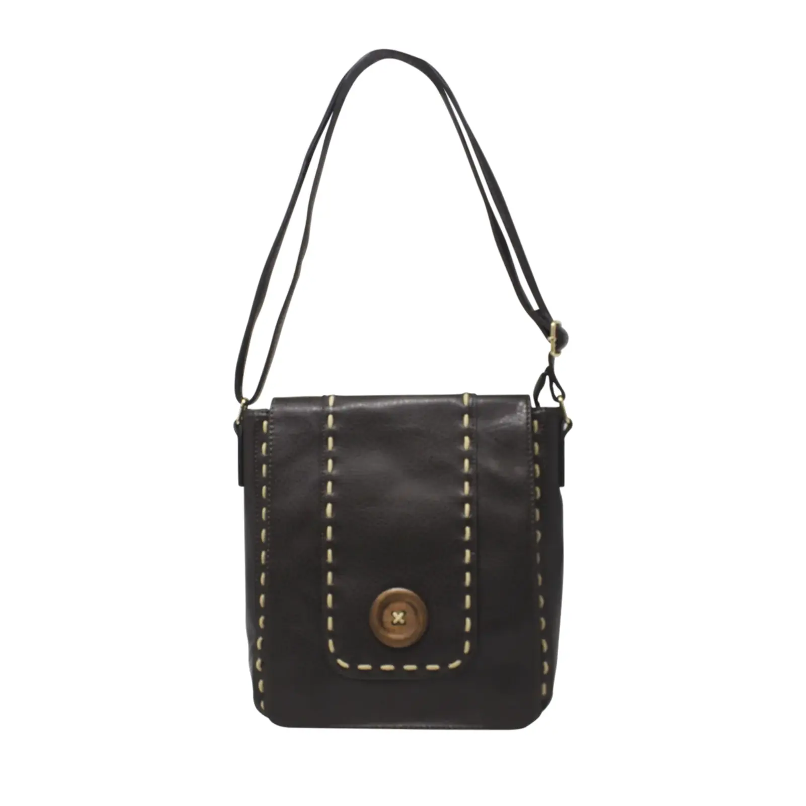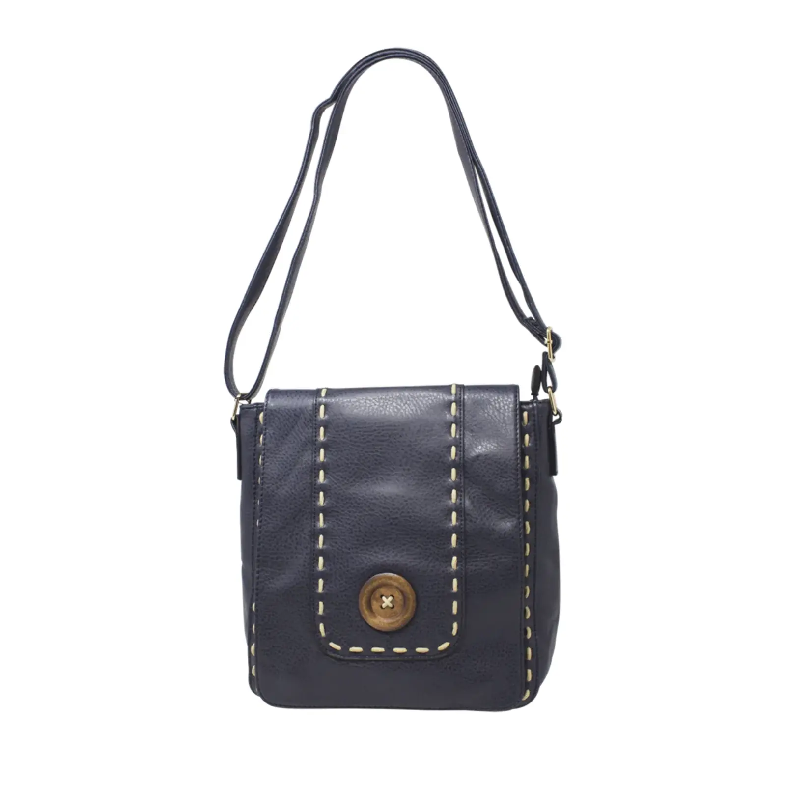 This is a crossbody bag that features a wooden button with stitched lines at the front. It is a classic crossbody suitable for everyday use.