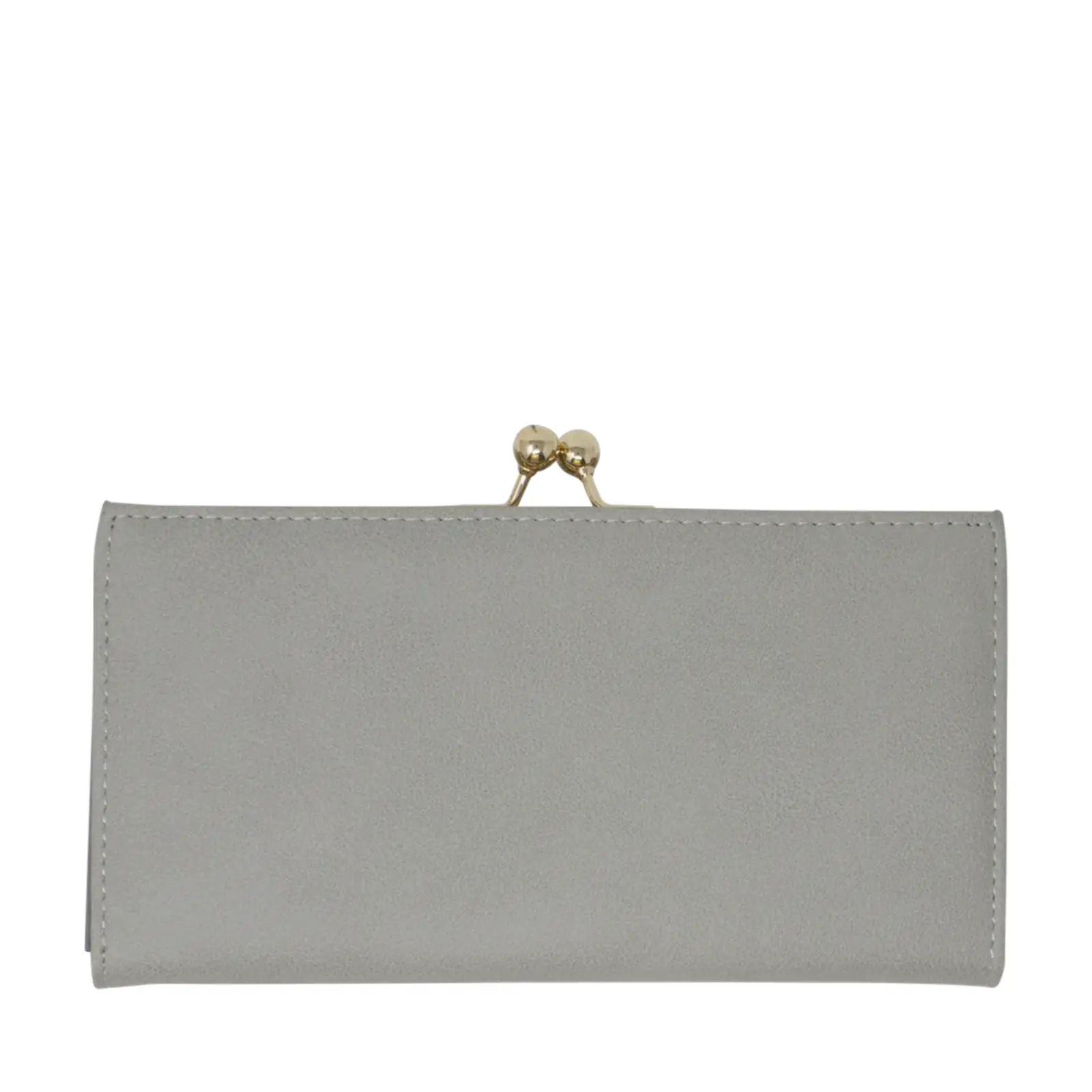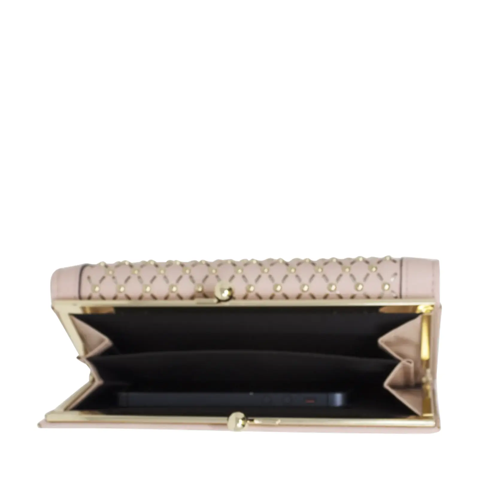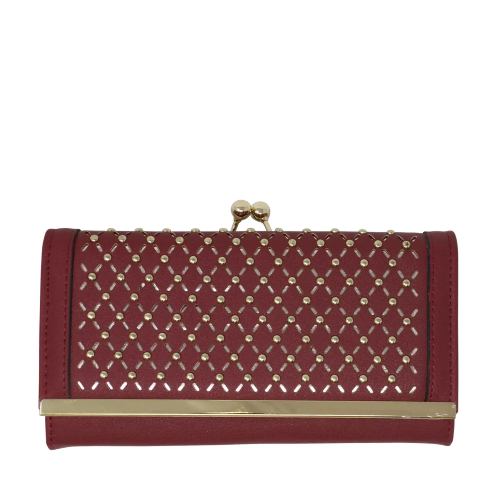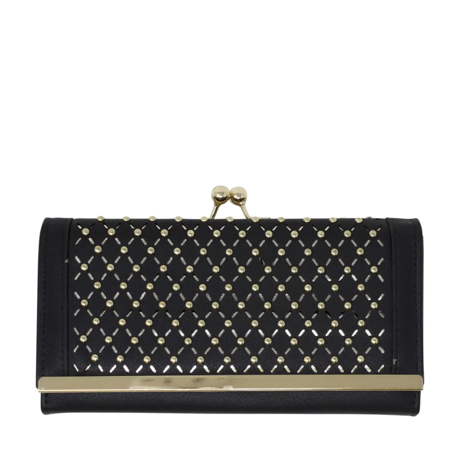 Beautiful faux leather clutch with clip top compartment Studs designed into a diamond patterns Gold tone hardware Foldout design Internal card slots Zip coin compartment L x D x H – 19cm x 4cm x 10cm Comes with a gift box.