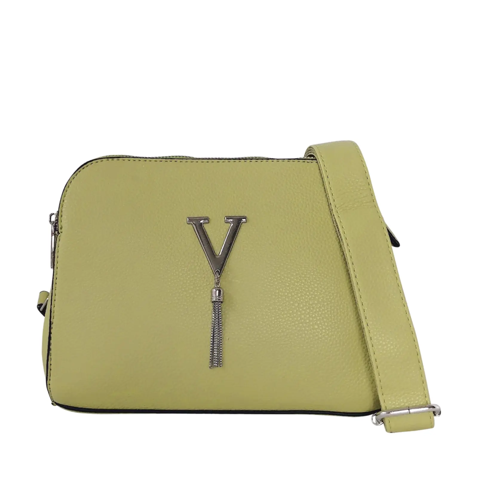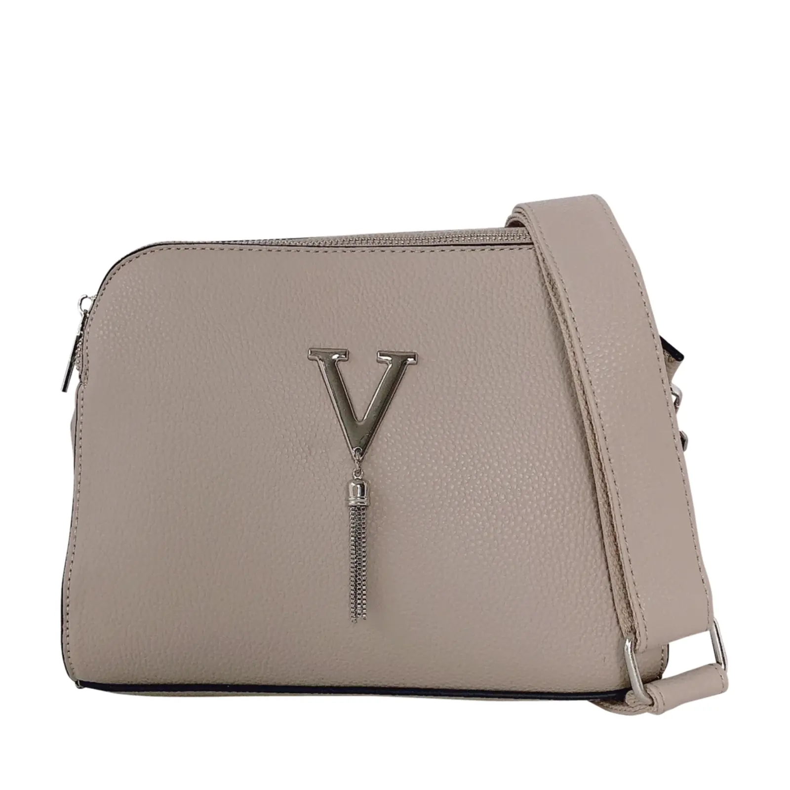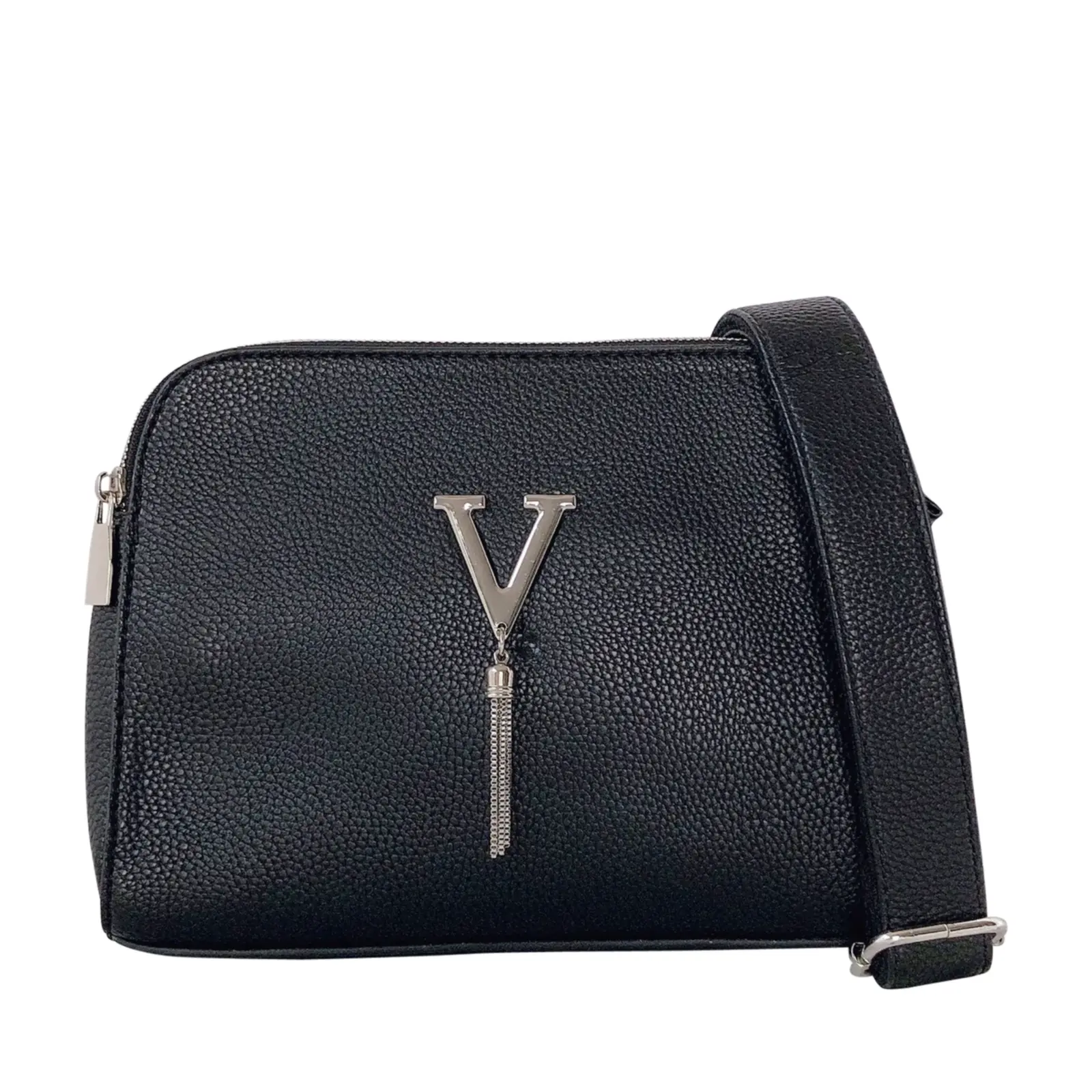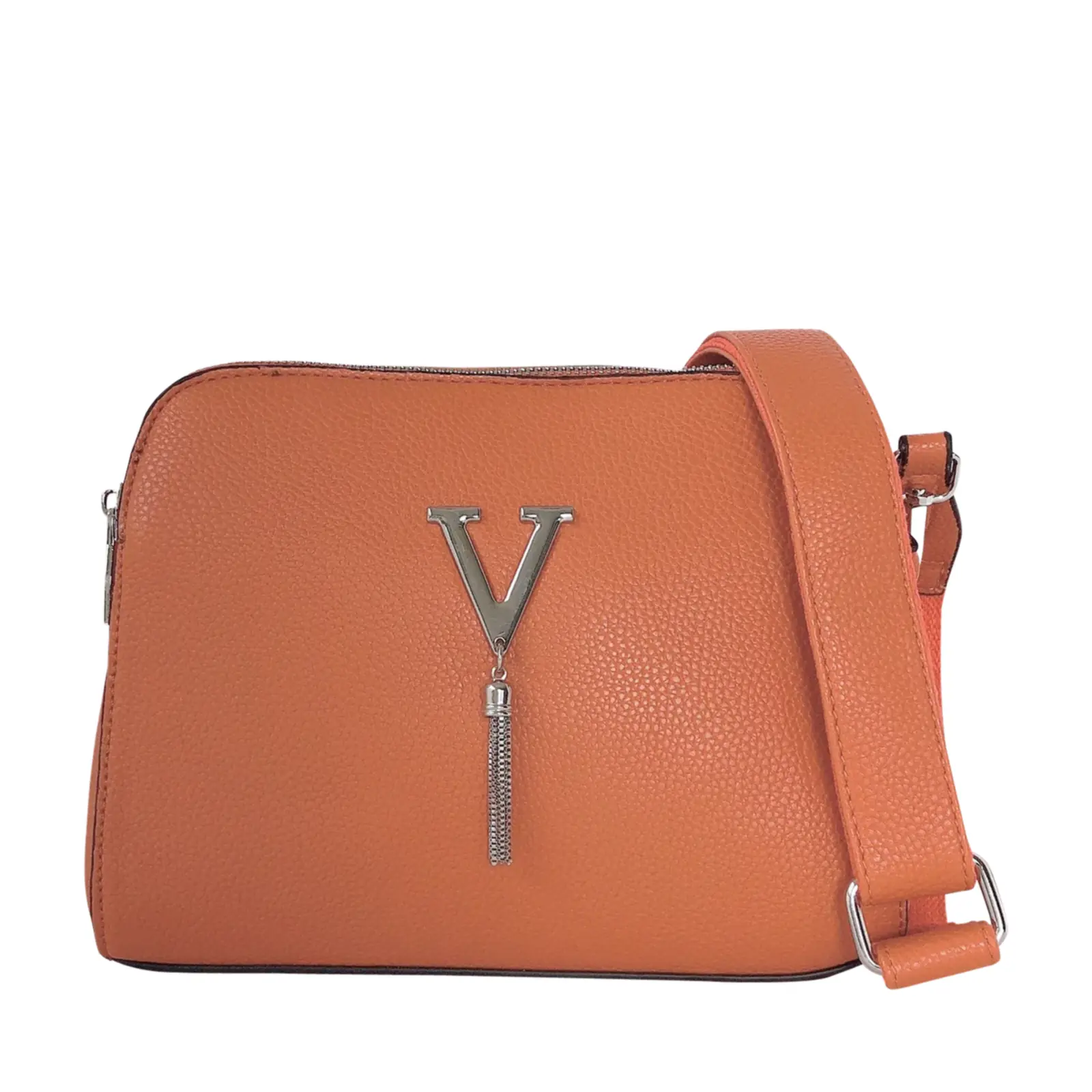 Chic, functional, and irresistibly stylish — the duo-compartment crossbody bag is your new everyday essential. This sleek piece features a striking metal V emblem and a signature hanging metal tassel that adds a luxurious finishing touch. Designed with two zipped compartments, it keeps your essentials organized without compromising on style.