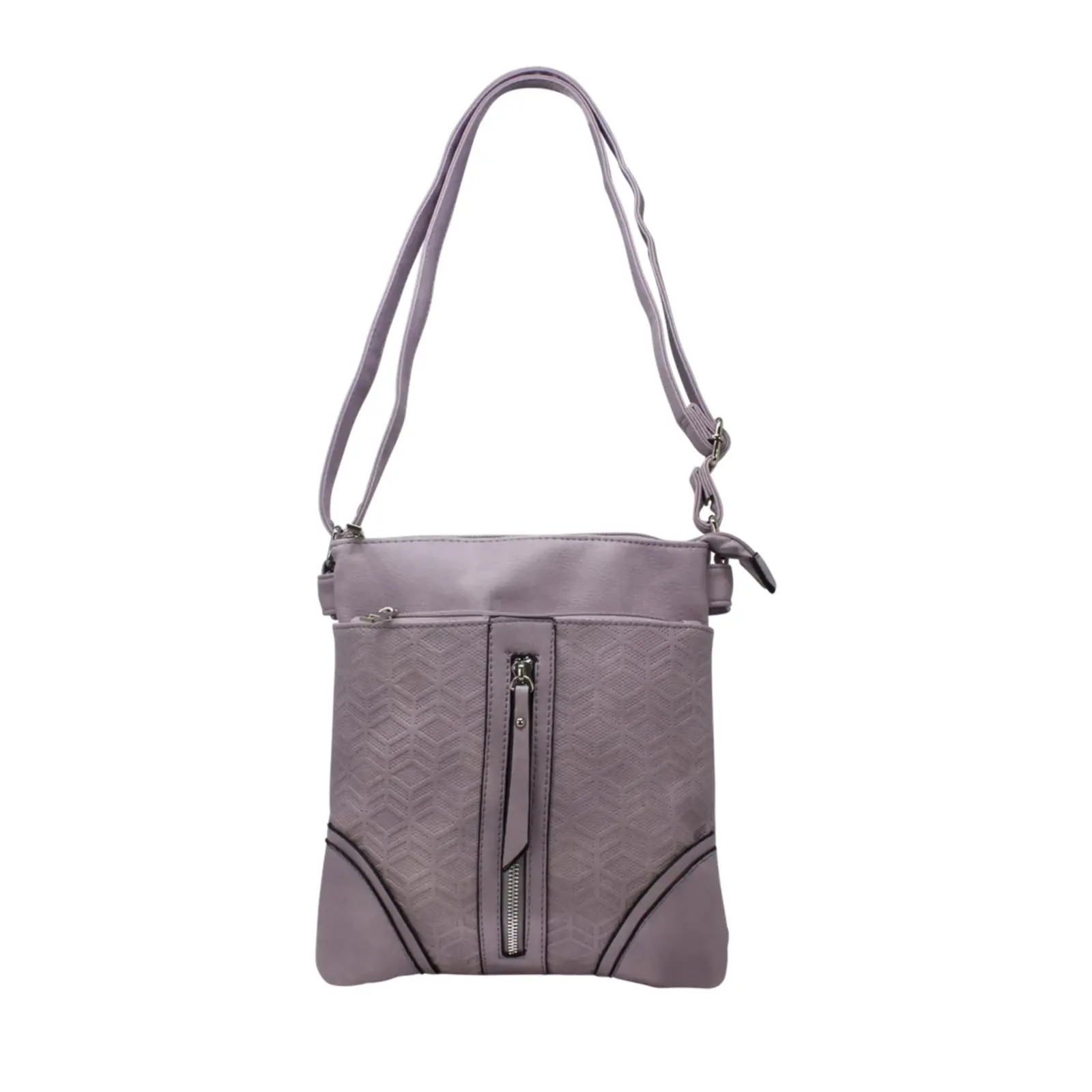 This crossbody has embossed cube patterns at the front with a vertical zipped line as decoration.