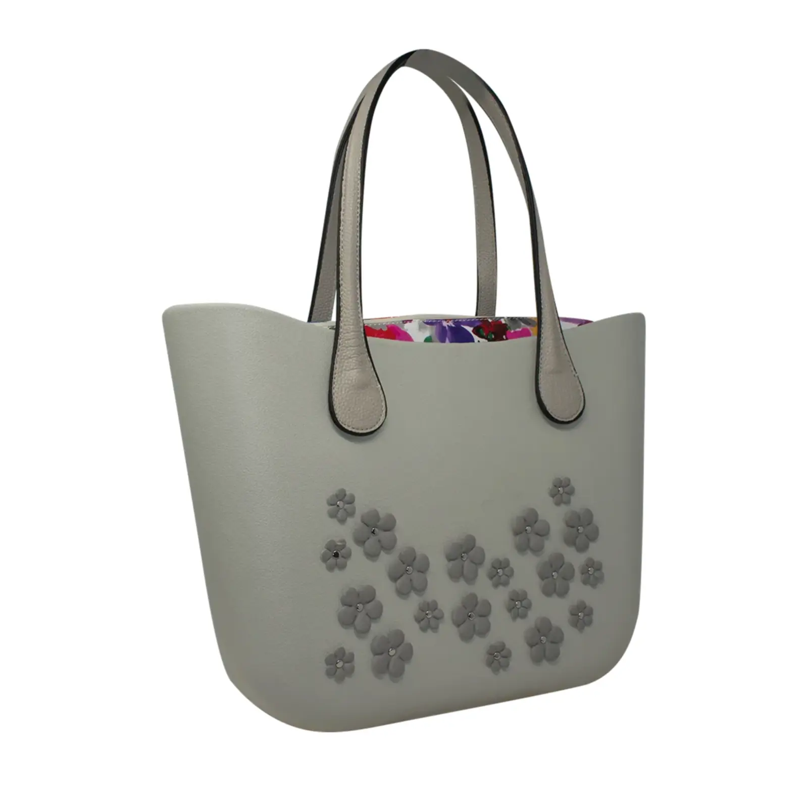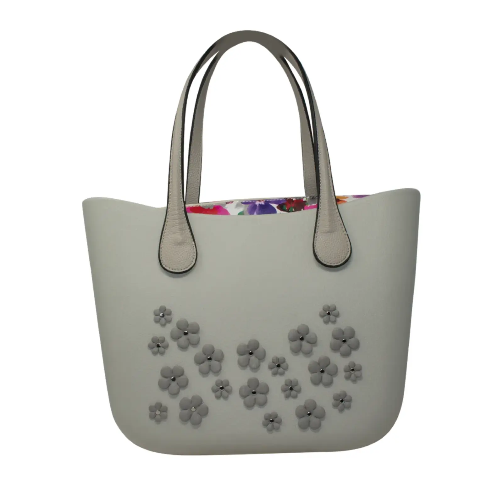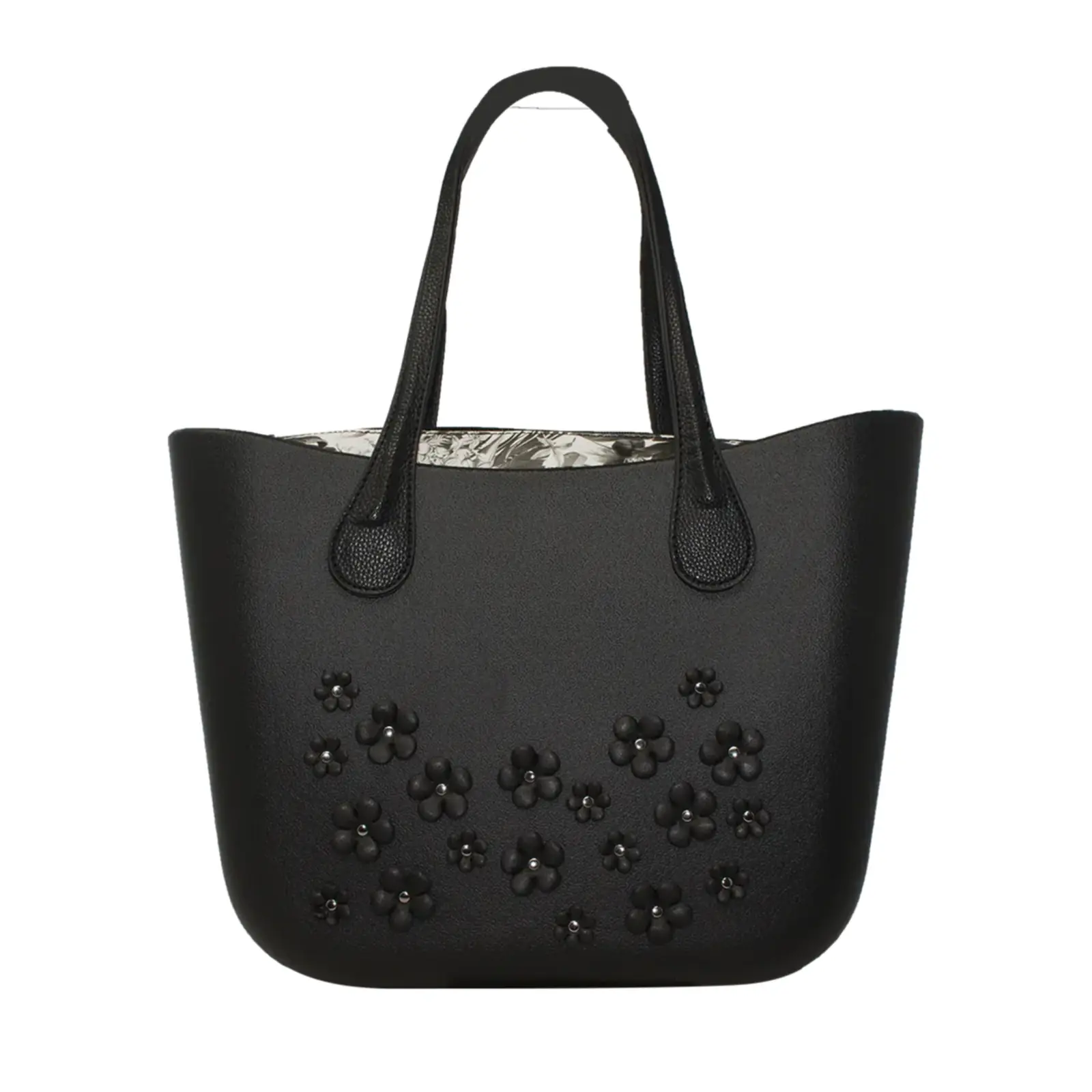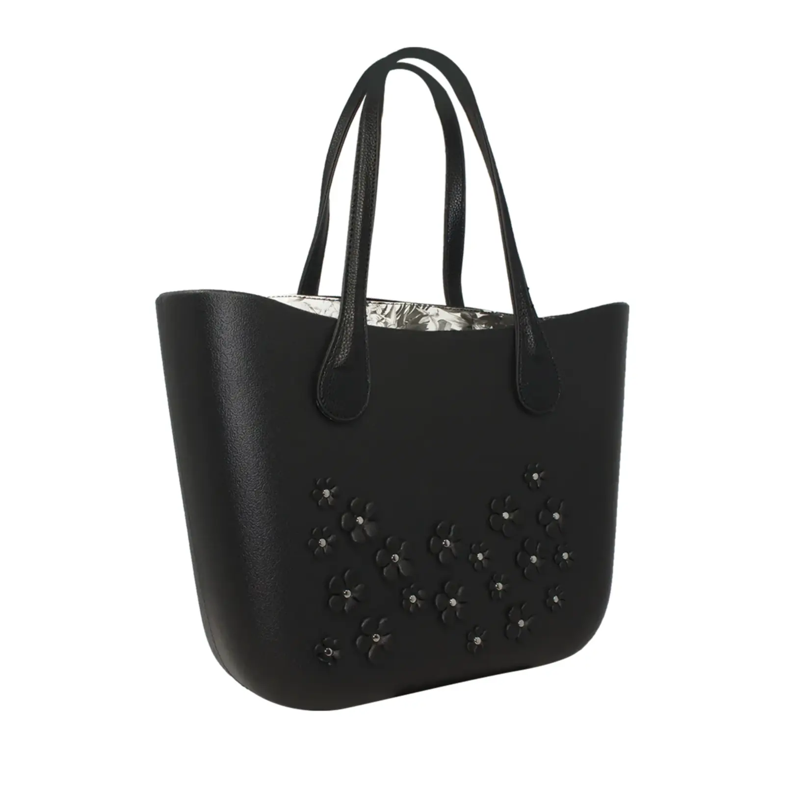 A stylish shoulder bag with 3D flower design Metal zipper closure Attractive floral lining of bag L x W x H – 38cm x 10cm x 30cm.