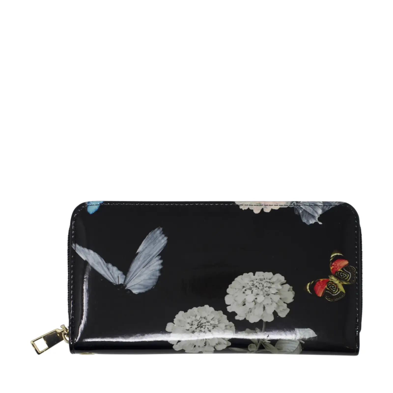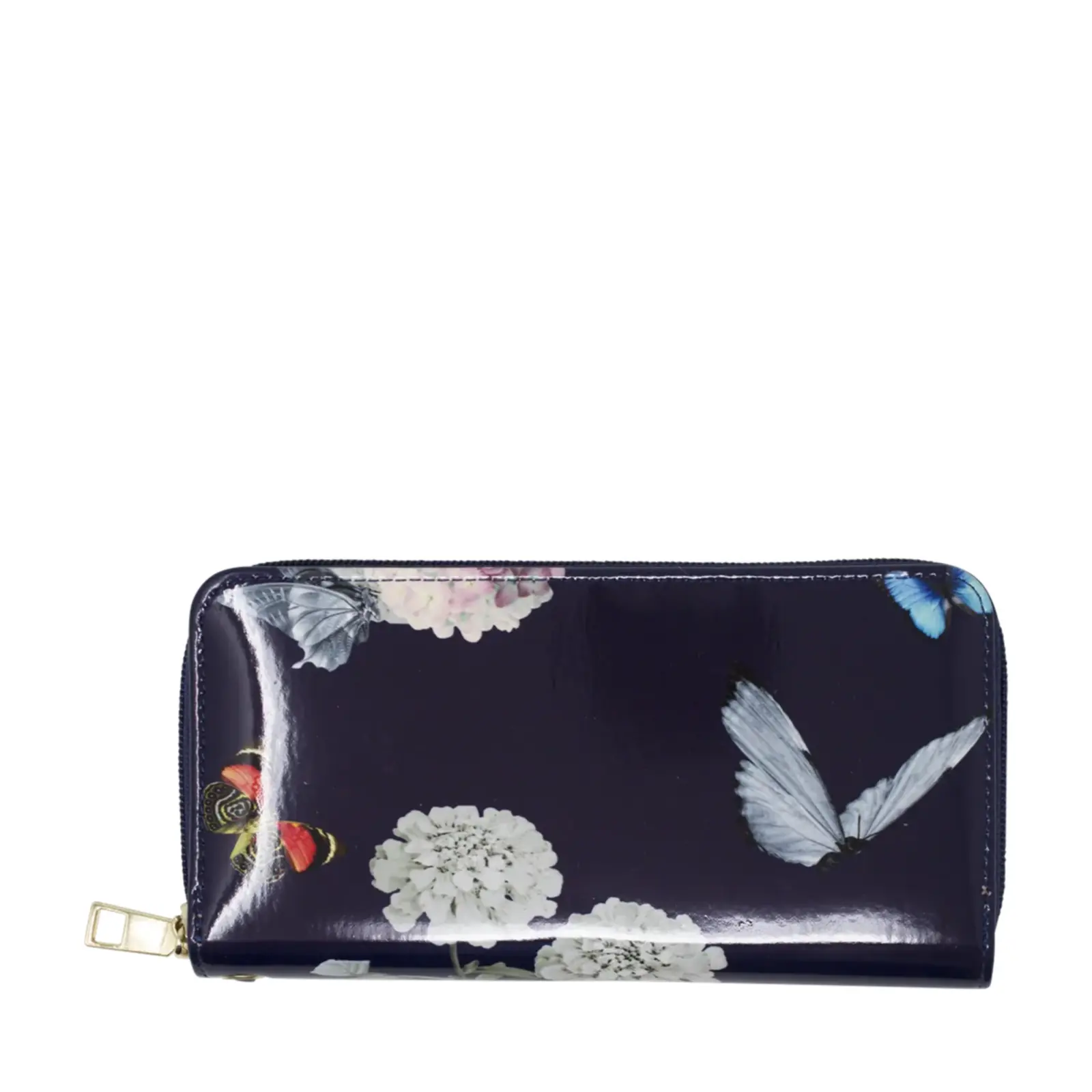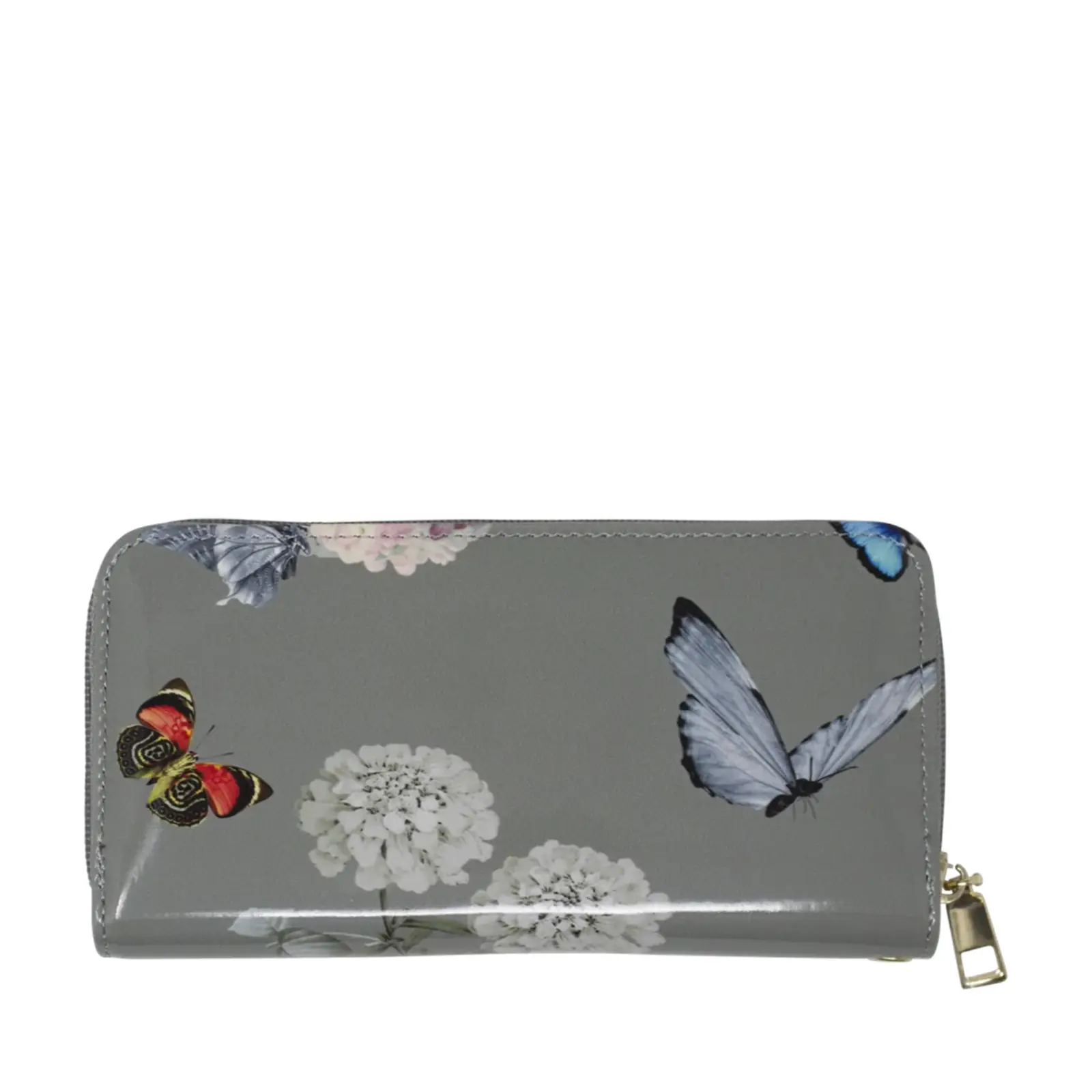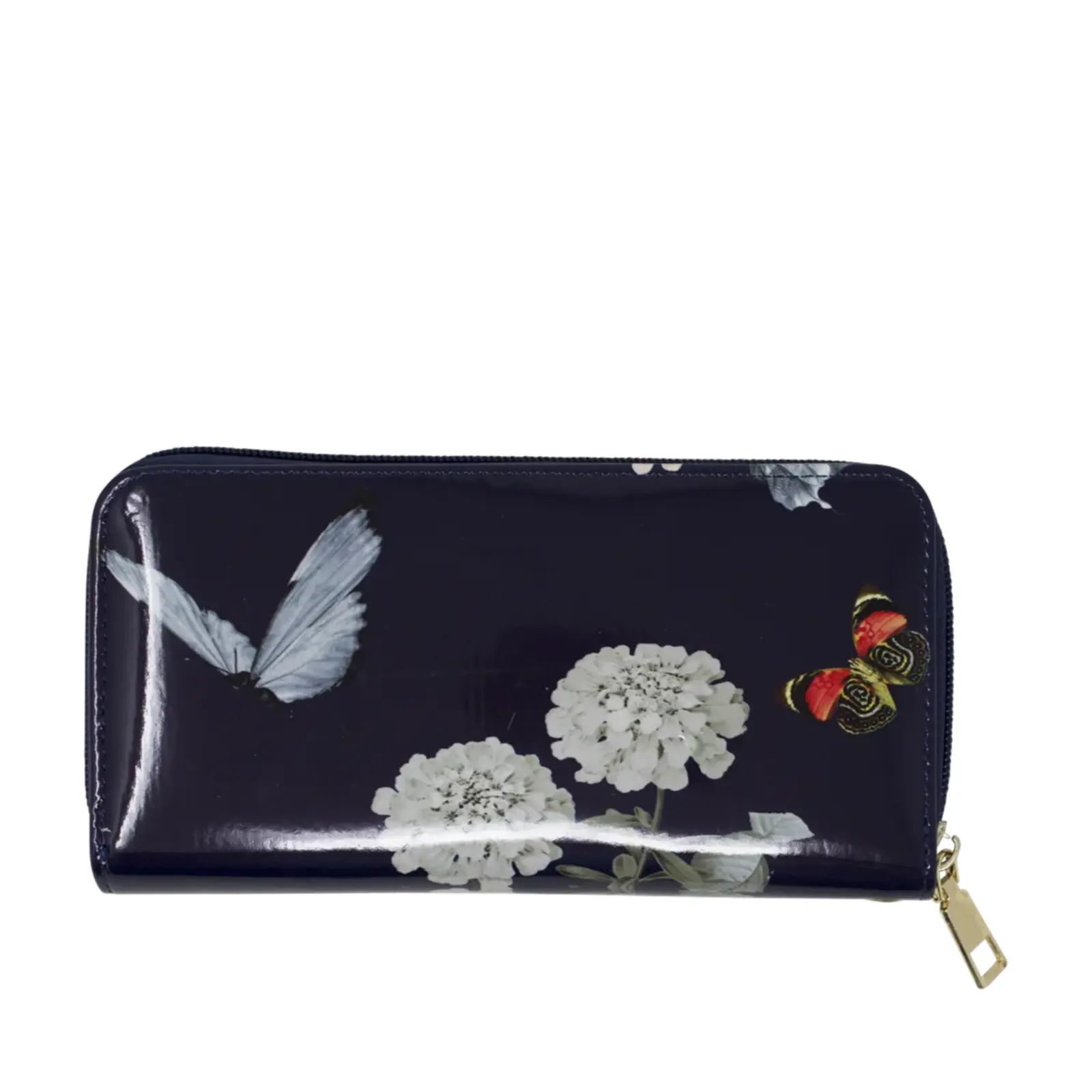 This purse presents a vibrant floral design featuring butterflies with a glossy finish. It also comes with a small attachable strap. Matching tote bag available. L x H x D = 19cm x 10cm x 2.5cm.