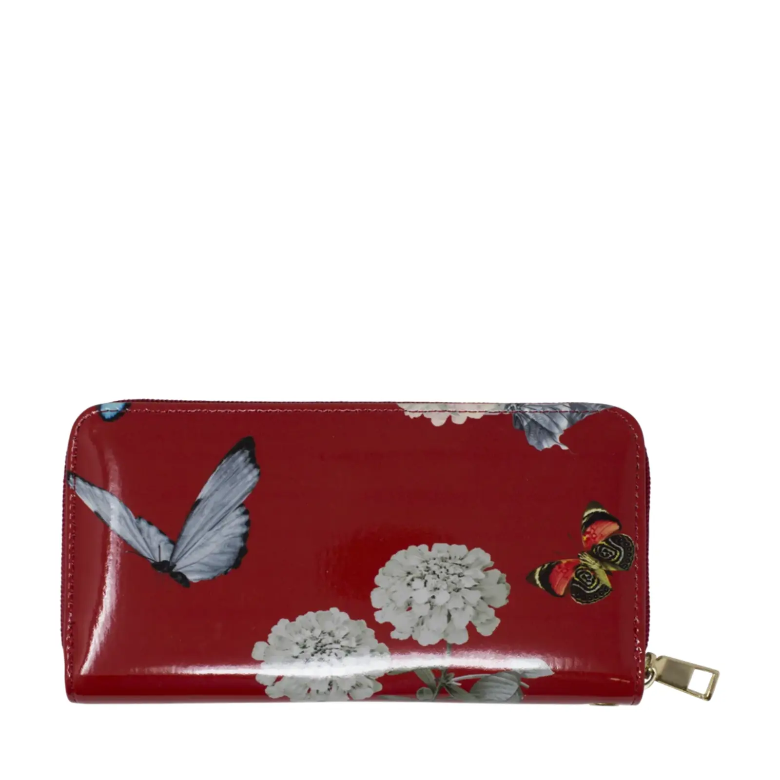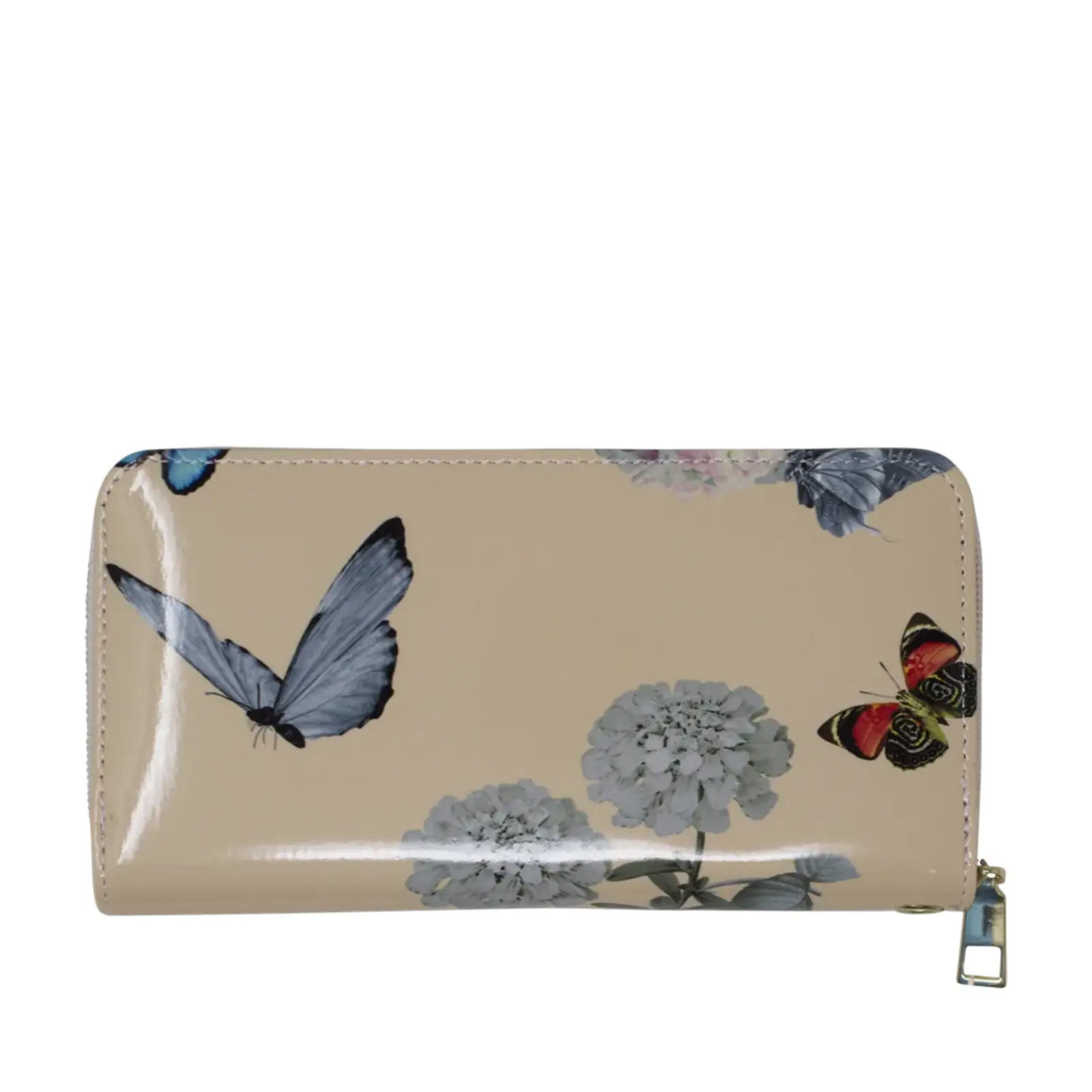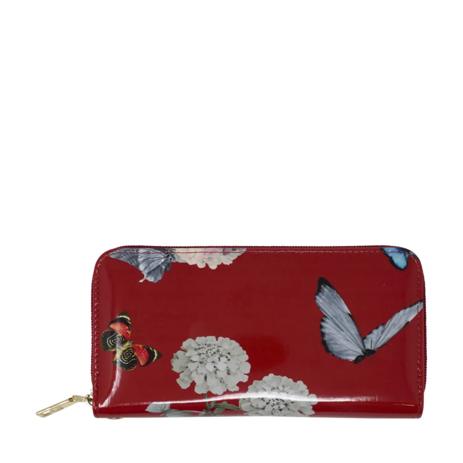 This purse presents a vibrant floral design featuring butterflies with a glossy finish. It also comes with a small attachable strap. Matching tote bag available. L x H x D = 19cm x 10cm x 2.5cm.