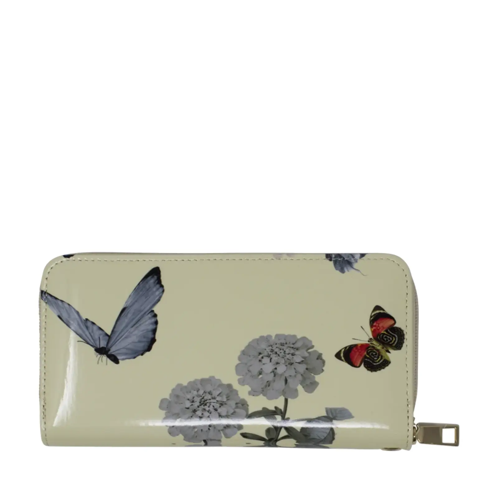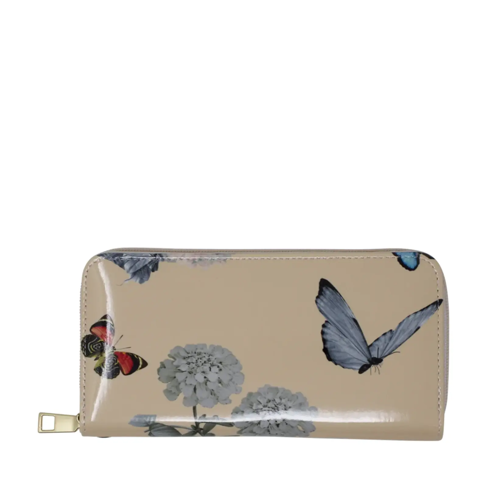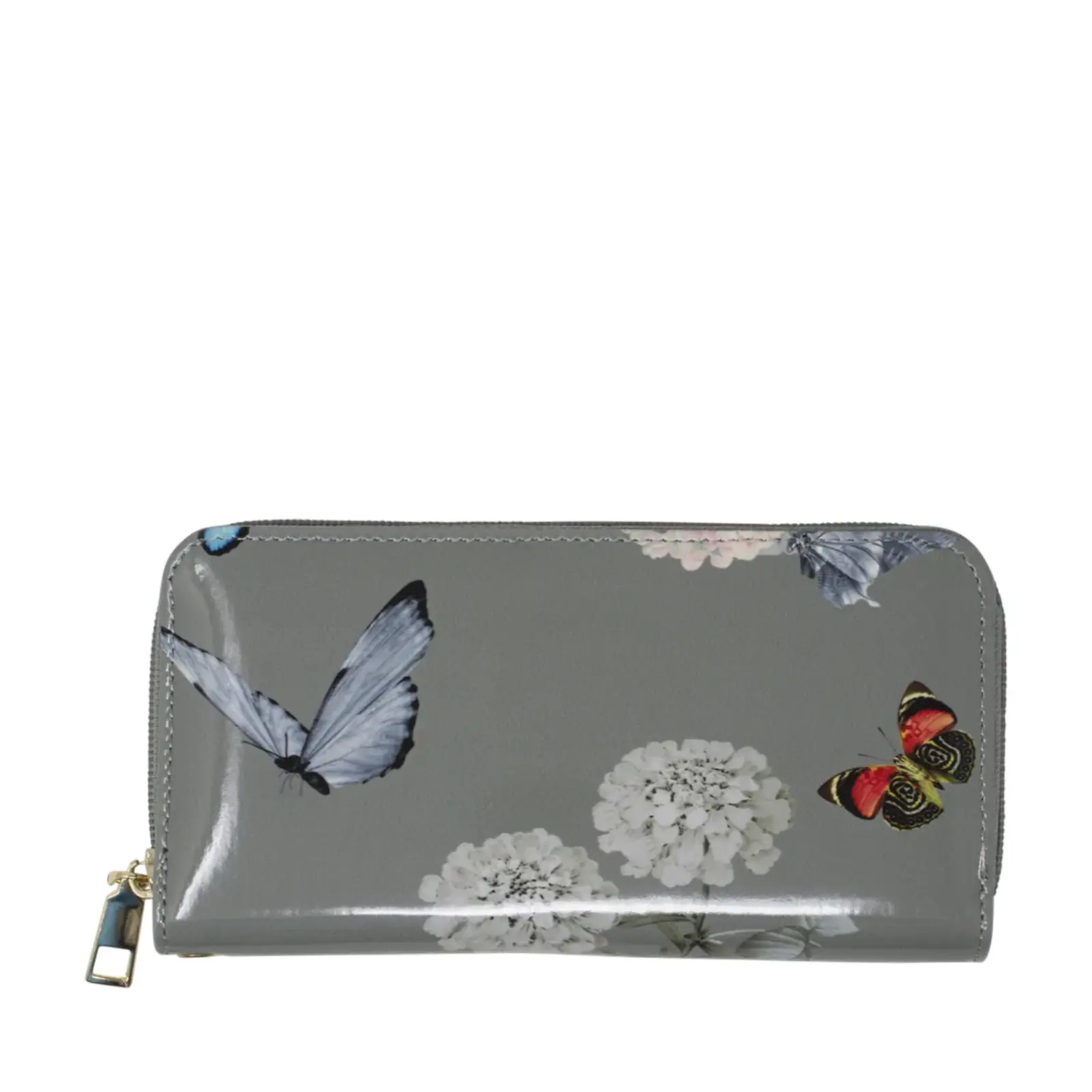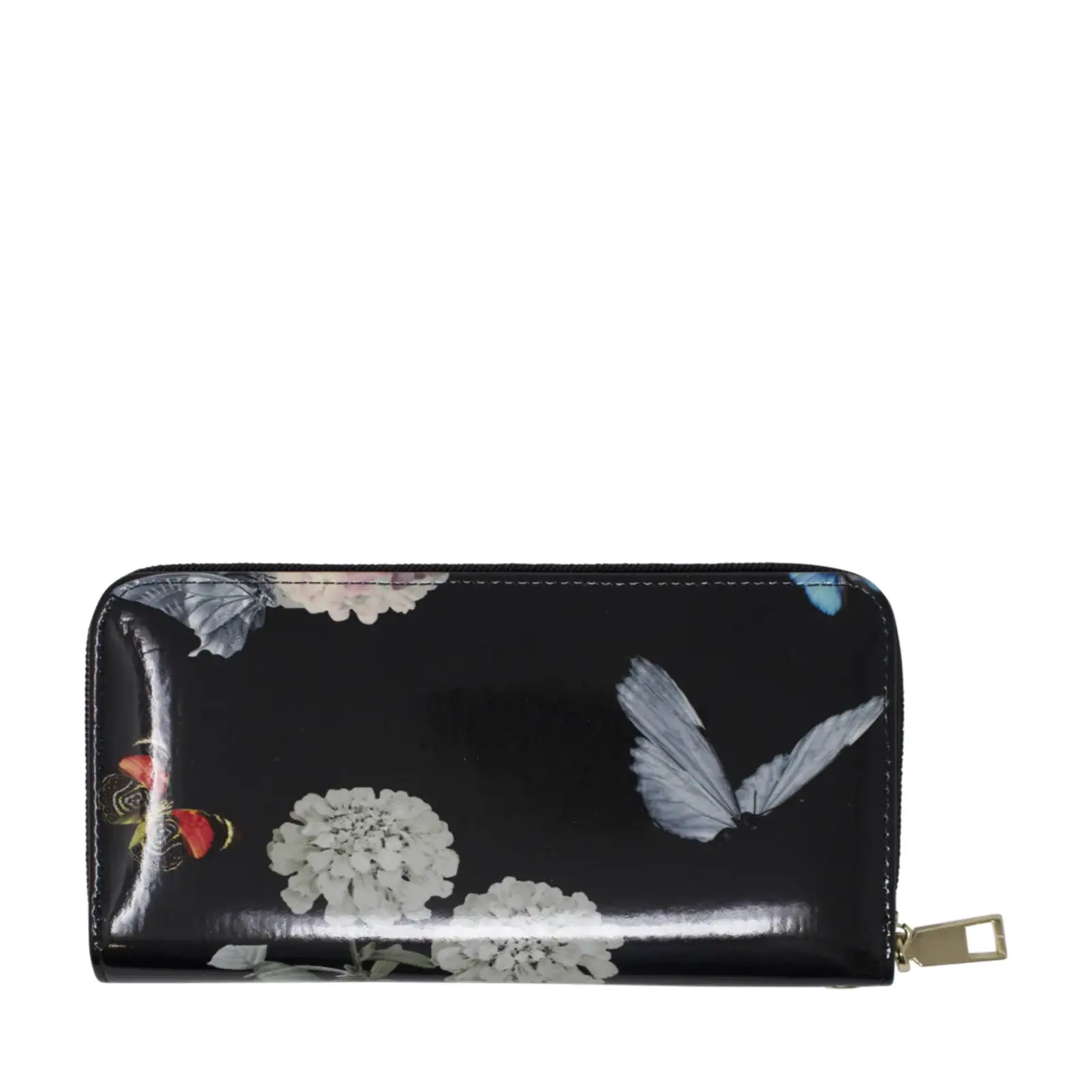 This purse presents a vibrant floral design featuring butterflies with a glossy finish. It also comes with a small attachable strap. Matching tote bag available. L x H x D = 19cm x 10cm x 2.5cm.