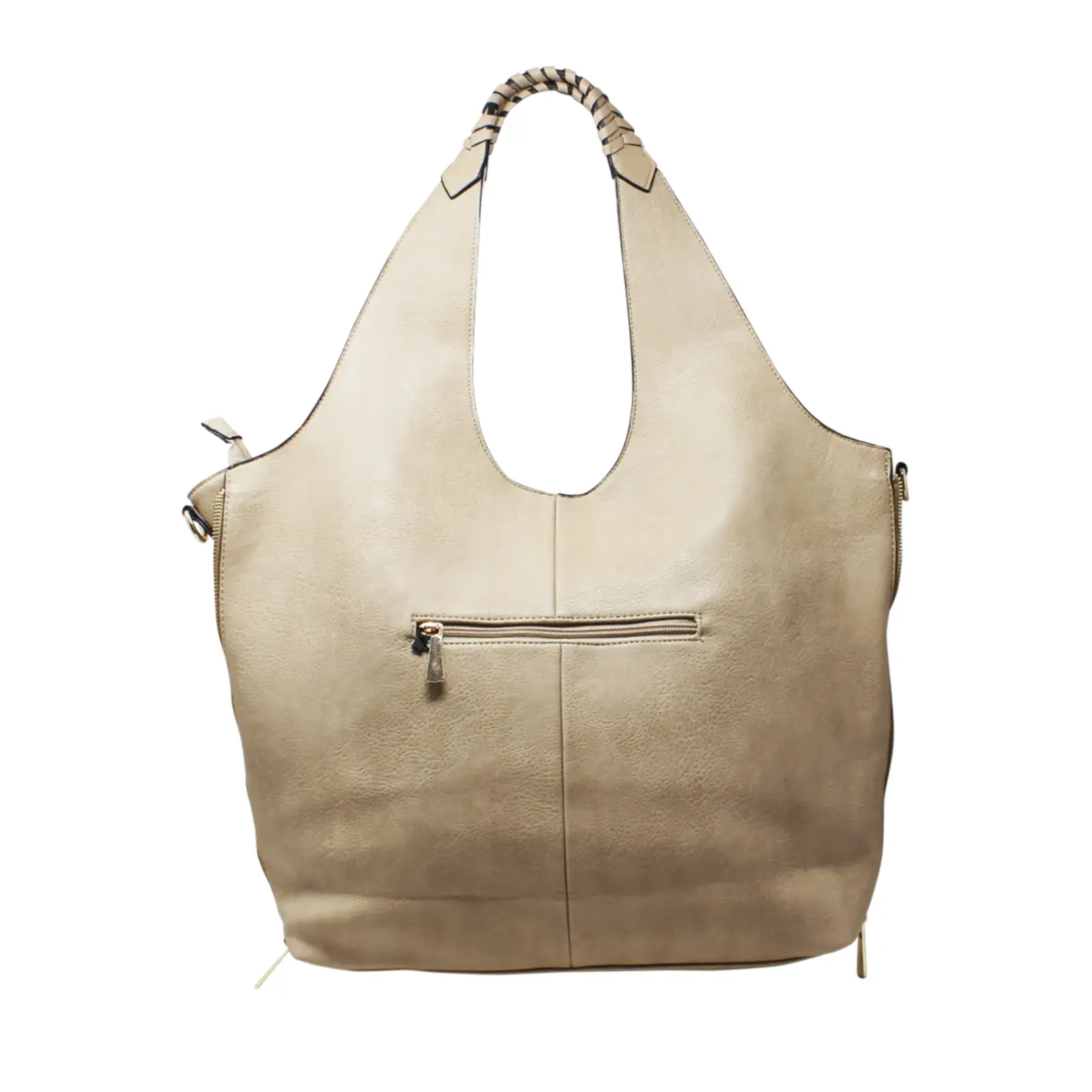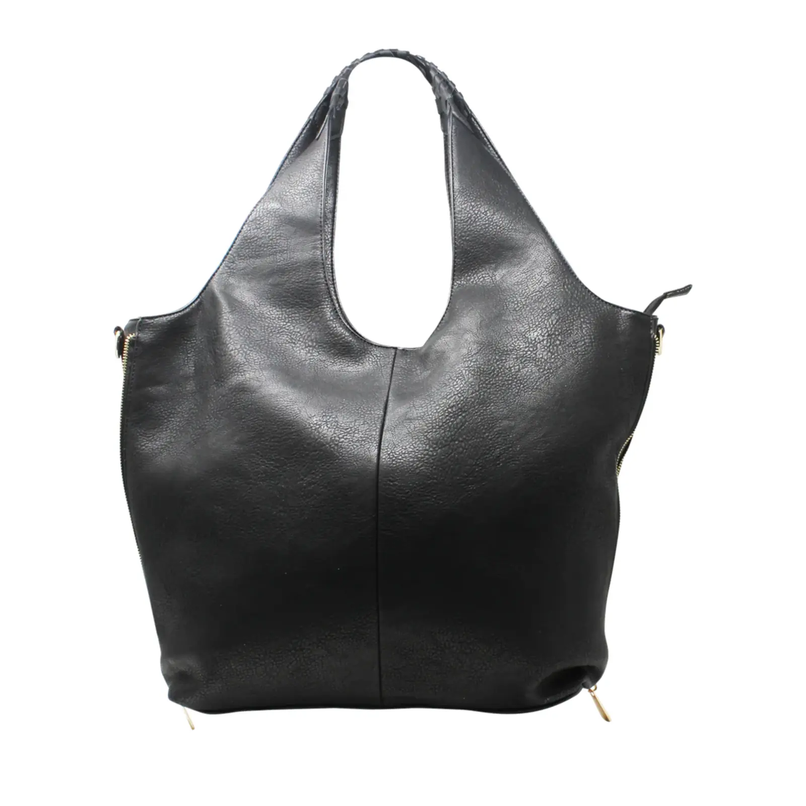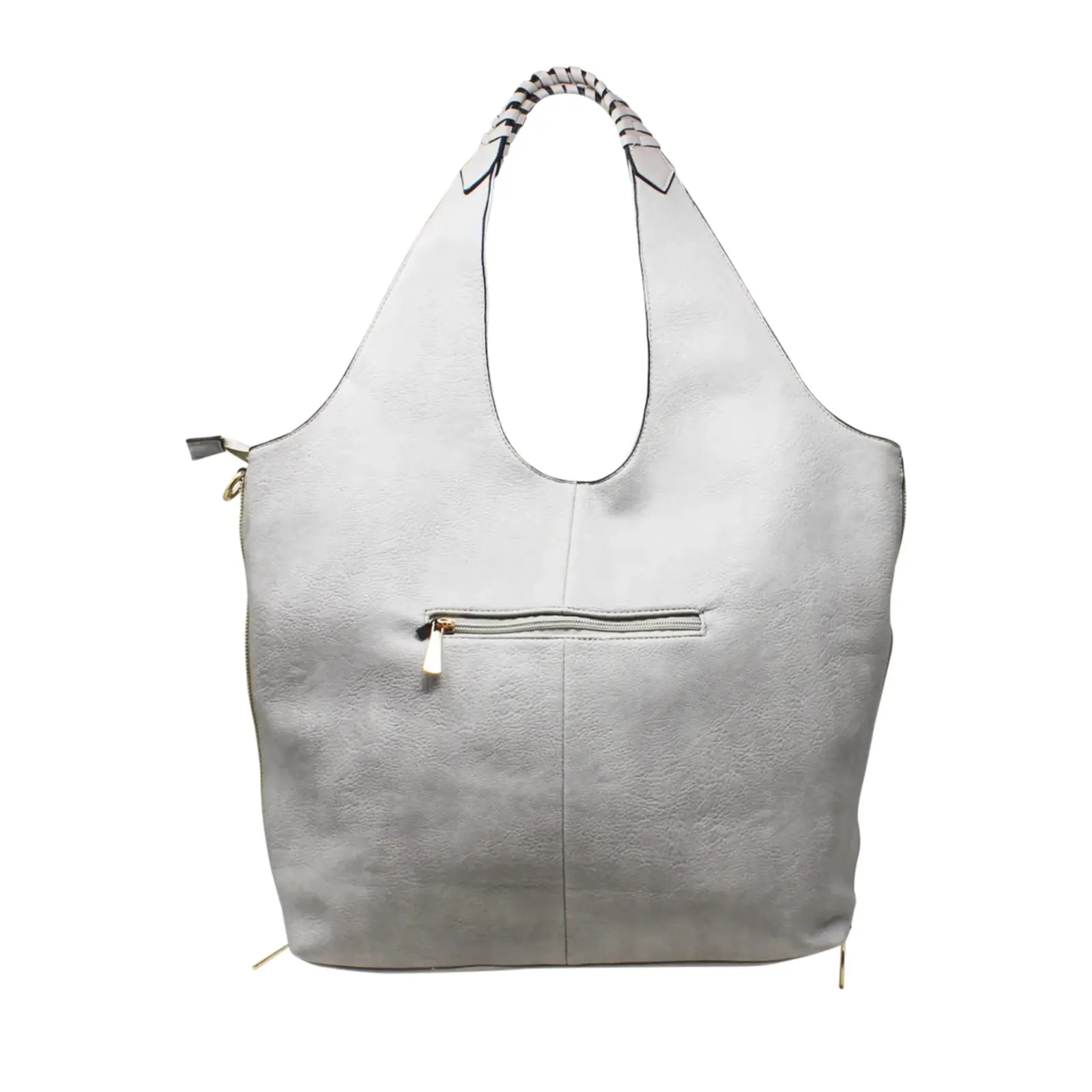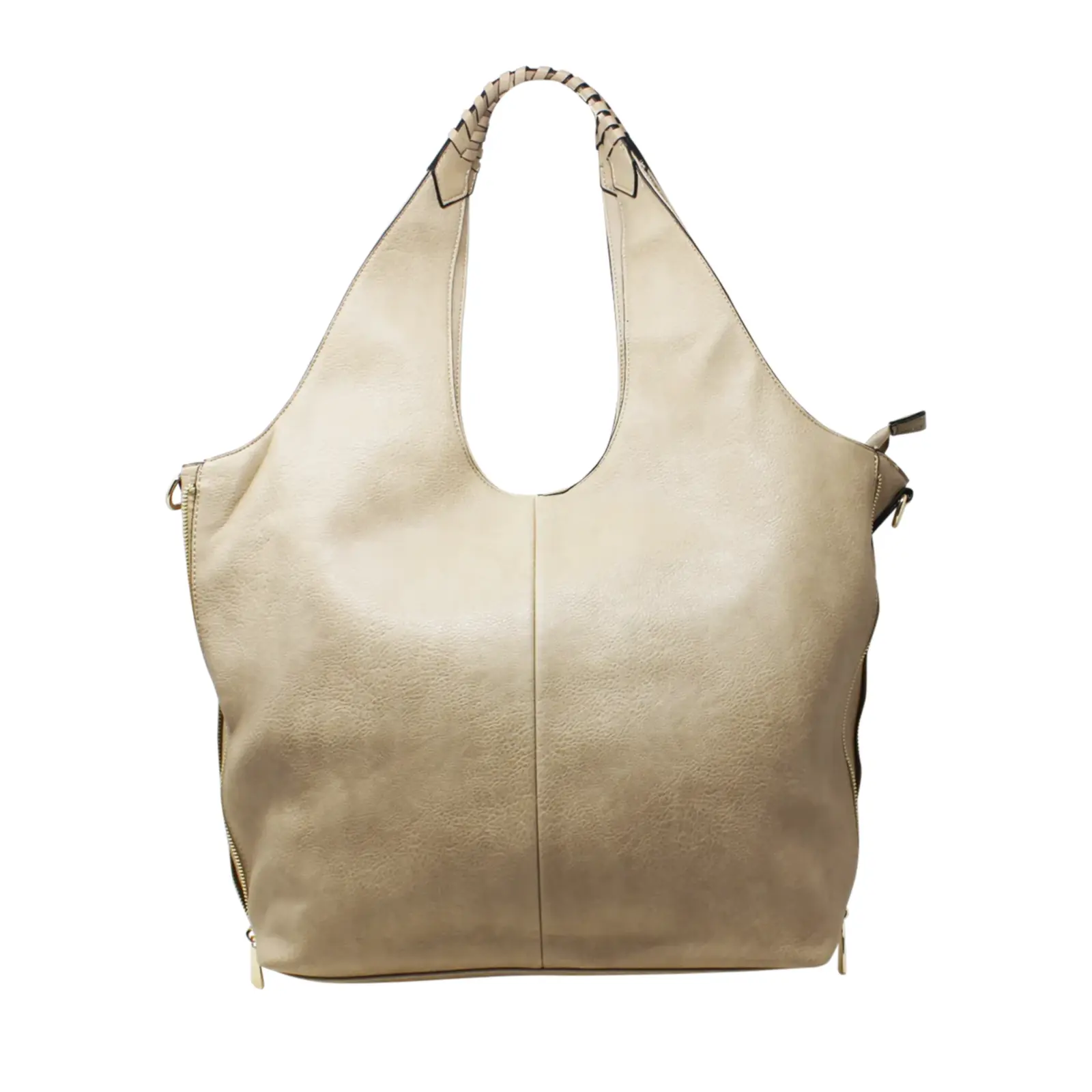 This large hobo bag features braided design on the handle with 2 side zippers where user can close the zips to make the bag thinner. It contains 2 separated compartments inside and comes with a detachable shoulder strap.