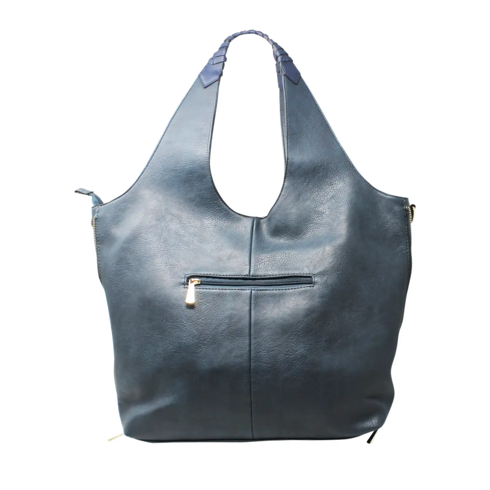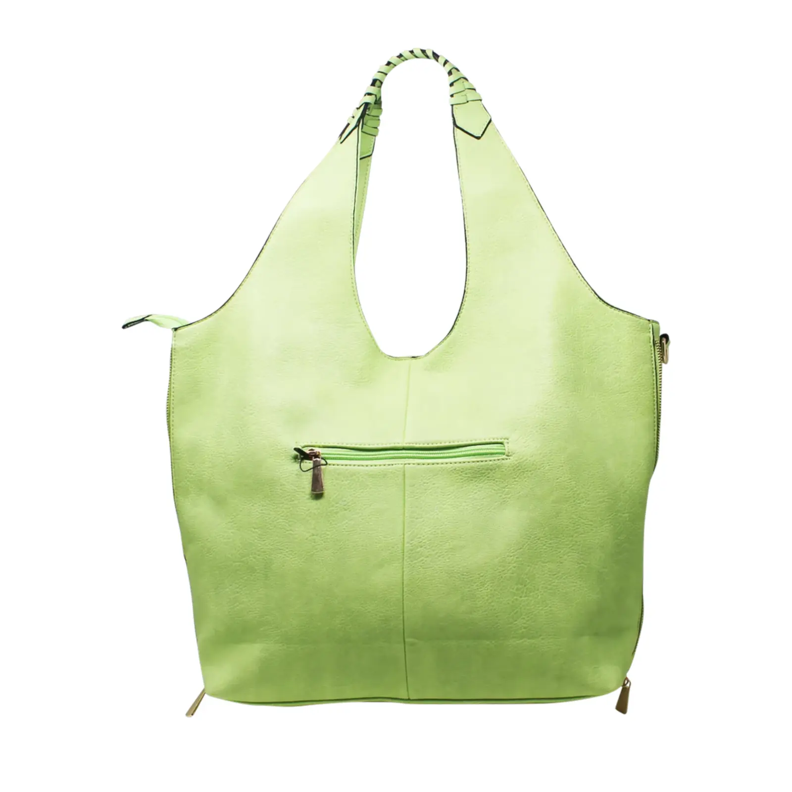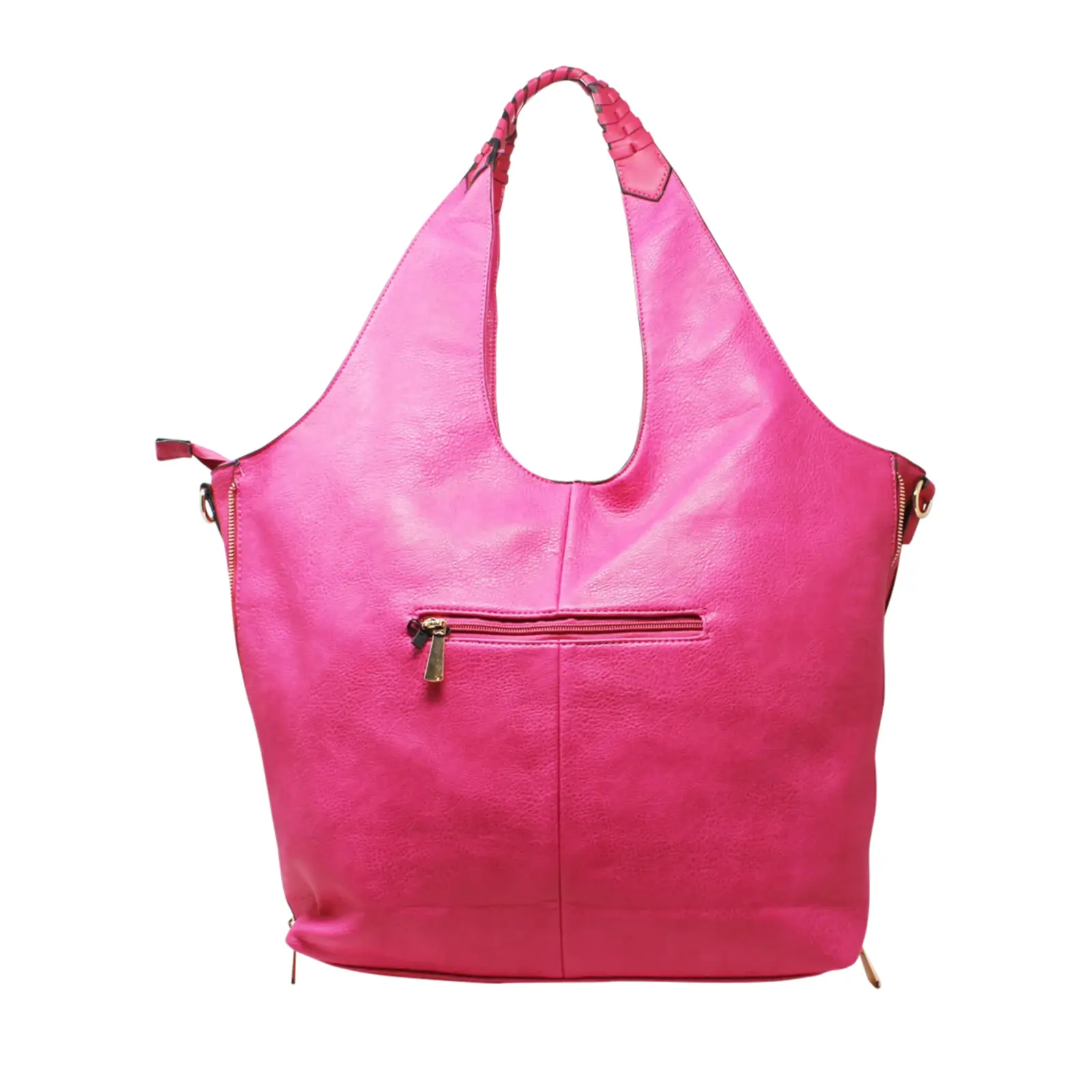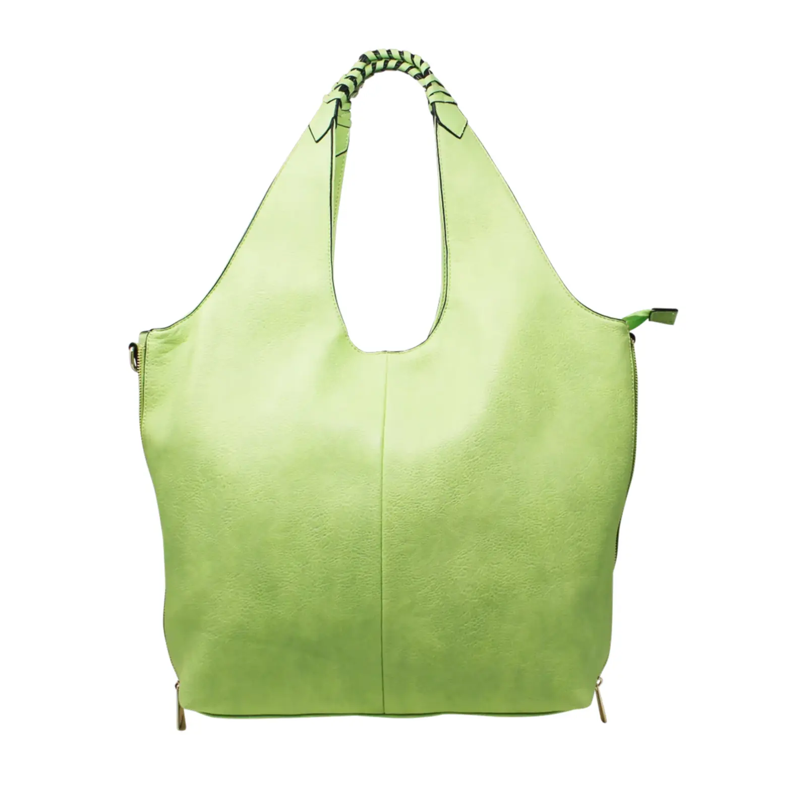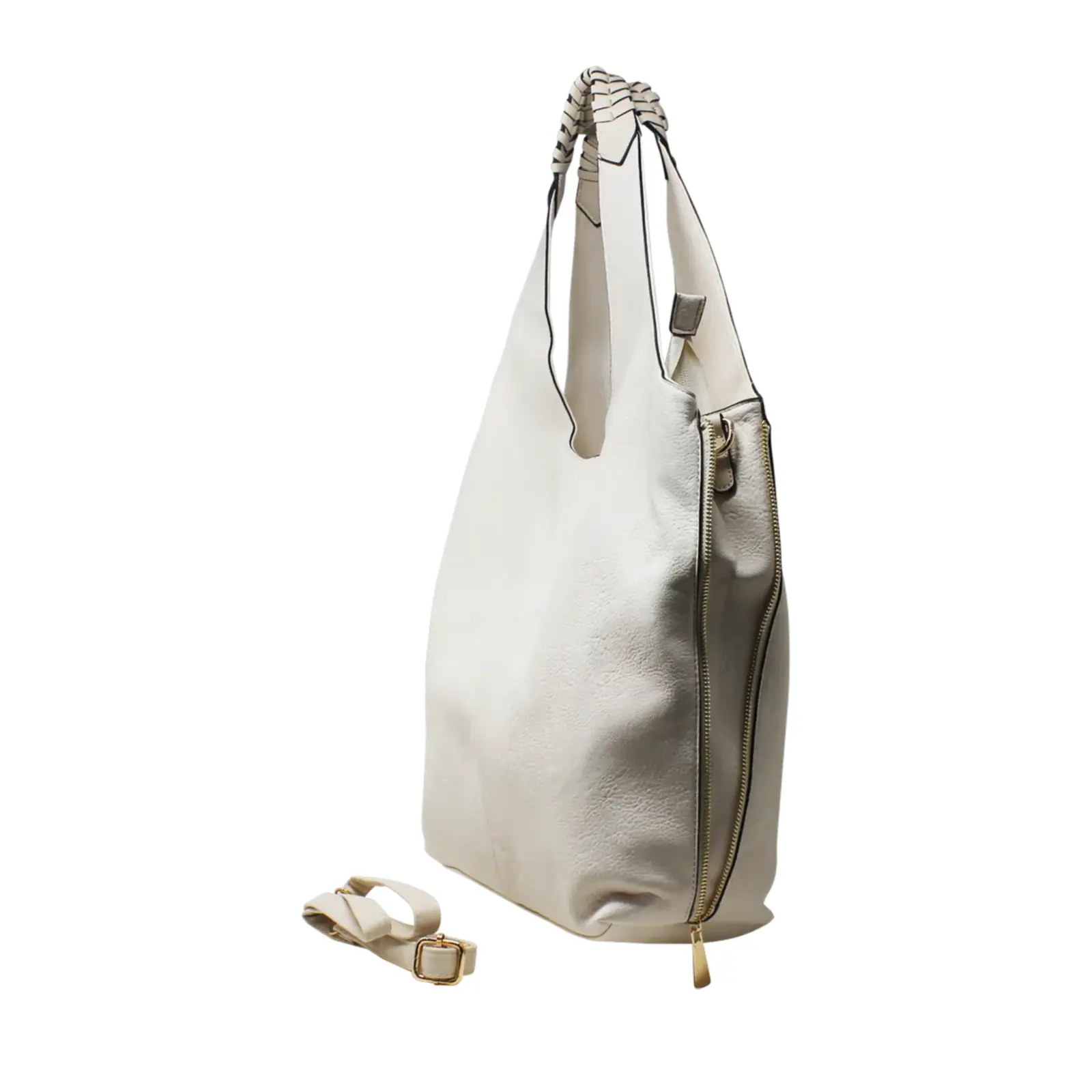 This large hobo bag features braided design on the handle with 2 side zippers where user can close the zips to make the bag thinner. It contains 2 separated compartments inside and comes with a detachable shoulder strap.