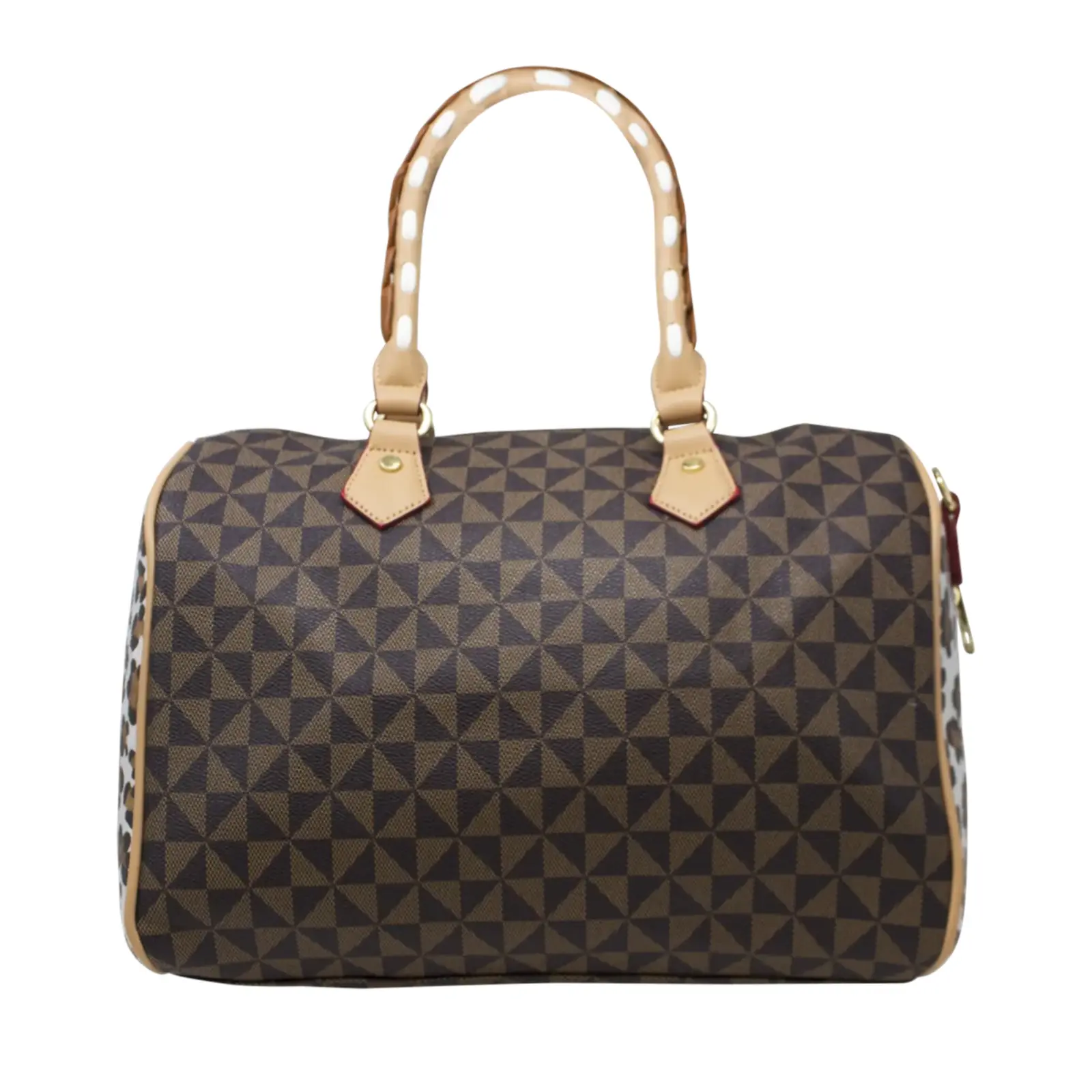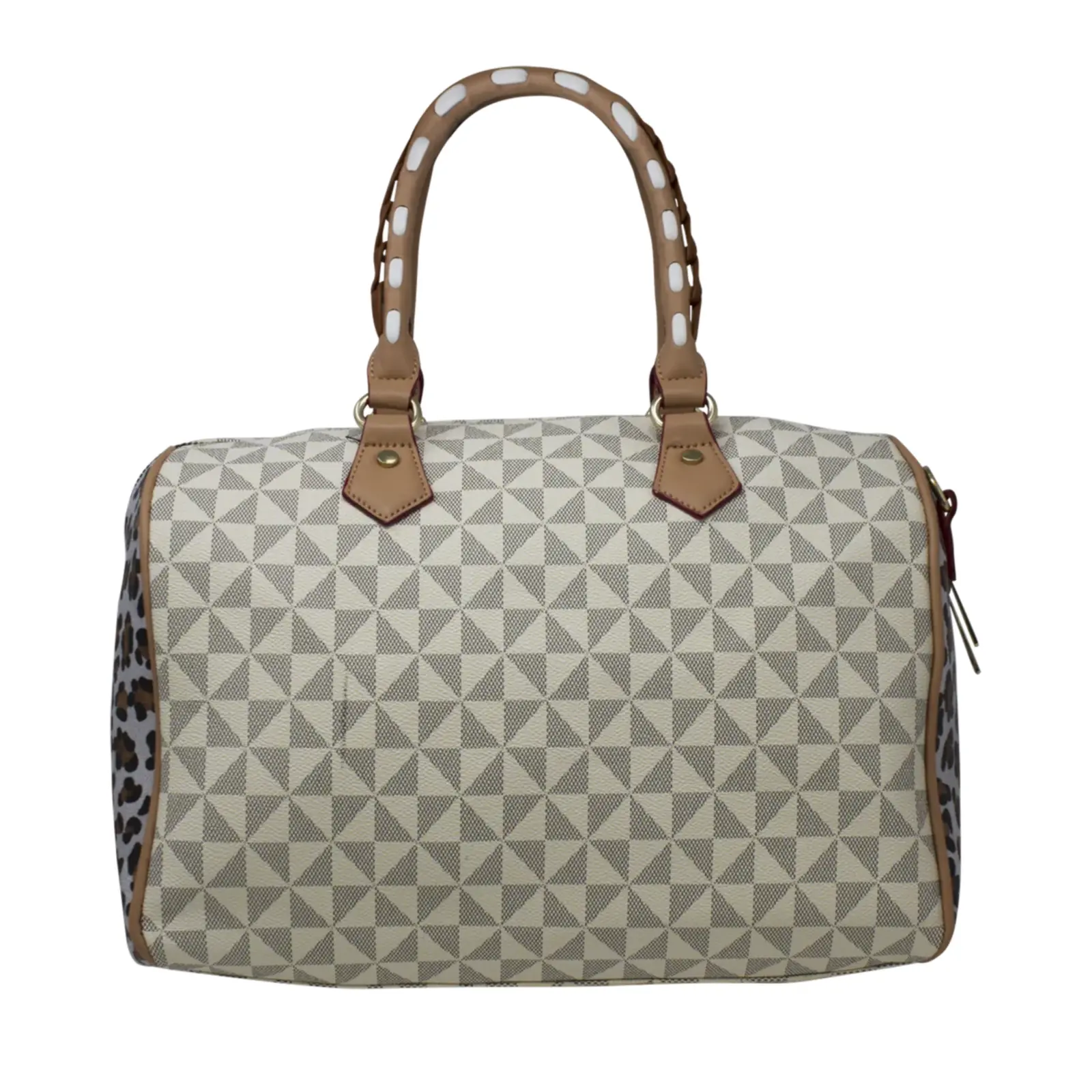 Lovely and large patterned handbag featuring a geometric pattern and a leopard print on it’s sides. Would be perfect used as a travel or gym bag as it comes with a detachable strap to suit your comfort.