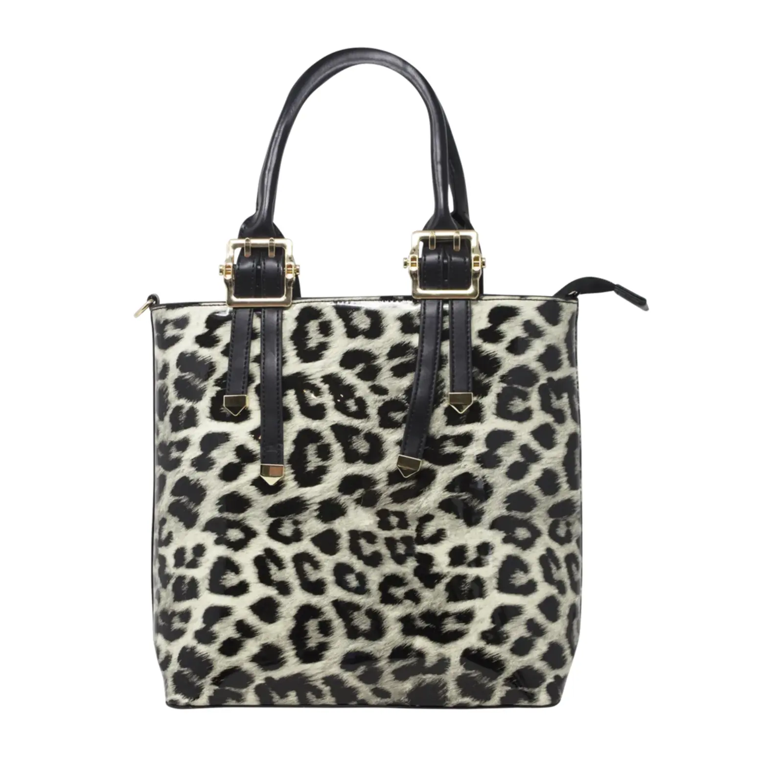 Simple and spacious, this Leopard print Tote easily carries all your everyday essentials. This roomy tote bag has over shoulder straps in contrast Black and its minimalist design means it slots effortlessly into your wardrobe. Zipped closure at the top.