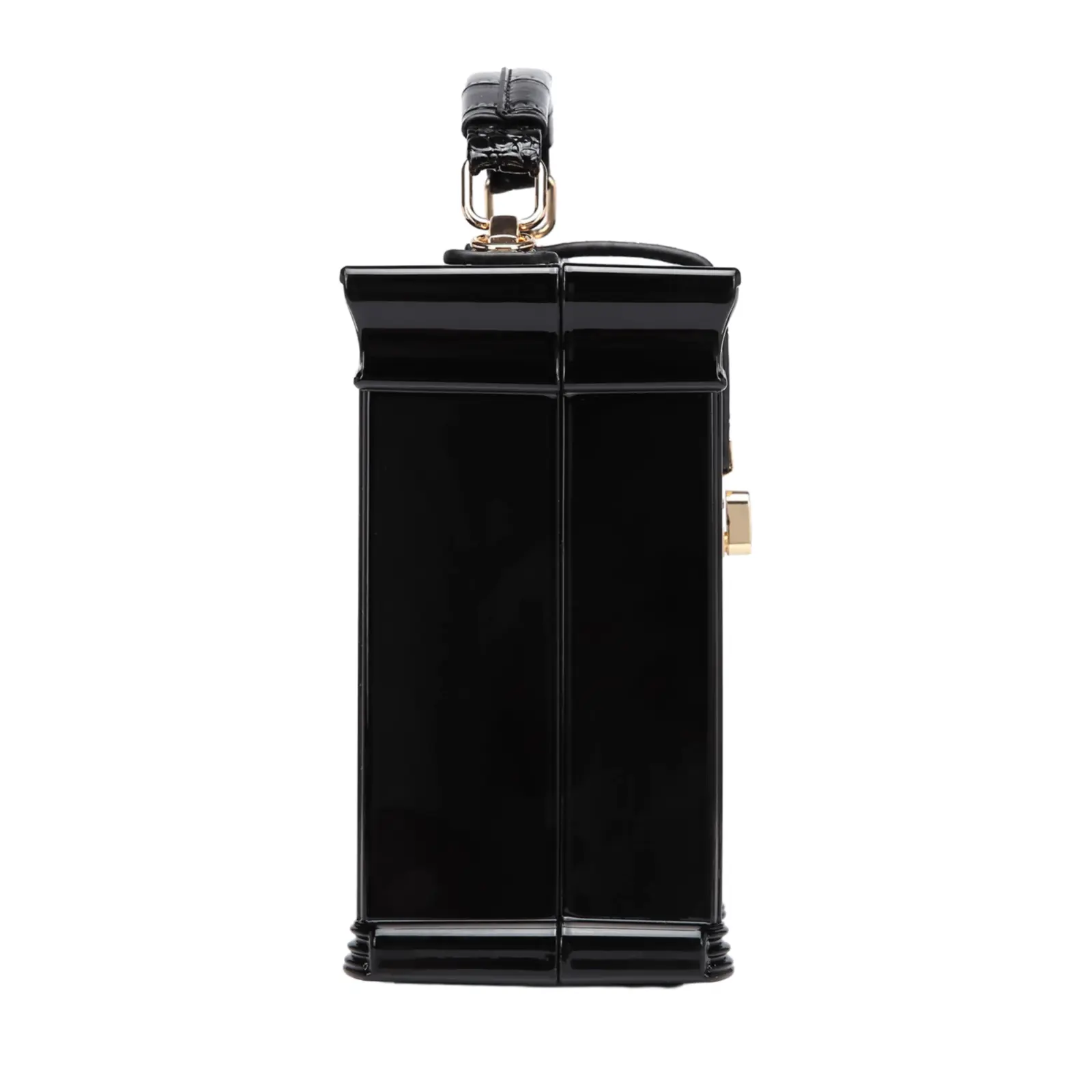 This is a hardshell grab bag comes with a crossbody strap. It’s front side looks like a shop window with arched glass. In has a little buckle and opens like a case.