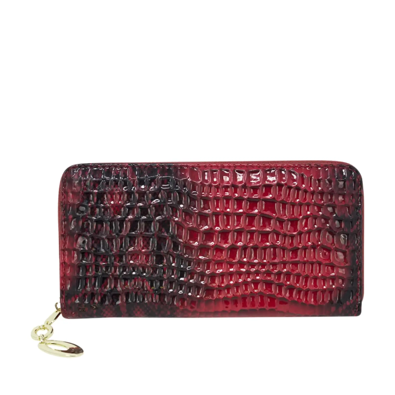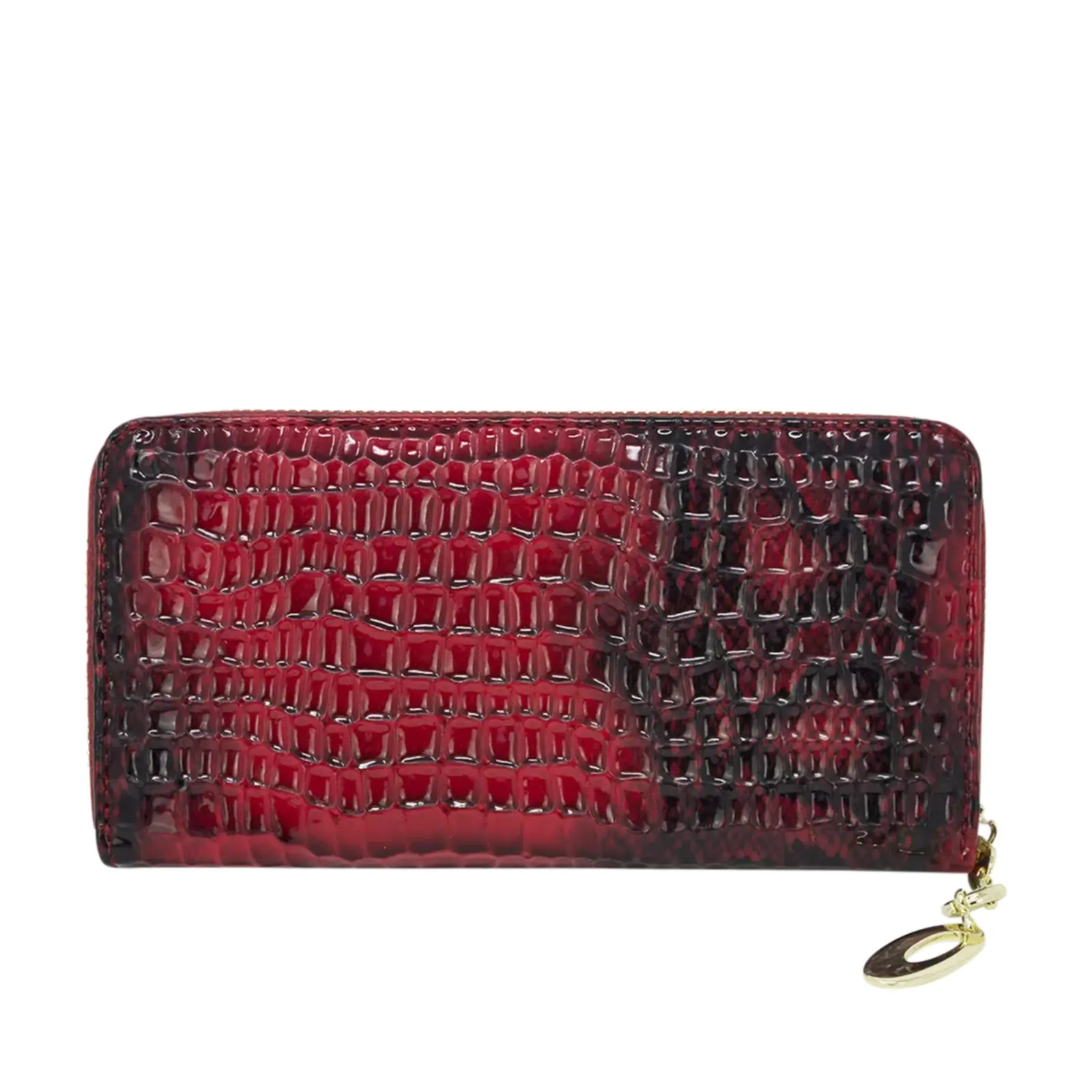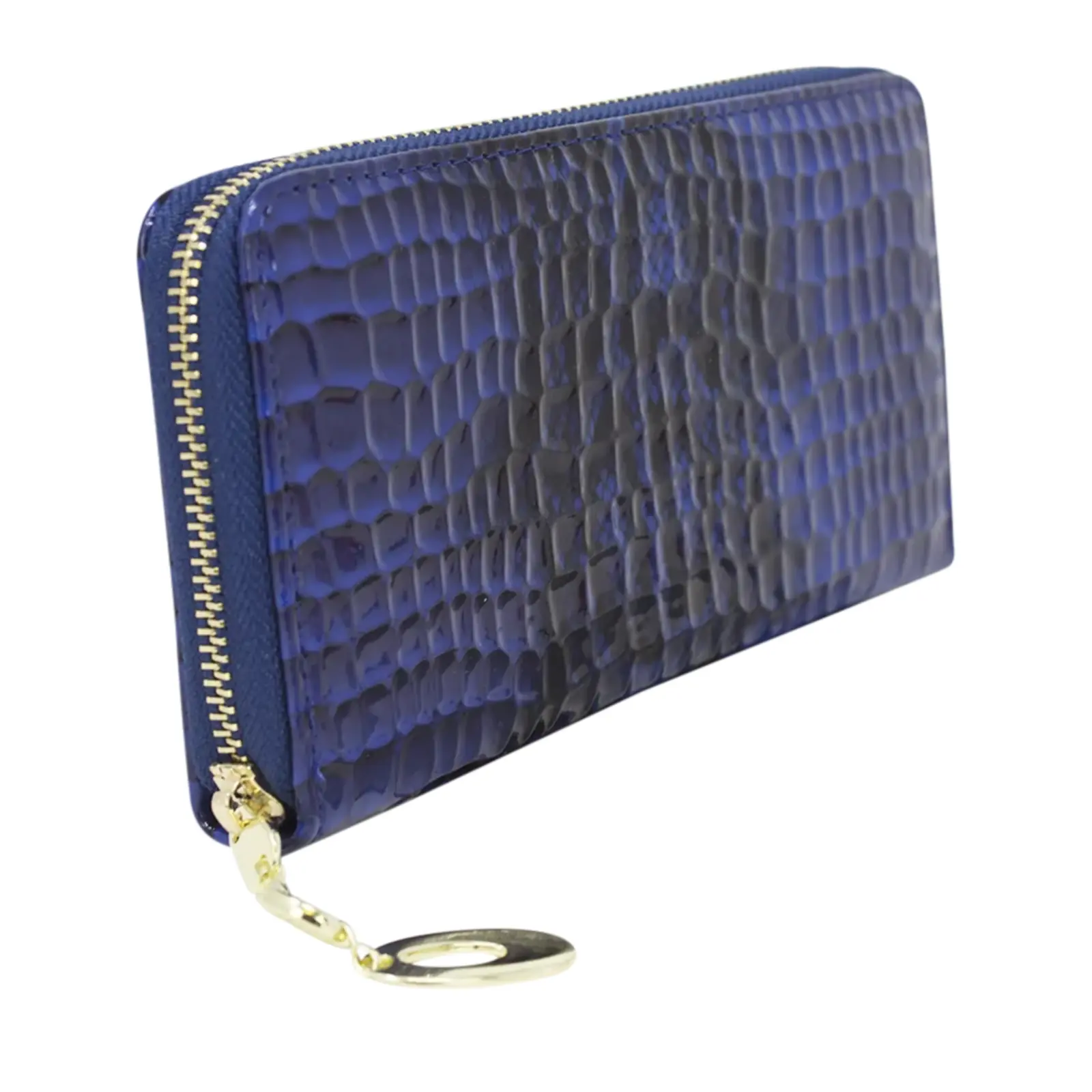 This long zipped purse features a crocodile skin like pattern. It has zipped pocket and several card slots and spaces for notes too.