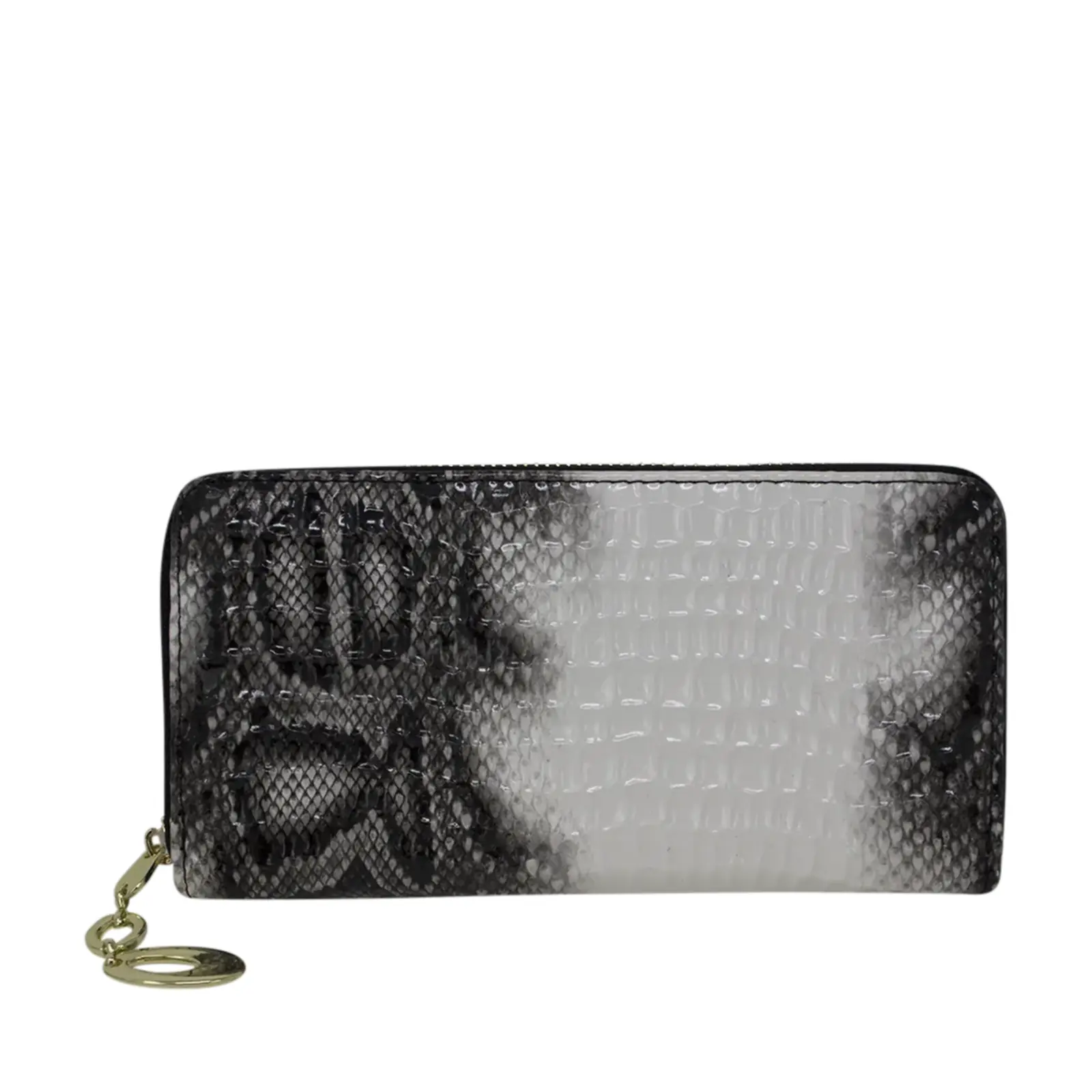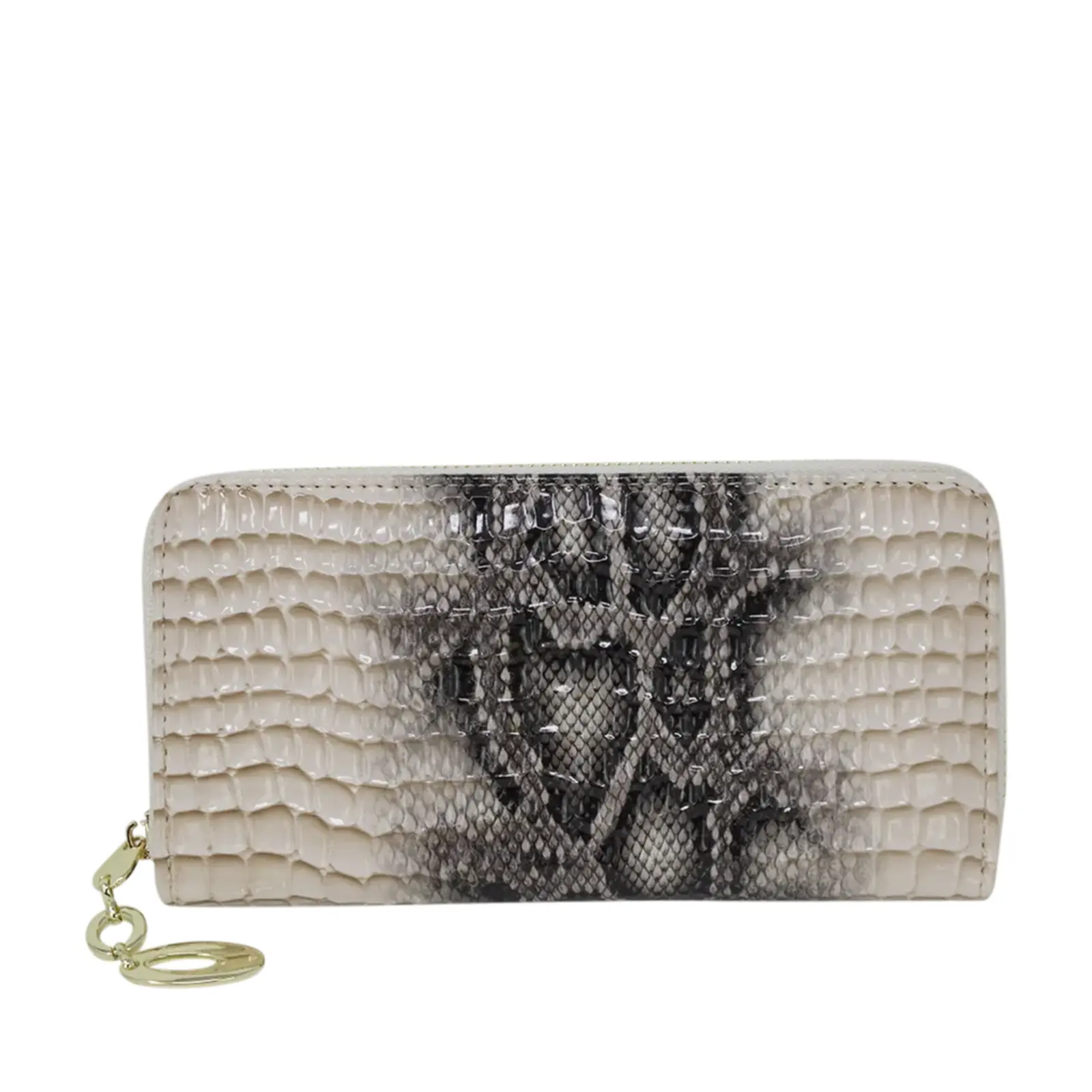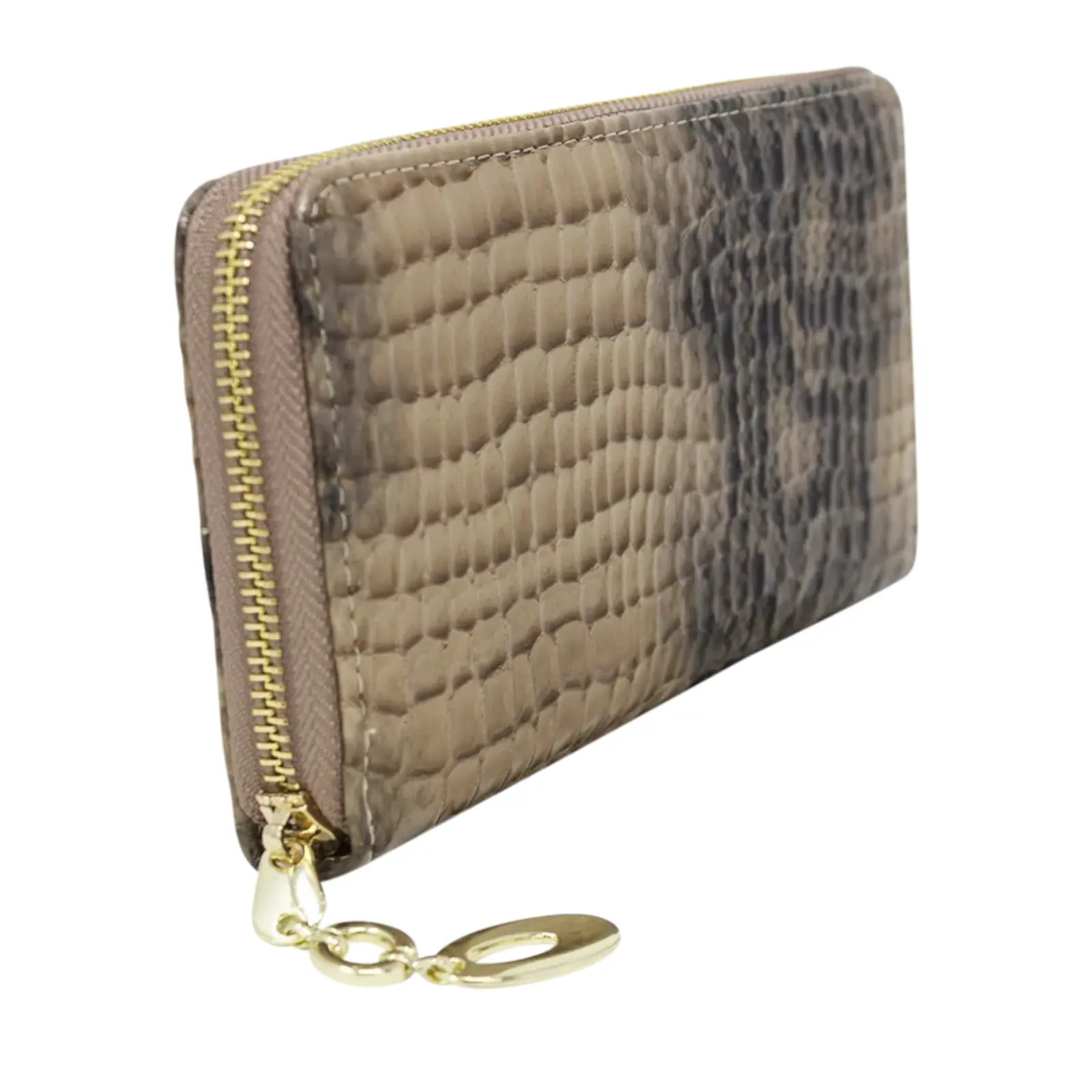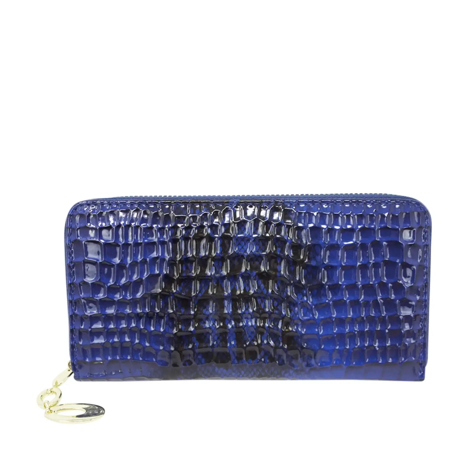 This long zipped purse features a crocodile skin like pattern. It has zipped pocket and several card slots and spaces for notes too.