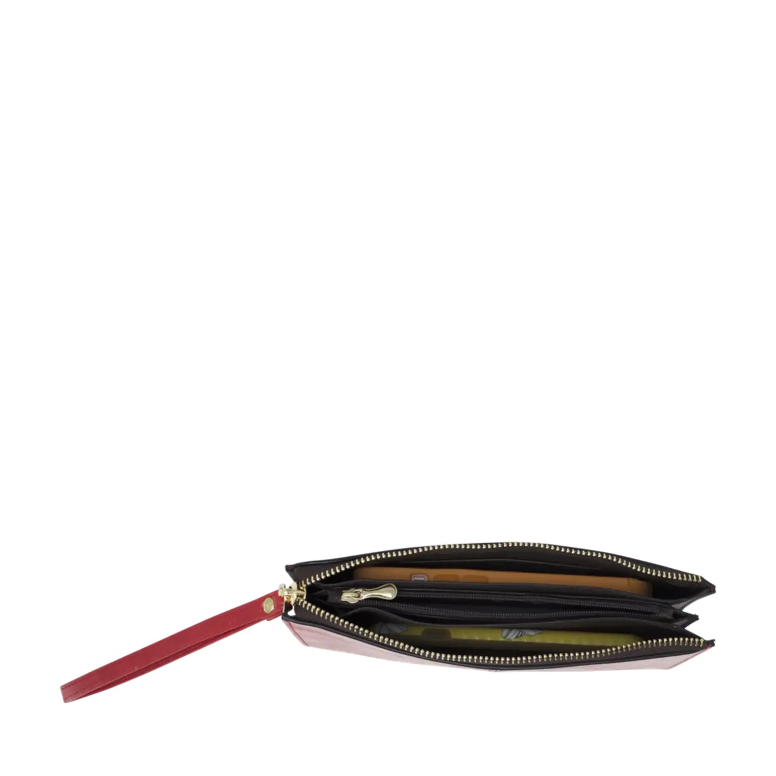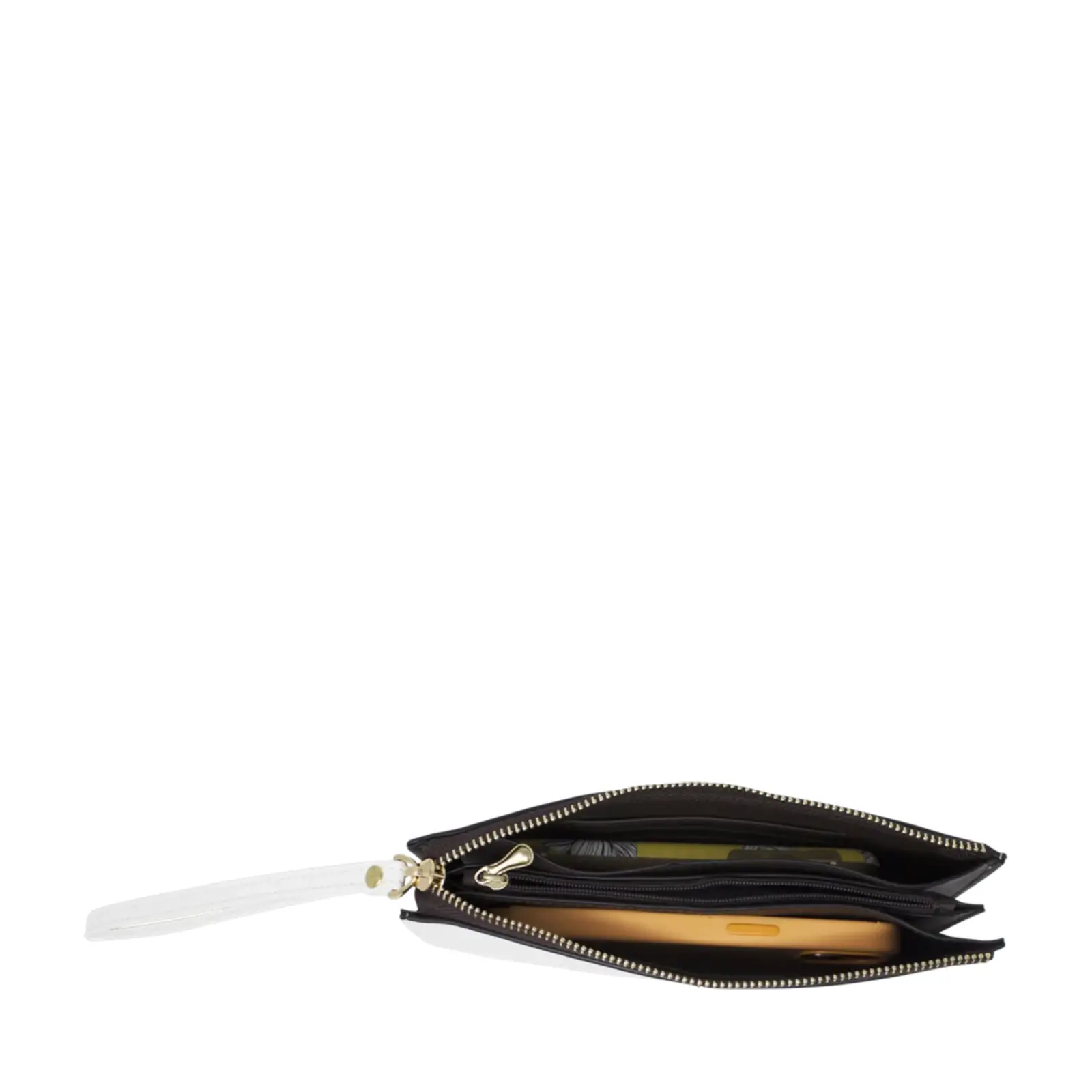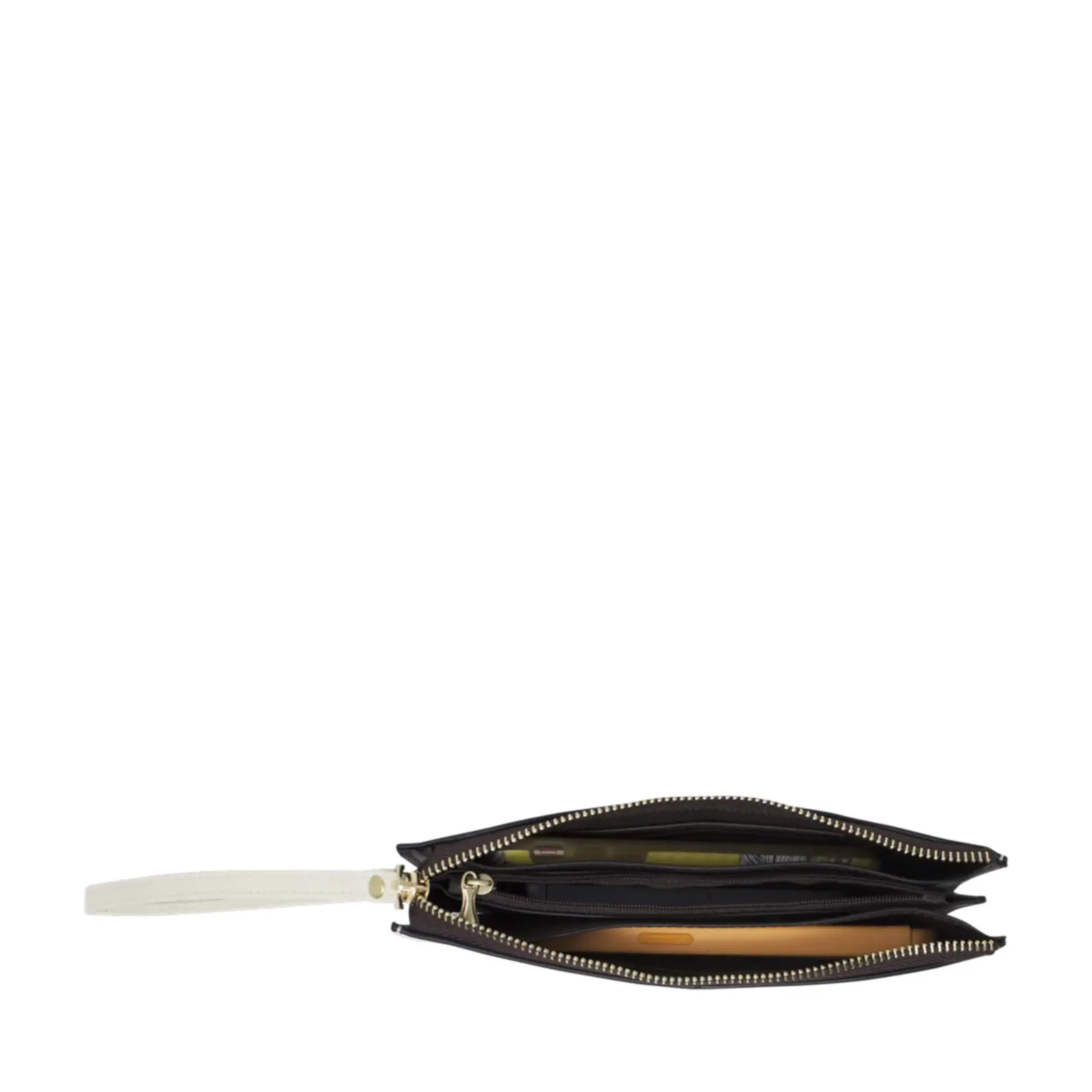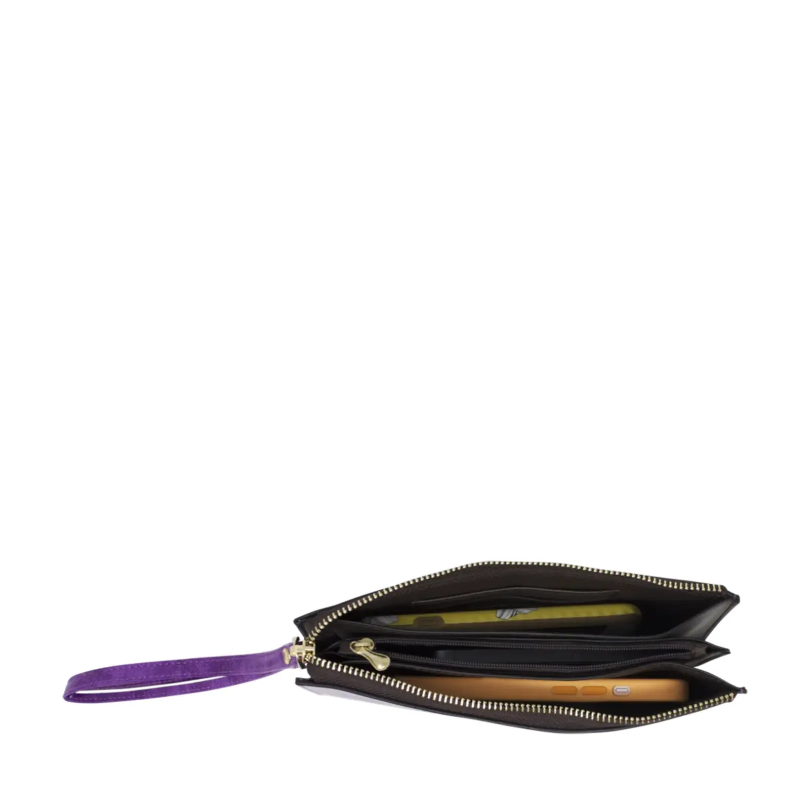 This zipped purse/pouch contains 3 separated compartments inside, including a zipped pocket, and several card slots.