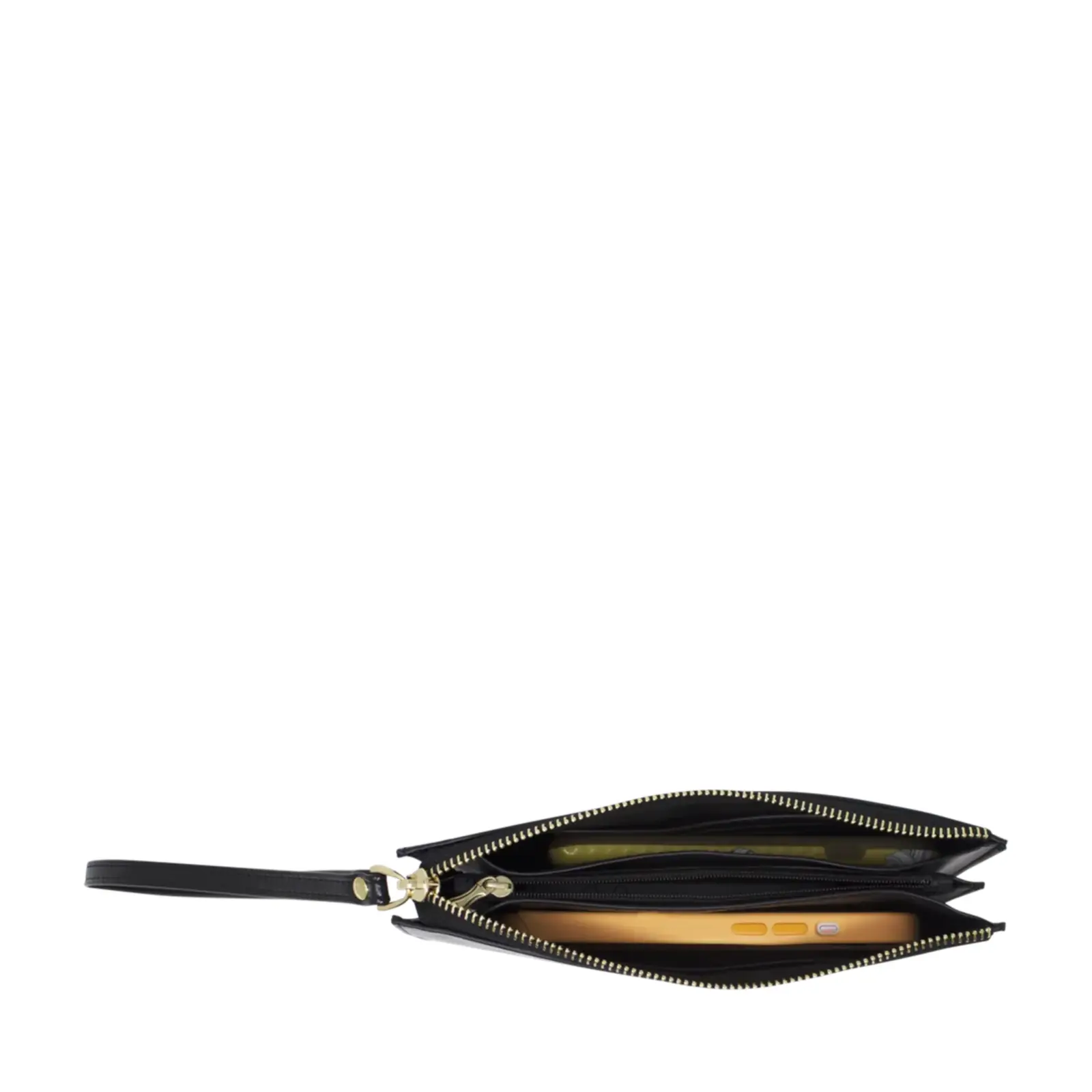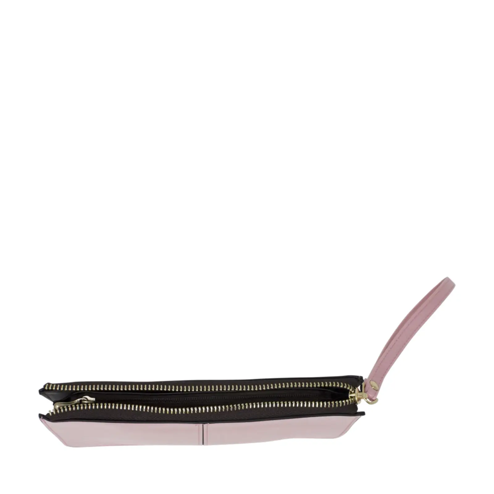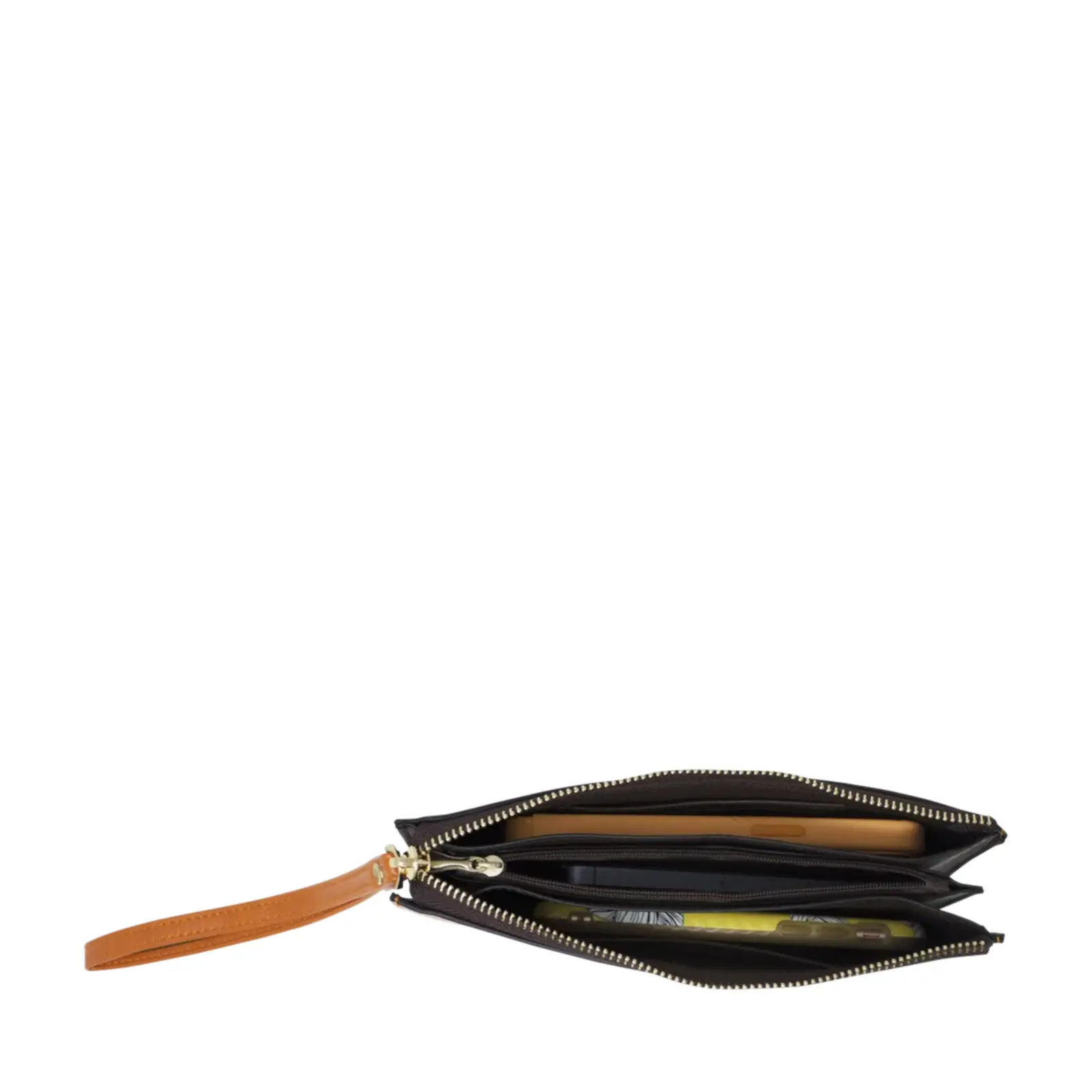 This zipped purse/pouch contains 3 separated compartments inside, including a zipped pocket, and several card slots.
