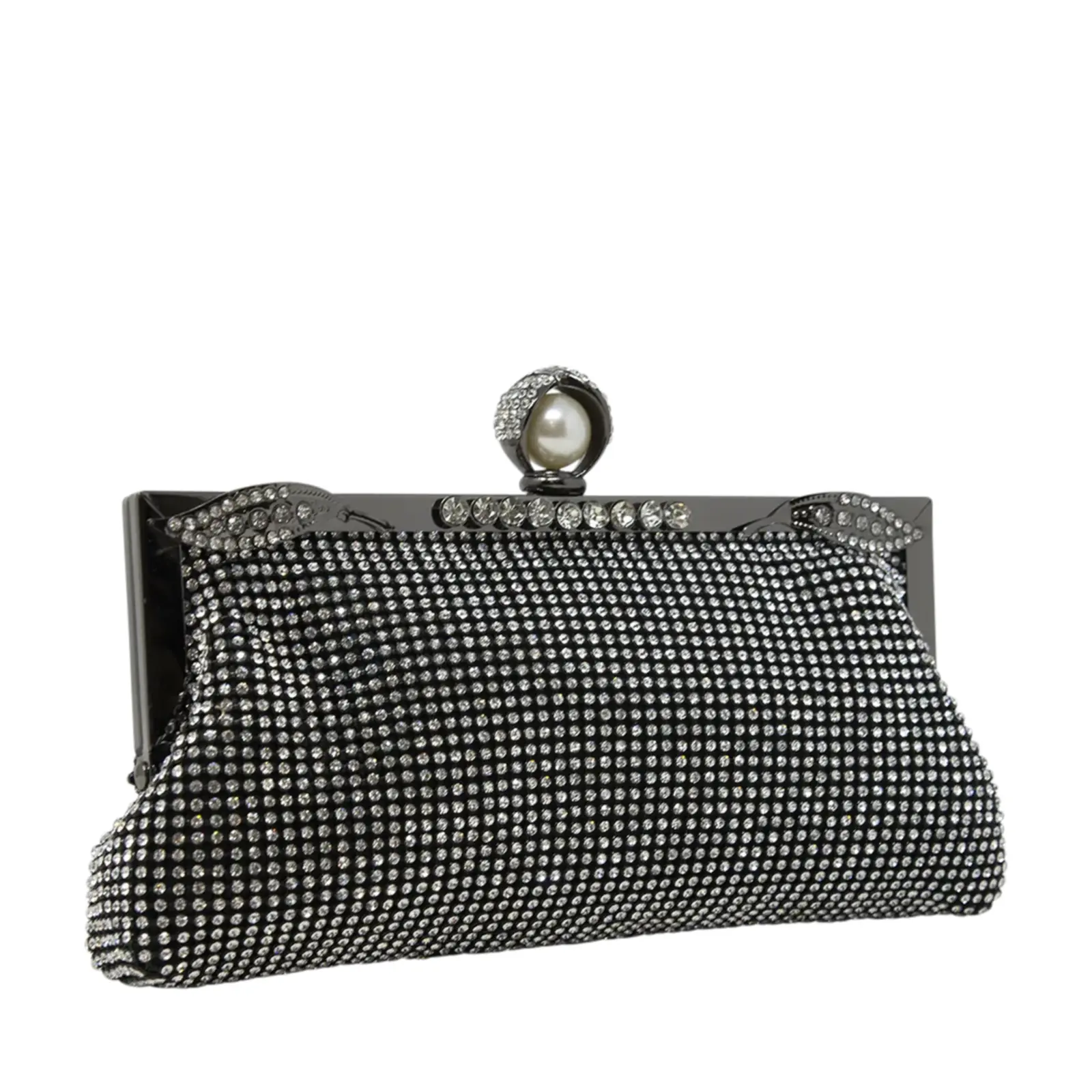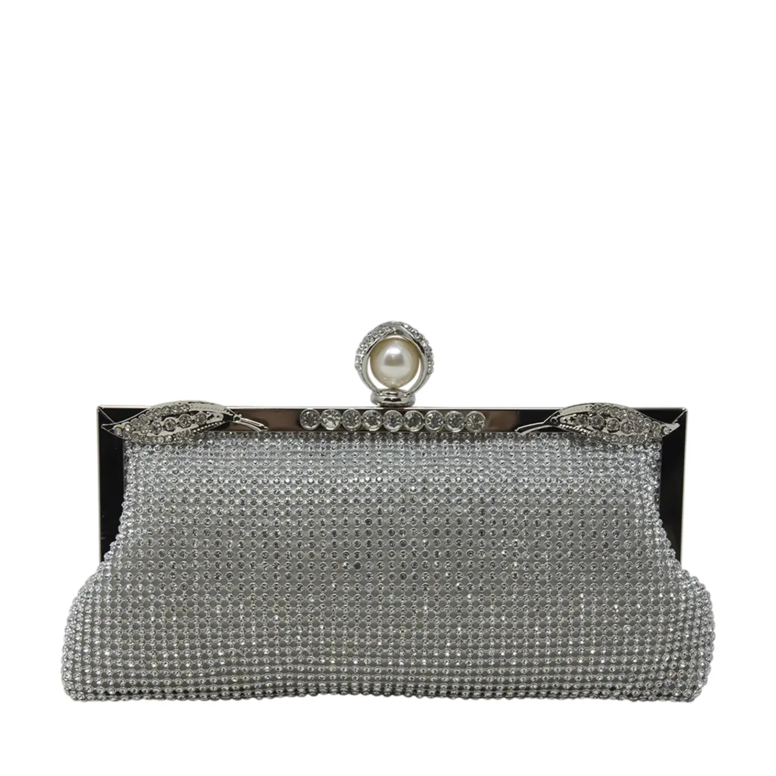 A sparkly clutch with a detachable strap, perfect for adding glitz to any special occasion. The clutch is fastened with a metal and pearl clasp. This sparkly bag is the perfect accessory for a wedding or
