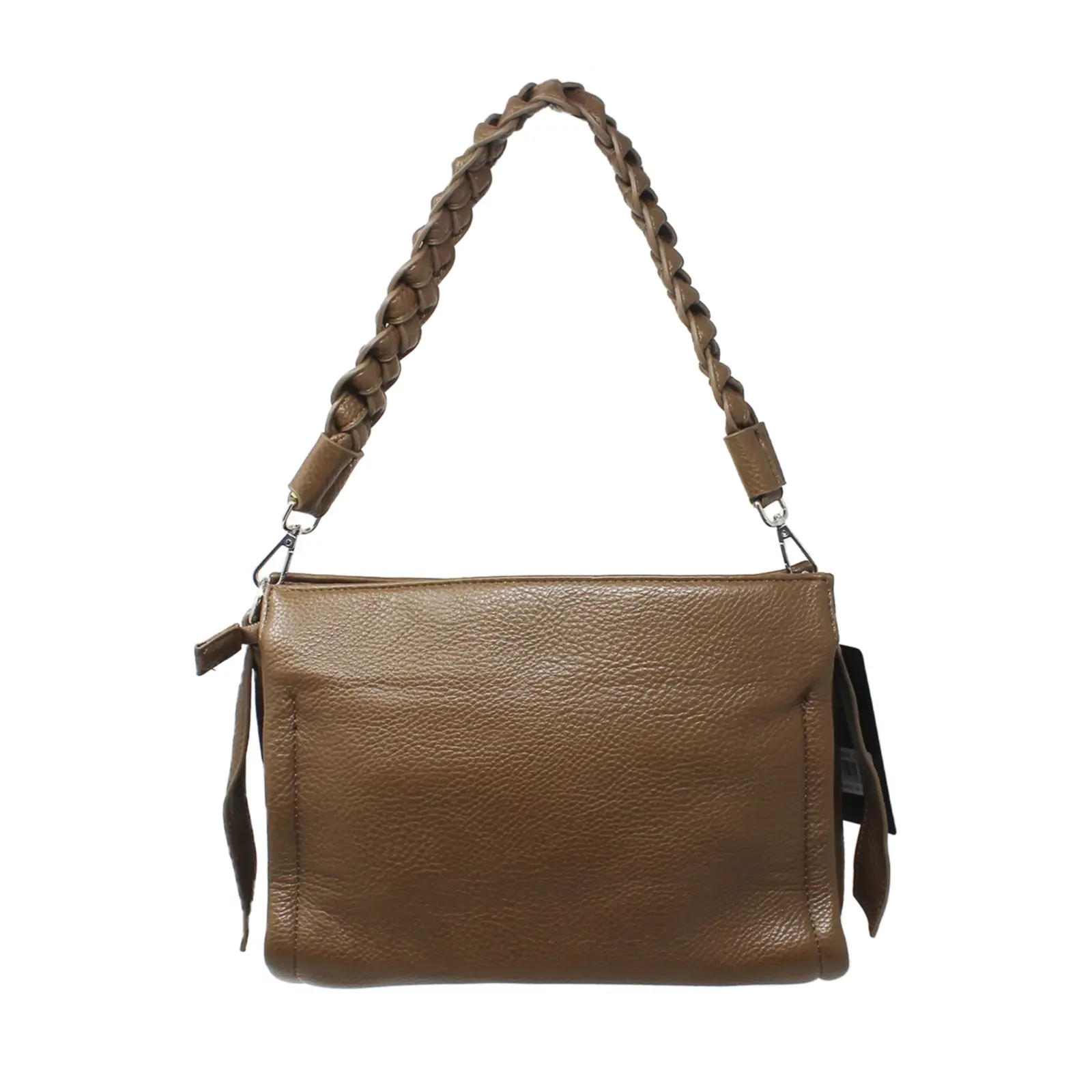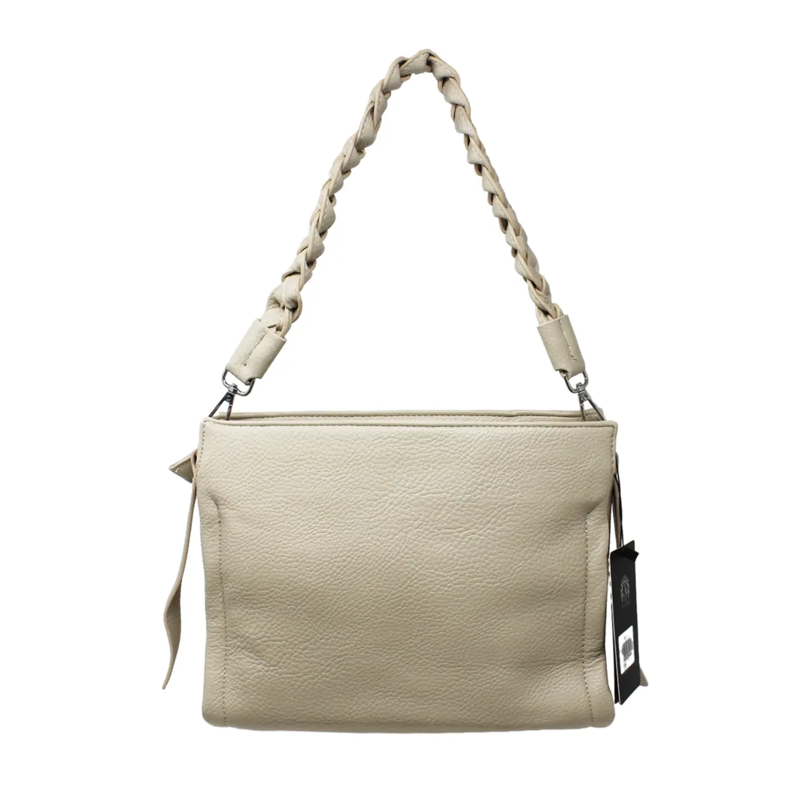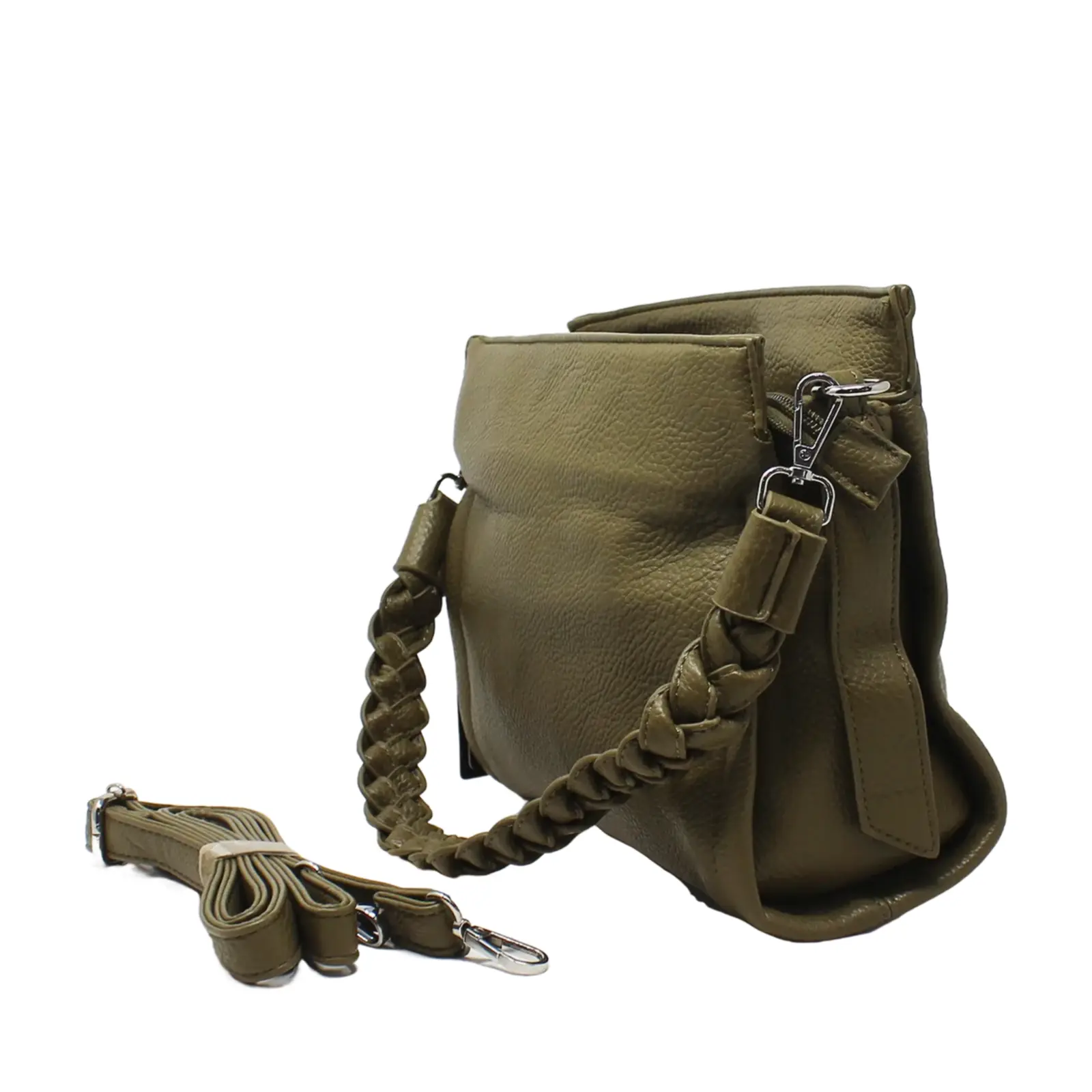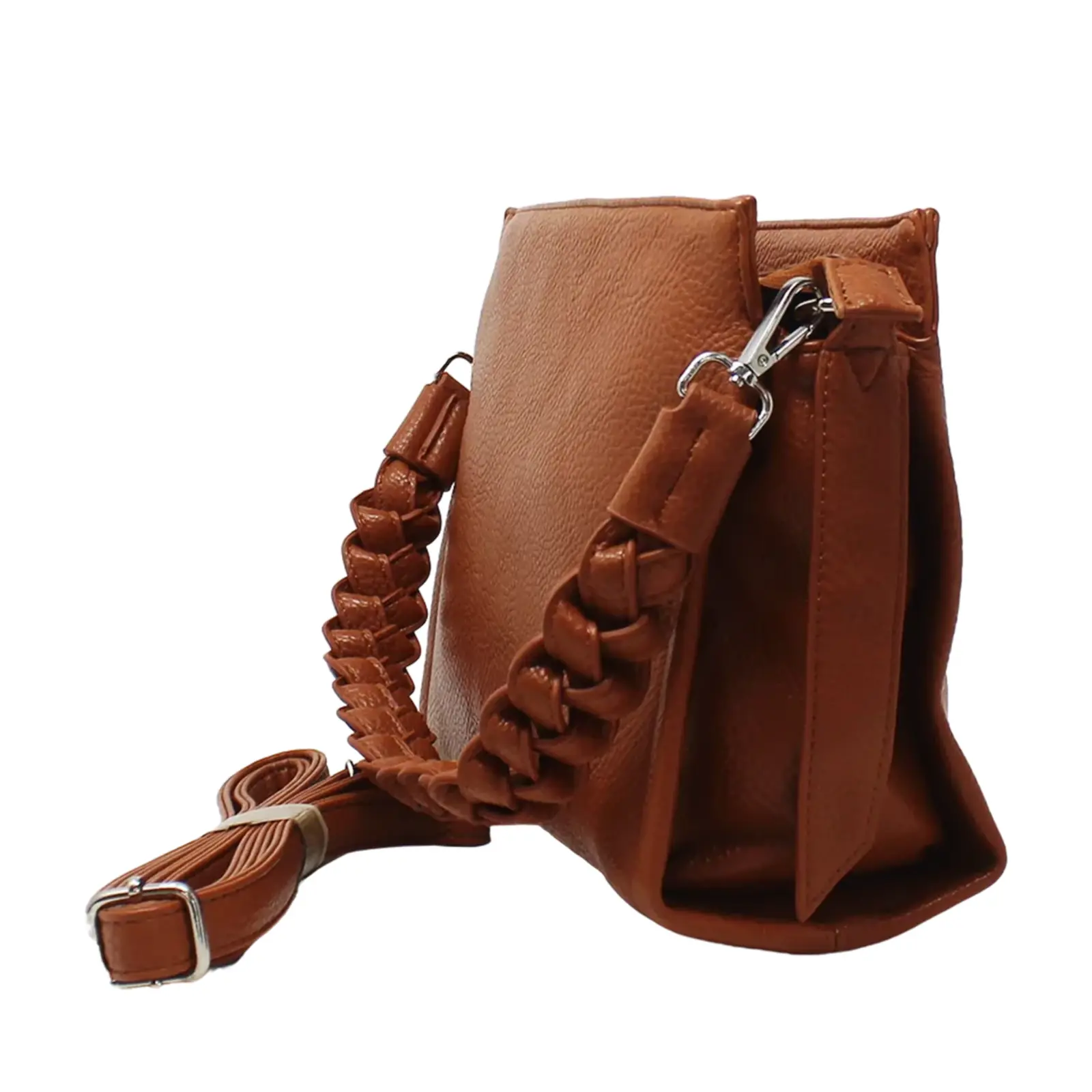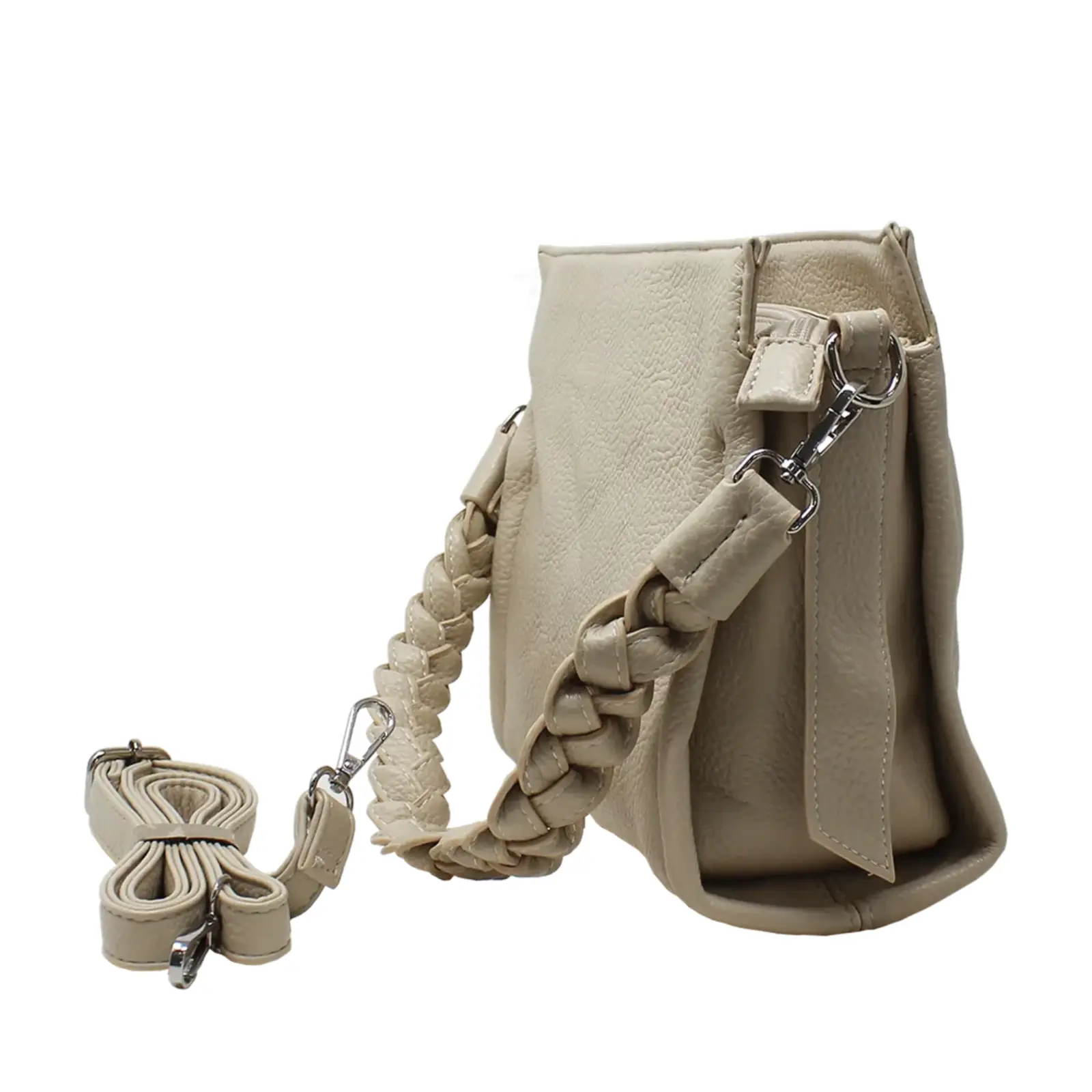Designed with a unique plait strap, this bag can be carried as a shoulder bag, or crossbody thanks to its detachable strap. It offers two spacious compartments and a secure zip pocket for added convenience and style. This is an ideal accessory for any occasion!.