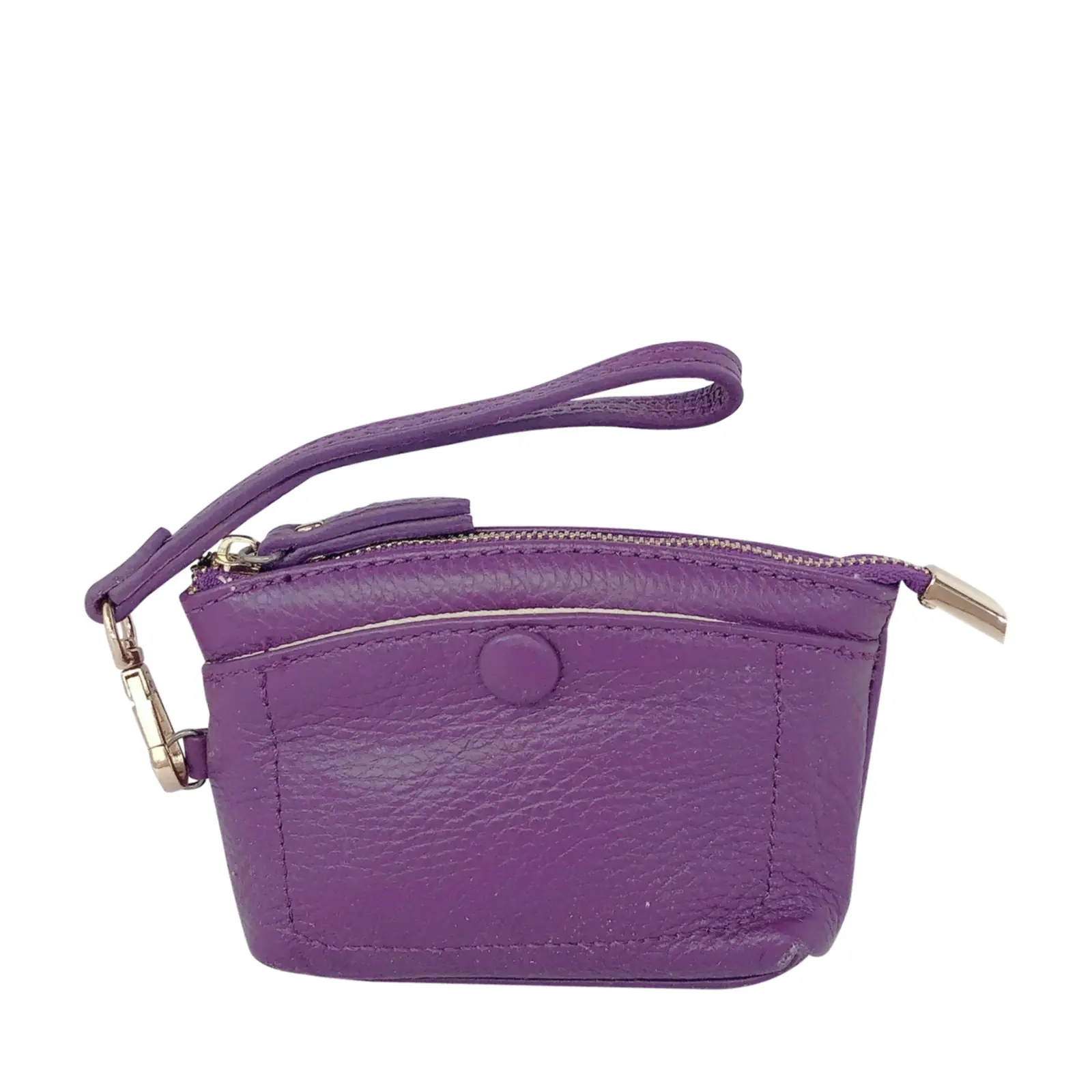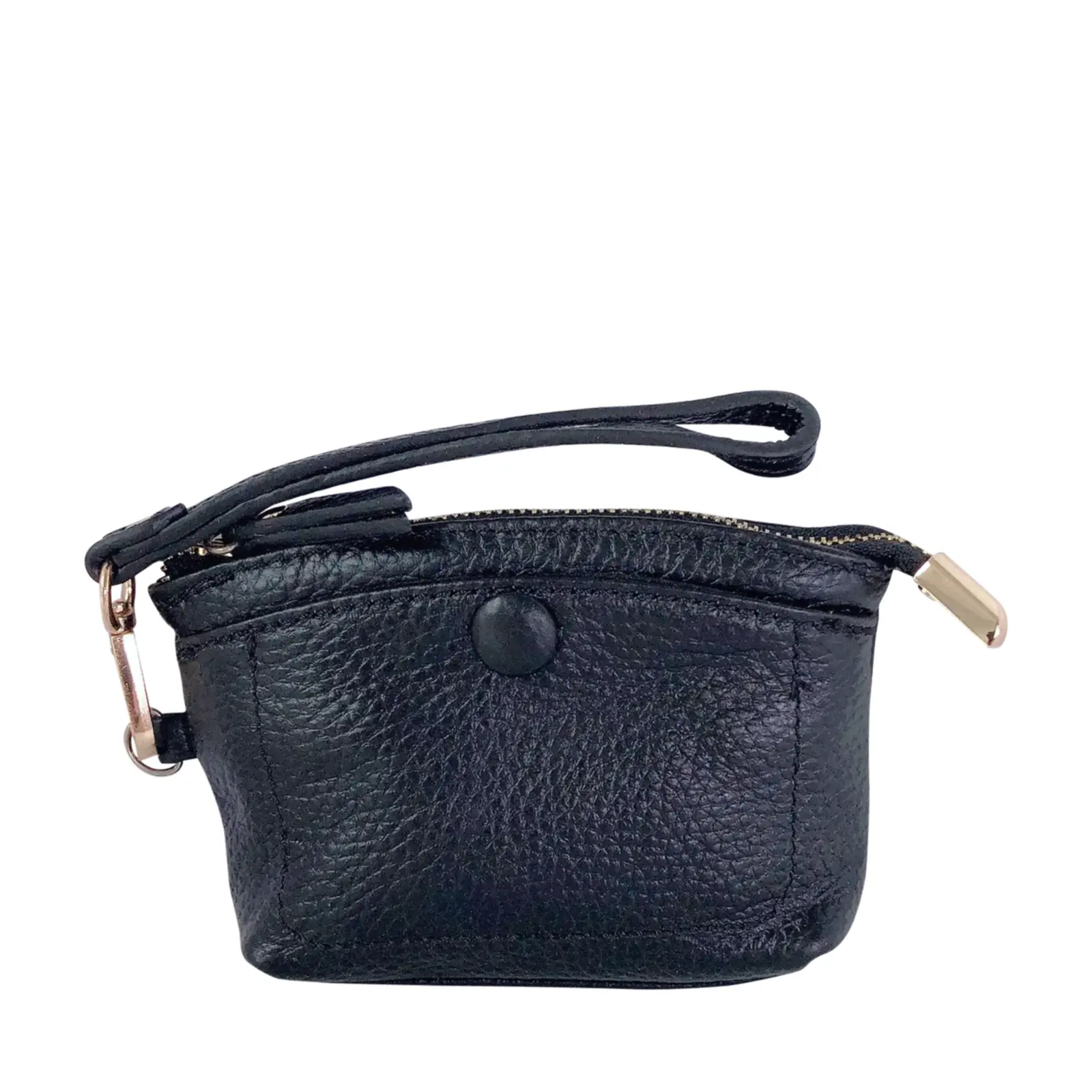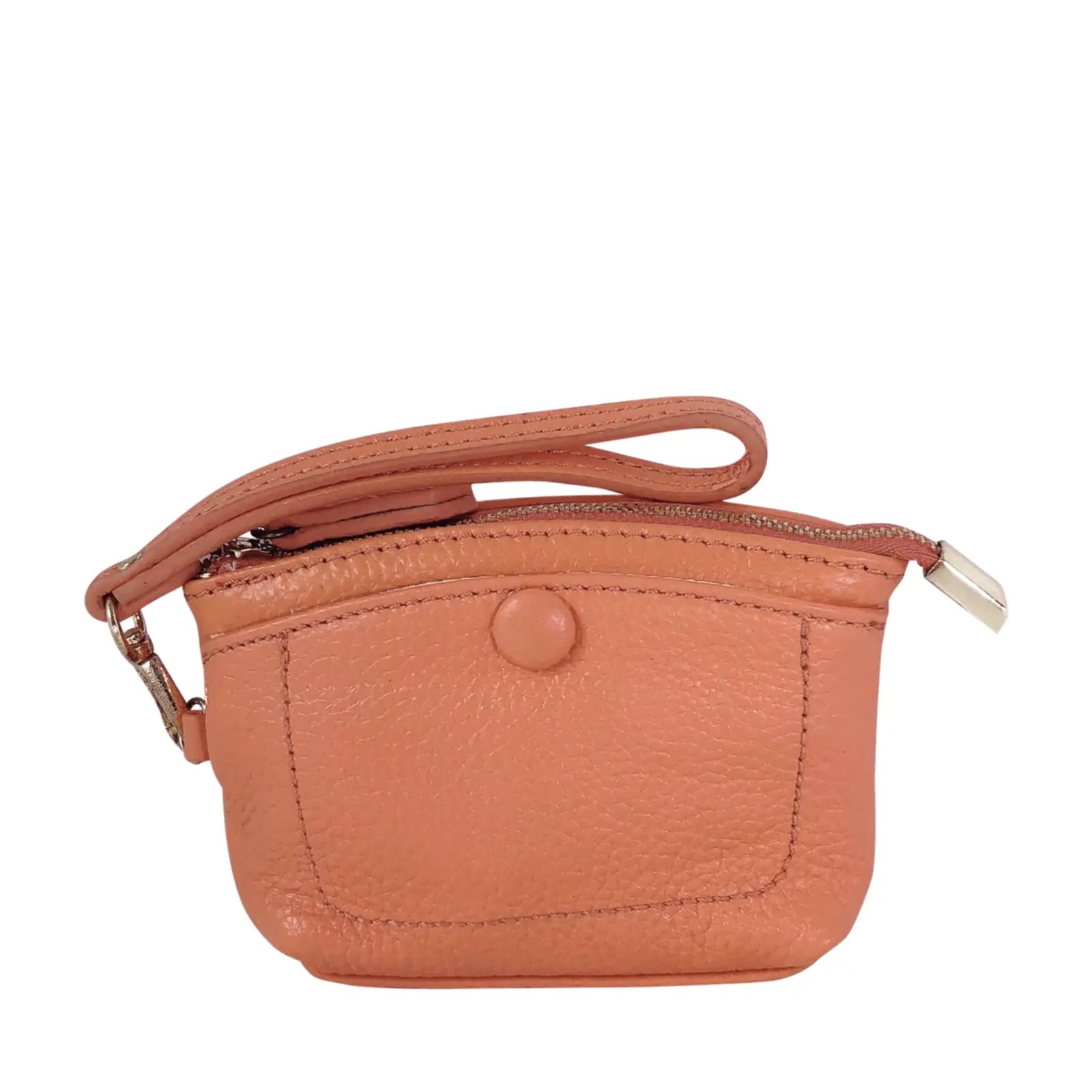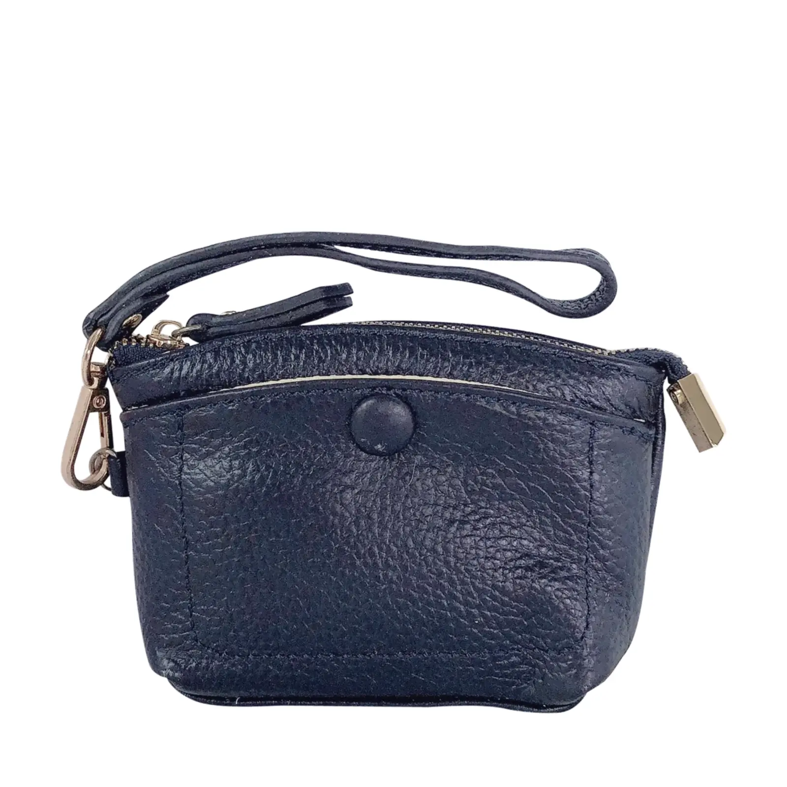This stylish and compact purse features a zip-top closure, a front snap pocket, and a matching wrist strap for easy carrying. Perfect for keeping your essentials close — whether you’re working or travelling light.