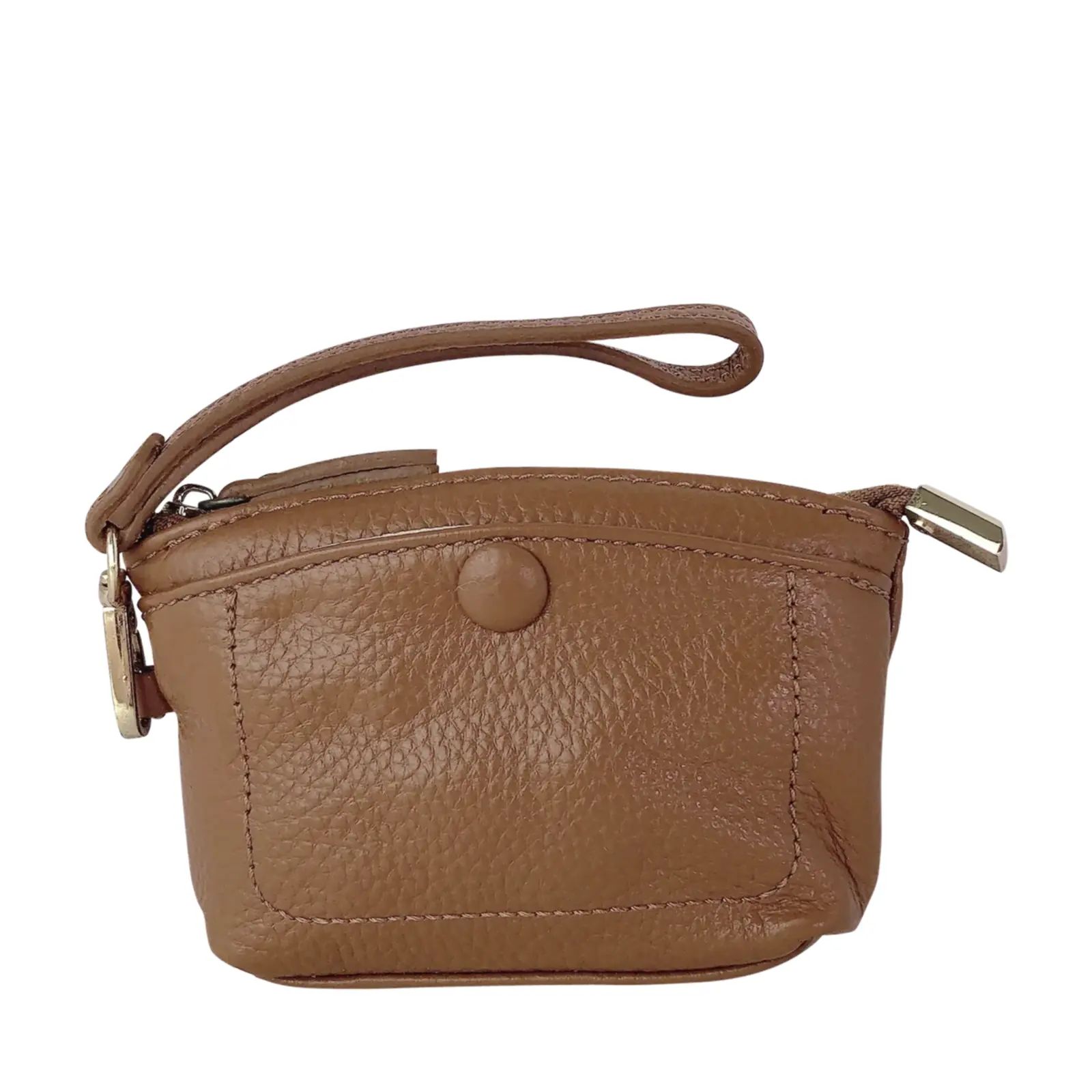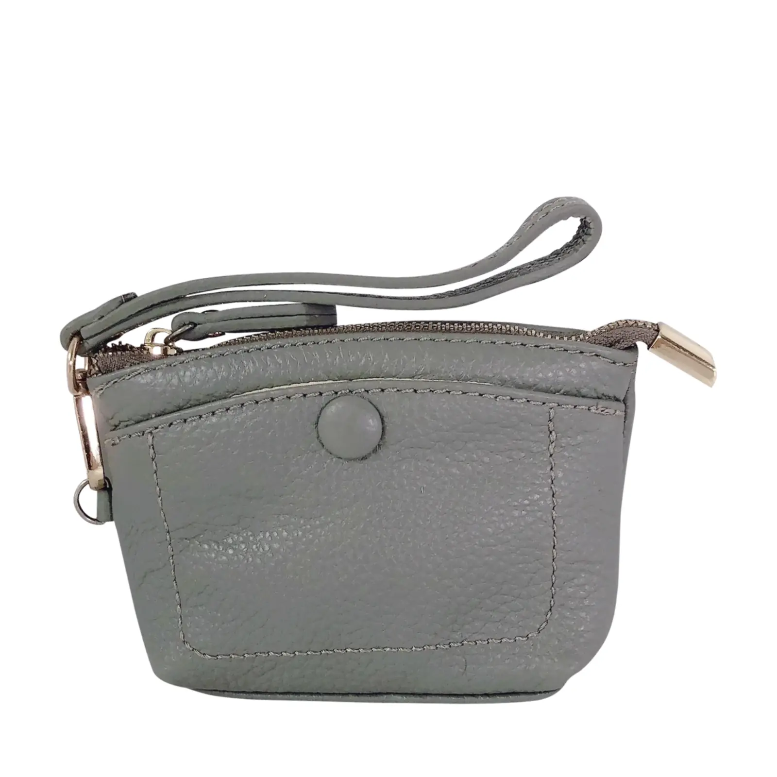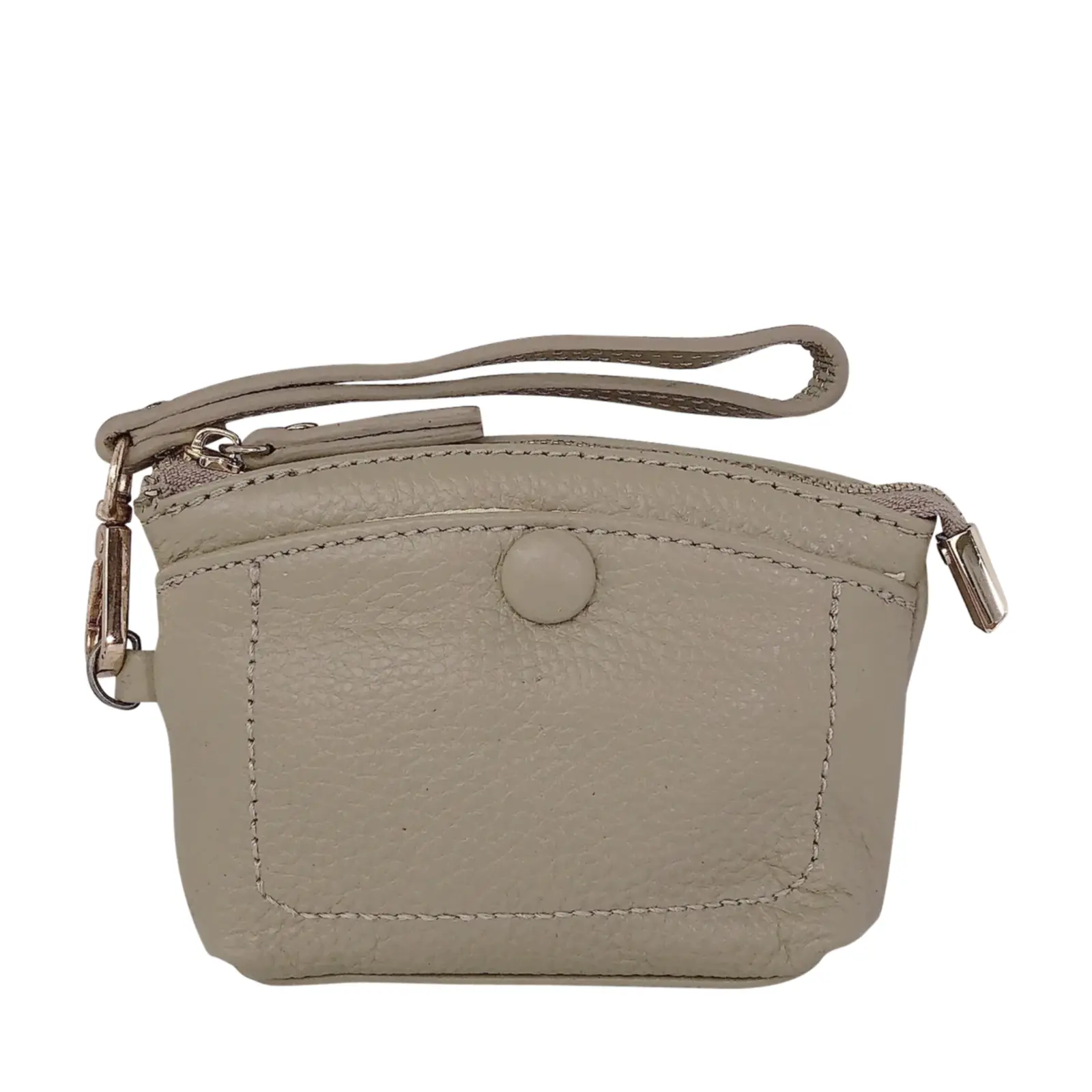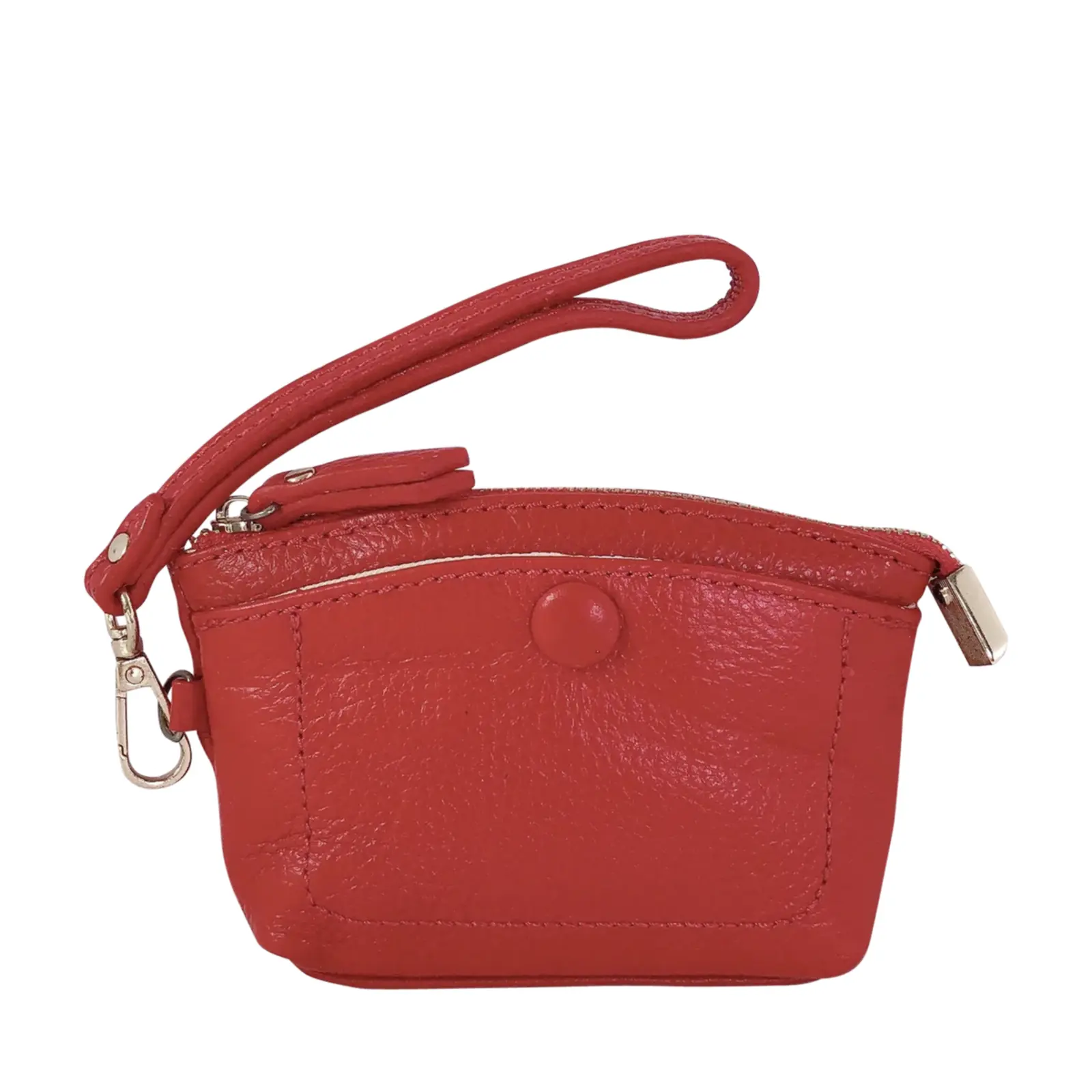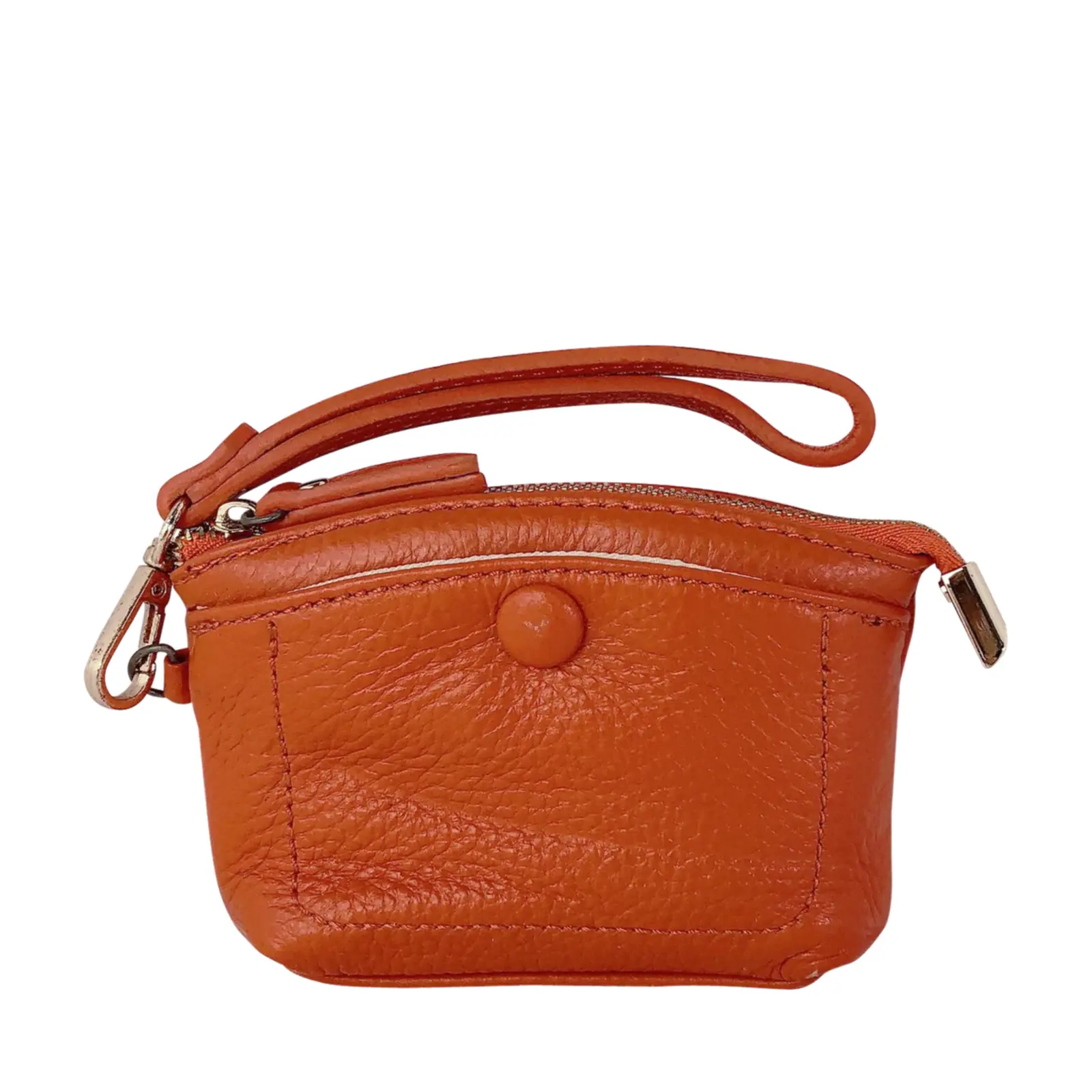 This stylish and compact purse features a zip-top closure, a front snap pocket, and a matching wrist strap for easy carrying. Perfect for keeping your essentials close — whether you’re working or travelling light.