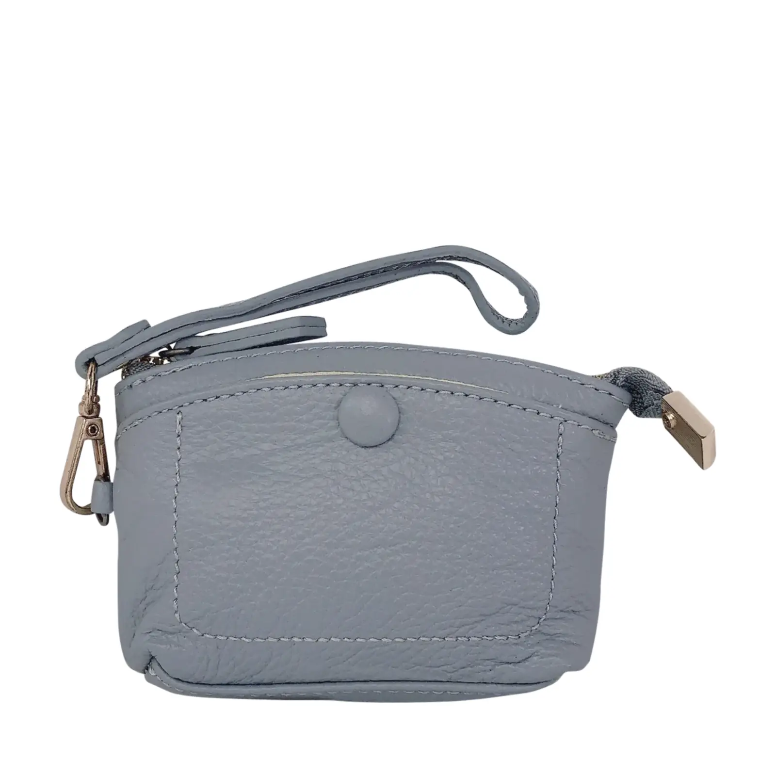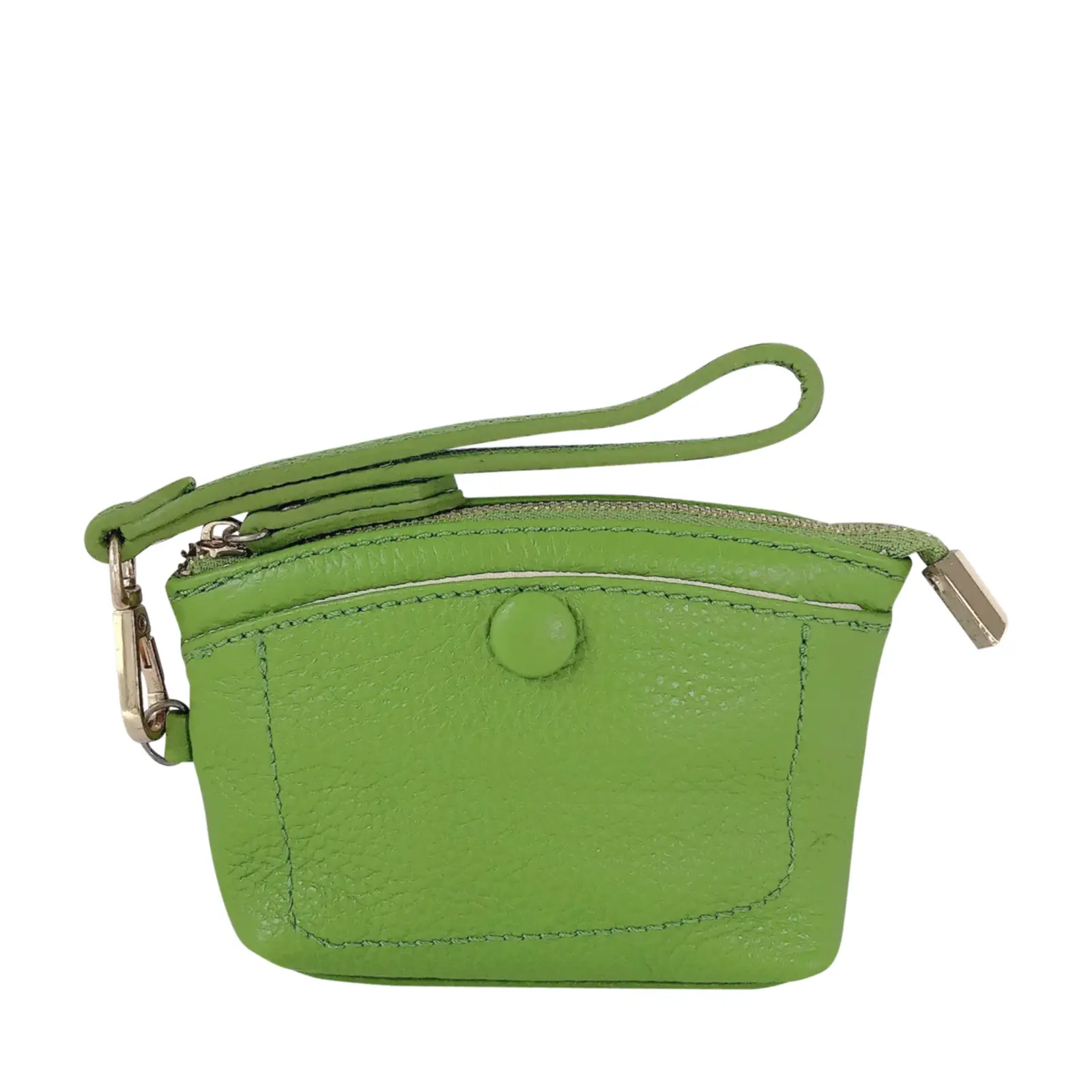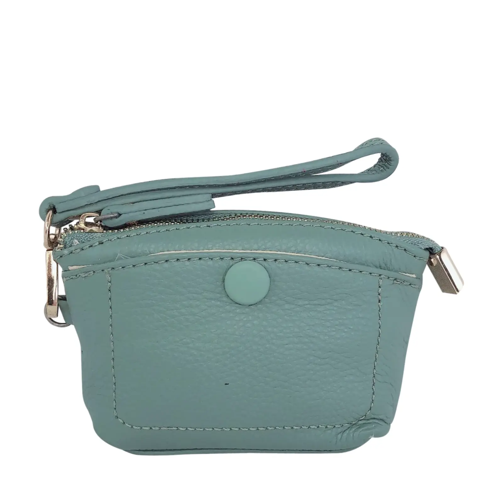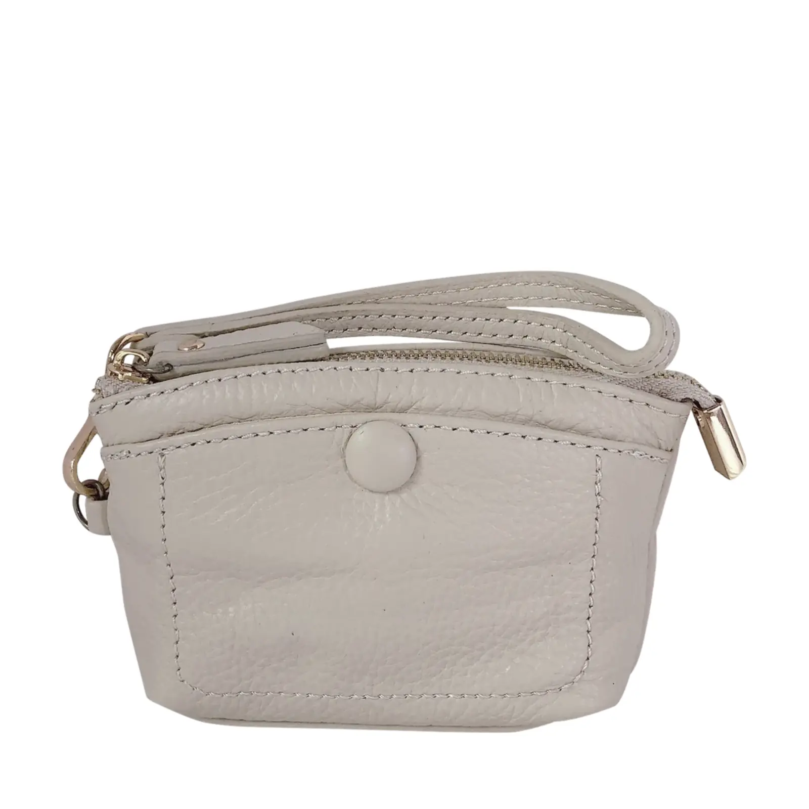 This stylish and compact purse features a zip-top closure, a front snap pocket, and a matching wrist strap for easy carrying. Perfect for keeping your essentials close — whether you’re working or travelling light.