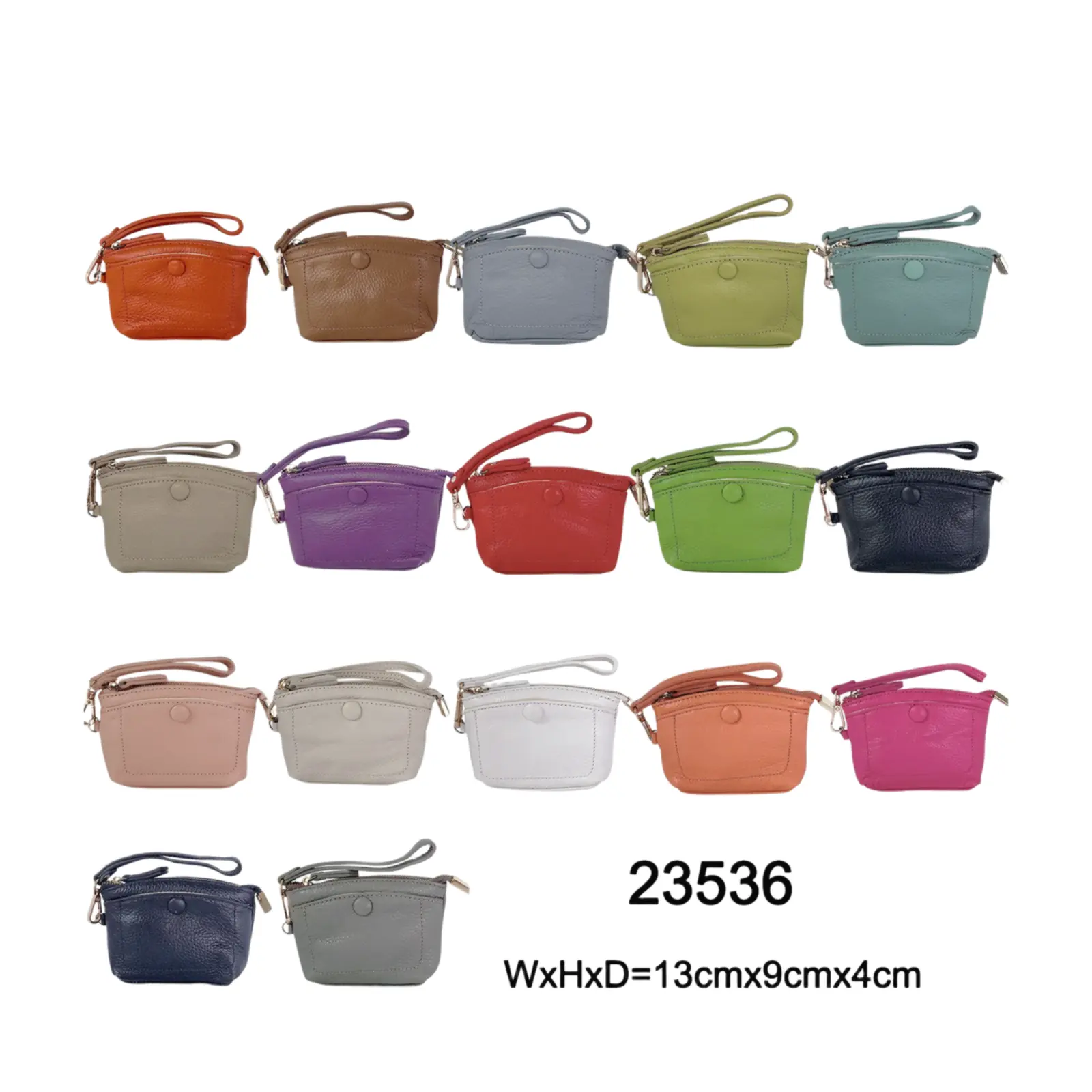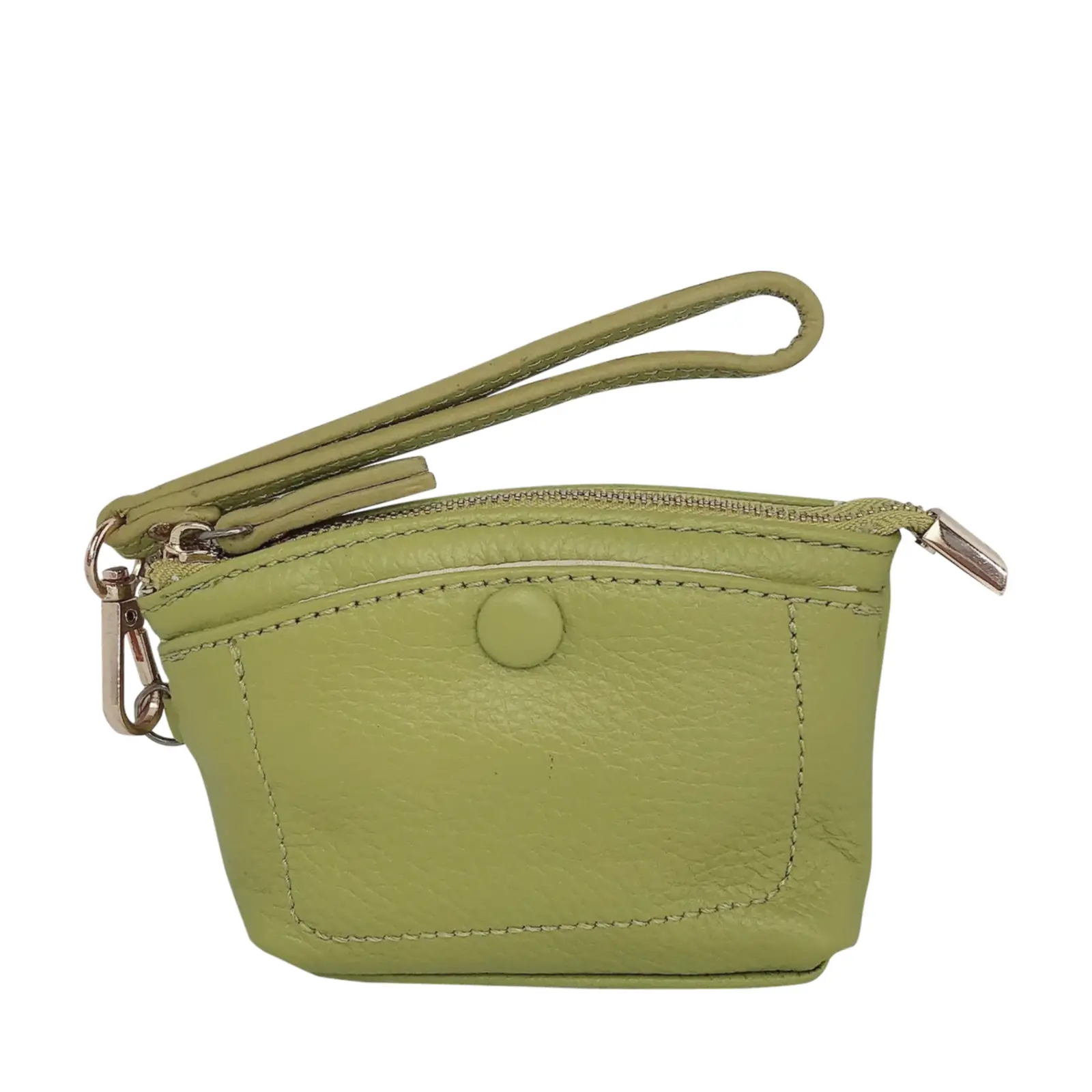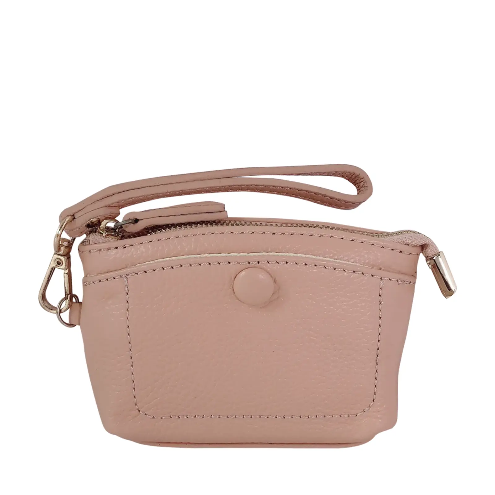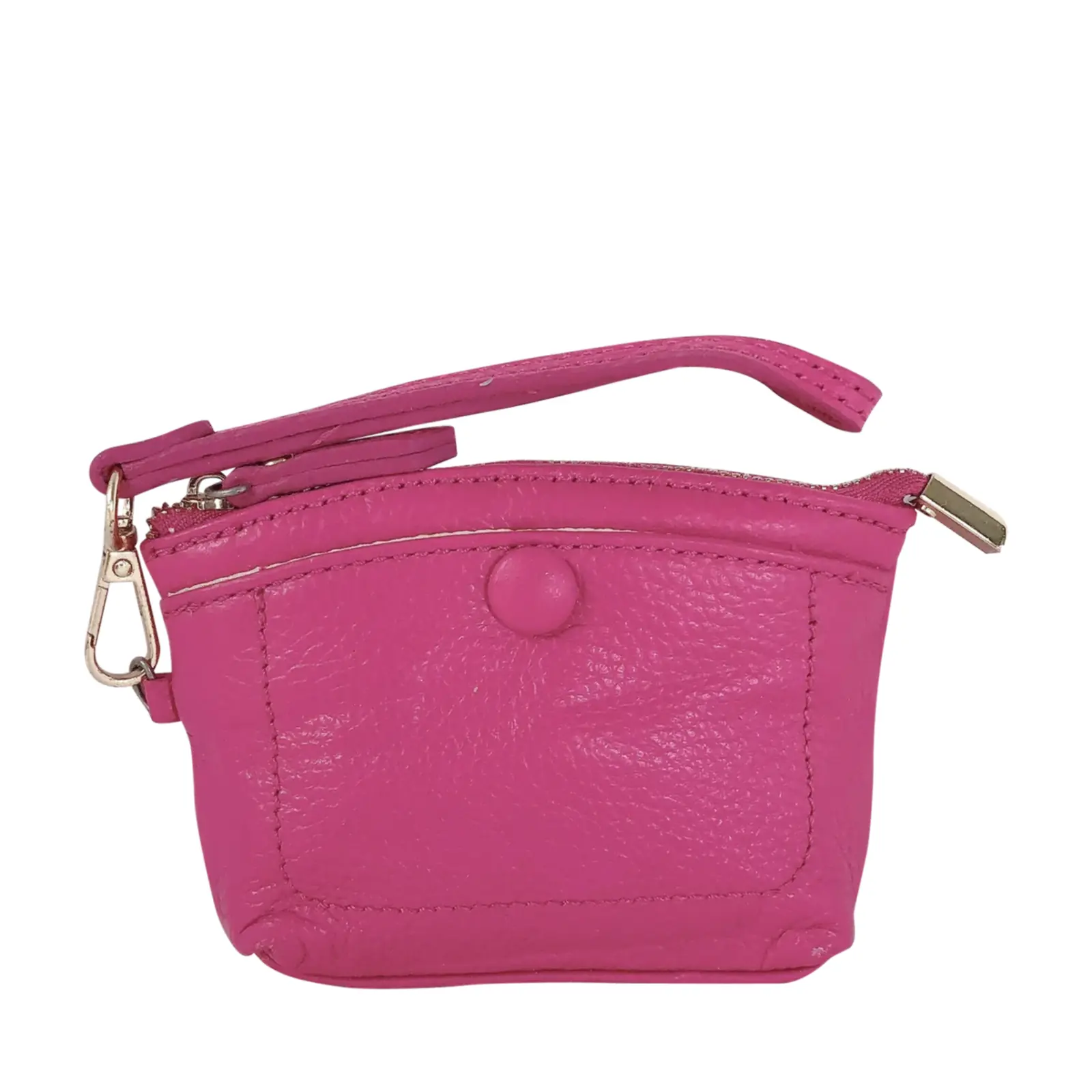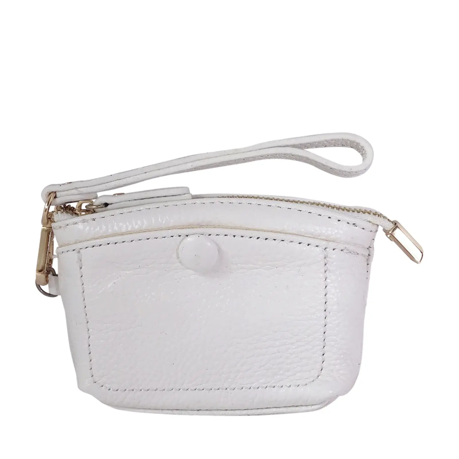 This stylish and compact purse features a zip-top closure, a front snap pocket, and a matching wrist strap for easy carrying. Perfect for keeping your essentials close — whether you’re working or travelling light.