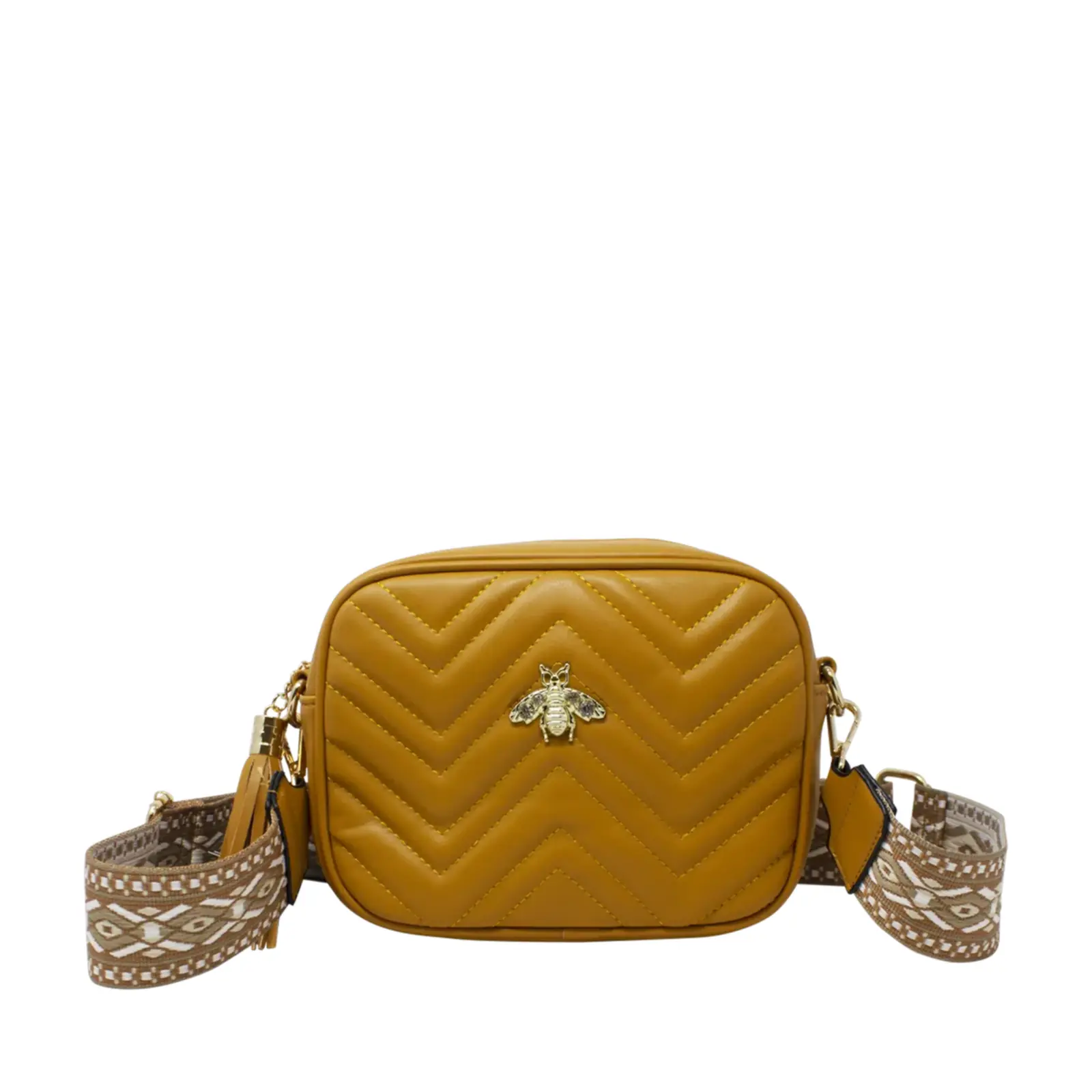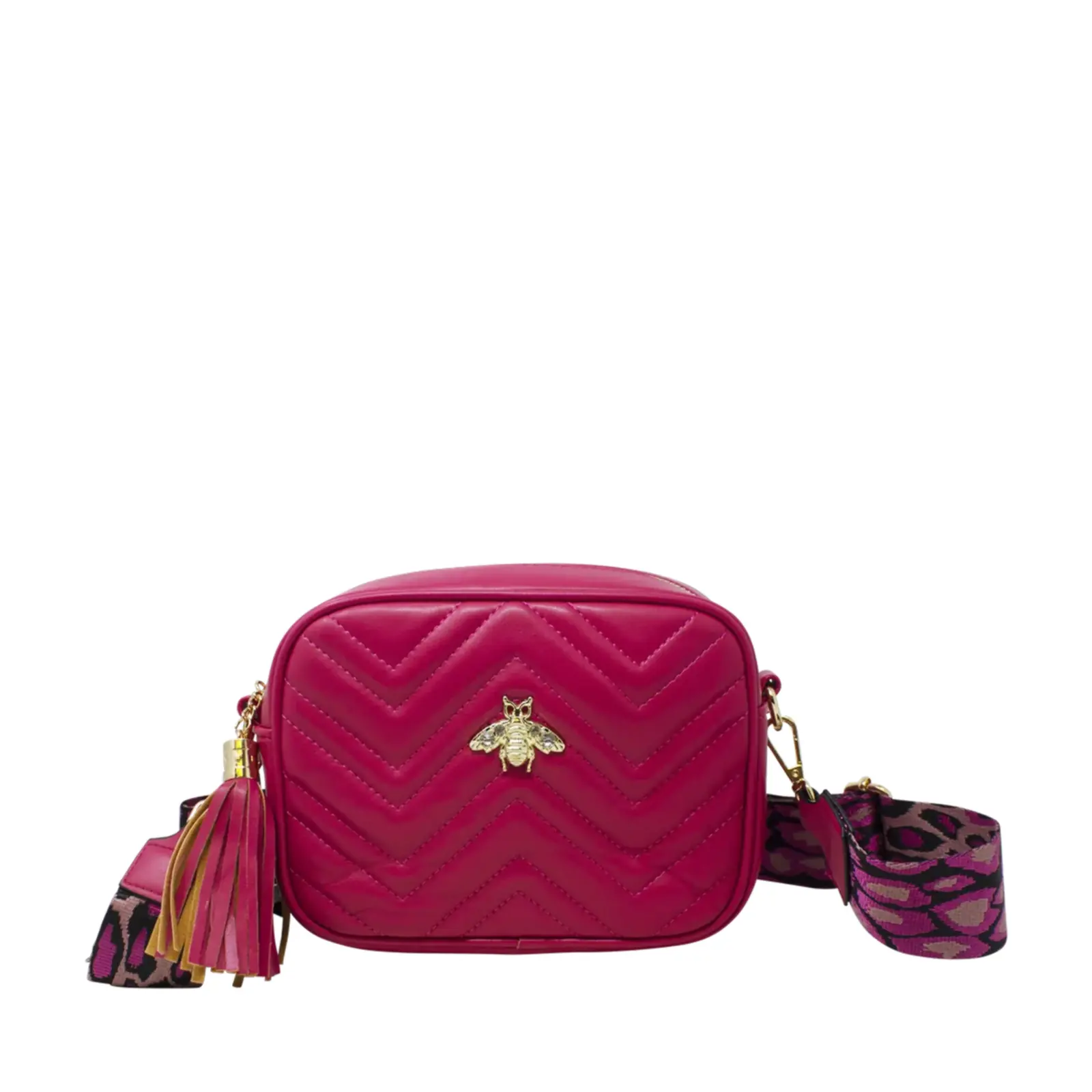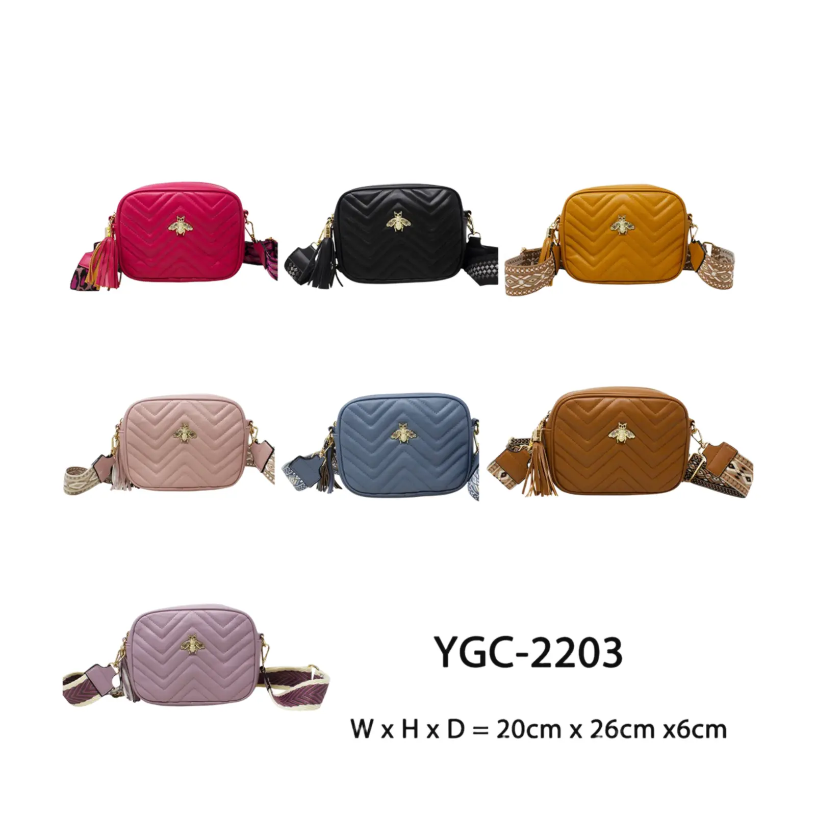 PLEASE NOTE : The Pack of 6 Pcs option includes a mix of colours, ideally one of each. Final colours may vary depending on stock availability. A classic sized boxed camera bag with soft zig-zag stitched lines. Decorated with a bee at the front and comes with colourful woven shoulder strap.
