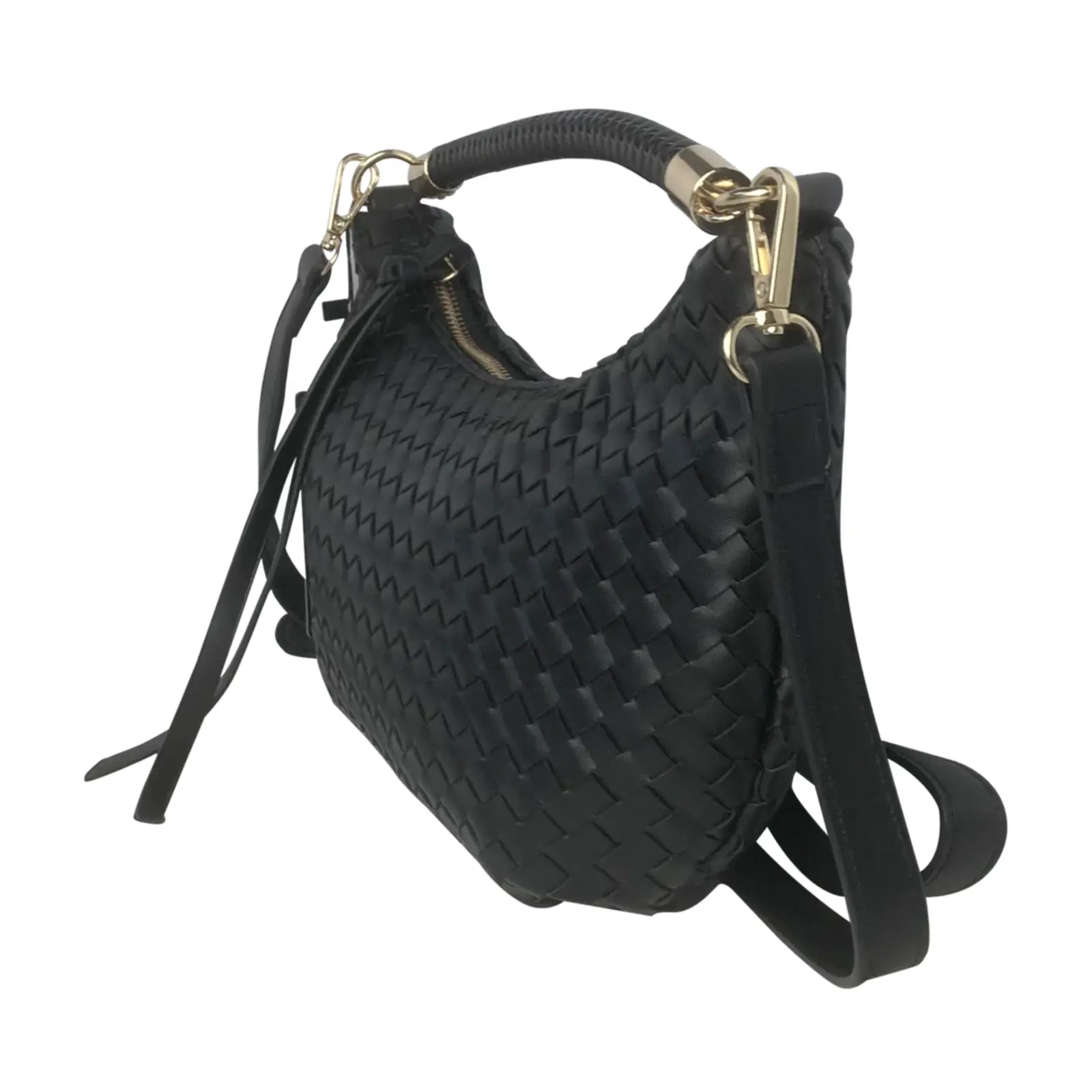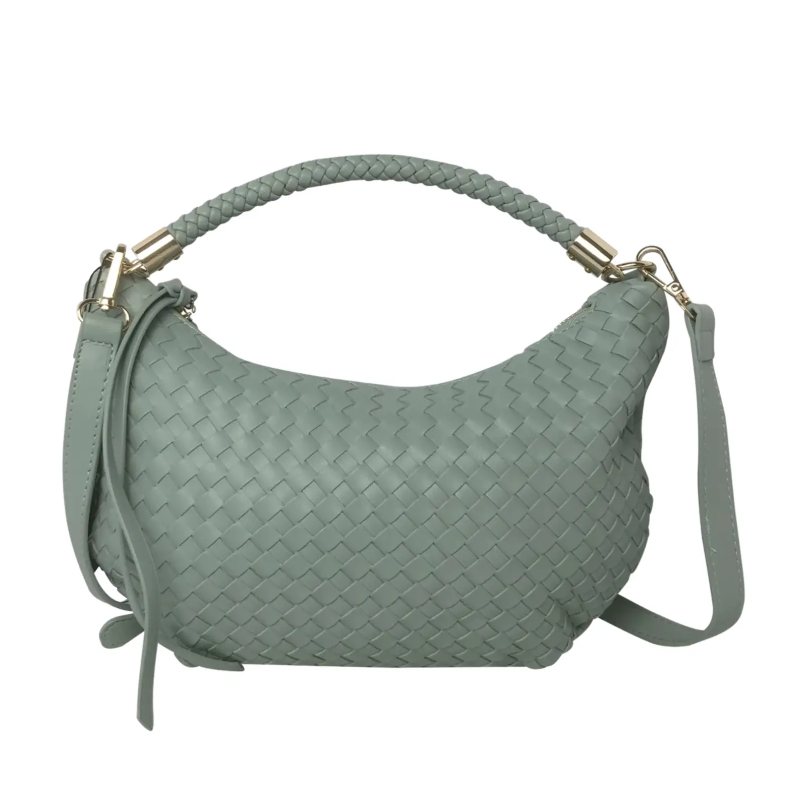 This stylish woven crescent shoulder bag offers a sophisticated touch with its braided handle and detachable strap. It’s a perfect blend of fashion and function, designed for versatility and everyday ease.