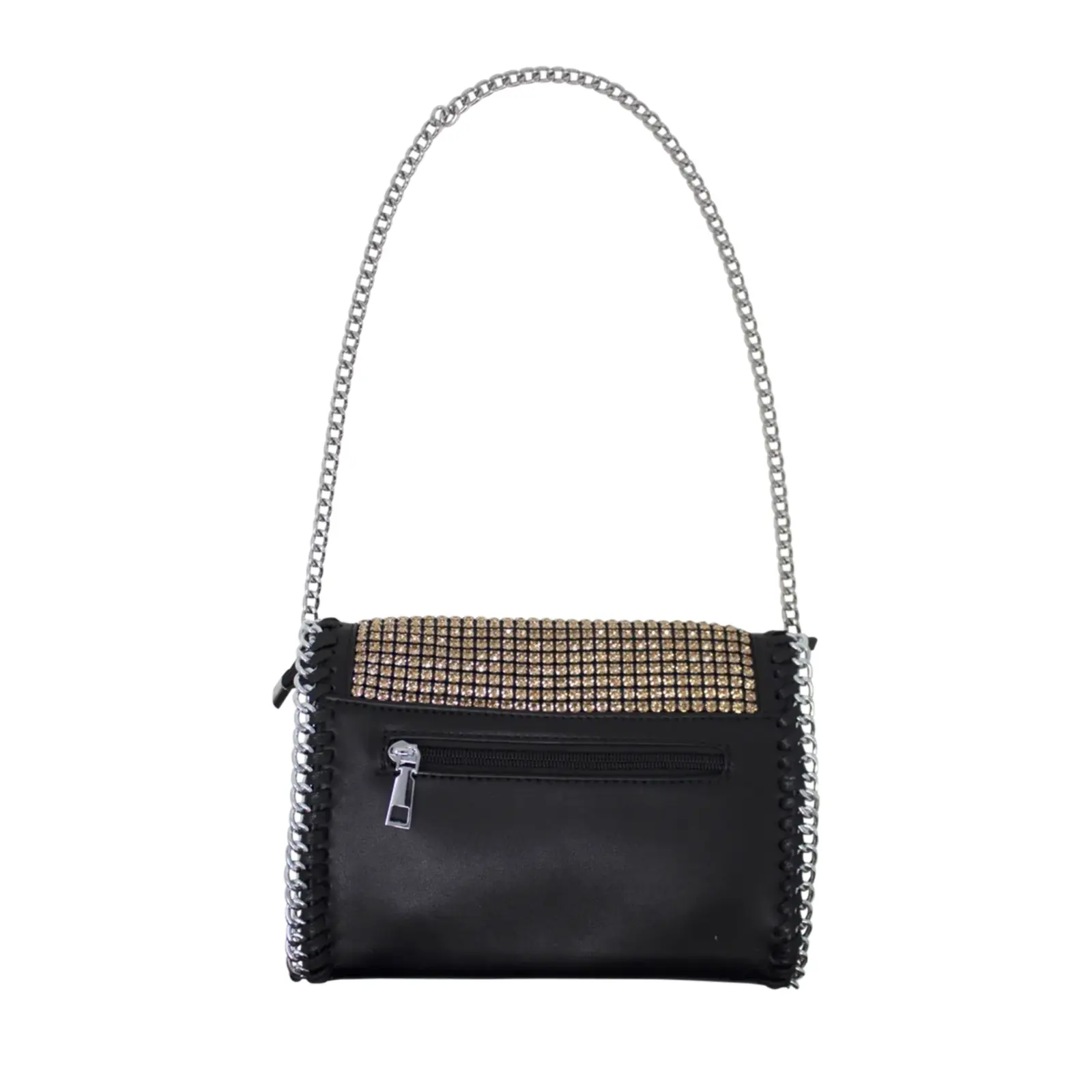 This is a crossbody bag that features sparkling diamante at the front also it comes with a long metal chain strap for a style switch. This bag is perfect for a night out or off-duty days.