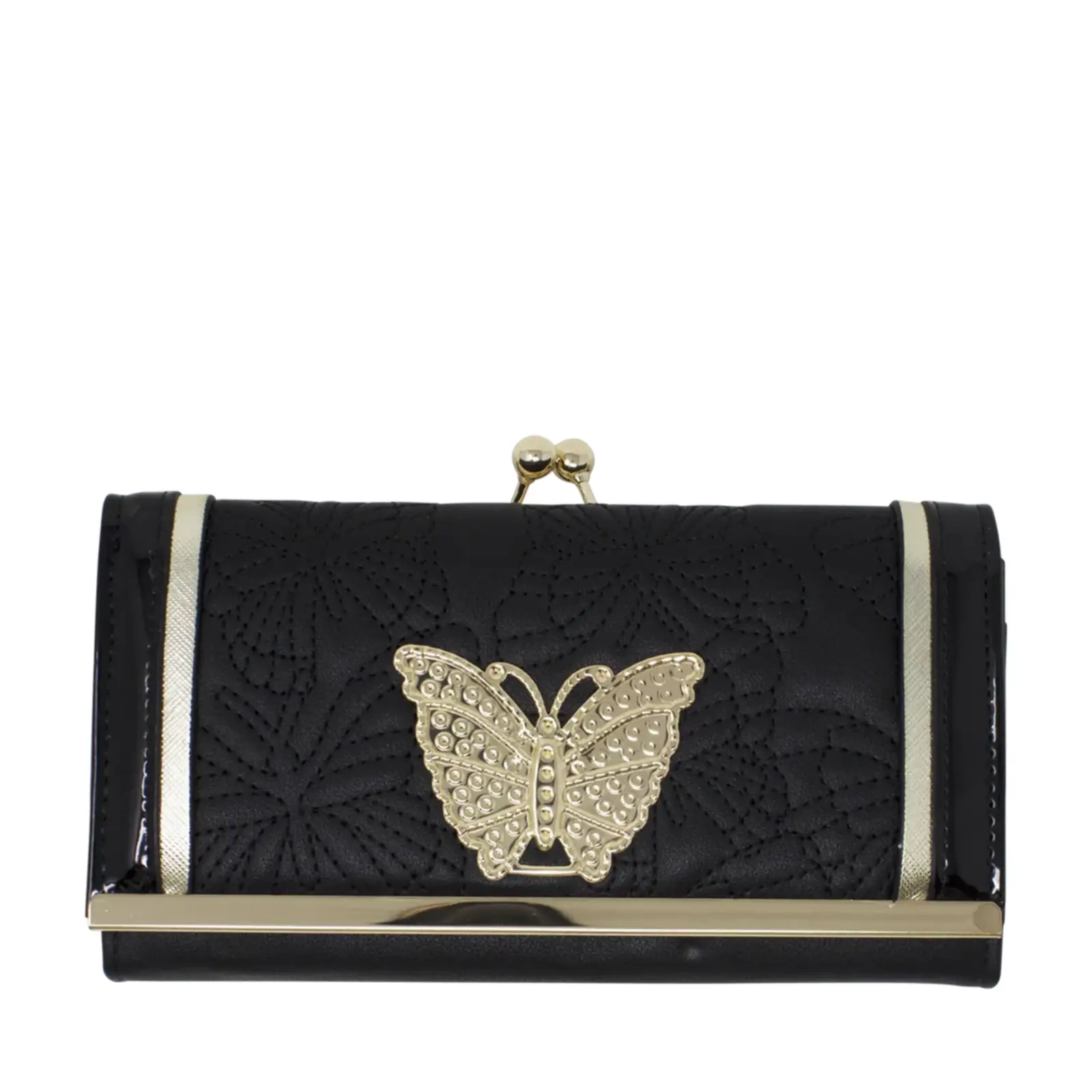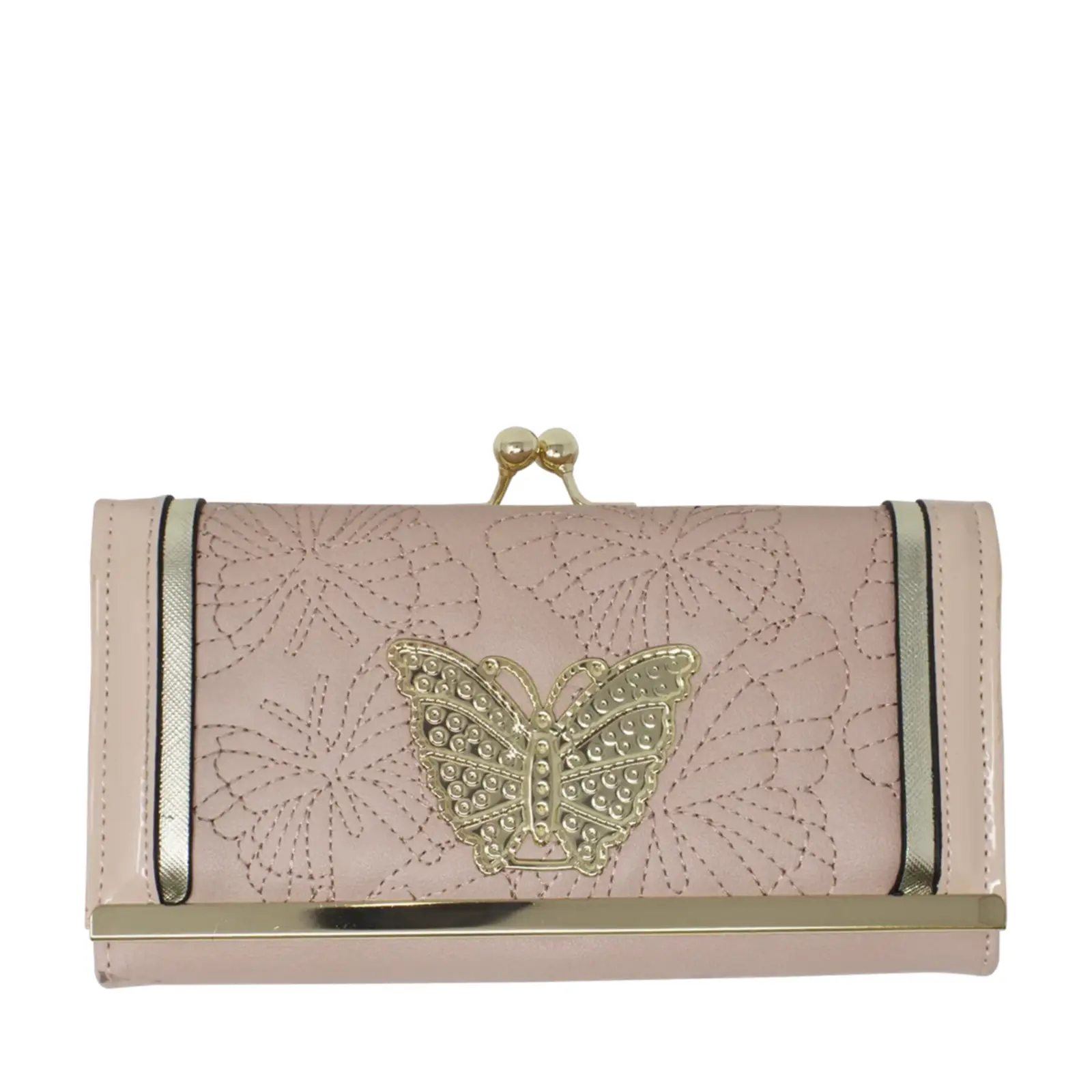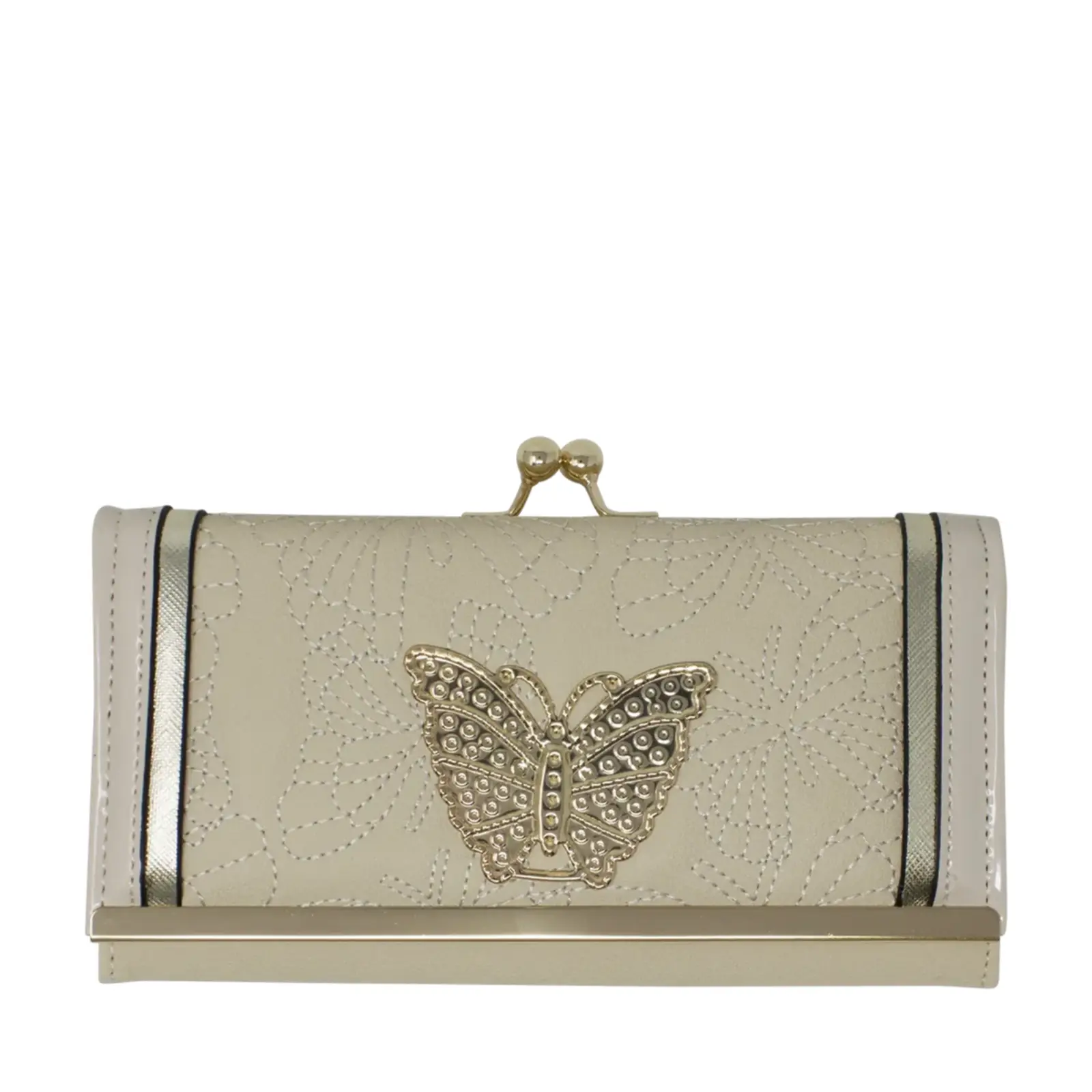 Beautiful faux leather clutch with clip top compartment Butterfly stitches at the front with a metal plate Gold tone hardware Foldout design Internal card slots Zip coin compartment L x D x H – 19cm x 4cm x 10cm Comes with a gift box.