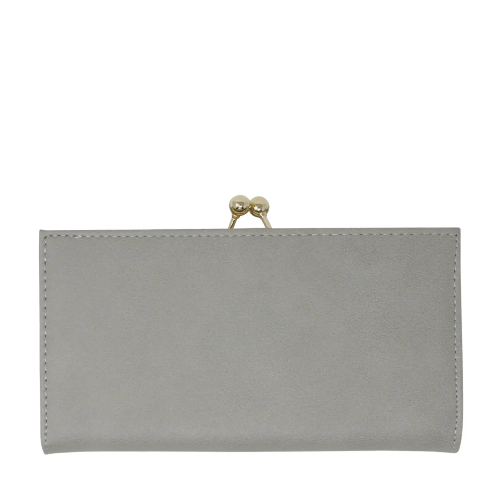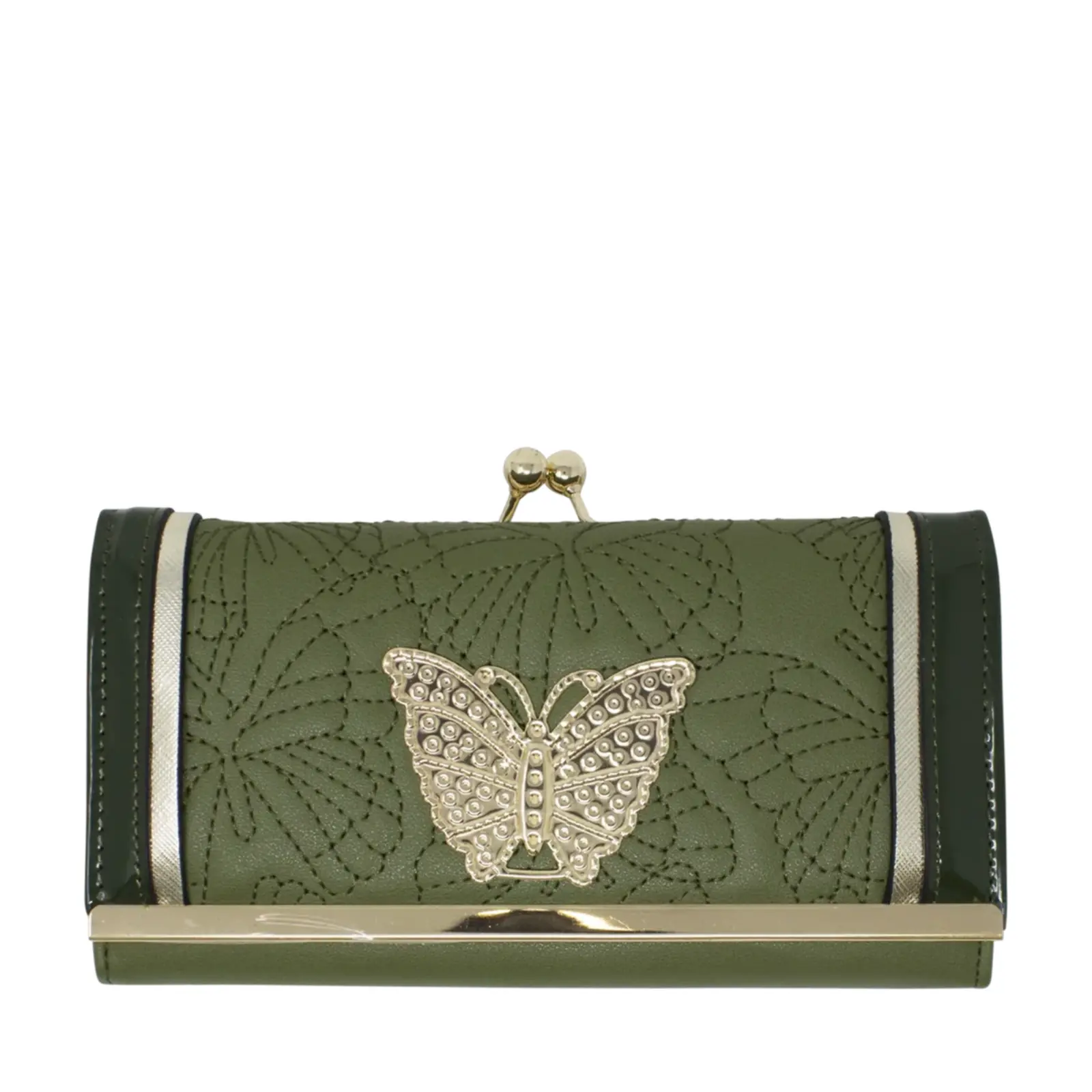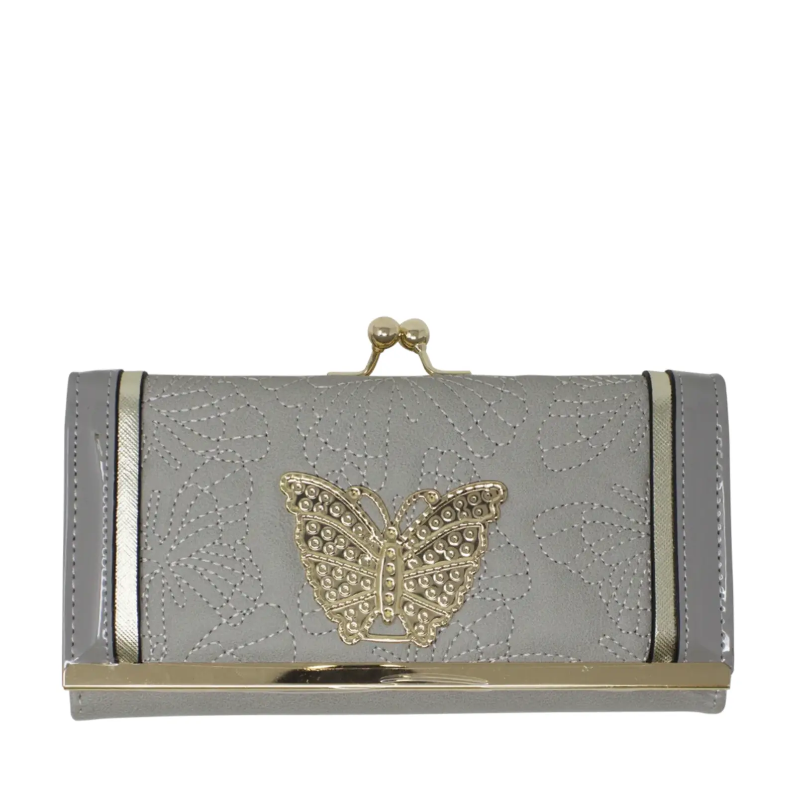 Beautiful faux leather clutch with clip top compartment Butterfly stitches at the front with a metal plate Gold tone hardware Foldout design Internal card slots Zip coin compartment L x D x H – 19cm x 4cm x 10cm Comes with a gift box.