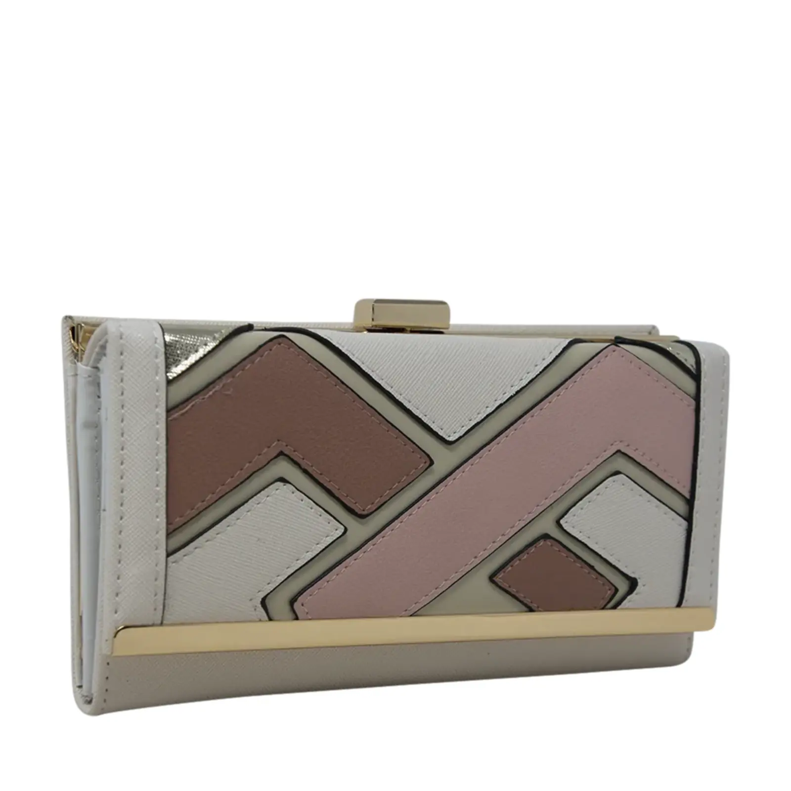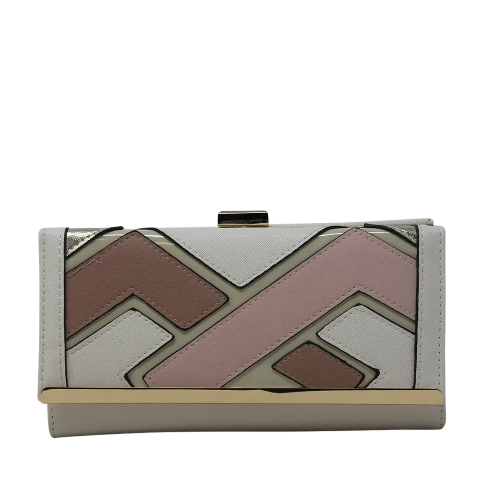 Beautiful faux leather clutch with clip top compartment Mixed pattern design with croc print panel inserts Gold tone hardware Foldout design Internal card slots Zip coin compartment L x W x H – 19.5cm x 3.5cm x 10cm.
