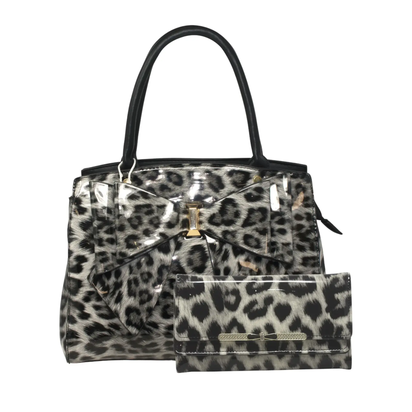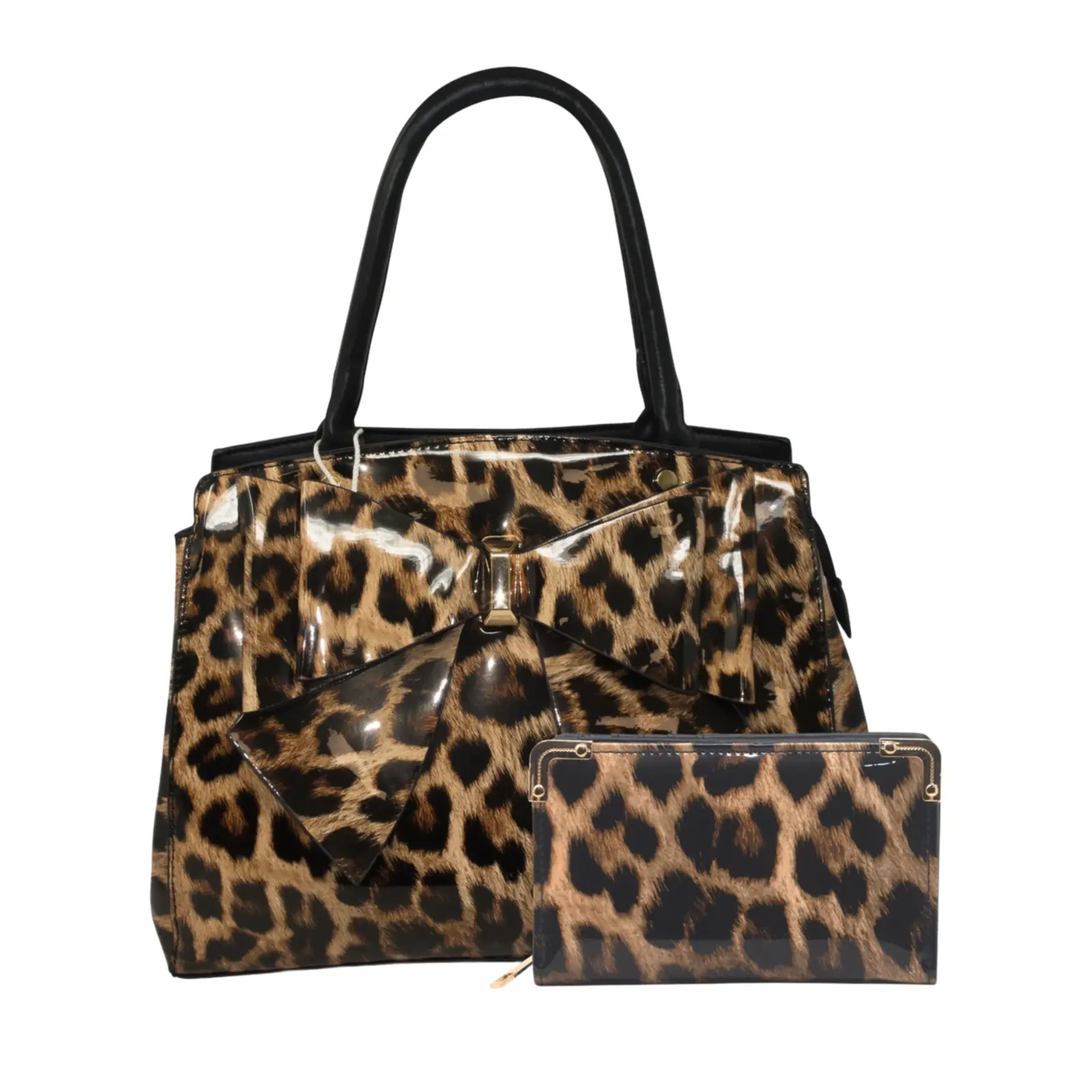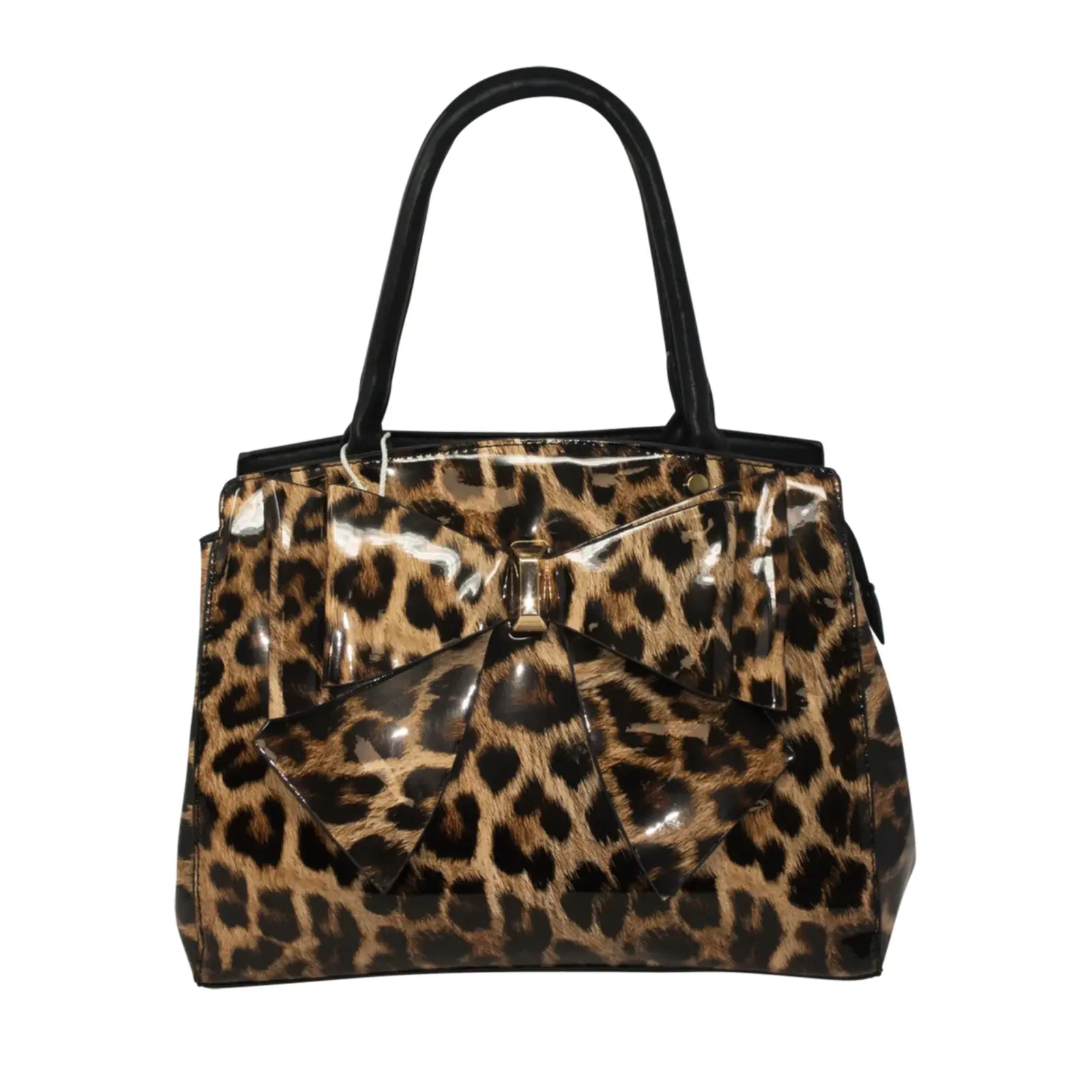 Trendy anima print (leopard) patent faux leather tote bag. Detachable long shoulder strap. Zipped closure with multiple inside-compartments. Big front bow tie details. Size: L x W x H – L x W x H – 33m x 14cm x 26cm approximately. Matching purse is also available to be purchased as a set.