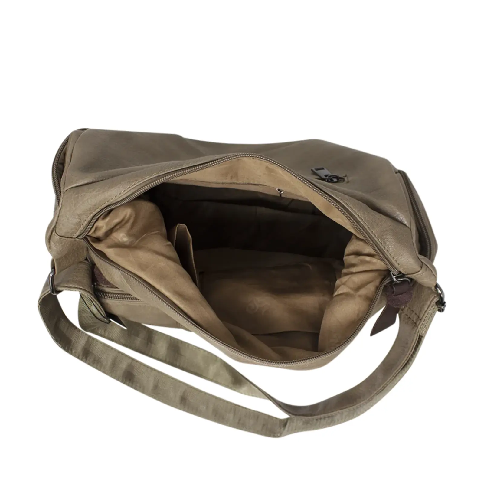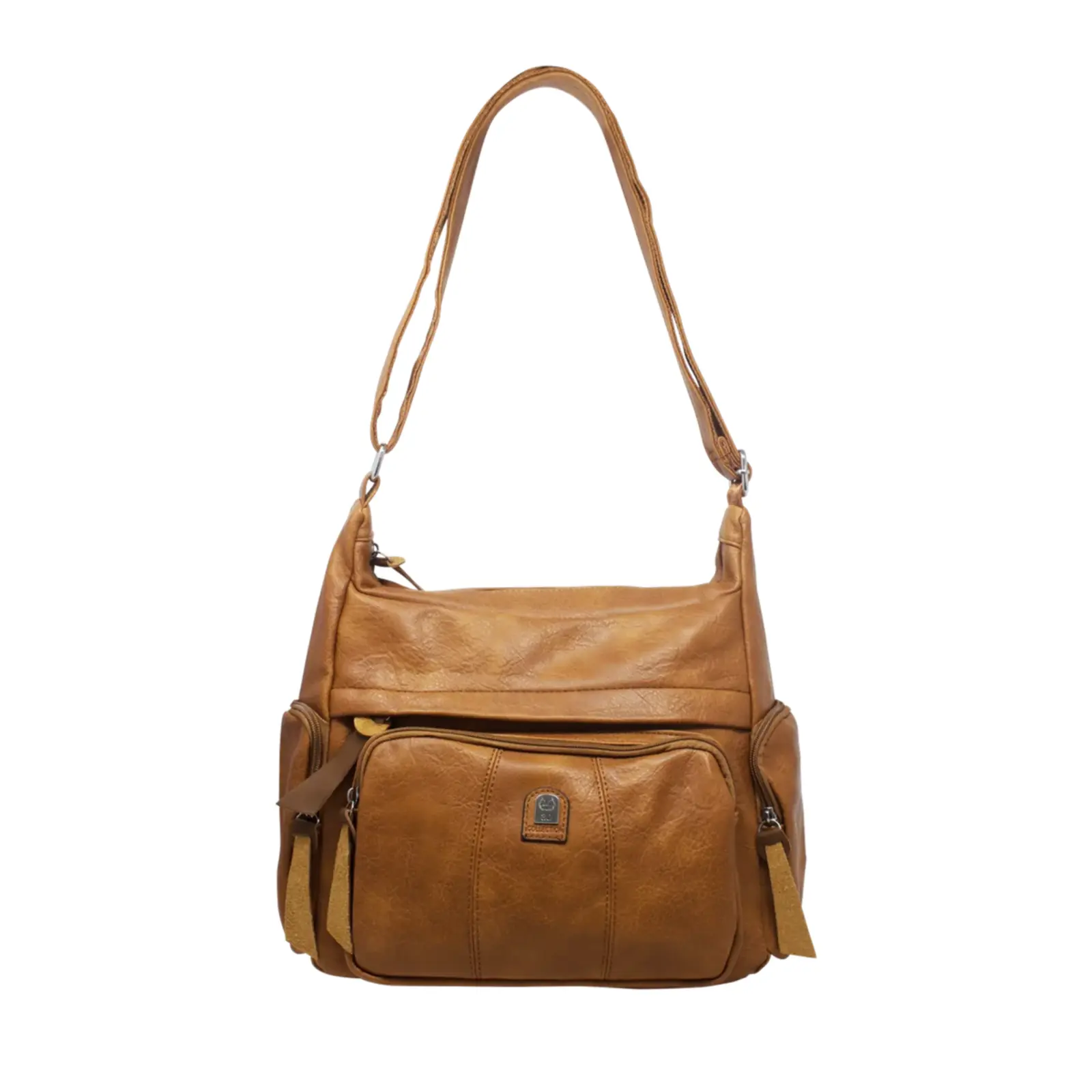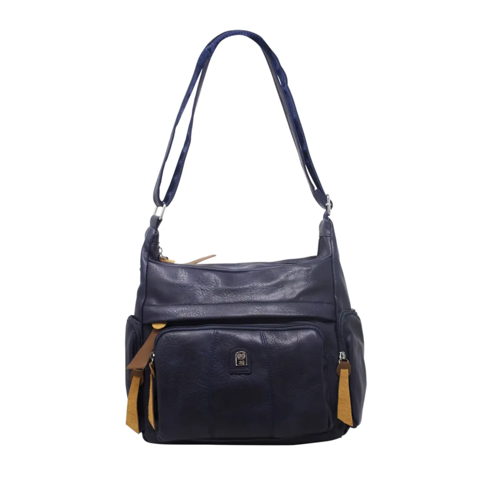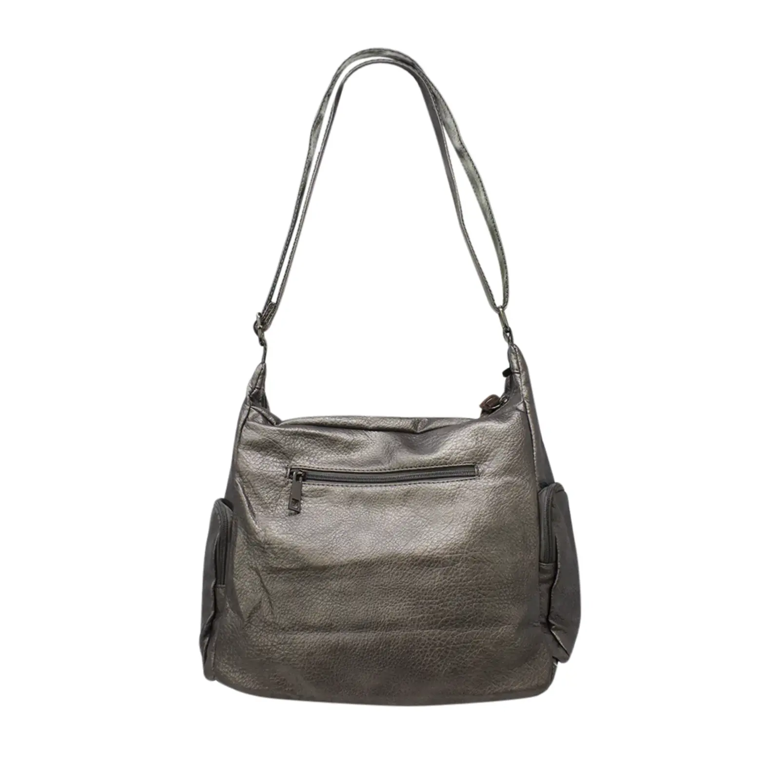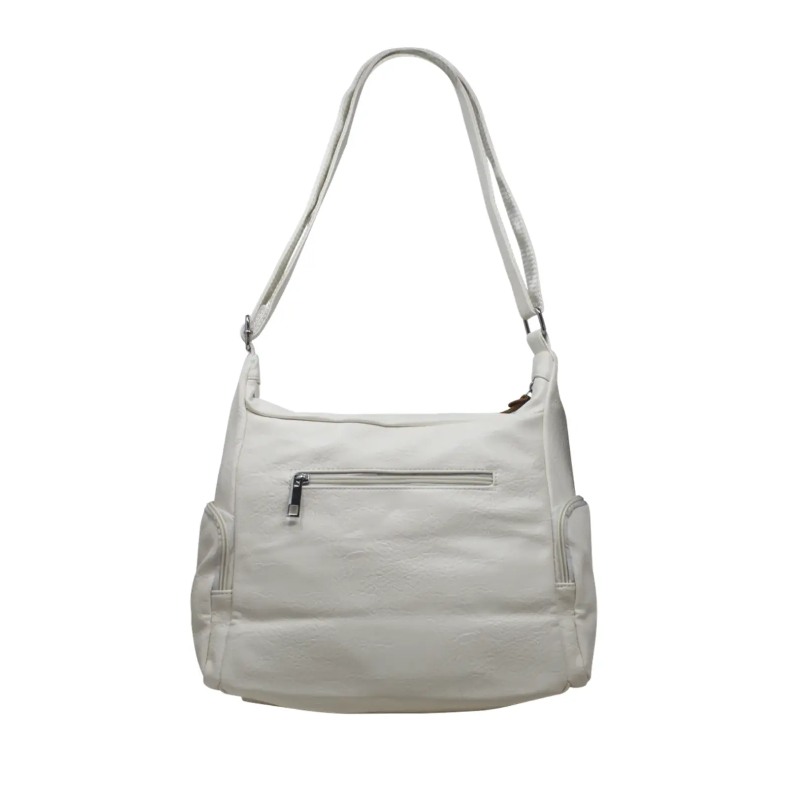 This crossbody bag features several zipped pockets around: 2 at the front, 1 on each side, and 1 at the back. It’s great for a day out or work. Made with quality PU with a very soft touch.