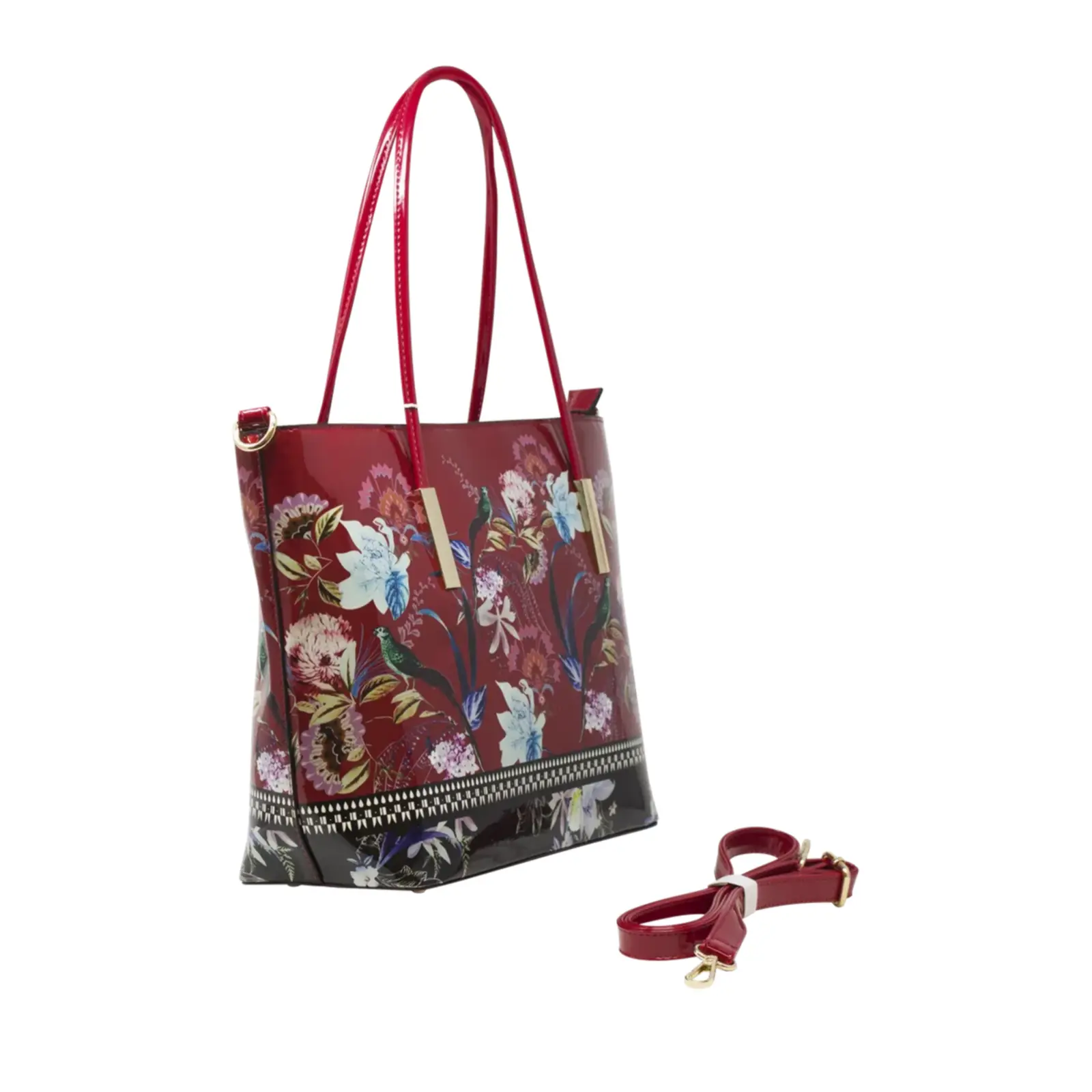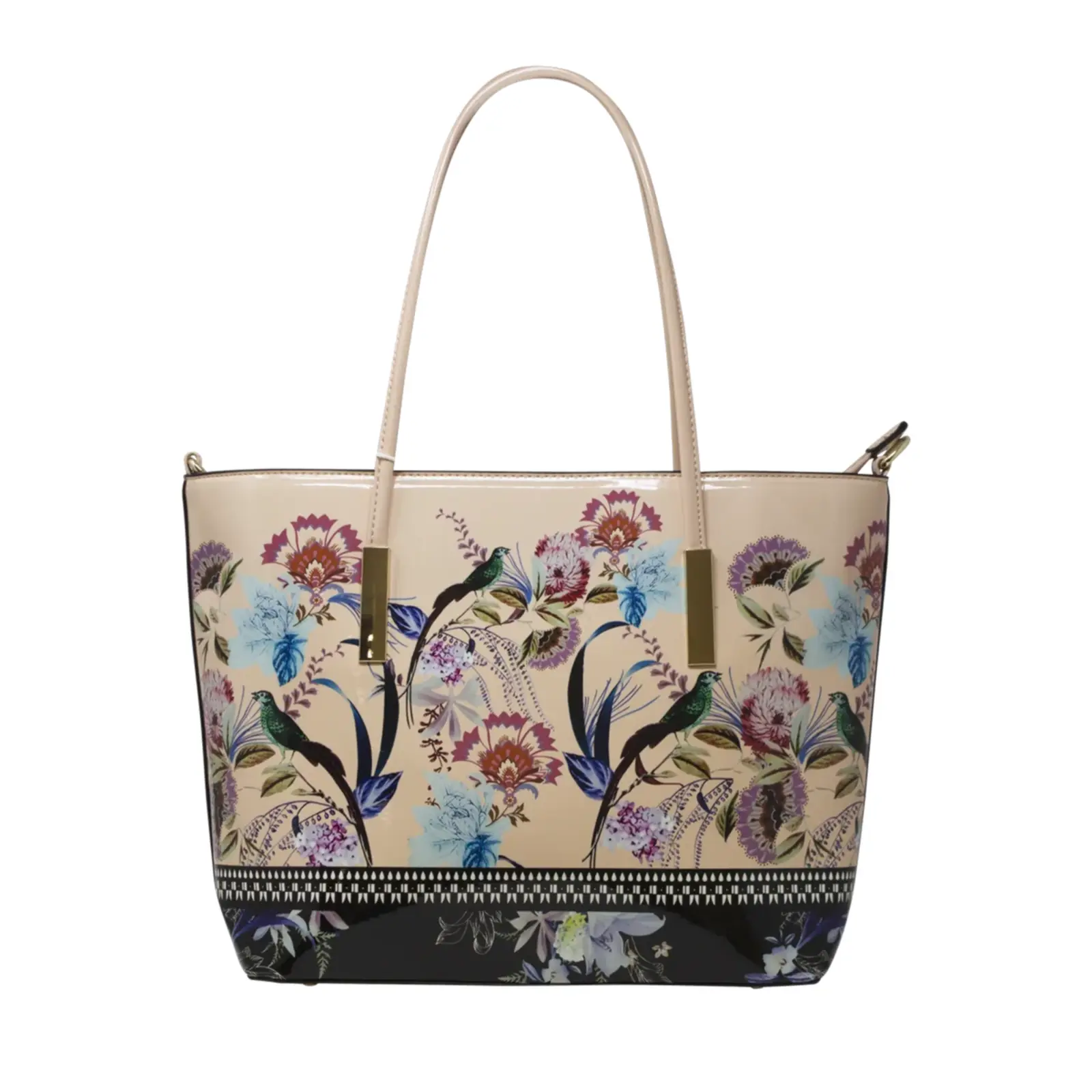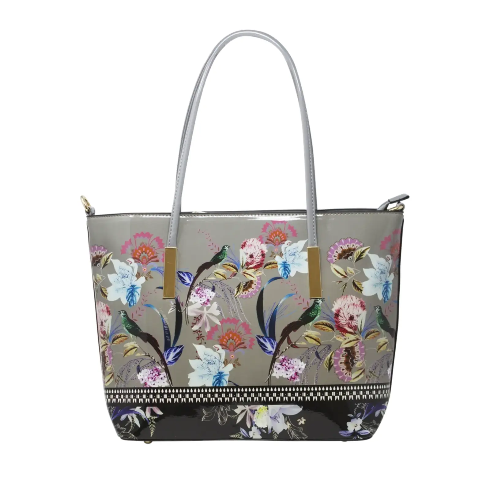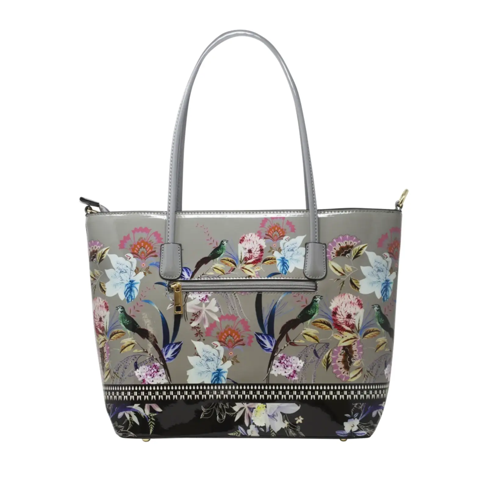 This large tote bag boasts a vibrant floral design featuring peacocks. It also comes with an attachable strap for versatile wearing.