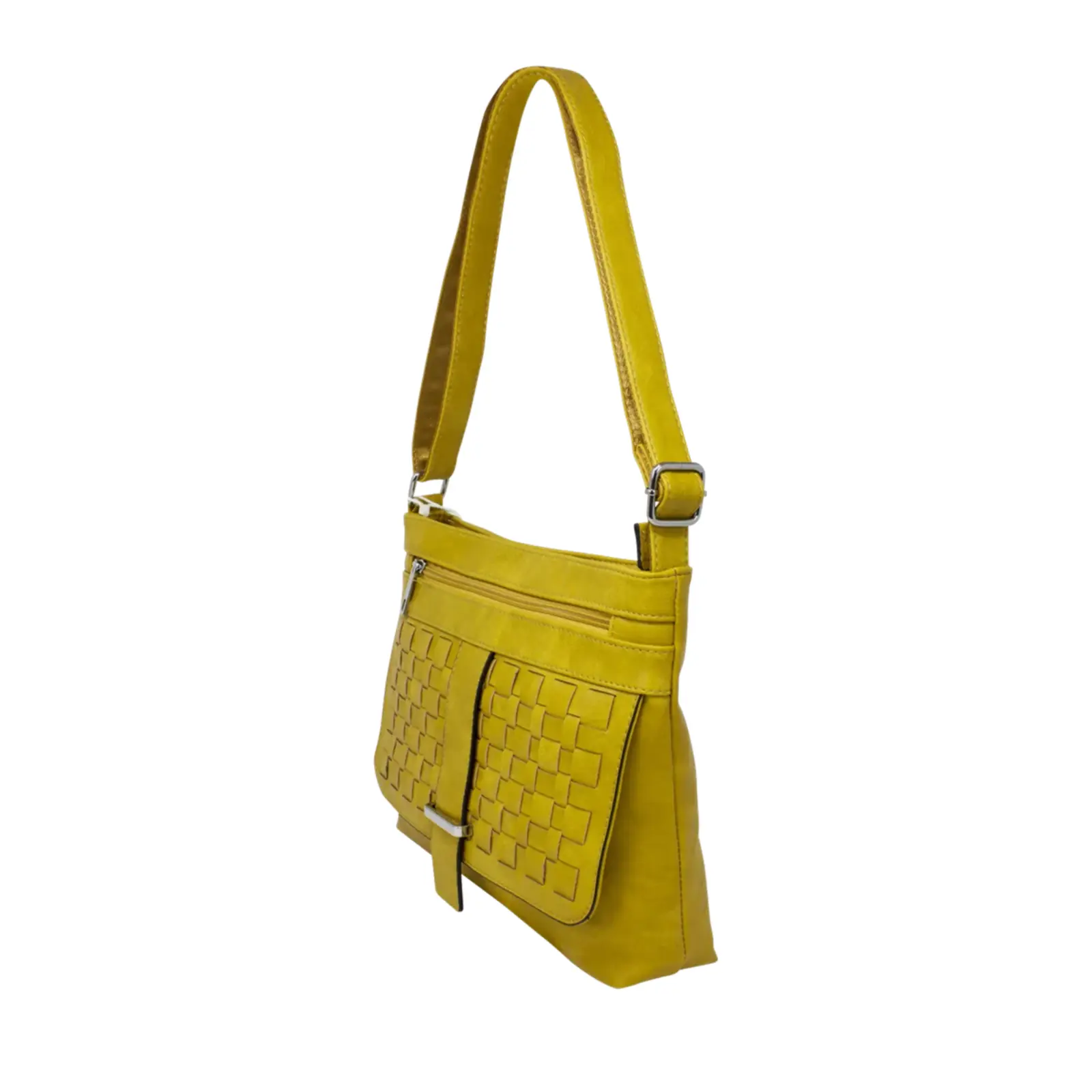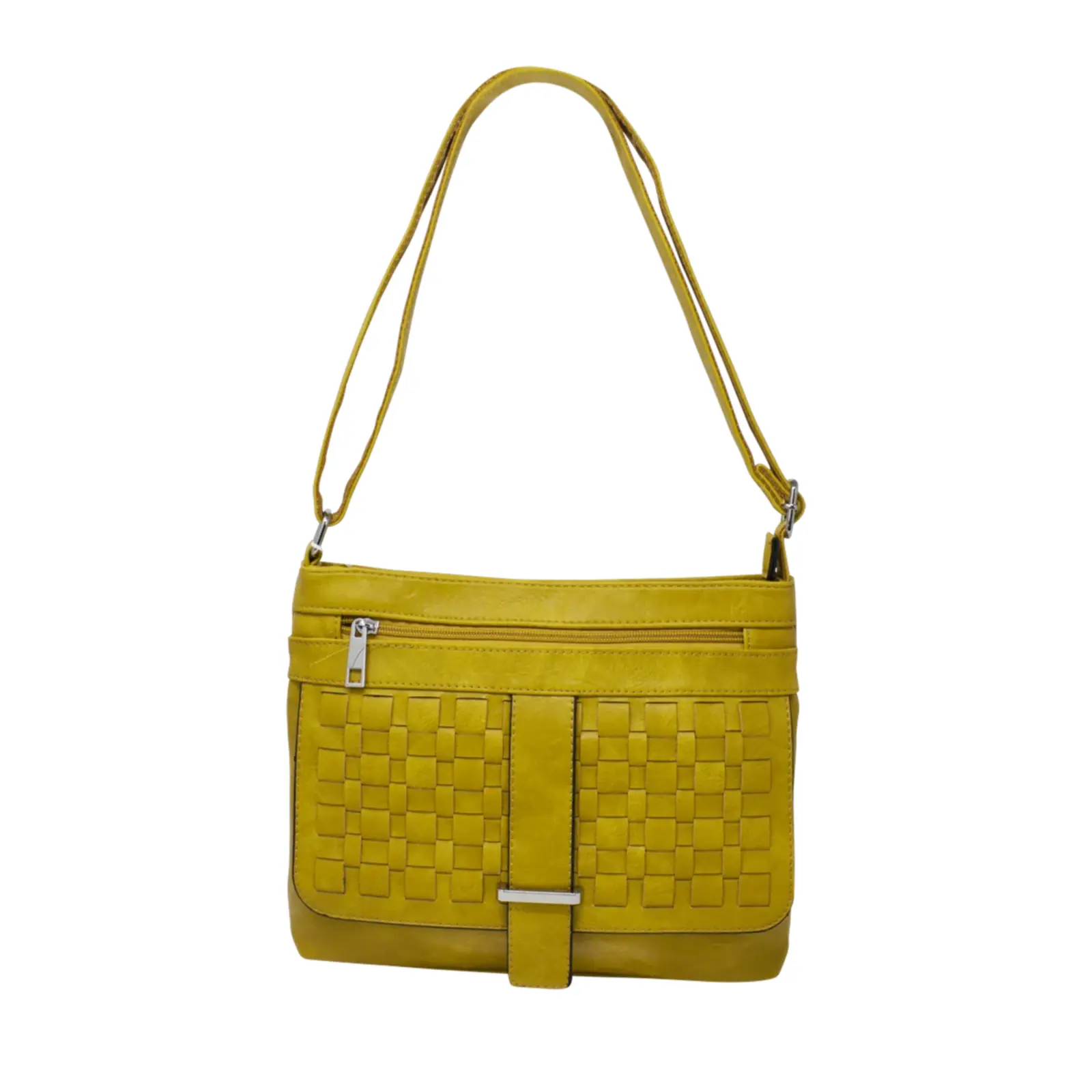 This crossbody features a woven front and comes with multiple small compartments to organise your belongings,.