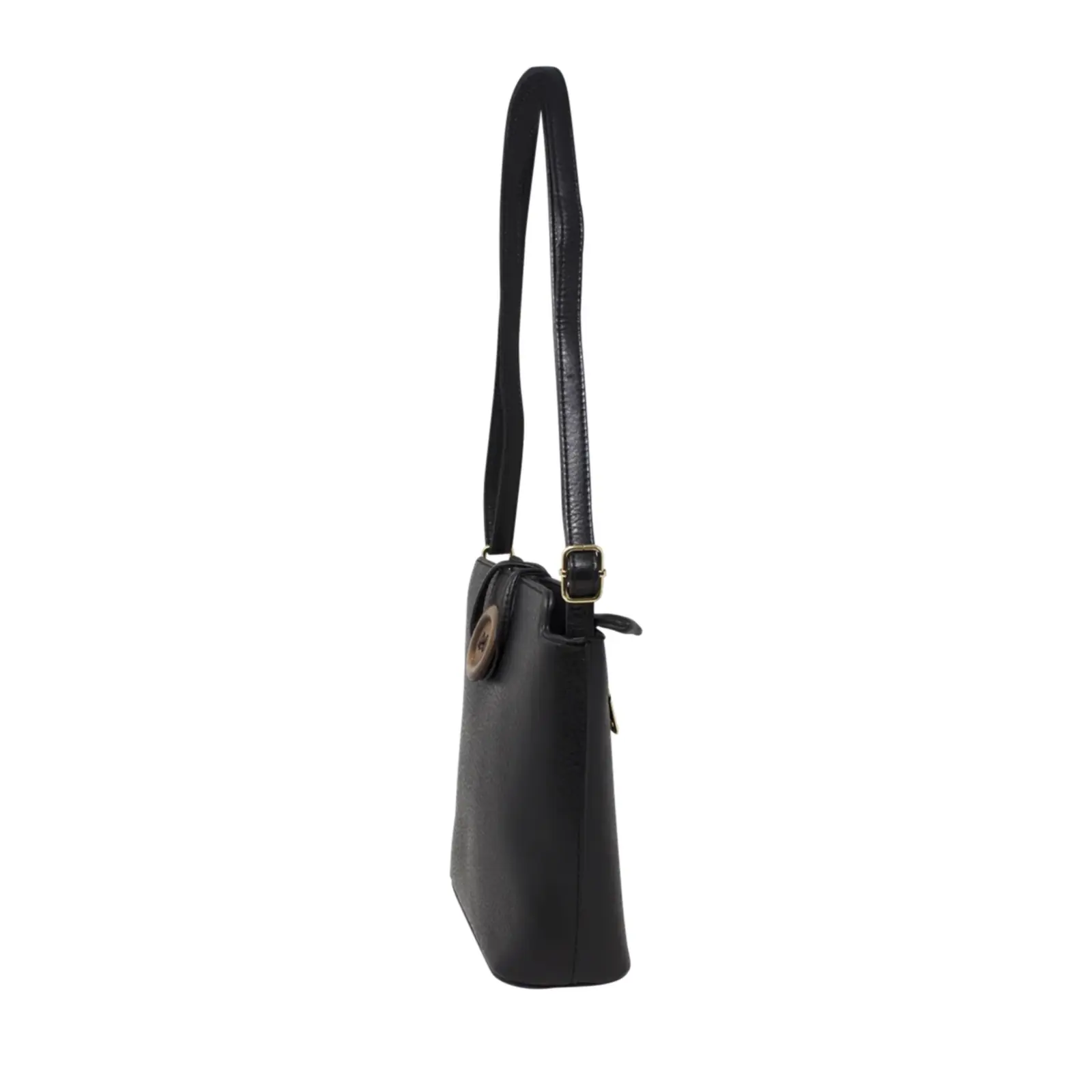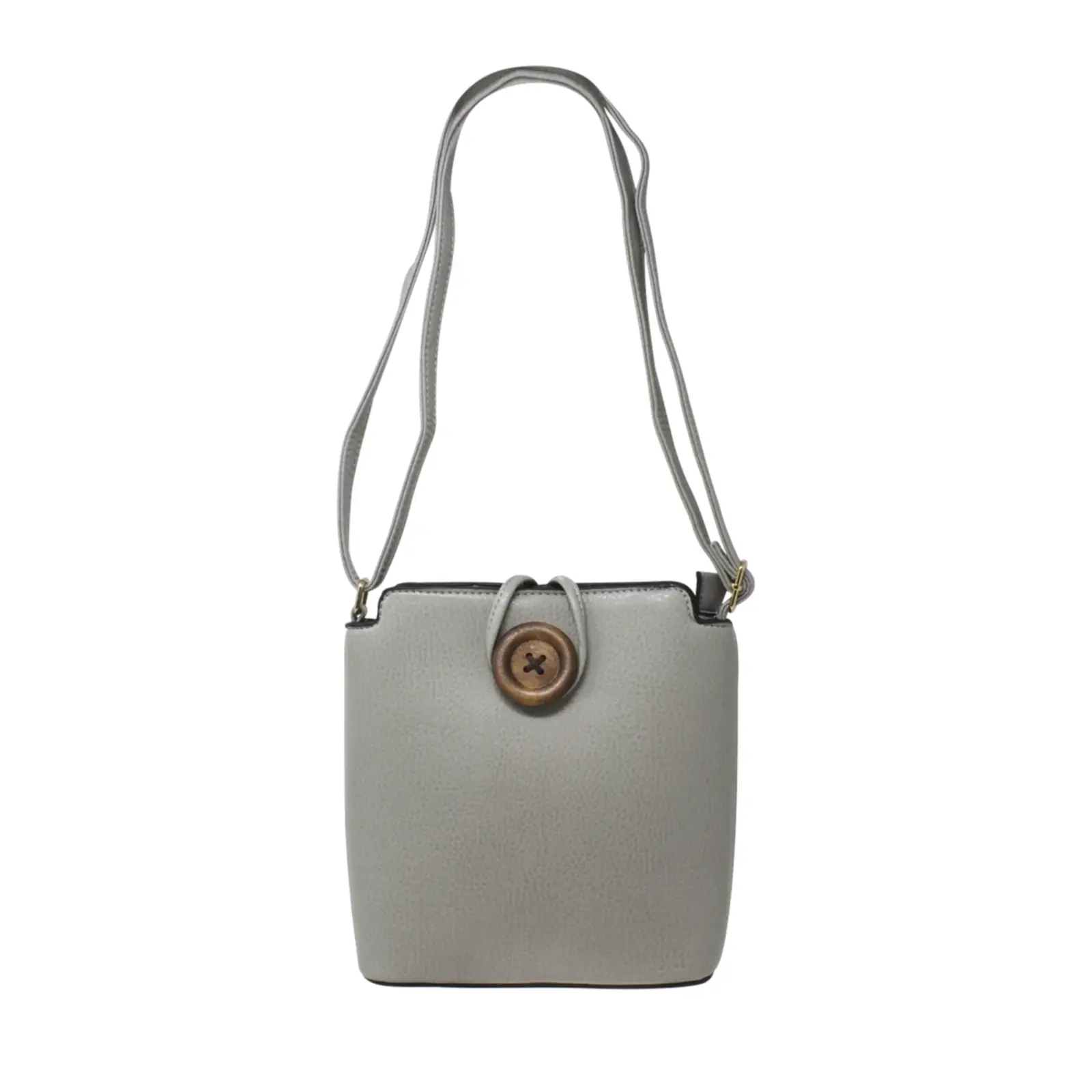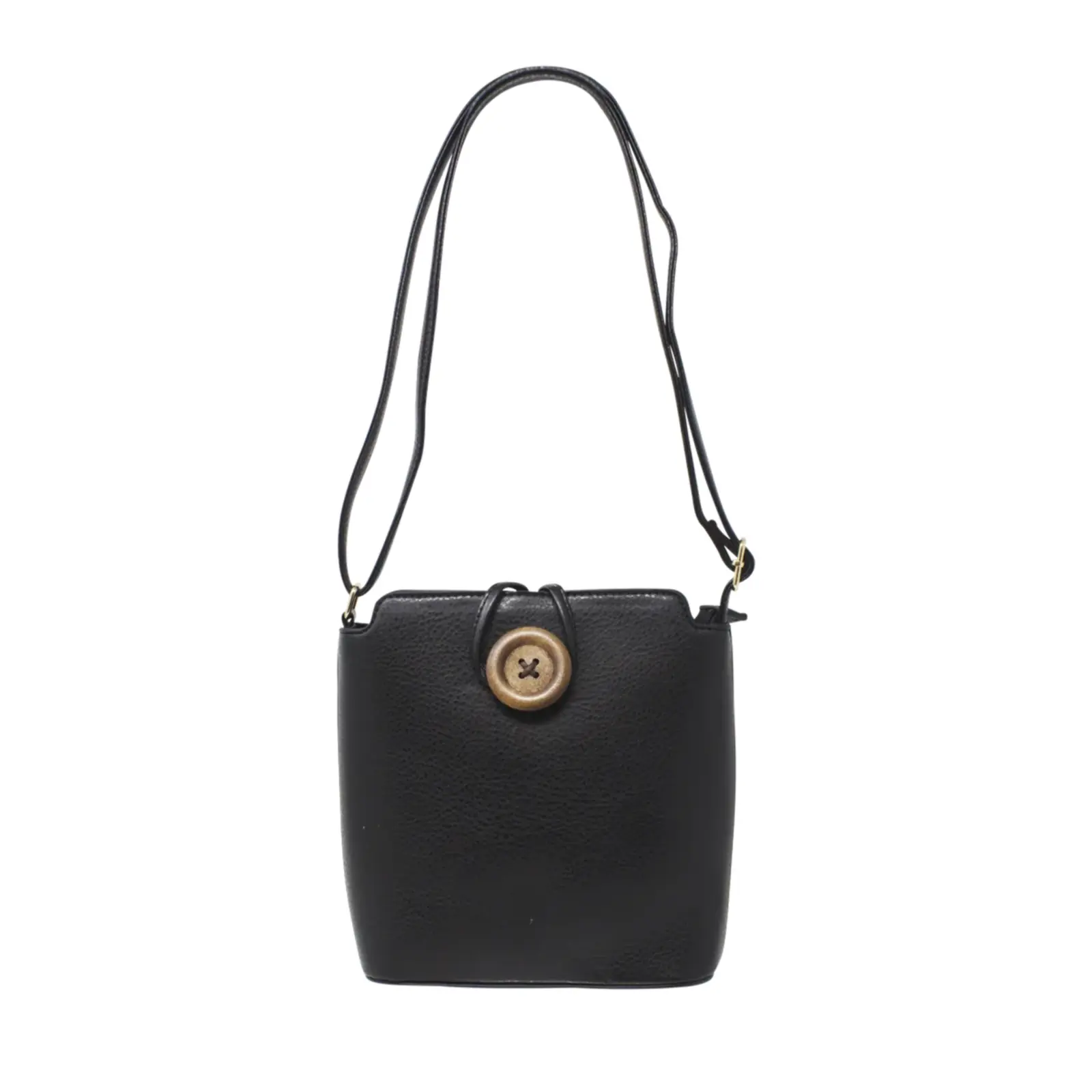 This is a crossbody bag features a wooden button and adjustable shoulder strap. Perfect for going to work or shopping.