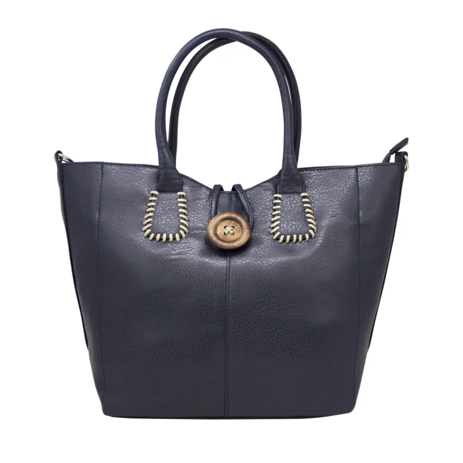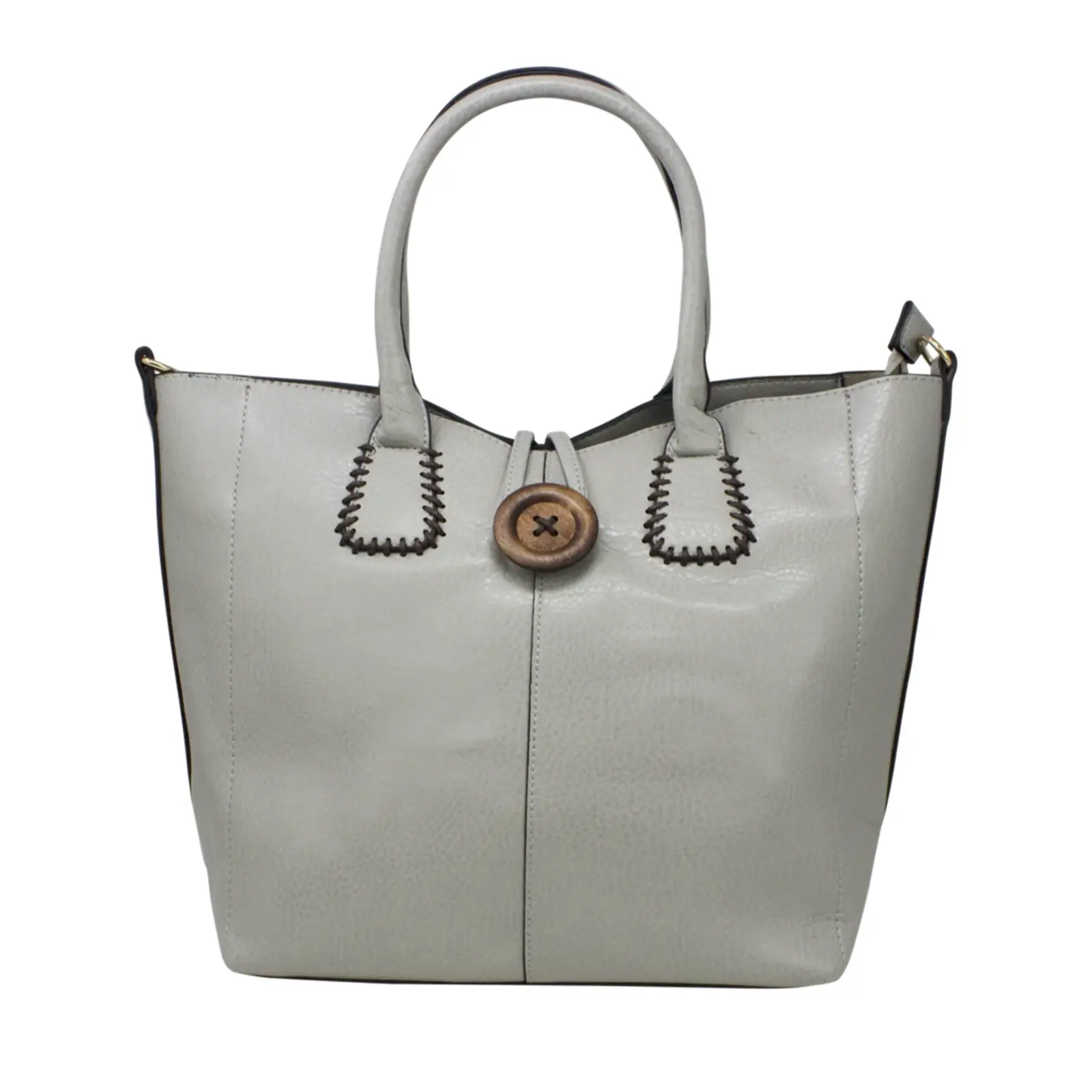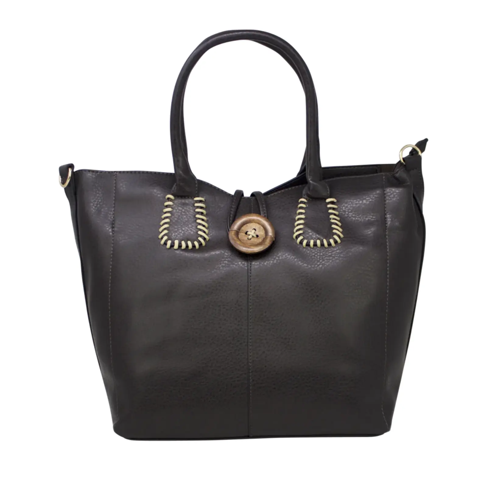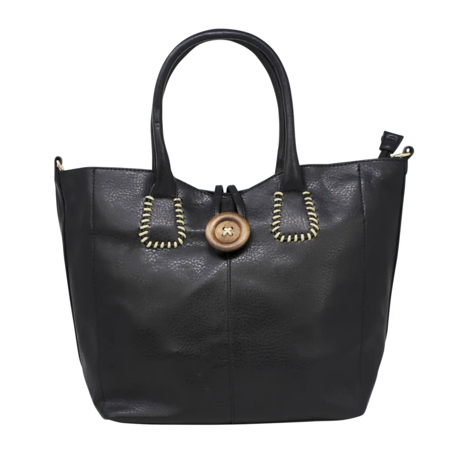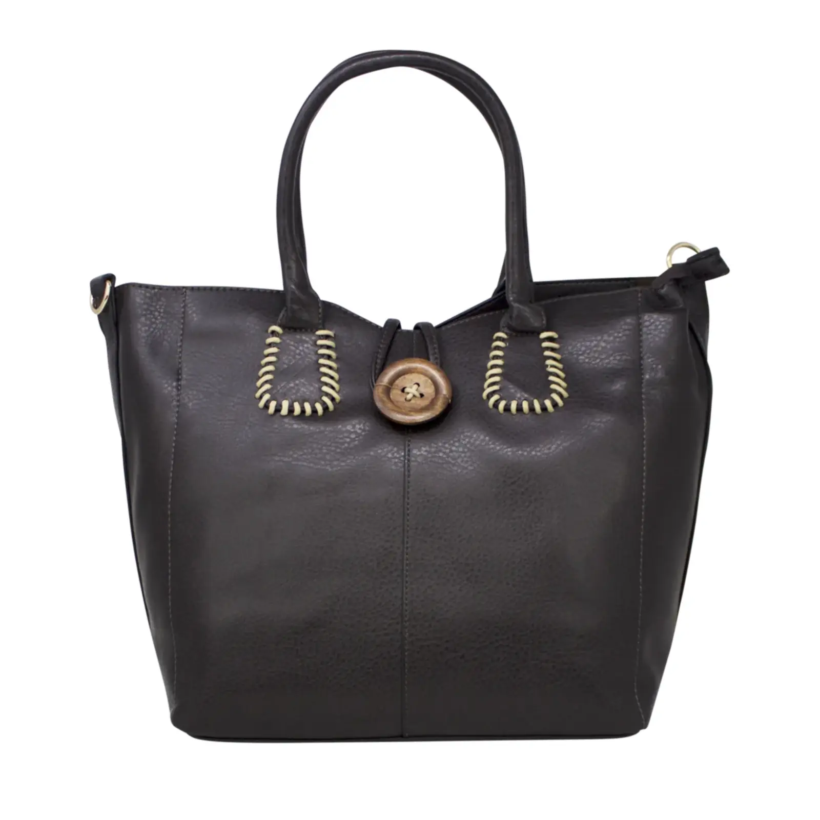 This is top handle handbag features a wooden button at the front. It also comes with a detachable and adjustable shoulder strap. Perfect for going to work or shopping.