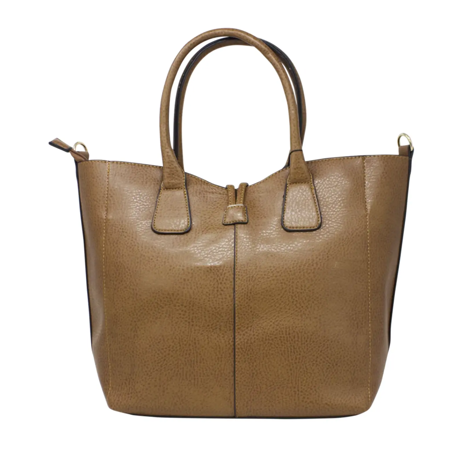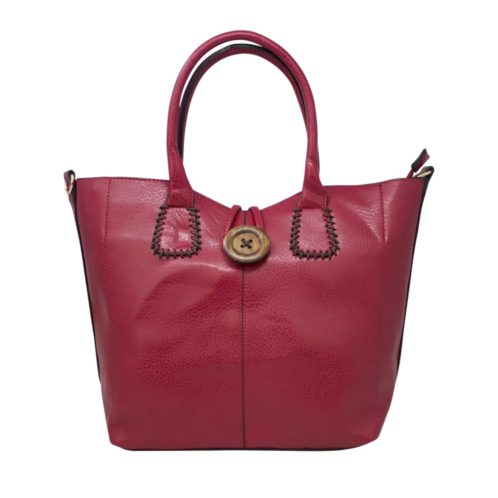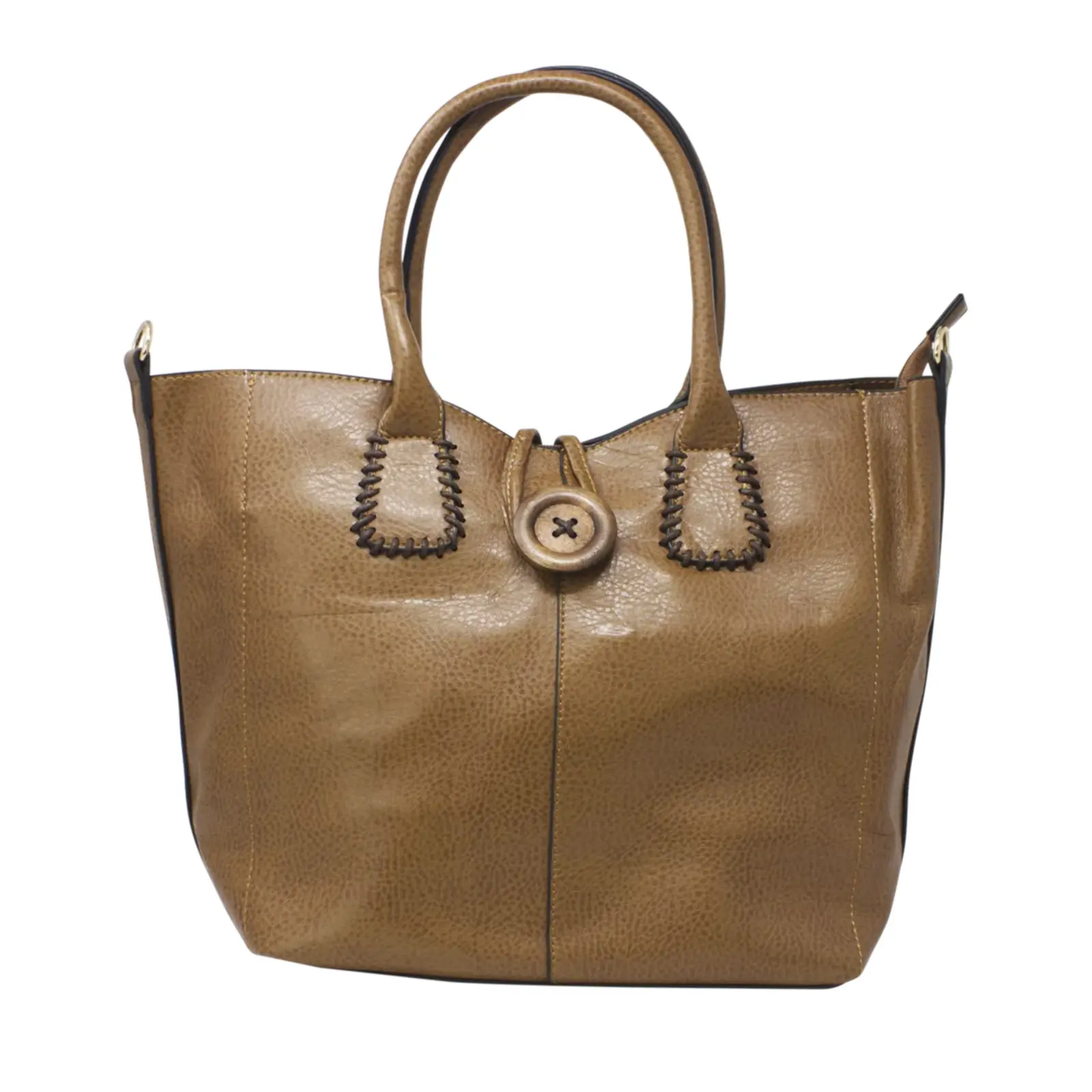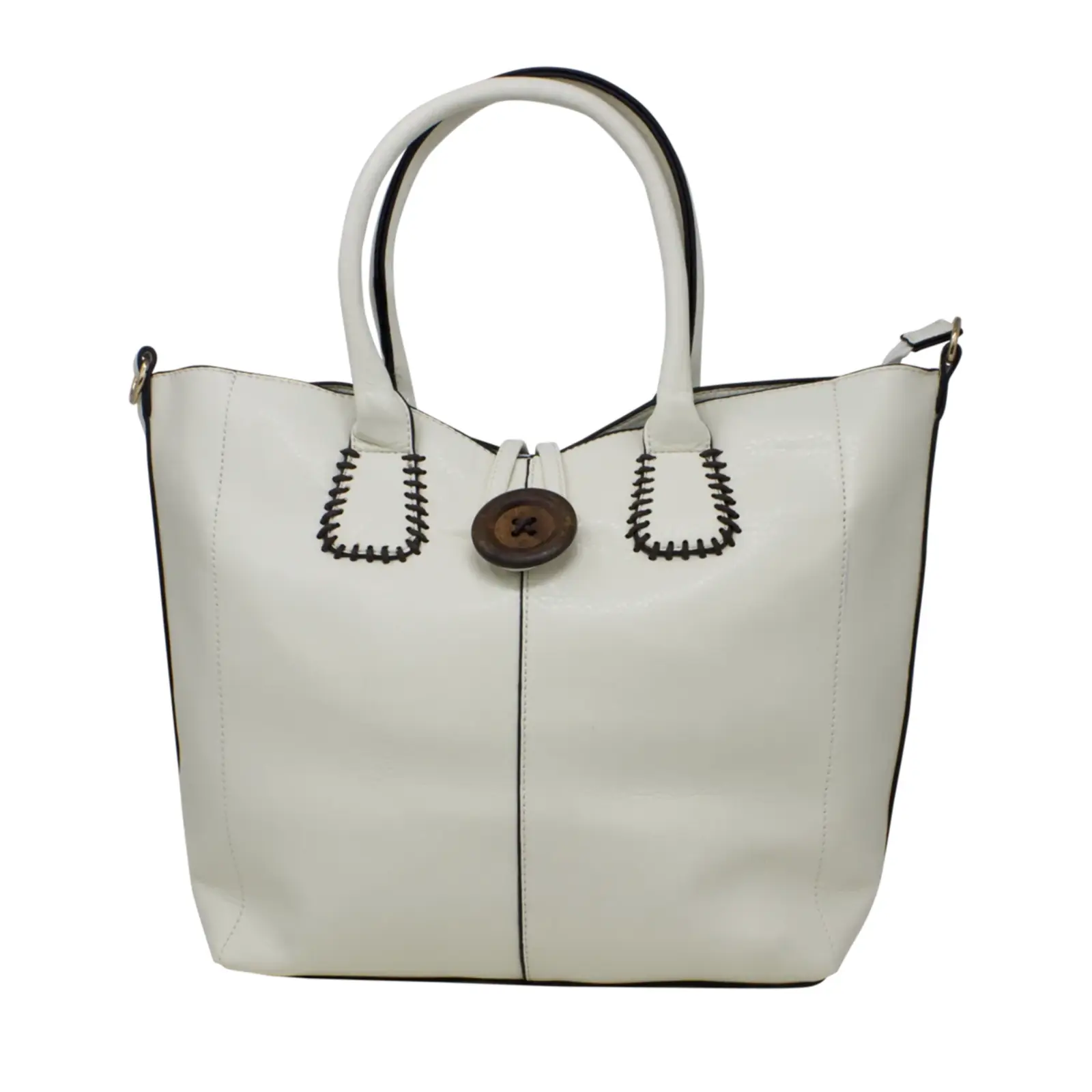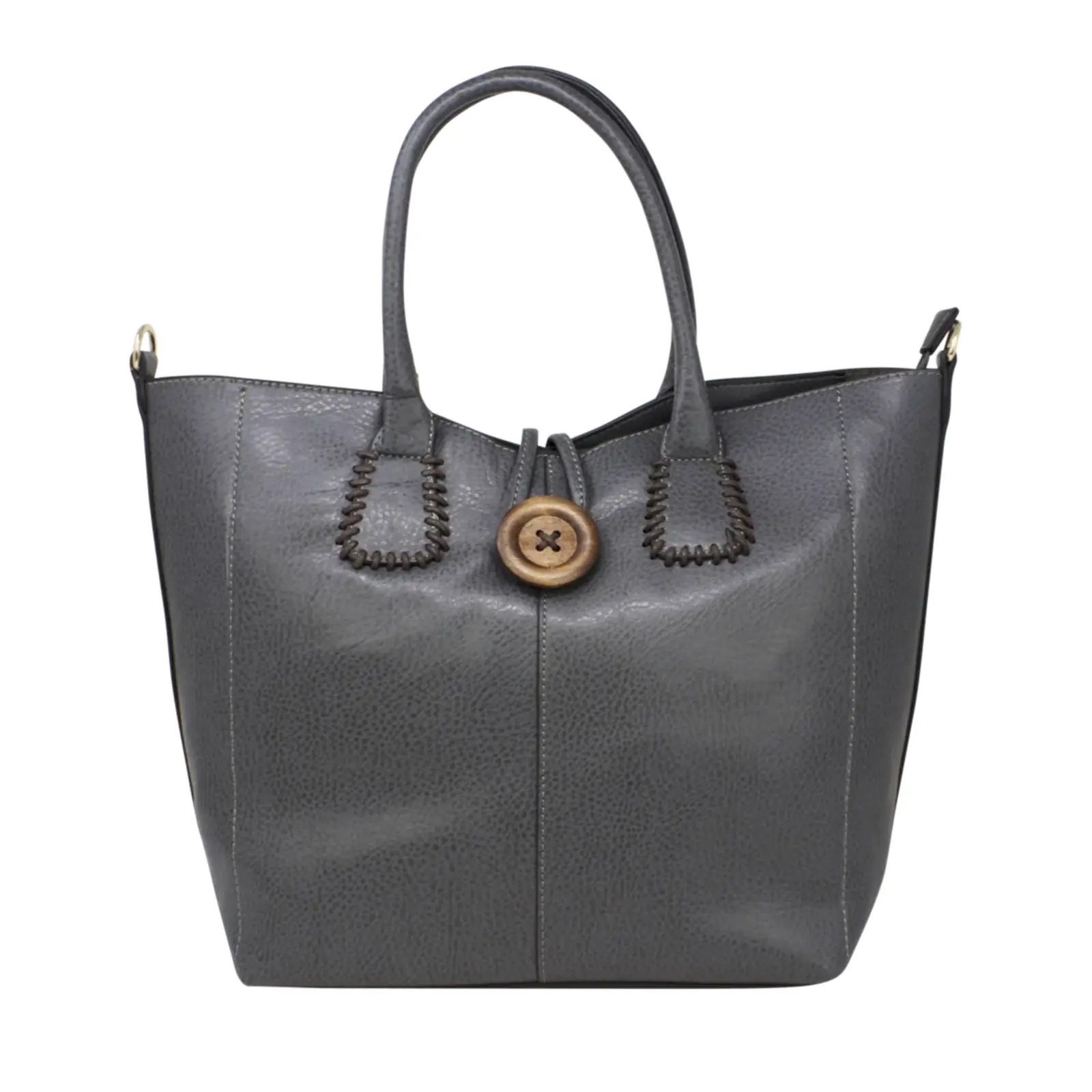 This is top handle handbag features a wooden button at the front. It also comes with a detachable and adjustable shoulder strap. Perfect for going to work or shopping.