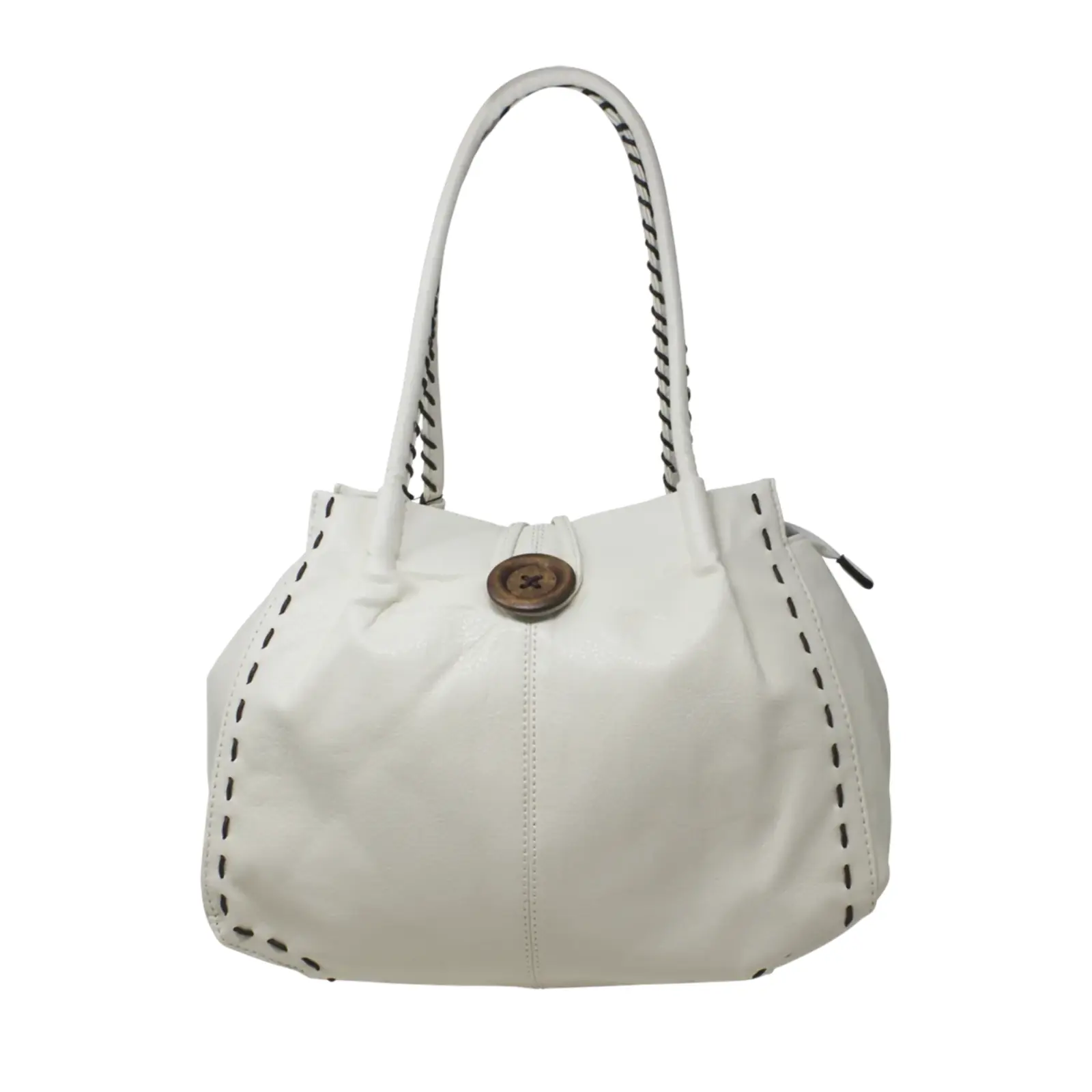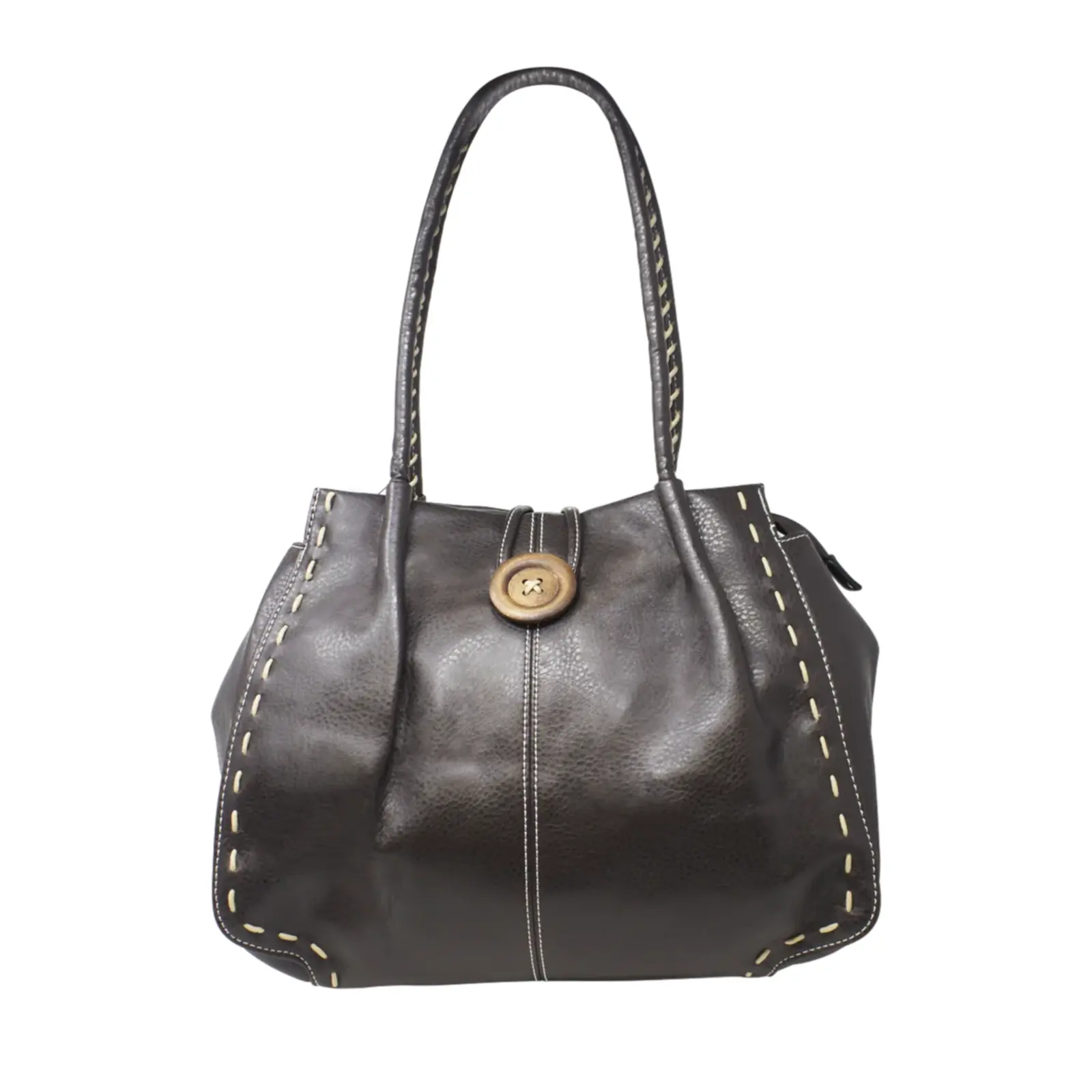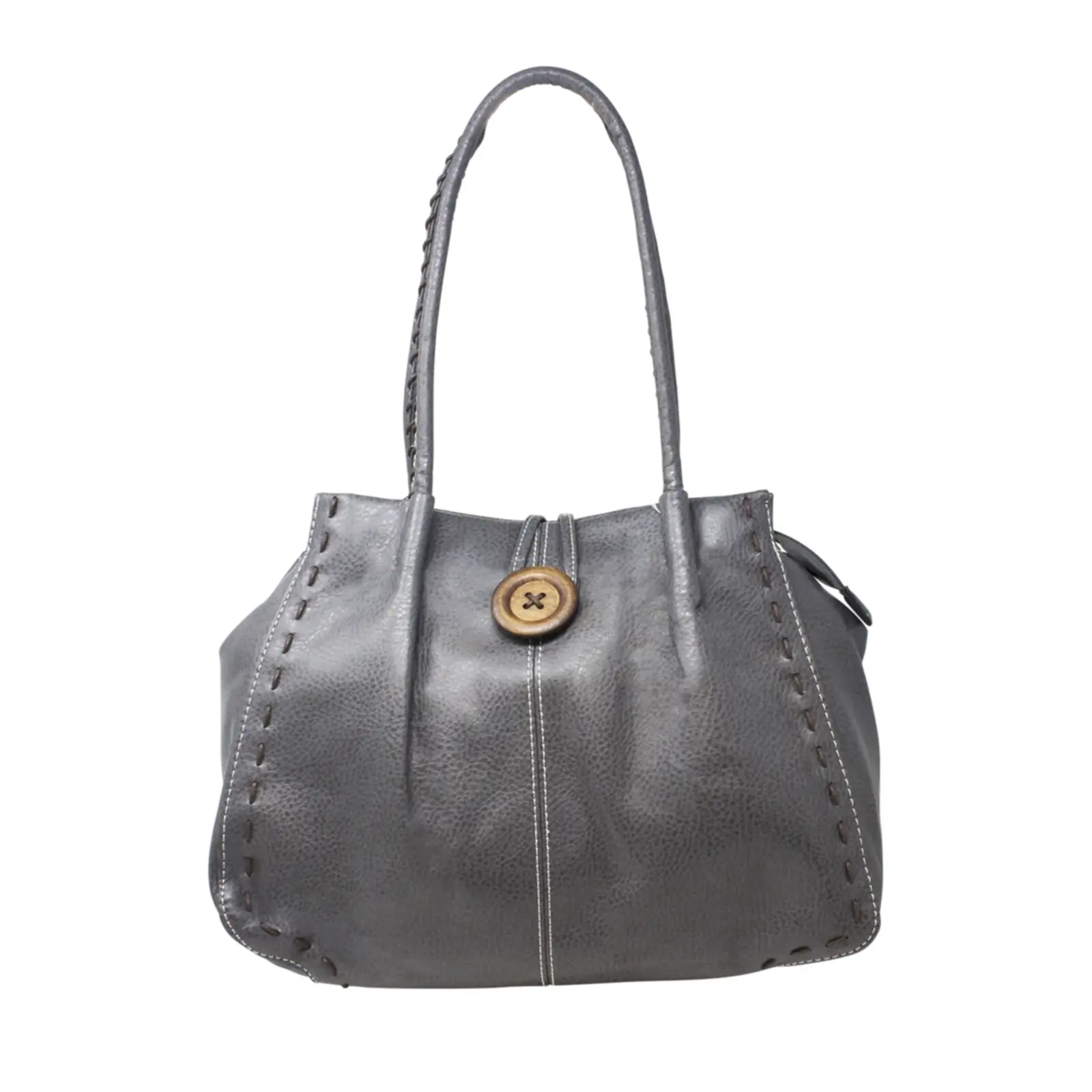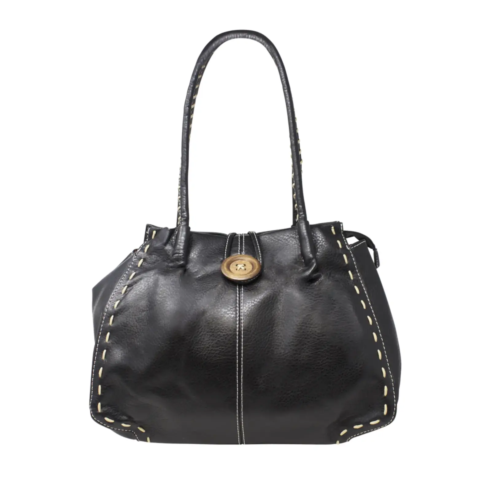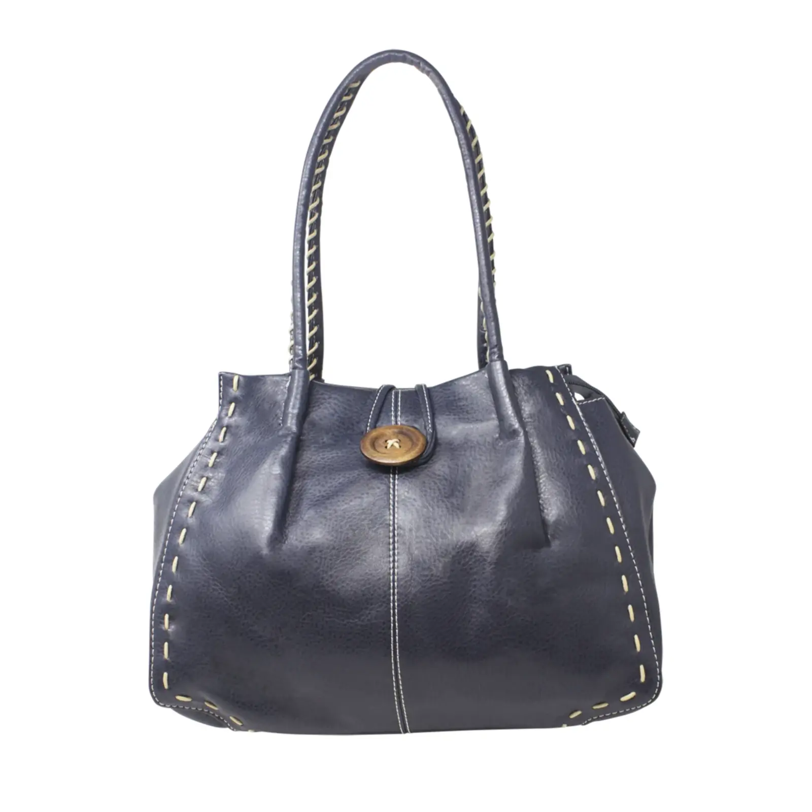 This is a tote bag that features a wooden button with stitched lines at the front also it is large enough to hold everything you need for every day use. Perfect for daily occasion or traveling.